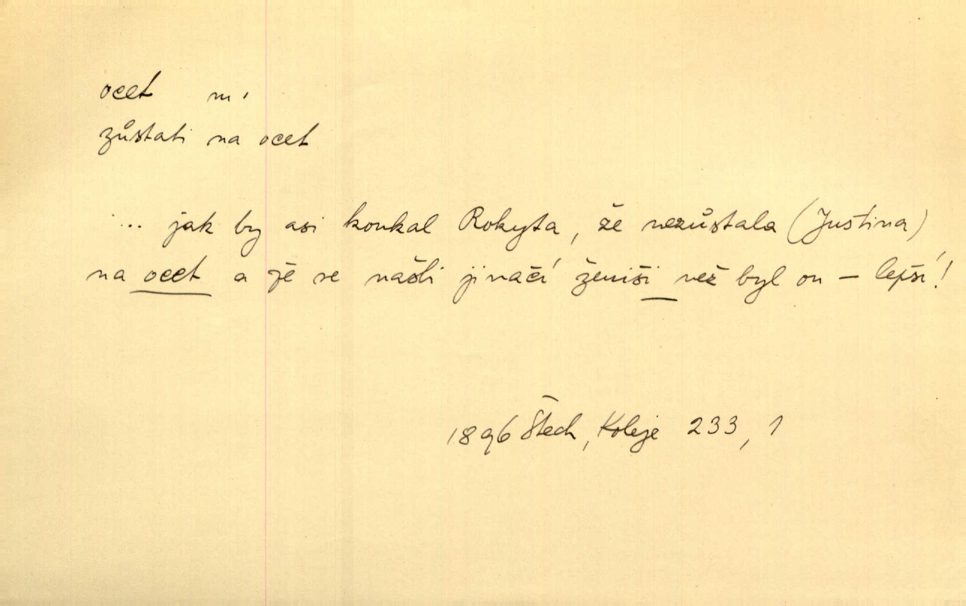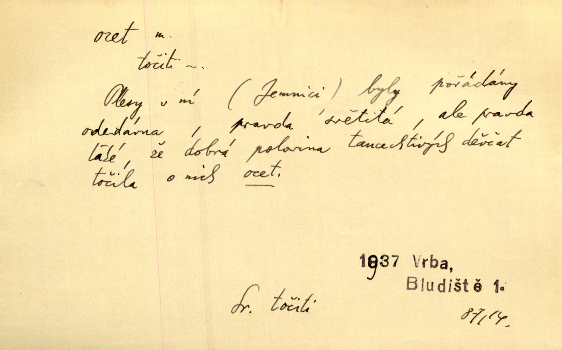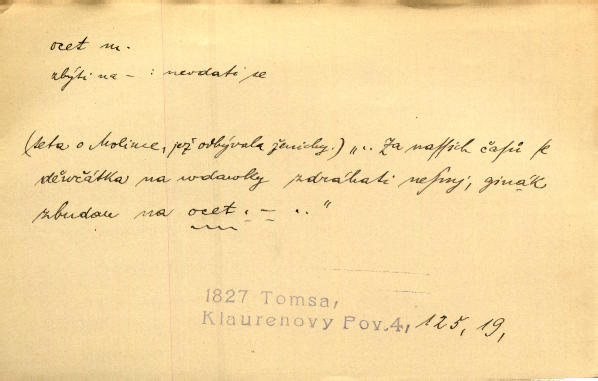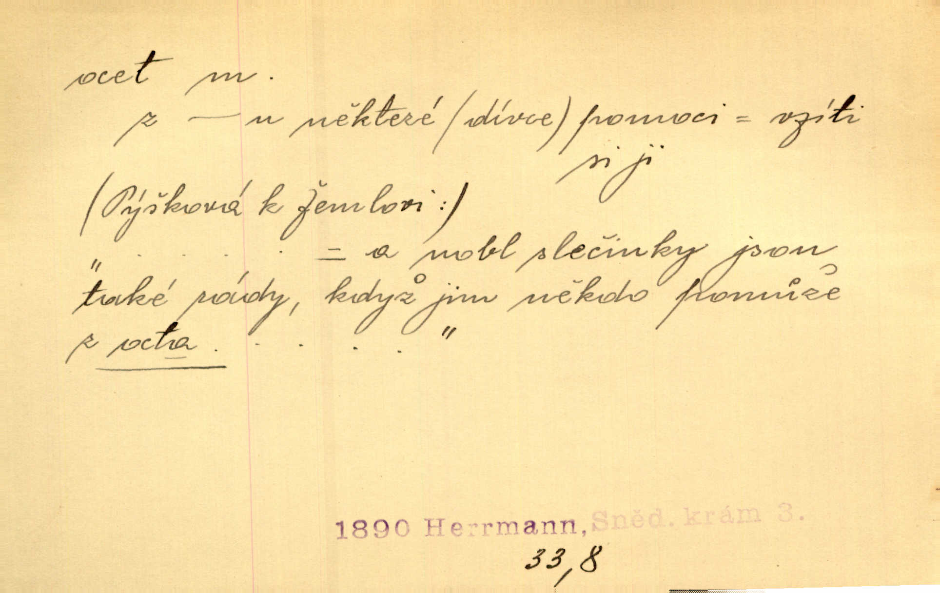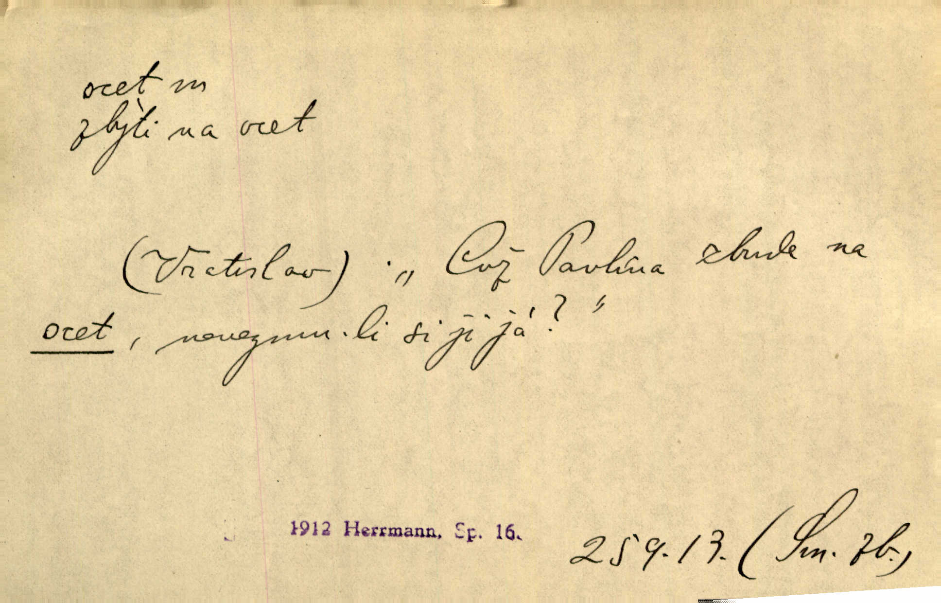 - ocet, -cta m. slabý roztok kyseliny octové, jehož se užívá v domácnosti, hl. v kuchařství. Přinášela ocet, kolínskou vodu a pokoušela se s contessinou, aby ho vzkřísily. Zey. Počala sháněti ocet k obkladu. Vach. Ustál. sp. Poslední slova vyplynula z dědečkových úst, jakoby se byl octa napil. Rais. Čas svrchovaný, abych se oženil, nechci-li zkysati na ocet stát se starým mládencem. Šmil. Nevezme-li si Anýžka ženicha, kterého já jí našel, zbude na ocet neprovdá se. Hol. Trnka nabídl rámě staré paní, Borovec slečně Mély. Doktor, pan Hajný a Jelínek zbyli na ocet nedostalo se na ně. Šmil. Nobl slečinky jsou také rády, když jim někdo pomůže z octa. Herrm. Teď stojí [slečna na plese] celou noc, nikdo si jí ani nevšimne, prodává ocet jeden kousek za druhým není brána k tanci. Her. Dobrá polovina tancechtivých děvčat točila v nich [plesech] ocet. Vrba. Ale jen opatrně! Abych si s honorací nerozlila ocet nepohněvala si ji. Jah. Mám u něho [představeného] rozlitý ocet; nevím, spravím-li si to ještě. Šal. Houby s octem ví takové děvče, jako je Štěpánka! nic. Ros. Kuch. vinný ocet vyráběný z vinných matolin. D něco, co má nějakou vlastnost octa. Přinutí tě, abys chlastal nějaké rýnské octy kyselá vína. Med. Přen. Tvář jeho se vyjasňovala víc a více, ocet a žluč vypařovaly se z ní ponenáhlu kyselost. Herrm. Ven vyhlédla tvář [představené] a úsměvem se stáhla, v němž s octem v zápasu byl sladký med. Vrch.