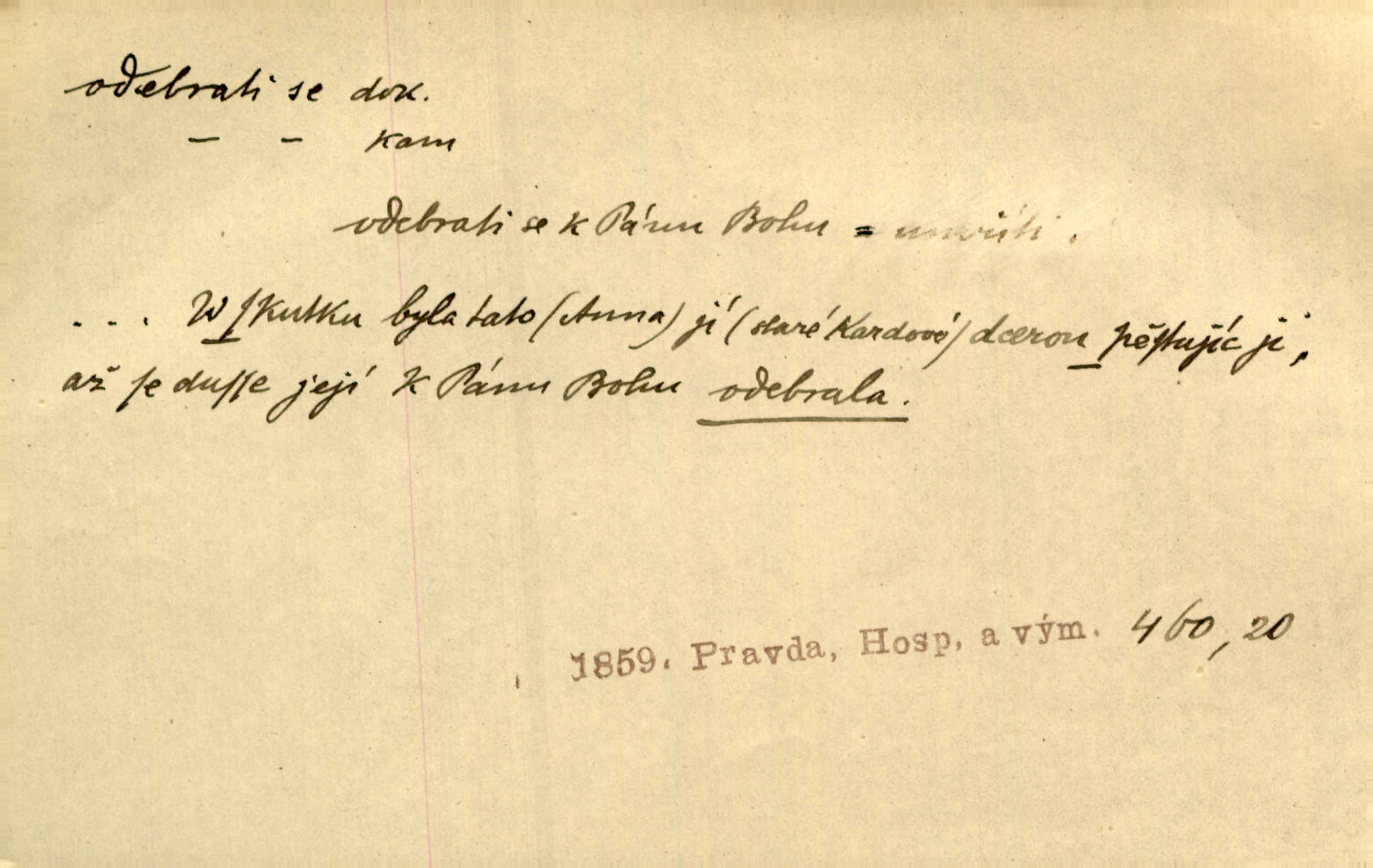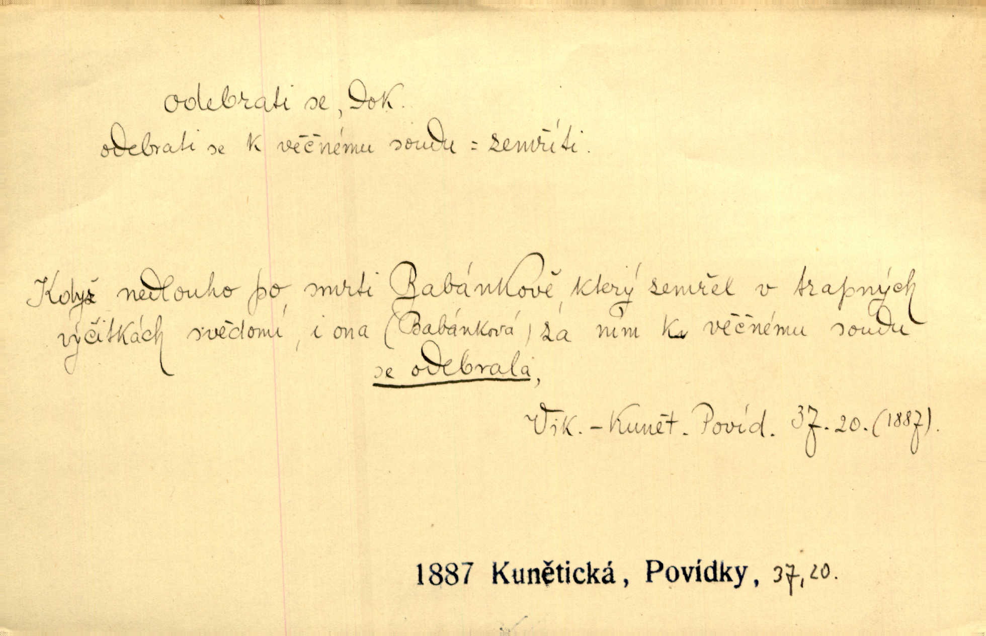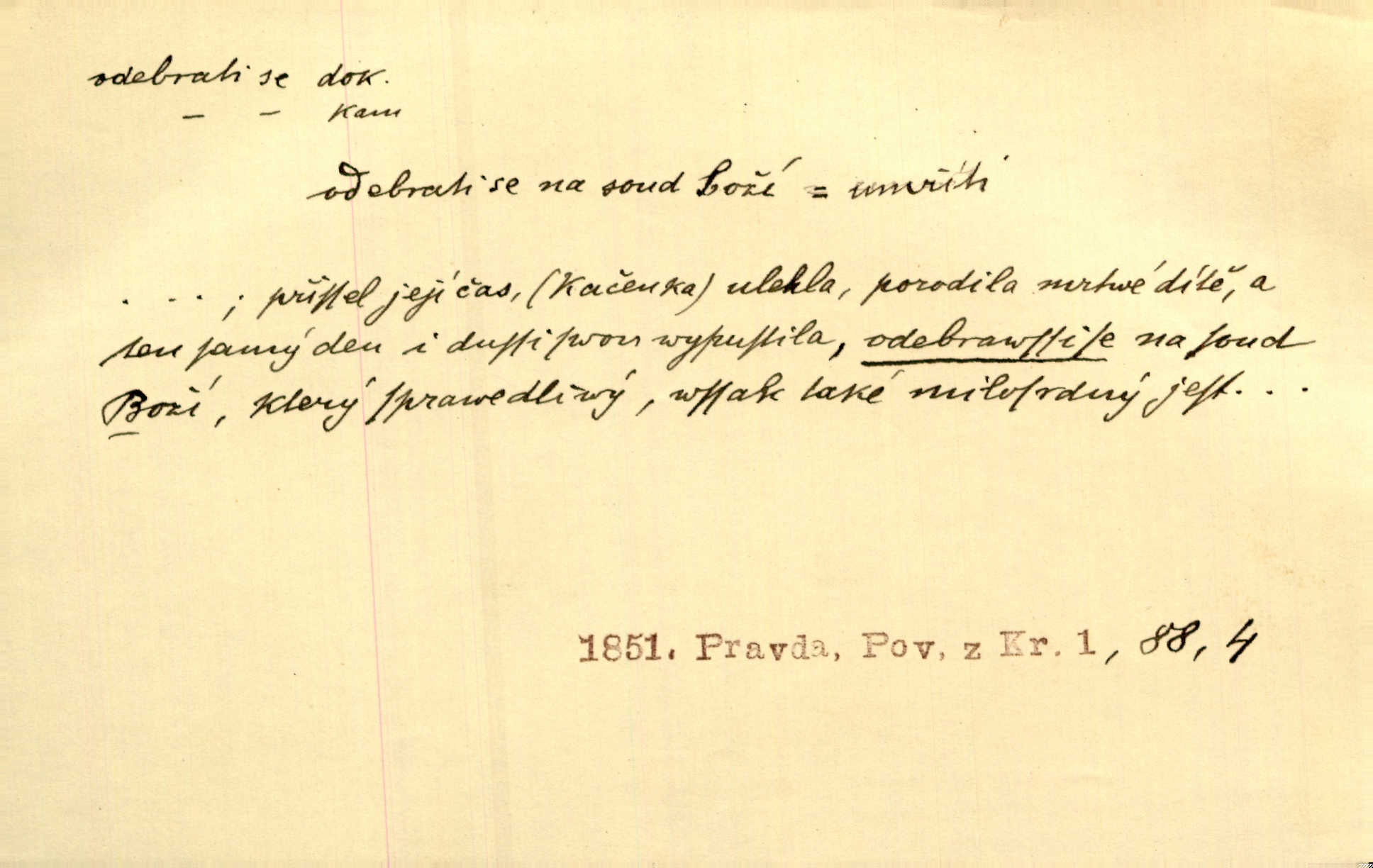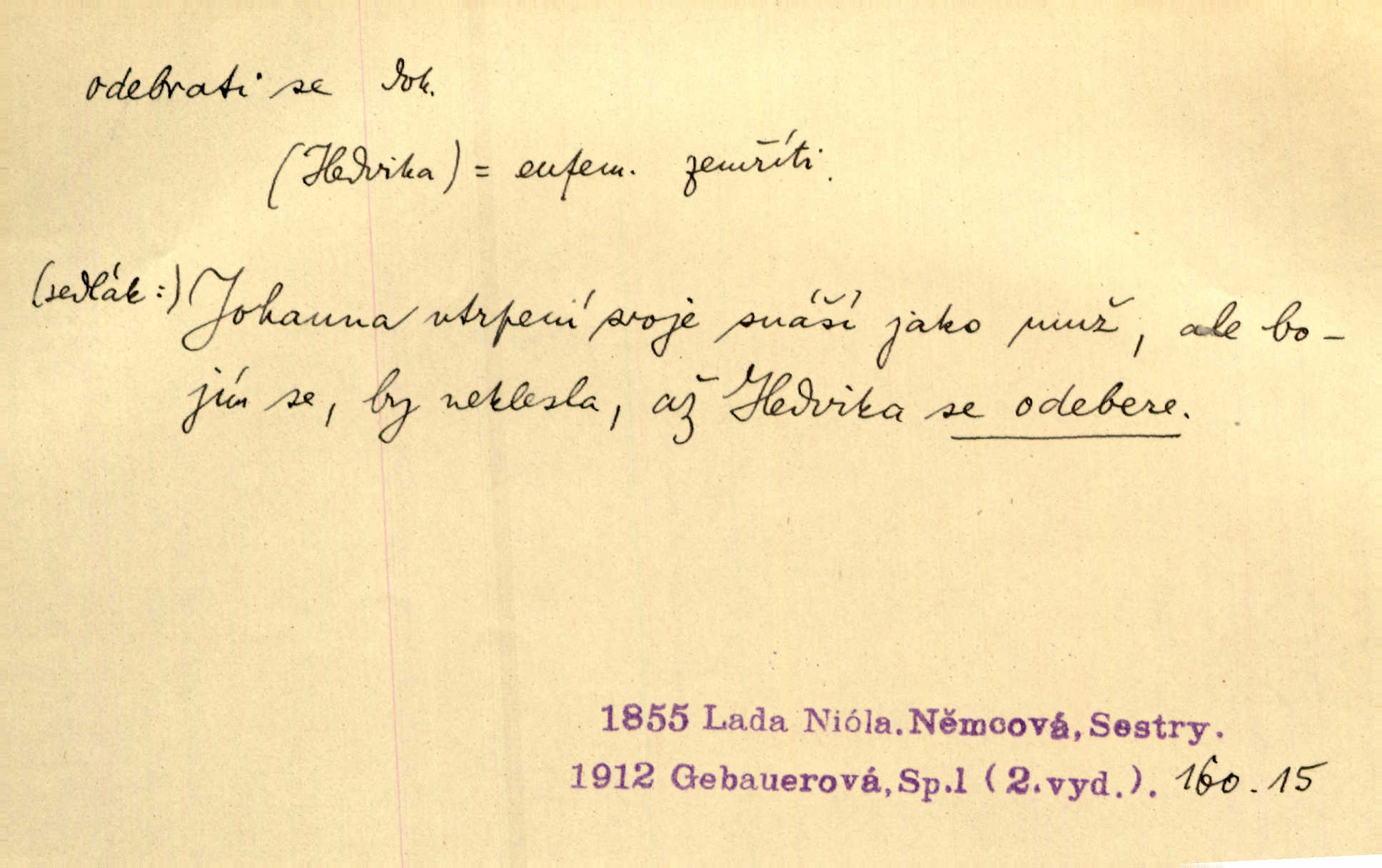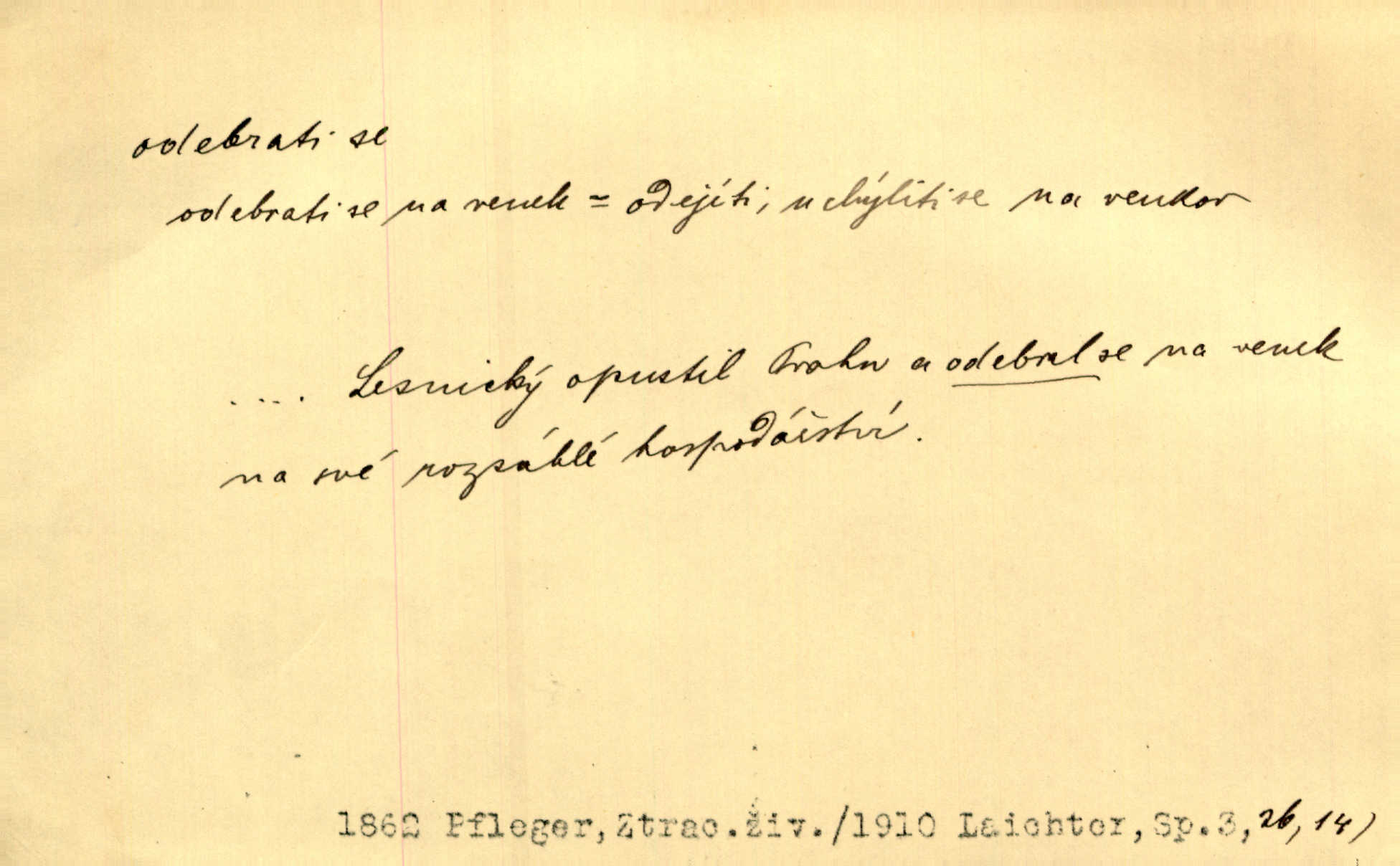 - odebrati se dok. odejíti. Opustil Prahu a odebral se na venek. Pfleg. Ty na Tetín se, paní, odebéřeš. Vrch. Bez groše odebral se na studie do Prahy. V. Mrš. V tomtéž okamžiku zvěstoval šramot, že se společnost chce odebrat. Ner. Shasiv světlo, odebral se na lože. I. Klicp. D odebrati se (na věčnost, na onen svět, k Abrahamu a pod.) eufem. zemříti. Odebral se z tiché fary na věčnost kněz dobrý. Čech. I ona za ním [mužem] k věčnému soudu se odebrala. Kun. Smíří se s nebem, udělá testament; odebere se na pravdu. Rub. V skutku byla jí dcerou pěstujíc ji, až se duše její k Pánu Bohu odebrala. Prav. Odebral se [kníže] k otcům. Hol. Čekají, brzy-li se odeberu k Ahrahamu. Just. Jen dlóho, Pane Bože, neležet a v pokoju se odebrat na onen svět. Mrš. Strouhal se odebral na jiný svět. Pfleg. Za tebou odeberu se [Maria za Kristem]‚ až bude Bohu libo. Zey. Co z ní [dcery] bude, kdybych odtud teď se odebrala? Svět. Druhé [dítě] odebralo se za tři neděle. Rais. Jene můj! jak časně jsi se odebral! Něm. Kdyby to tak bylo možná, lehčej bych se taky odebral. Šlej. „Barbora snad se vám už odebrala,“ pravil krajánek. M. Jahn. Hoří-li oheň v rošti na jedné straně, brzy někdo z domu se odebere. Lum. Starý vrátný dávno se odebral na hřbitov do Košíř. Pfleg.