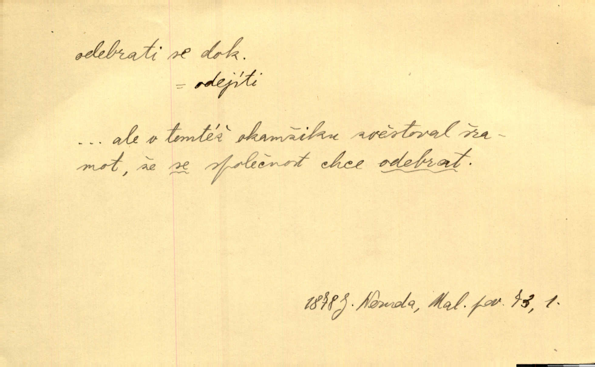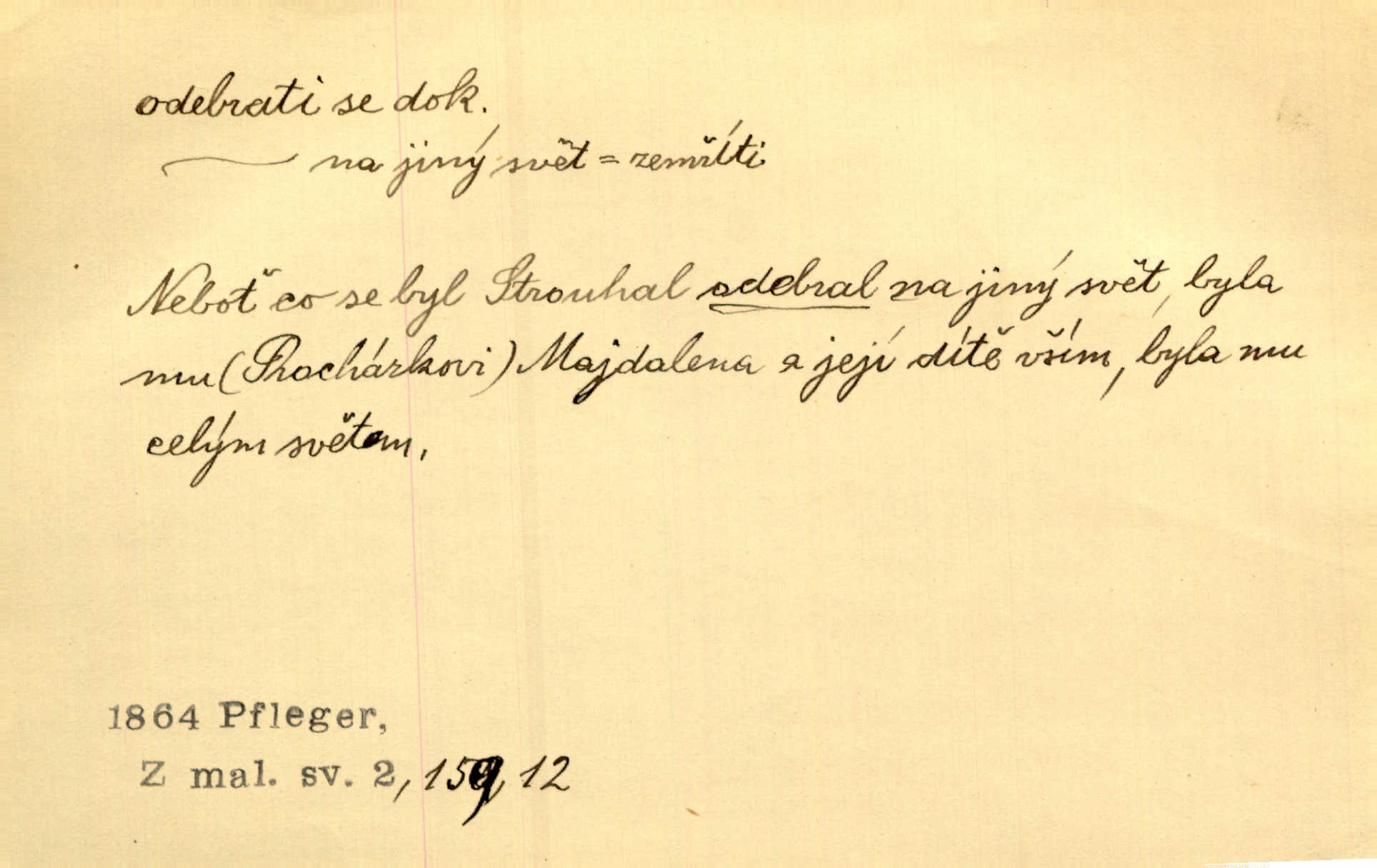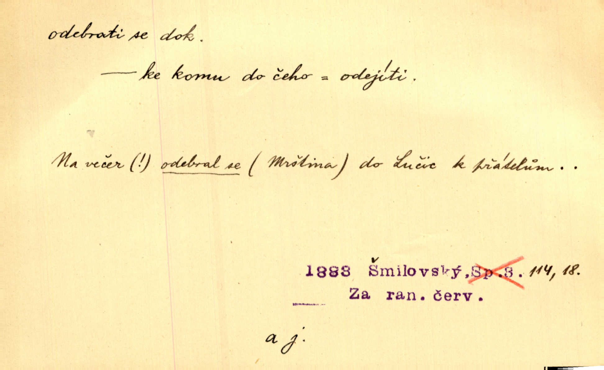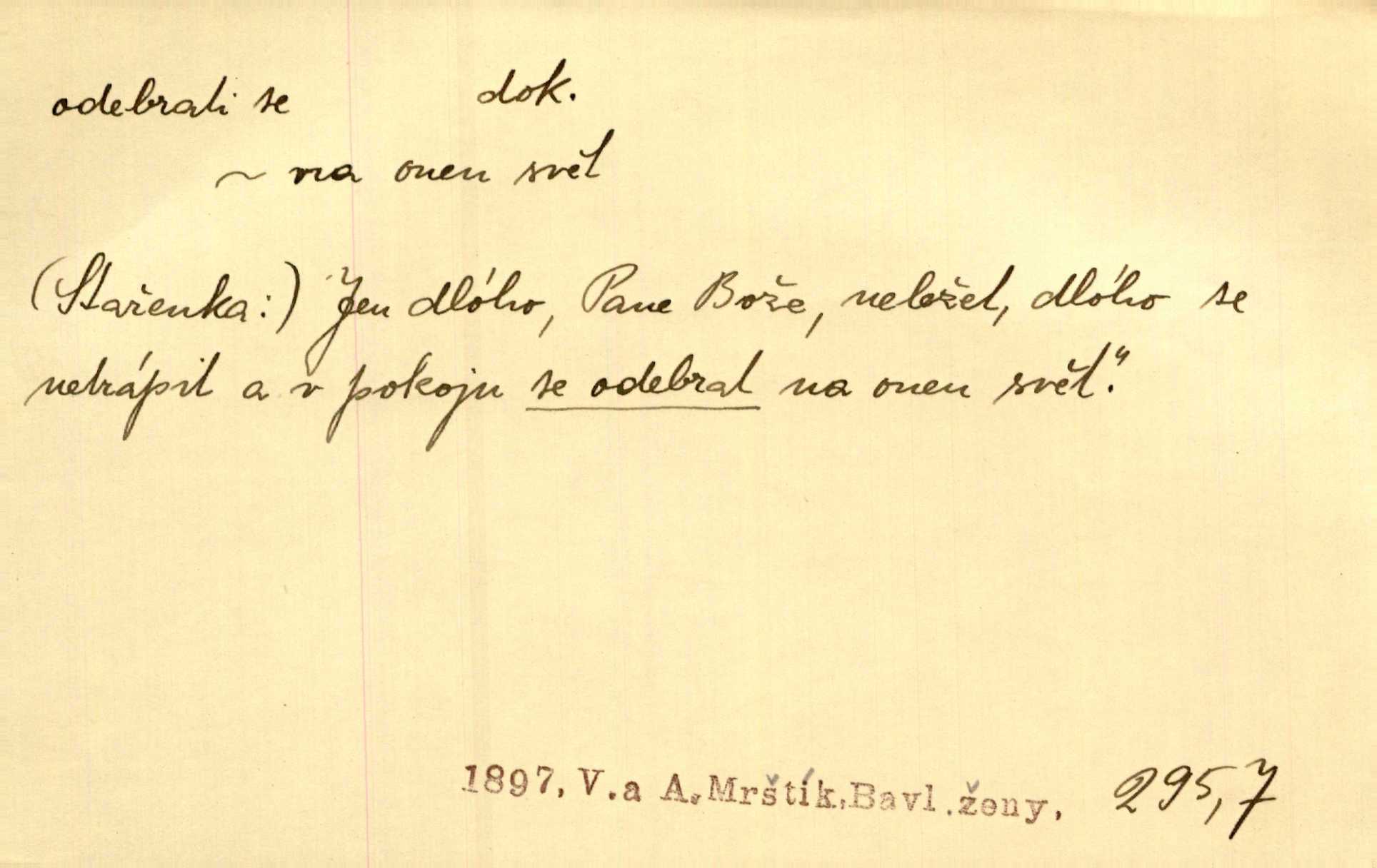 - odebrati se dok. odejíti. Opustil Prahu a odebral se na venek. Pfleg. Ty na Tetín se, paní, odebéřeš. Vrch. Bez groše odebral se na studie do Prahy. V. Mrš. V tomtéž okamžiku zvěstoval šramot, že se společnost chce odebrat. Ner. Shasiv světlo, odebral se na lože. I. Klicp. D odebrati se (na věčnost, na onen svět, k Abrahamu a pod.) eufem. zemříti. Odebral se z tiché fary na věčnost kněz dobrý. Čech. I ona za ním [mužem] k věčnému soudu se odebrala. Kun. Smíří se s nebem, udělá testament; odebere se na pravdu. Rub. V skutku byla jí dcerou pěstujíc ji, až se duše její k Pánu Bohu odebrala. Prav. Odebral se [kníže] k otcům. Hol. Čekají, brzy-li se odeberu k Ahrahamu. Just. Jen dlóho, Pane Bože, neležet a v pokoju se odebrat na onen svět. Mrš. Strouhal se odebral na jiný svět. Pfleg. Za tebou odeberu se [Maria za Kristem]‚ až bude Bohu libo. Zey. Co z ní [dcery] bude, kdybych odtud teď se odebrala? Svět. Druhé [dítě] odebralo se za tři neděle. Rais. Jene můj! jak časně jsi se odebral! Něm. Kdyby to tak bylo možná, lehčej bych se taky odebral. Šlej. „Barbora snad se vám už odebrala,“ pravil krajánek. M. Jahn. Hoří-li oheň v rošti na jedné straně, brzy někdo z domu se odebere. Lum. Starý vrátný dávno se odebral na hřbitov do Košíř. Pfleg.