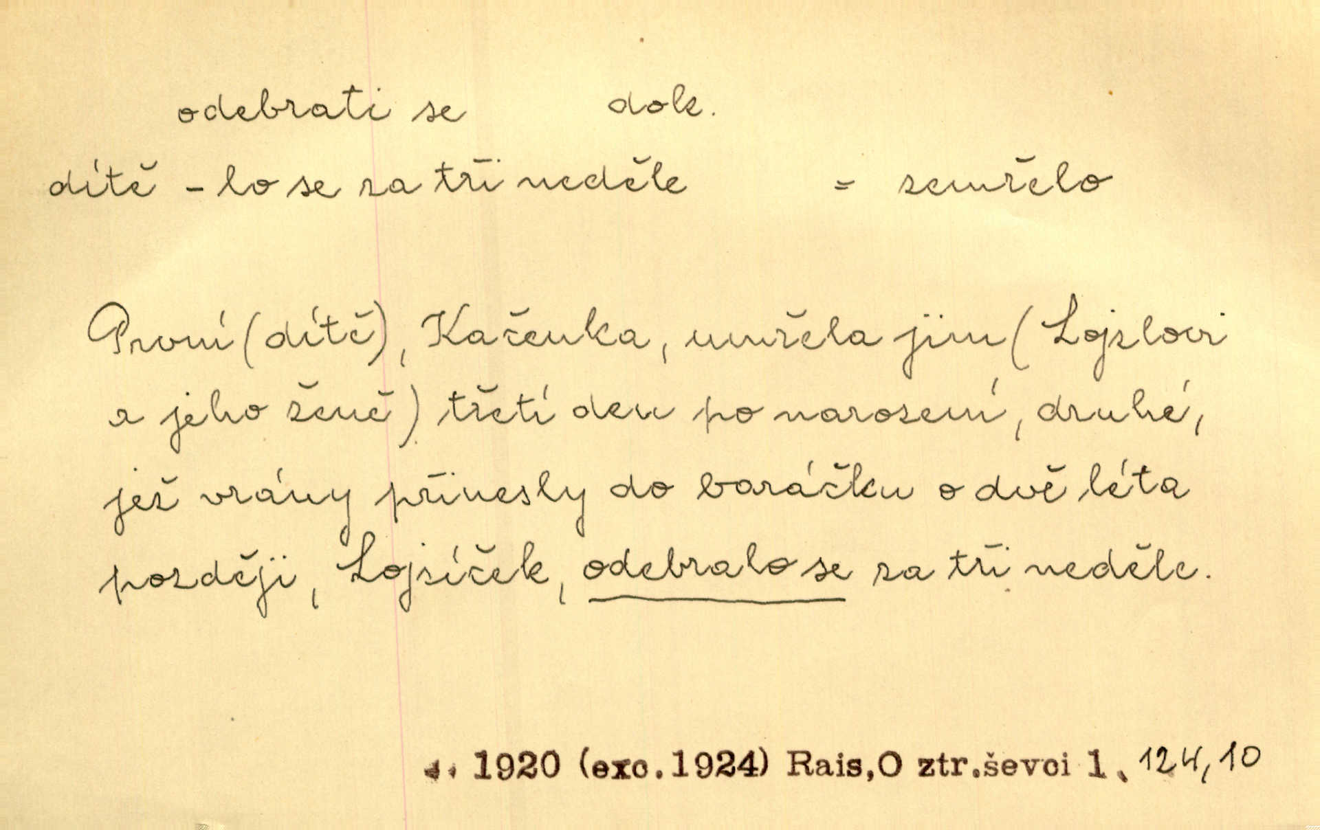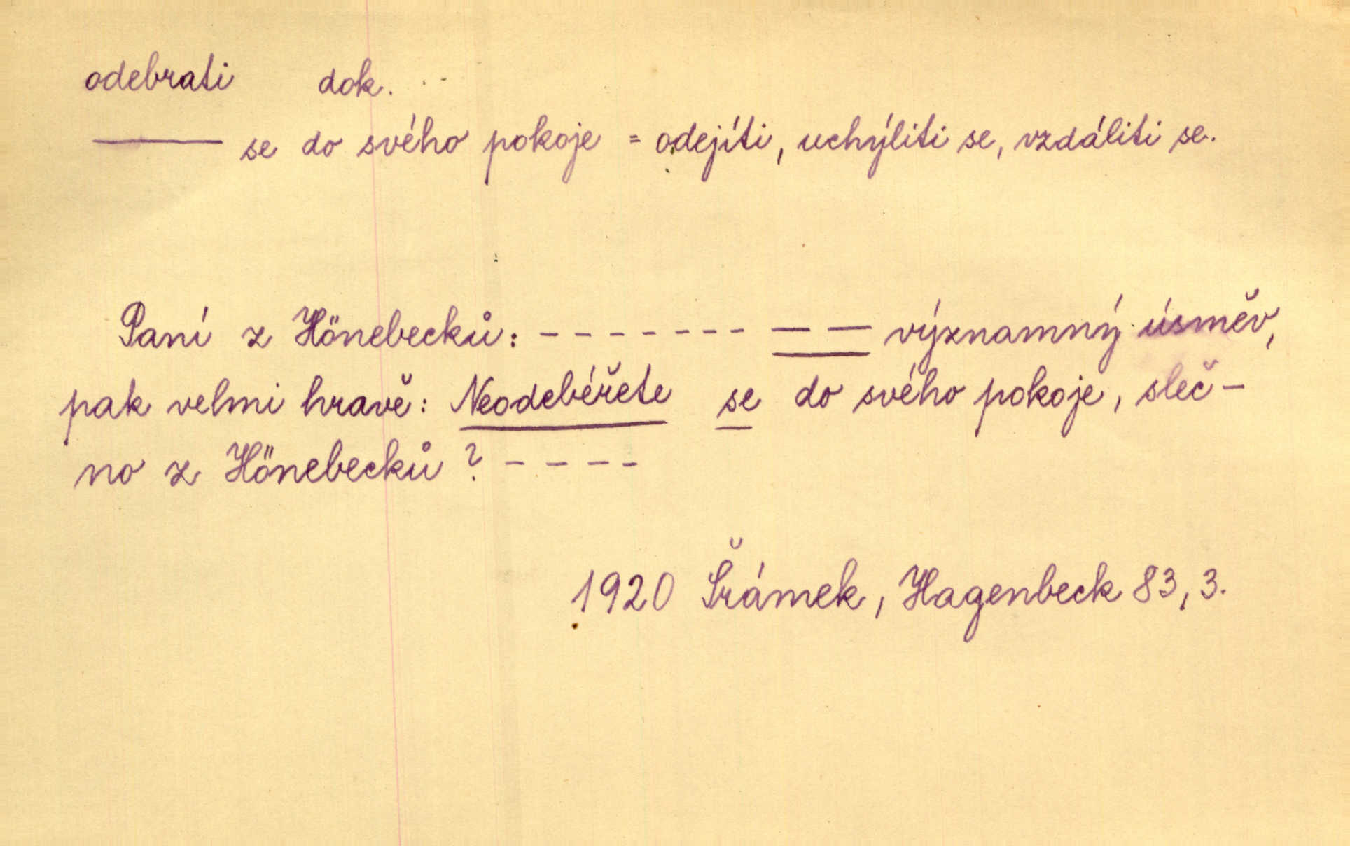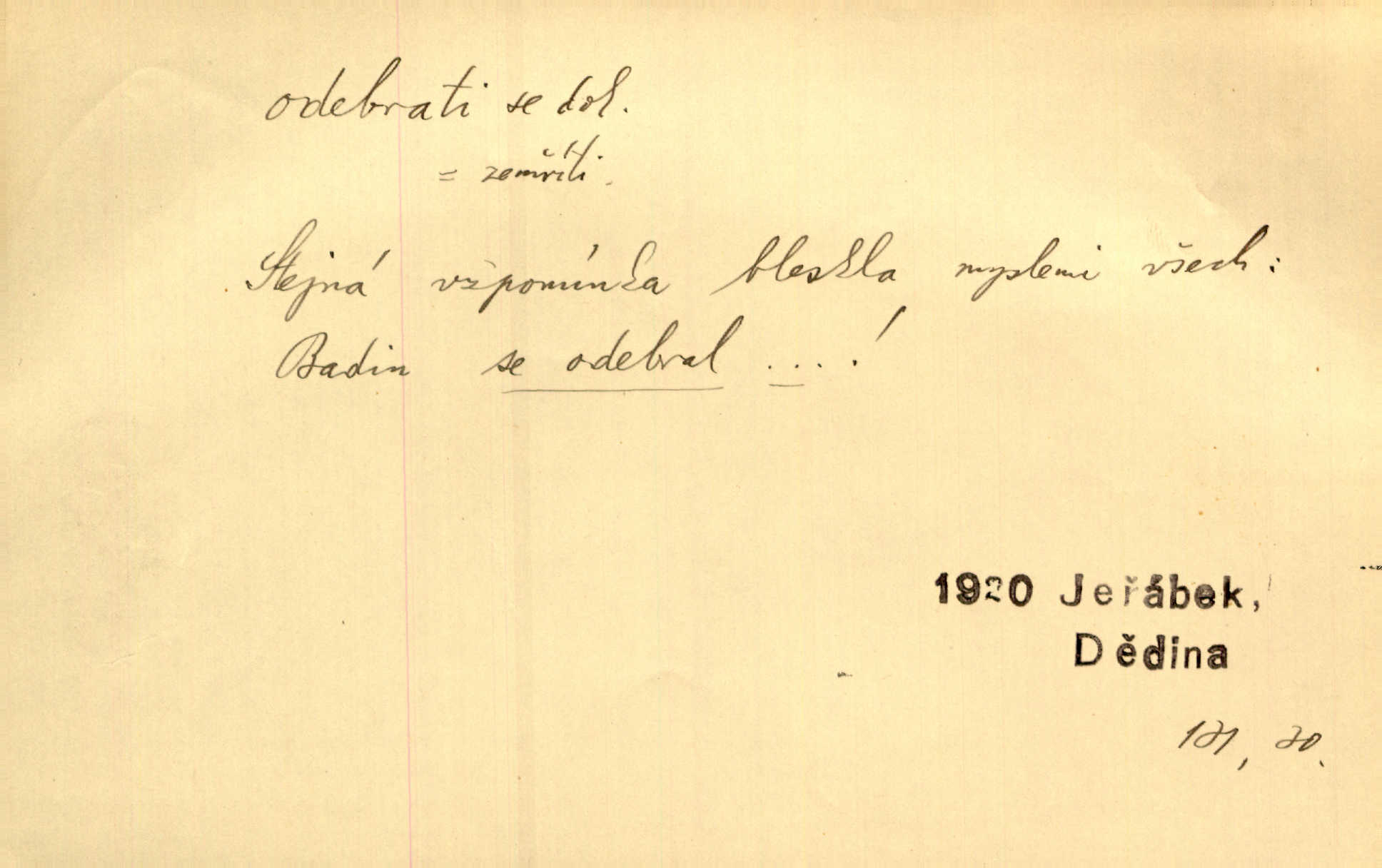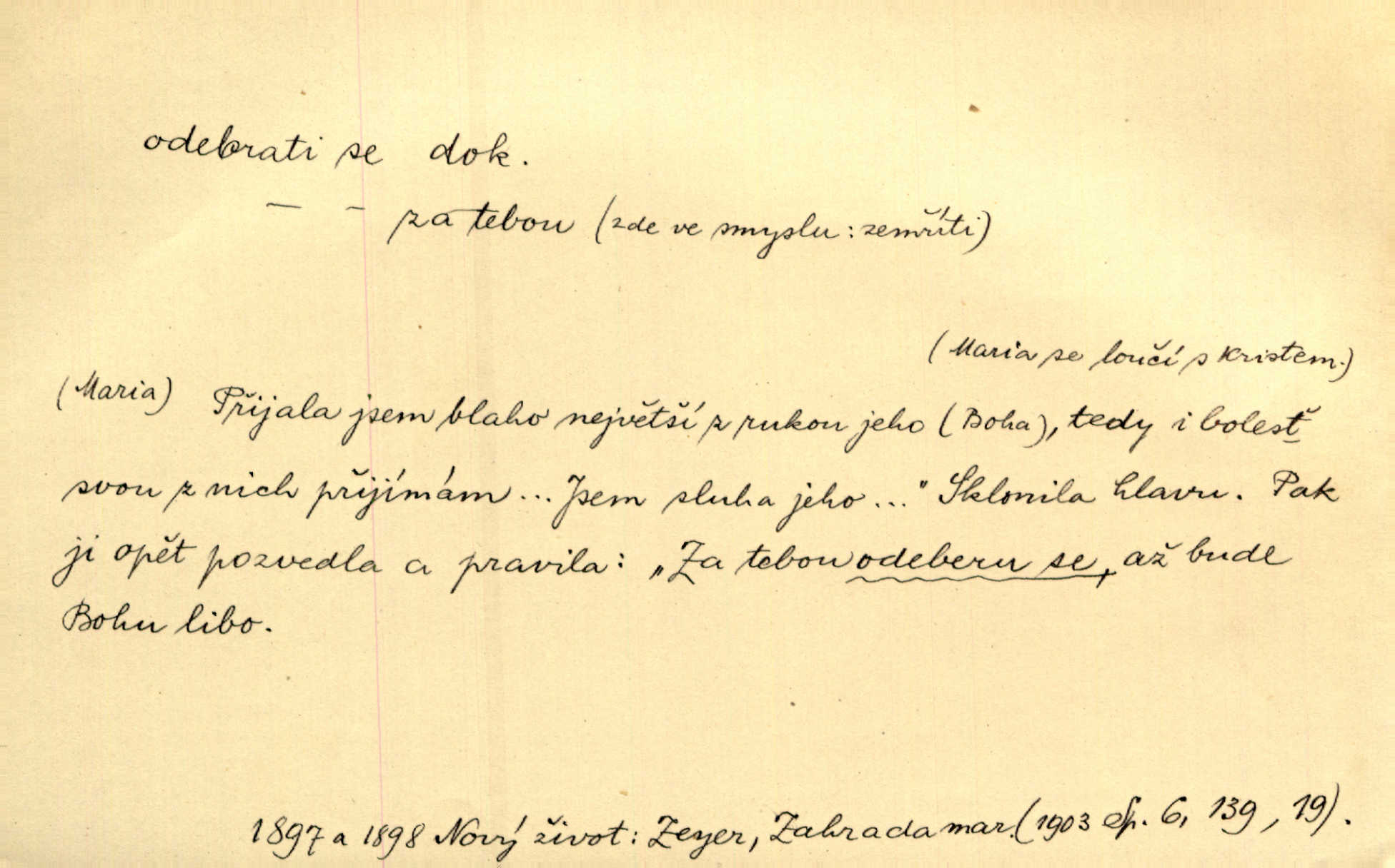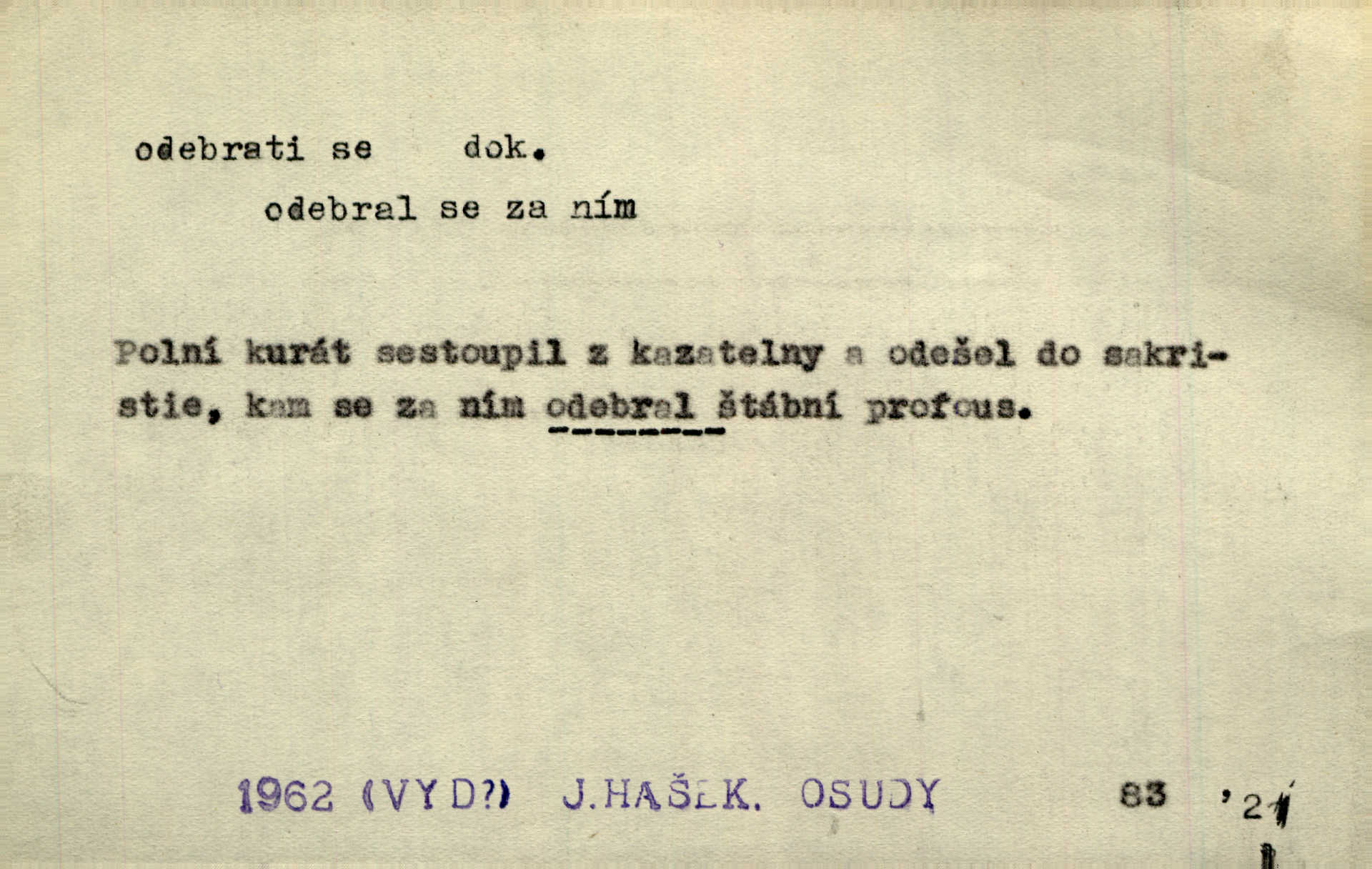 - odebrati se dok. odejíti. Opustil Prahu a odebral se na venek. Pfleg. Ty na Tetín se, paní, odebéřeš. Vrch. Bez groše odebral se na studie do Prahy. V. Mrš. V tomtéž okamžiku zvěstoval šramot, že se společnost chce odebrat. Ner. Shasiv světlo, odebral se na lože. I. Klicp. D odebrati se (na věčnost, na onen svět, k Abrahamu a pod.) eufem. zemříti. Odebral se z tiché fary na věčnost kněz dobrý. Čech. I ona za ním [mužem] k věčnému soudu se odebrala. Kun. Smíří se s nebem, udělá testament; odebere se na pravdu. Rub. V skutku byla jí dcerou pěstujíc ji, až se duše její k Pánu Bohu odebrala. Prav. Odebral se [kníže] k otcům. Hol. Čekají, brzy-li se odeberu k Ahrahamu. Just. Jen dlóho, Pane Bože, neležet a v pokoju se odebrat na onen svět. Mrš. Strouhal se odebral na jiný svět. Pfleg. Za tebou odeberu se [Maria za Kristem]‚ až bude Bohu libo. Zey. Co z ní [dcery] bude, kdybych odtud teď se odebrala? Svět. Druhé [dítě] odebralo se za tři neděle. Rais. Jene můj! jak časně jsi se odebral! Něm. Kdyby to tak bylo možná, lehčej bych se taky odebral. Šlej. „Barbora snad se vám už odebrala,“ pravil krajánek. M. Jahn. Hoří-li oheň v rošti na jedné straně, brzy někdo z domu se odebere. Lum. Starý vrátný dávno se odebral na hřbitov do Košíř. Pfleg.