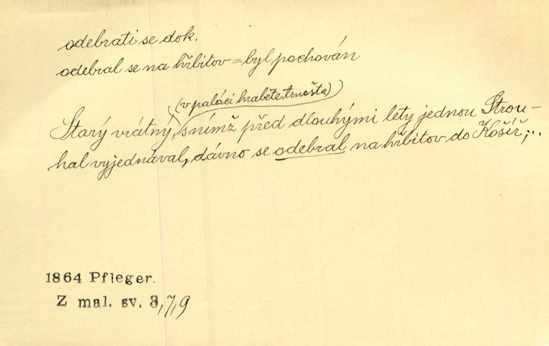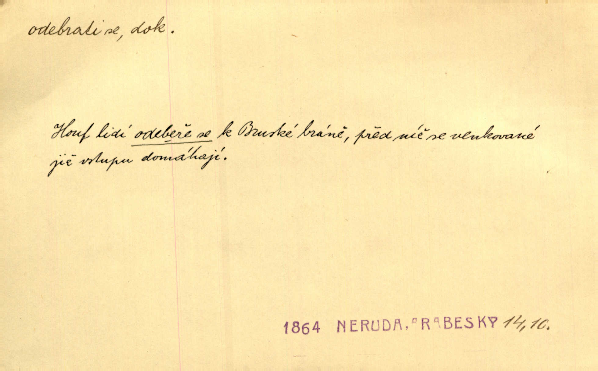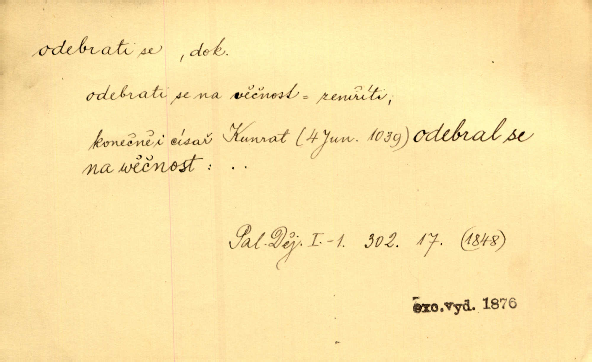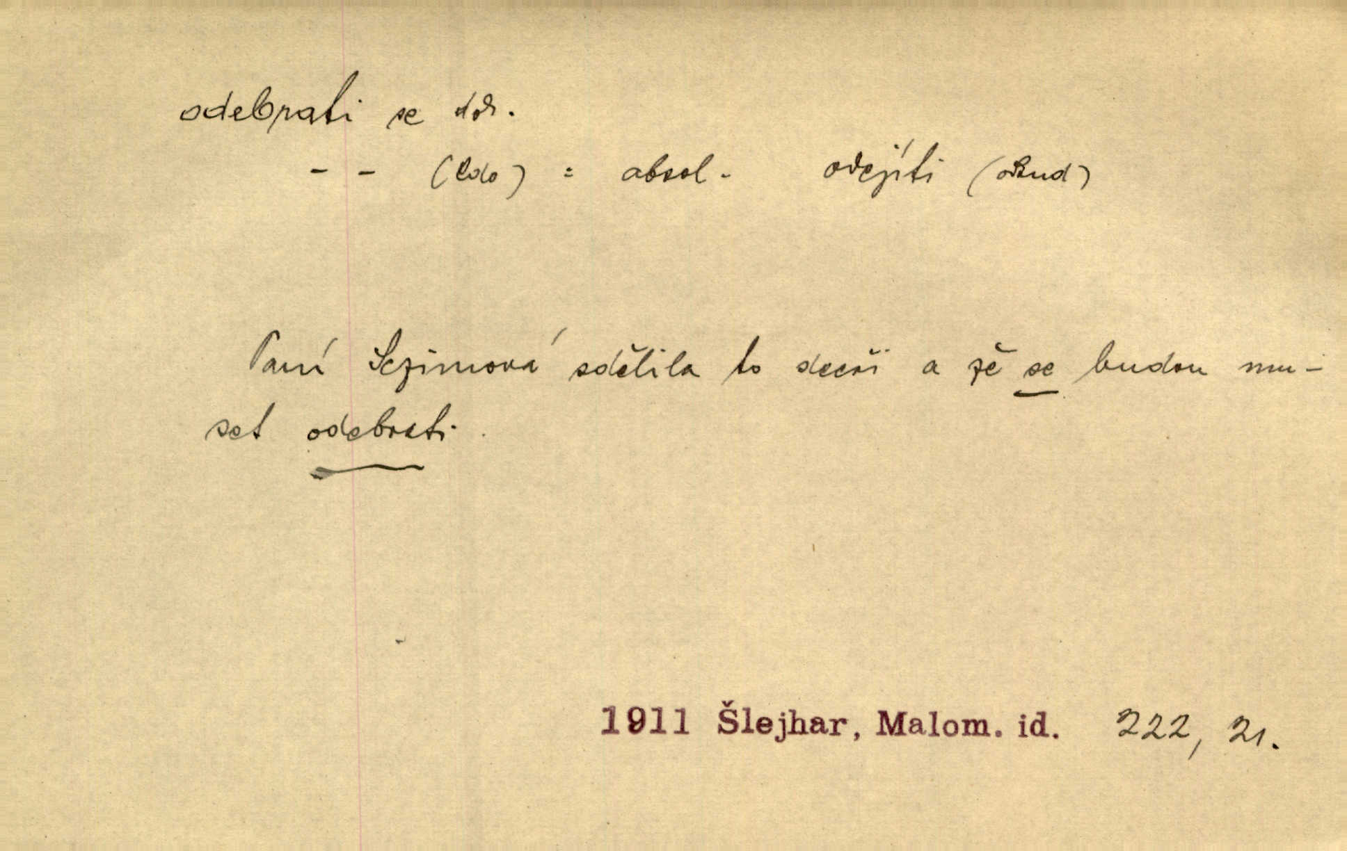 - odebrati se dok. odejíti. Opustil Prahu a odebral se na venek. Pfleg. Ty na Tetín se, paní, odebéřeš. Vrch. Bez groše odebral se na studie do Prahy. V. Mrš. V tomtéž okamžiku zvěstoval šramot, že se společnost chce odebrat. Ner. Shasiv světlo, odebral se na lože. I. Klicp. D odebrati se (na věčnost, na onen svět, k Abrahamu a pod.) eufem. zemříti. Odebral se z tiché fary na věčnost kněz dobrý. Čech. I ona za ním [mužem] k věčnému soudu se odebrala. Kun. Smíří se s nebem, udělá testament; odebere se na pravdu. Rub. V skutku byla jí dcerou pěstujíc ji, až se duše její k Pánu Bohu odebrala. Prav. Odebral se [kníže] k otcům. Hol. Čekají, brzy-li se odeberu k Ahrahamu. Just. Jen dlóho, Pane Bože, neležet a v pokoju se odebrat na onen svět. Mrš. Strouhal se odebral na jiný svět. Pfleg. Za tebou odeberu se [Maria za Kristem]‚ až bude Bohu libo. Zey. Co z ní [dcery] bude, kdybych odtud teď se odebrala? Svět. Druhé [dítě] odebralo se za tři neděle. Rais. Jene můj! jak časně jsi se odebral! Něm. Kdyby to tak bylo možná, lehčej bych se taky odebral. Šlej. „Barbora snad se vám už odebrala,“ pravil krajánek. M. Jahn. Hoří-li oheň v rošti na jedné straně, brzy někdo z domu se odebere. Lum. Starý vrátný dávno se odebral na hřbitov do Košíř. Pfleg.
