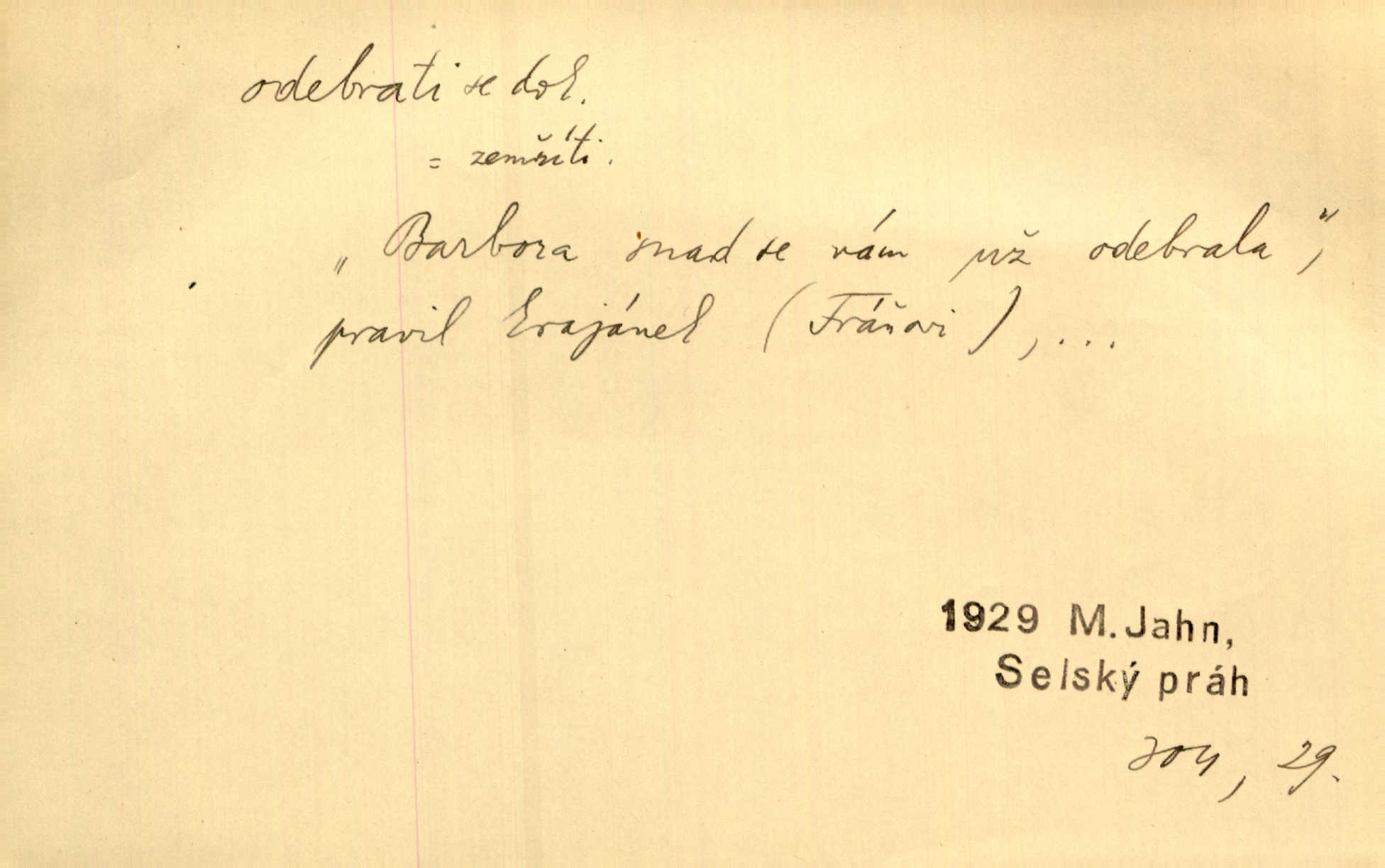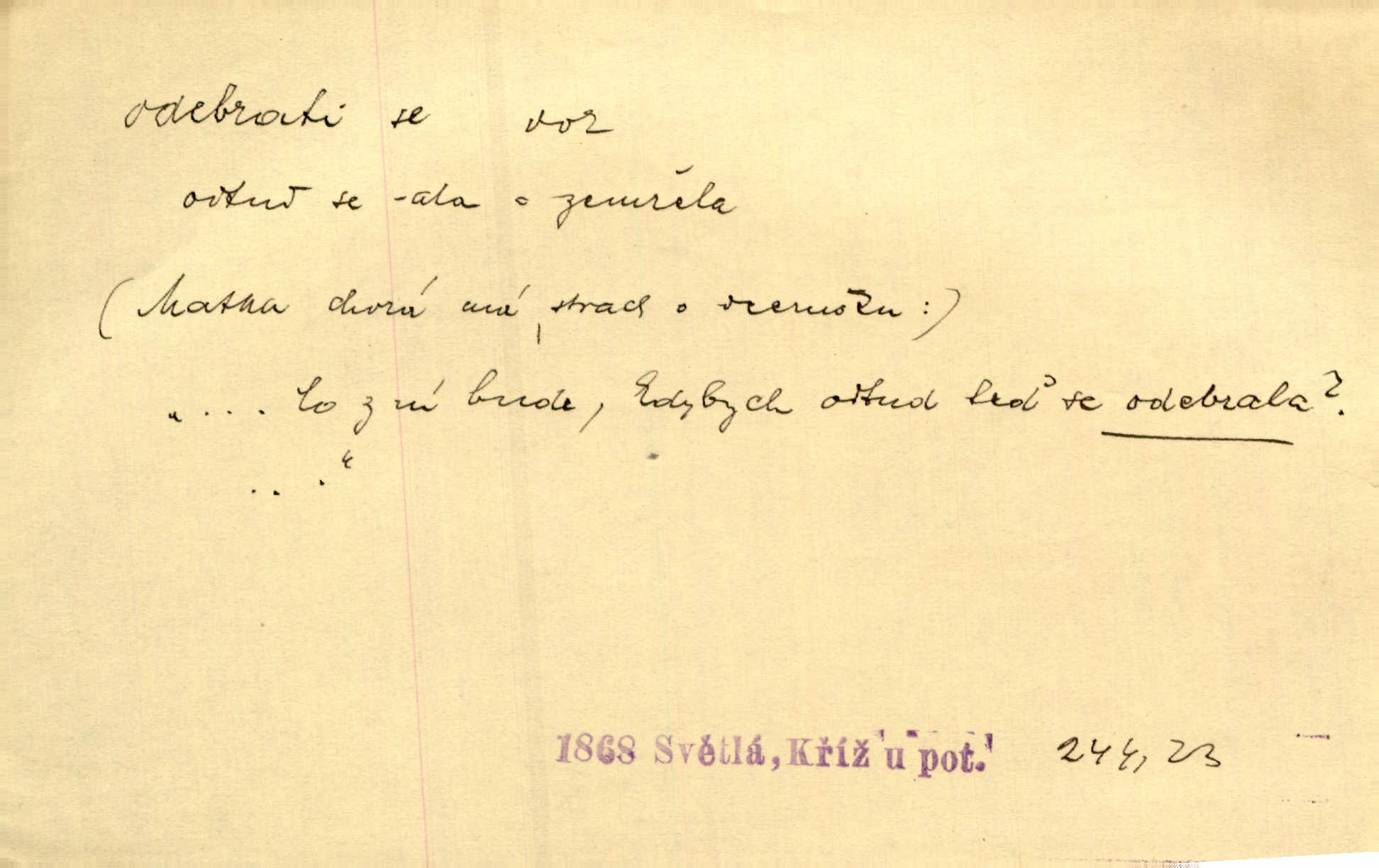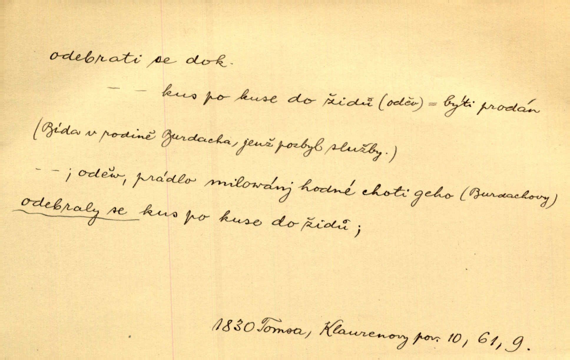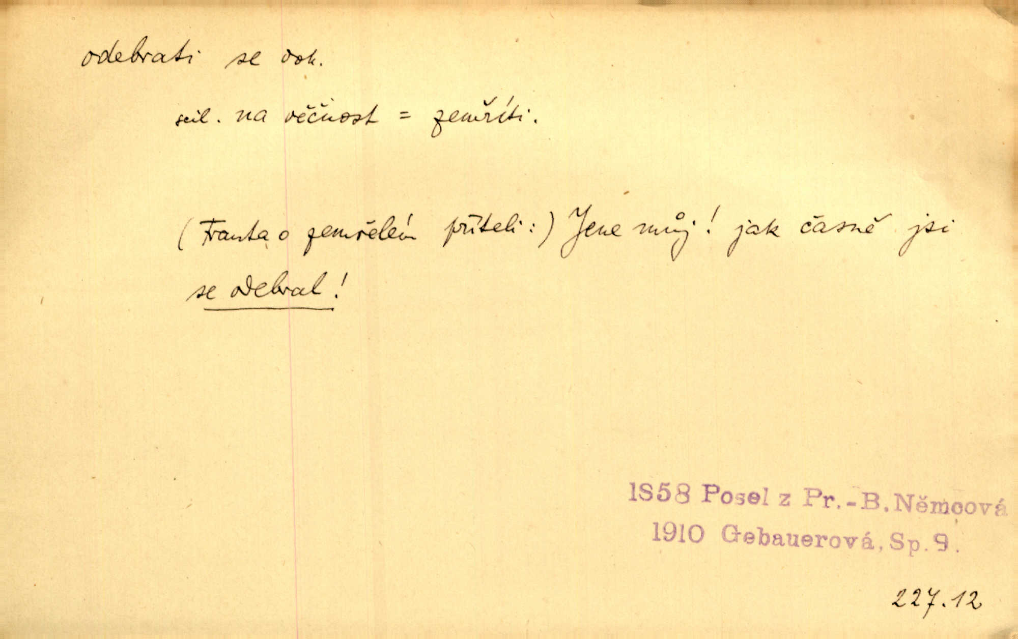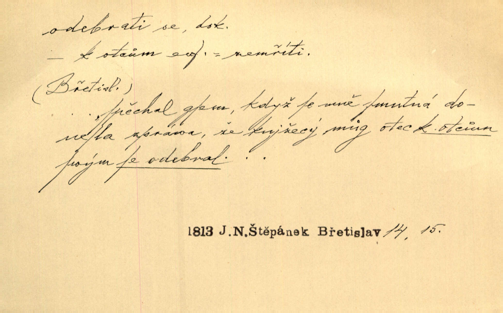 - odebrati se dok. odejíti. Opustil Prahu a odebral se na venek. Pfleg. Ty na Tetín se, paní, odebéřeš. Vrch. Bez groše odebral se na studie do Prahy. V. Mrš. V tomtéž okamžiku zvěstoval šramot, že se společnost chce odebrat. Ner. Shasiv světlo, odebral se na lože. I. Klicp. D odebrati se (na věčnost, na onen svět, k Abrahamu a pod.) eufem. zemříti. Odebral se z tiché fary na věčnost kněz dobrý. Čech. I ona za ním [mužem] k věčnému soudu se odebrala. Kun. Smíří se s nebem, udělá testament; odebere se na pravdu. Rub. V skutku byla jí dcerou pěstujíc ji, až se duše její k Pánu Bohu odebrala. Prav. Odebral se [kníže] k otcům. Hol. Čekají, brzy-li se odeberu k Ahrahamu. Just. Jen dlóho, Pane Bože, neležet a v pokoju se odebrat na onen svět. Mrš. Strouhal se odebral na jiný svět. Pfleg. Za tebou odeberu se [Maria za Kristem]‚ až bude Bohu libo. Zey. Co z ní [dcery] bude, kdybych odtud teď se odebrala? Svět. Druhé [dítě] odebralo se za tři neděle. Rais. Jene můj! jak časně jsi se odebral! Něm. Kdyby to tak bylo možná, lehčej bych se taky odebral. Šlej. „Barbora snad se vám už odebrala,“ pravil krajánek. M. Jahn. Hoří-li oheň v rošti na jedné straně, brzy někdo z domu se odebere. Lum. Starý vrátný dávno se odebral na hřbitov do Košíř. Pfleg.
