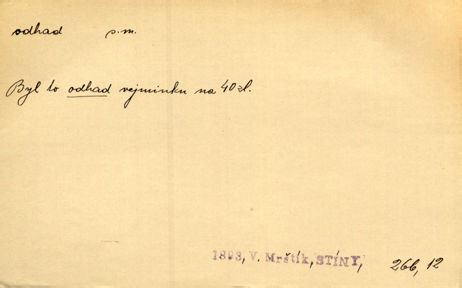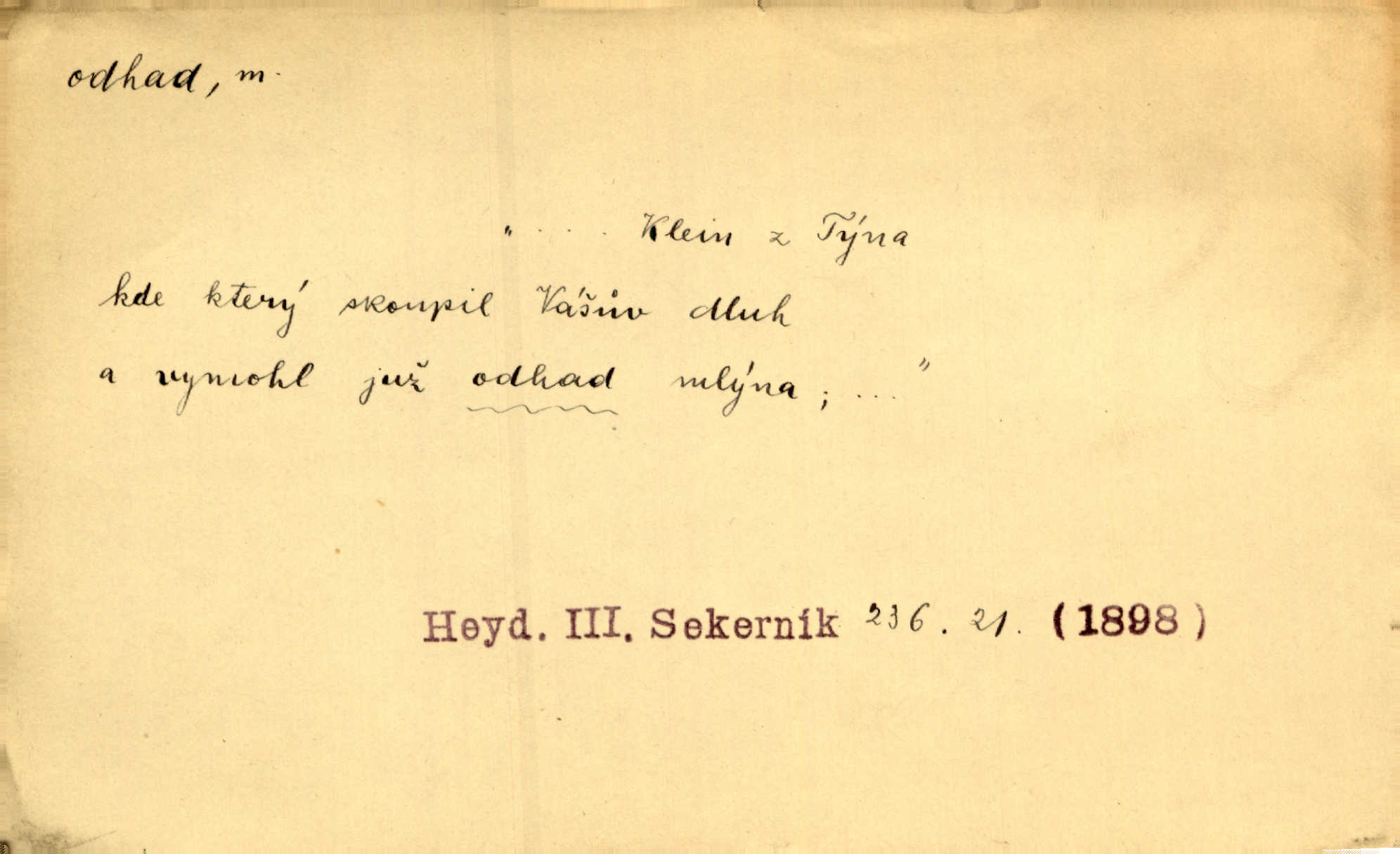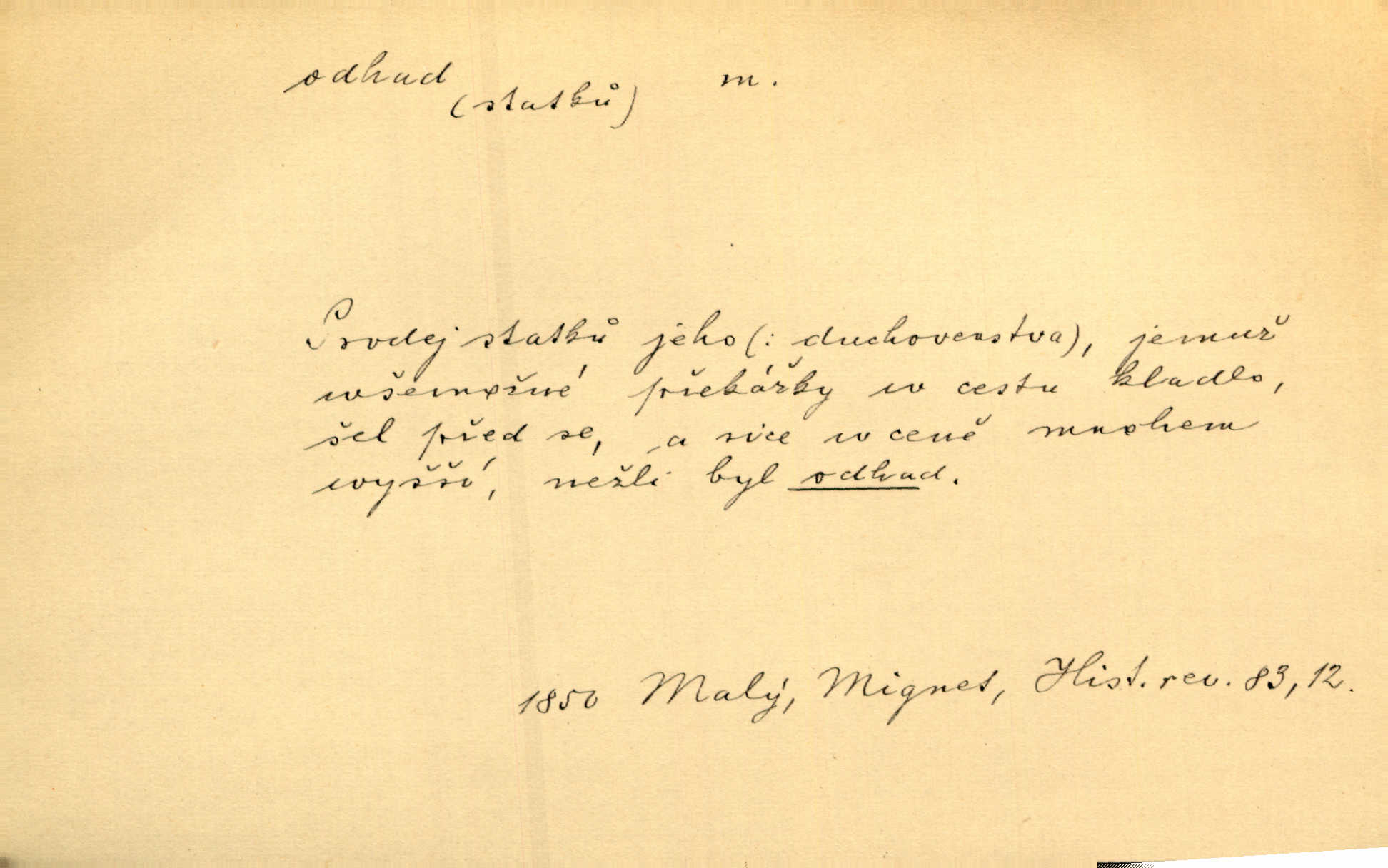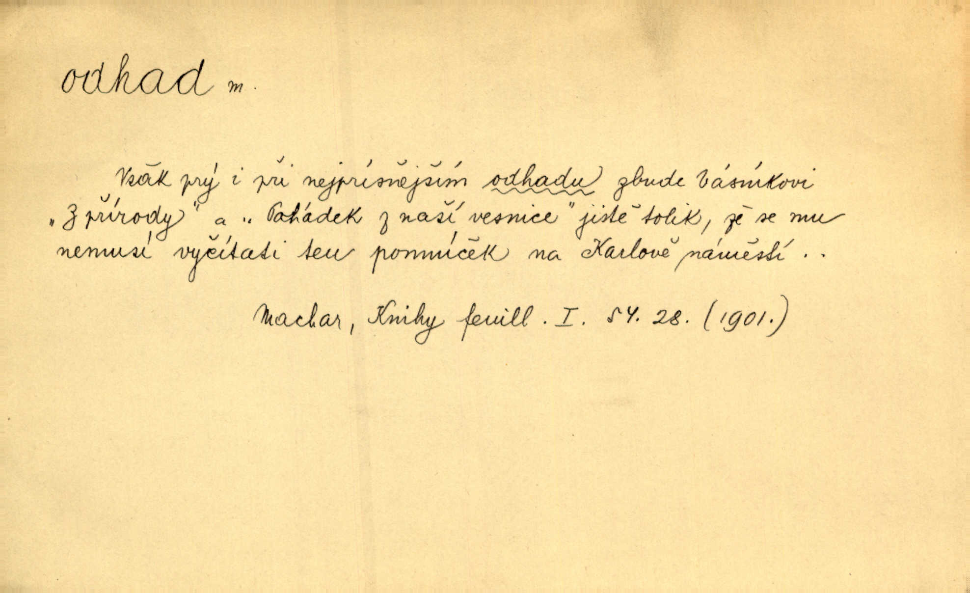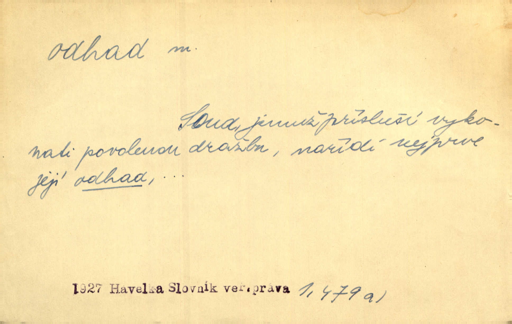 - odhad, -u m. úkon, jehož úkolem je zjistiti pravou cenu věci. Klein z Týna kde který skoupil Vášův dluh a vymohl juž odhad mlýna. Heyd. Však i při nejpřísnějším odhadu zbude básníkovi „Z přírody“ a „Pohádek z naší vesnice“ jistě tolik, že se mu nemusí vyčítati ten pomníček na Karlově náměstí. Mach. Obch. vyšetření hodnoty (na př. nějakého zboží) podle rozličných method.