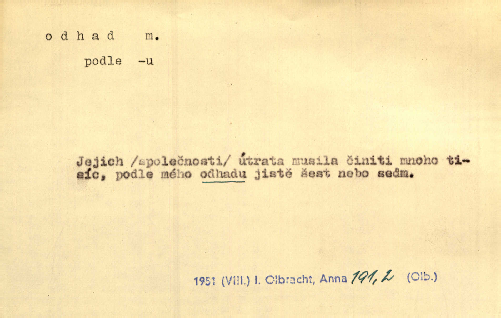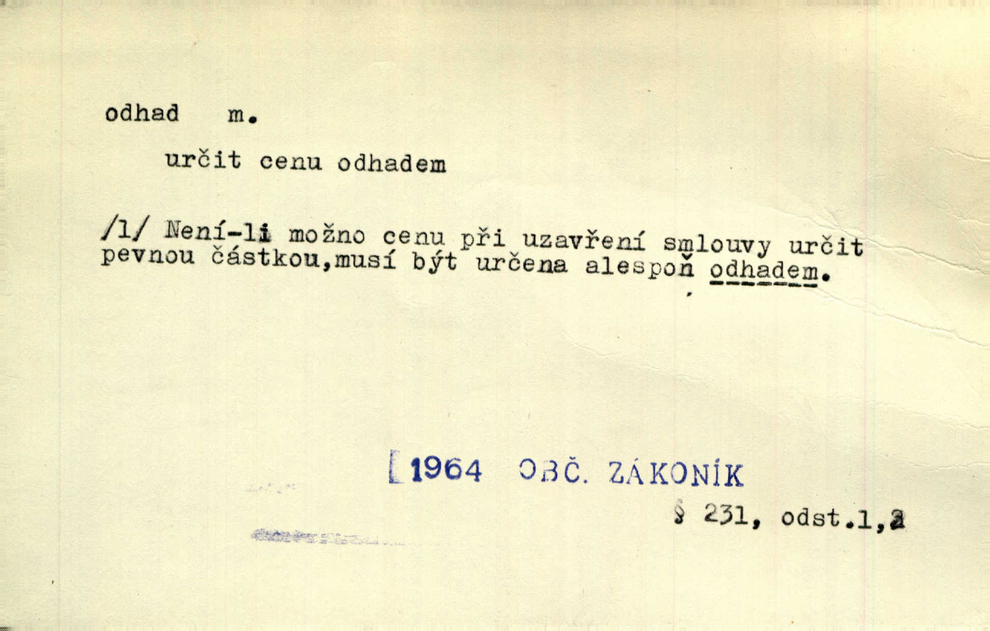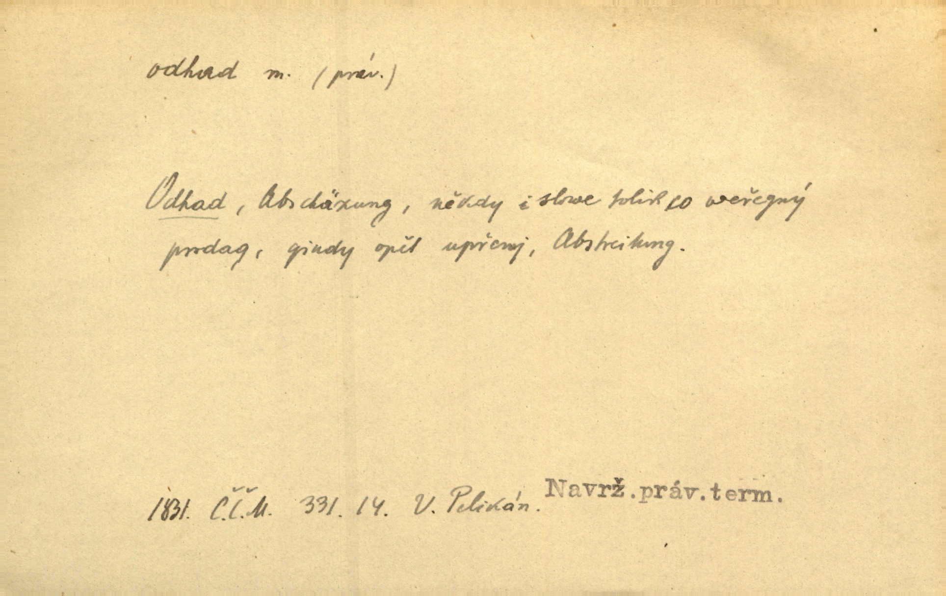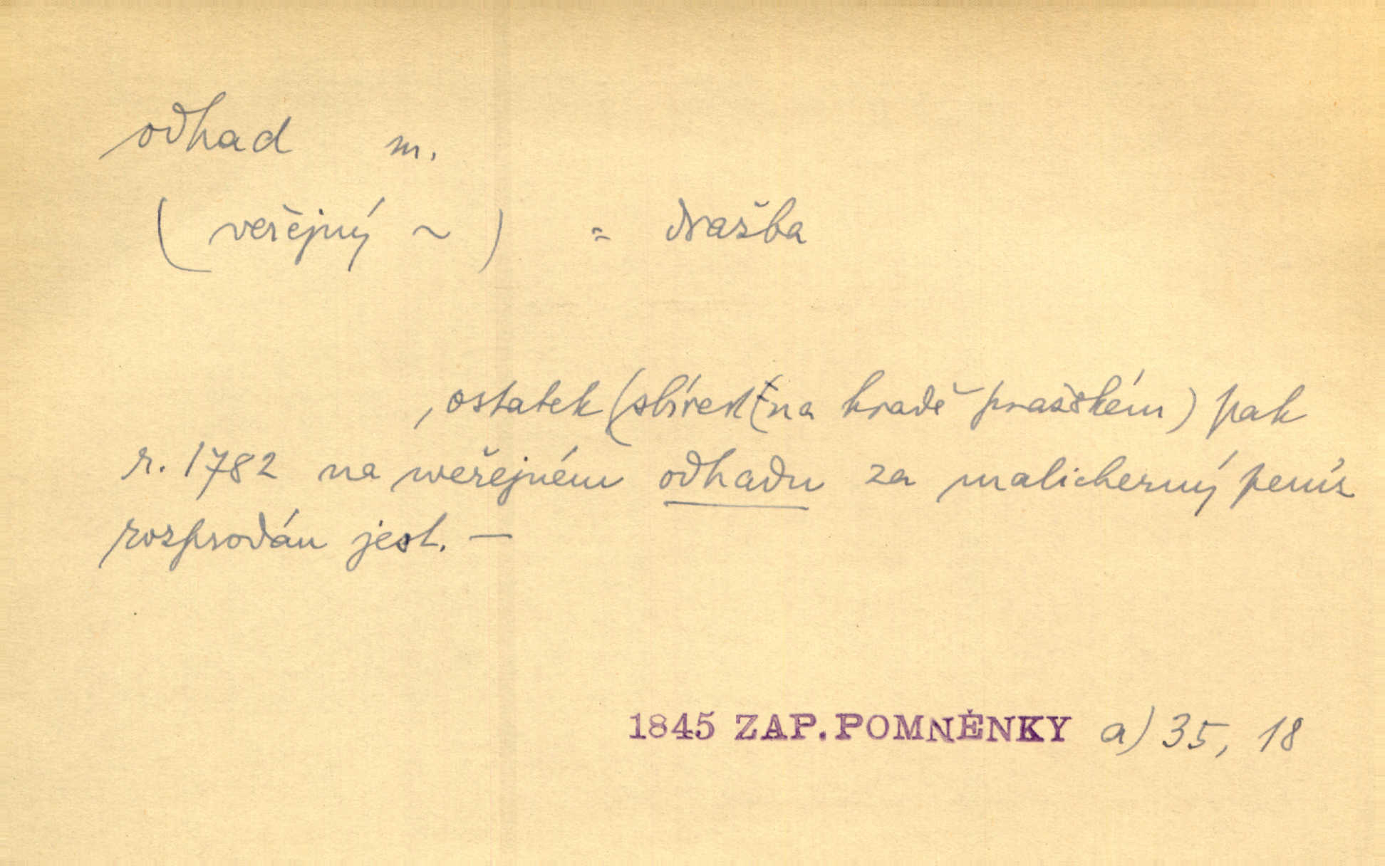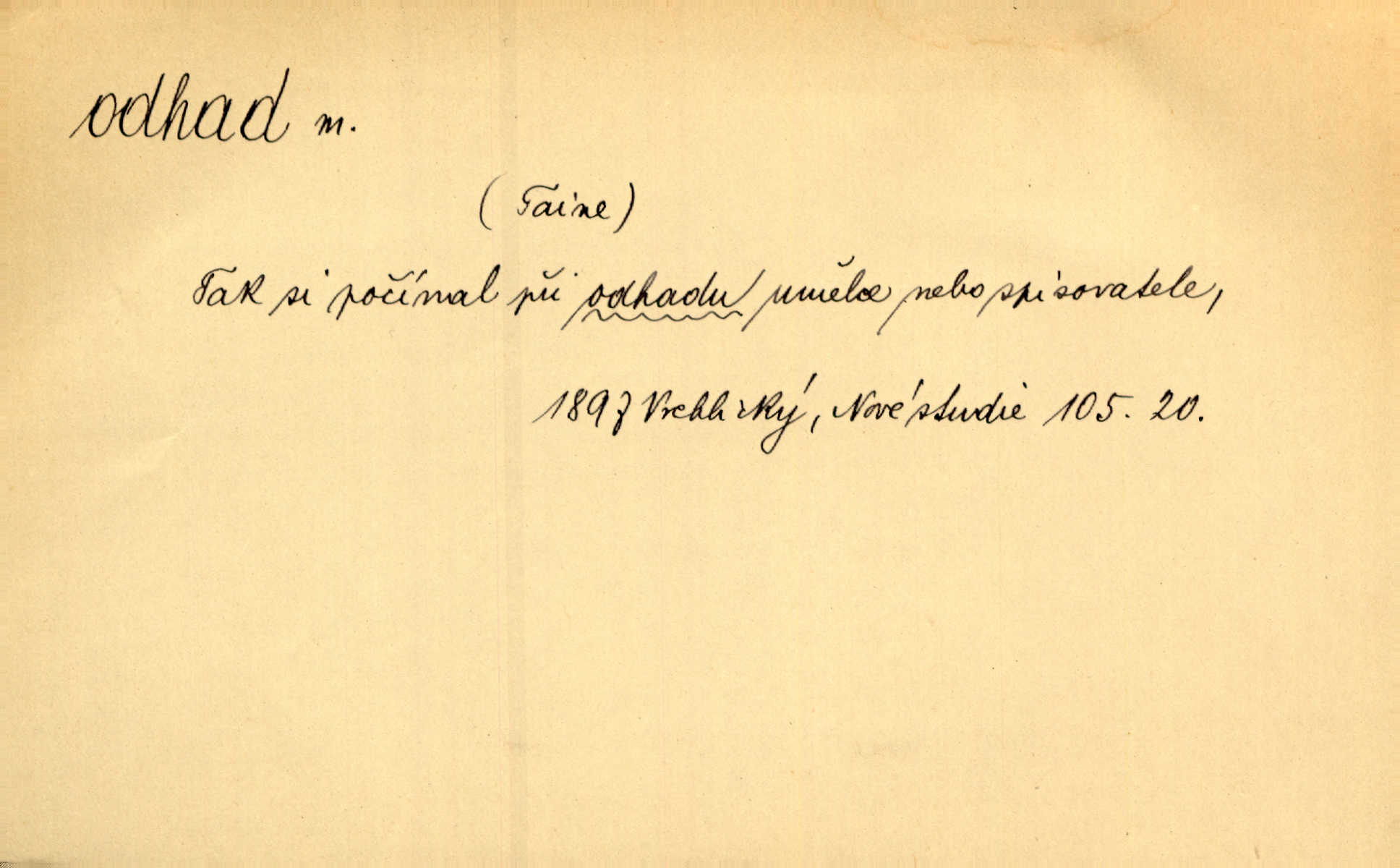 - odhad, -u m. úkon, jehož úkolem je zjistiti pravou cenu věci. Klein z Týna kde který skoupil Vášův dluh a vymohl juž odhad mlýna. Heyd. Však i při nejpřísnějším odhadu zbude básníkovi „Z přírody“ a „Pohádek z naší vesnice“ jistě tolik, že se mu nemusí vyčítati ten pomníček na Karlově náměstí. Mach. Obch. vyšetření hodnoty (na př. nějakého zboží) podle rozličných method.