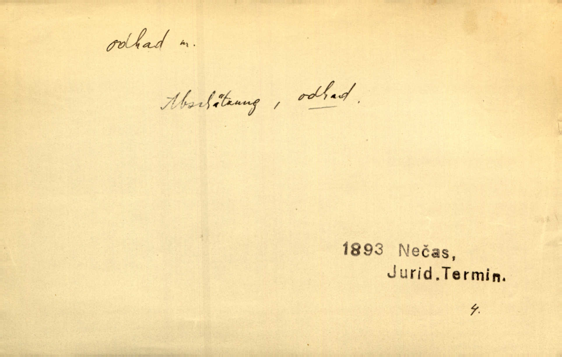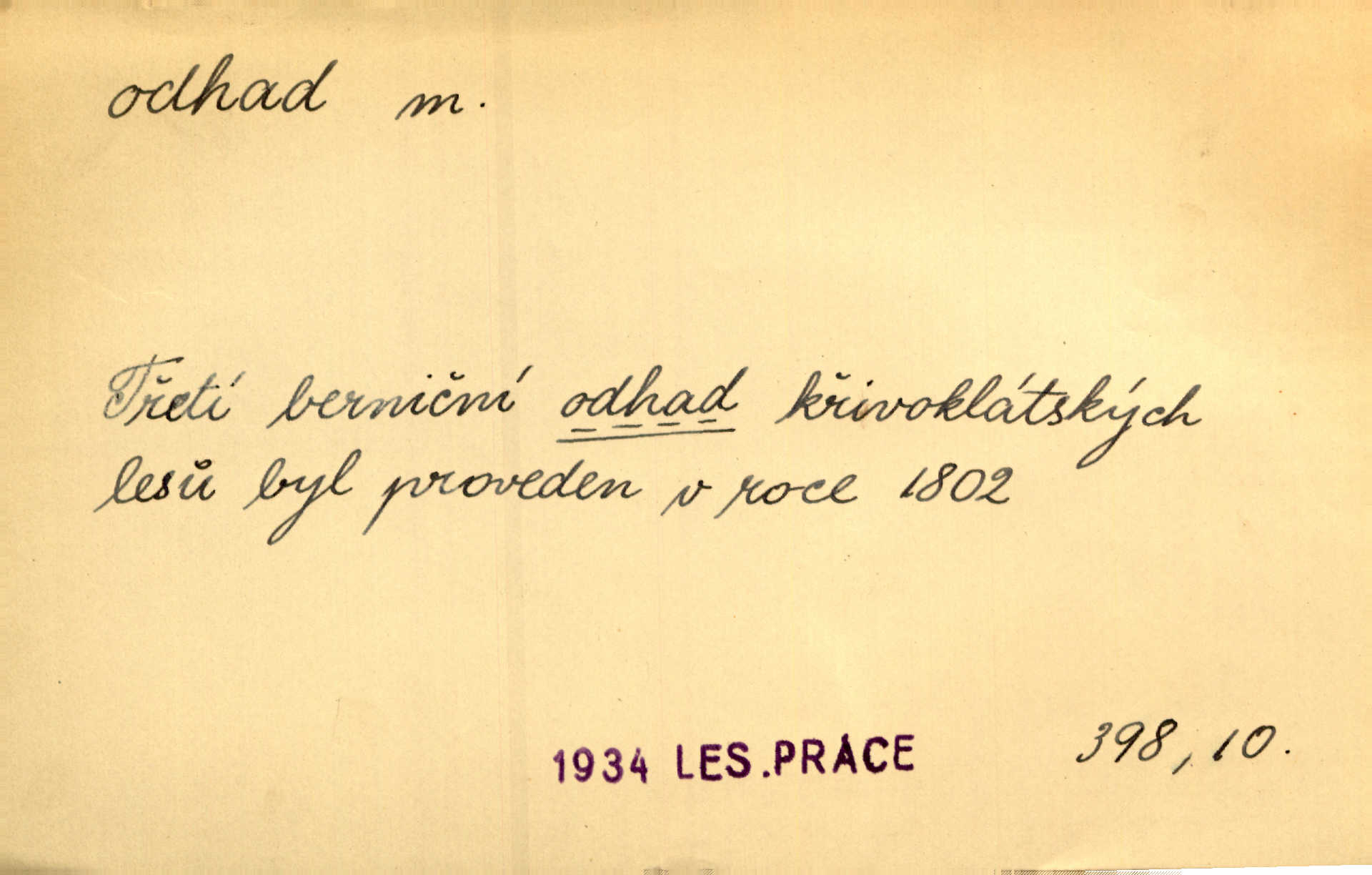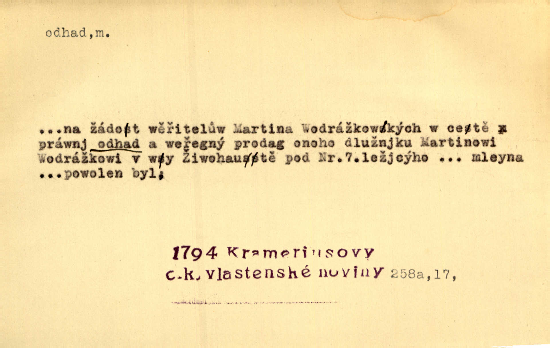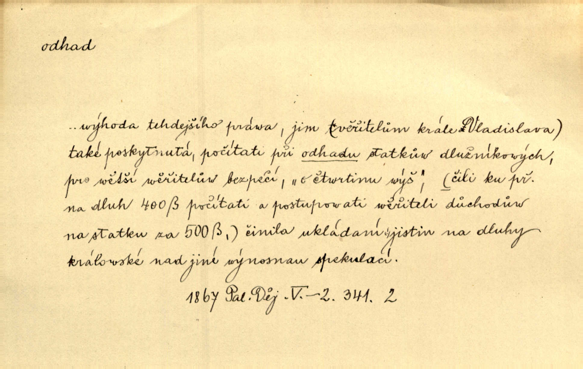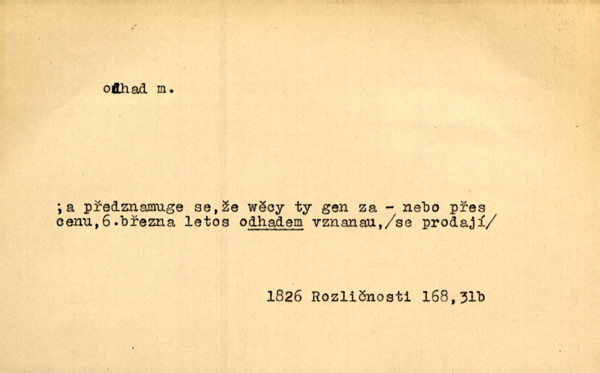 - odhad, -u m. úkon, jehož úkolem je zjistiti pravou cenu věci. Klein z Týna kde který skoupil Vášův dluh a vymohl juž odhad mlýna. Heyd. Však i při nejpřísnějším odhadu zbude básníkovi „Z přírody“ a „Pohádek z naší vesnice“ jistě tolik, že se mu nemusí vyčítati ten pomníček na Karlově náměstí. Mach. Obch. vyšetření hodnoty (na př. nějakého zboží) podle rozličných method.