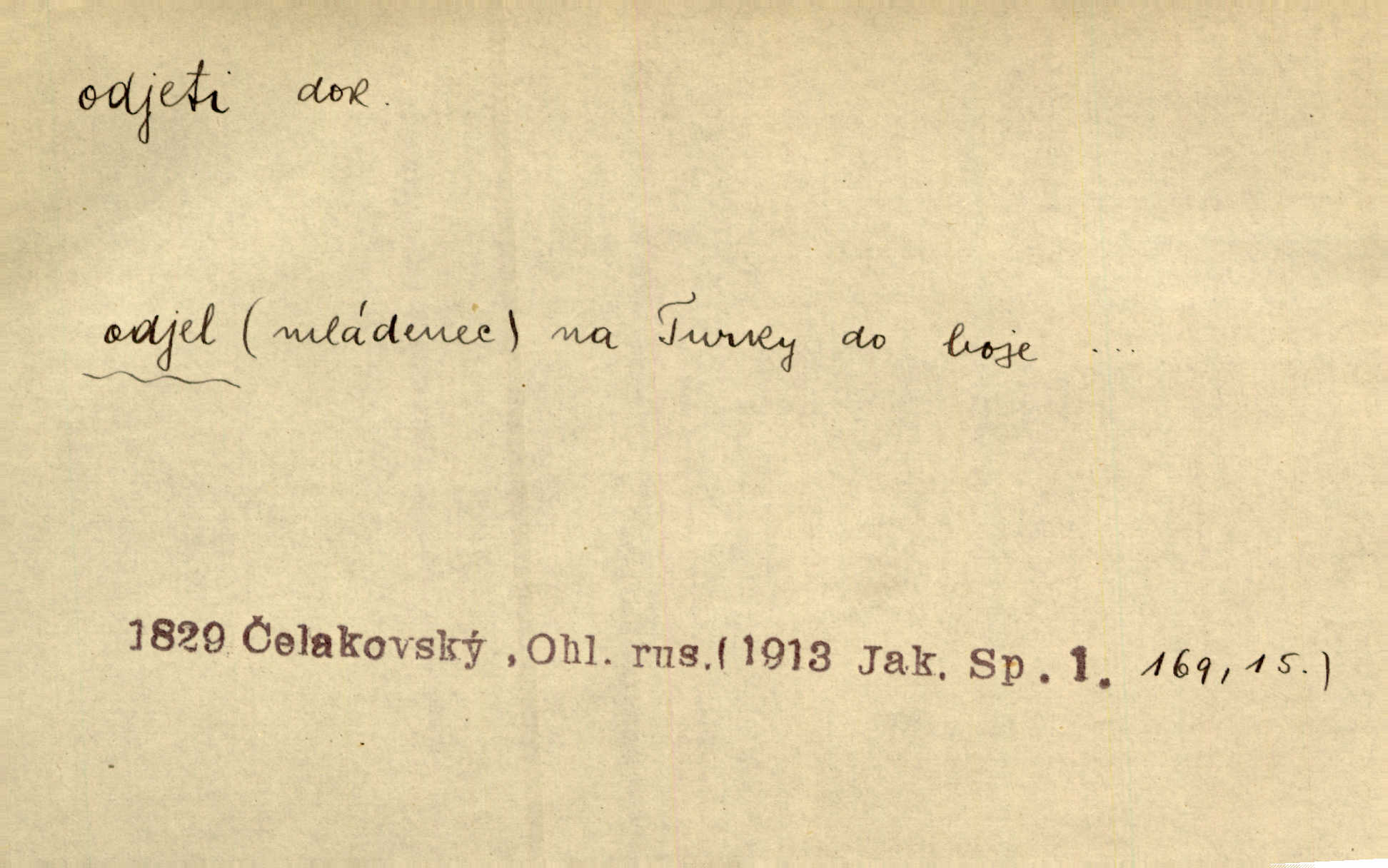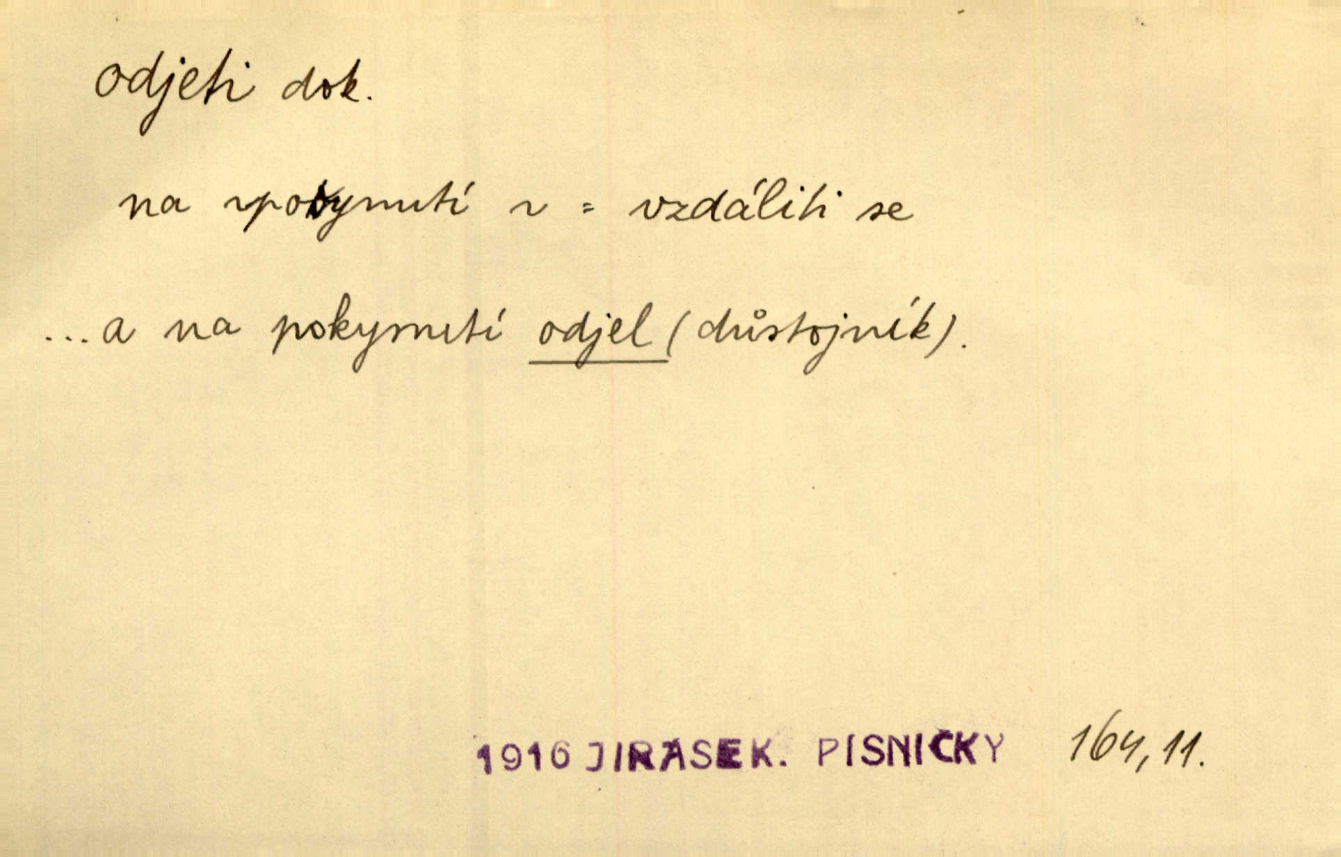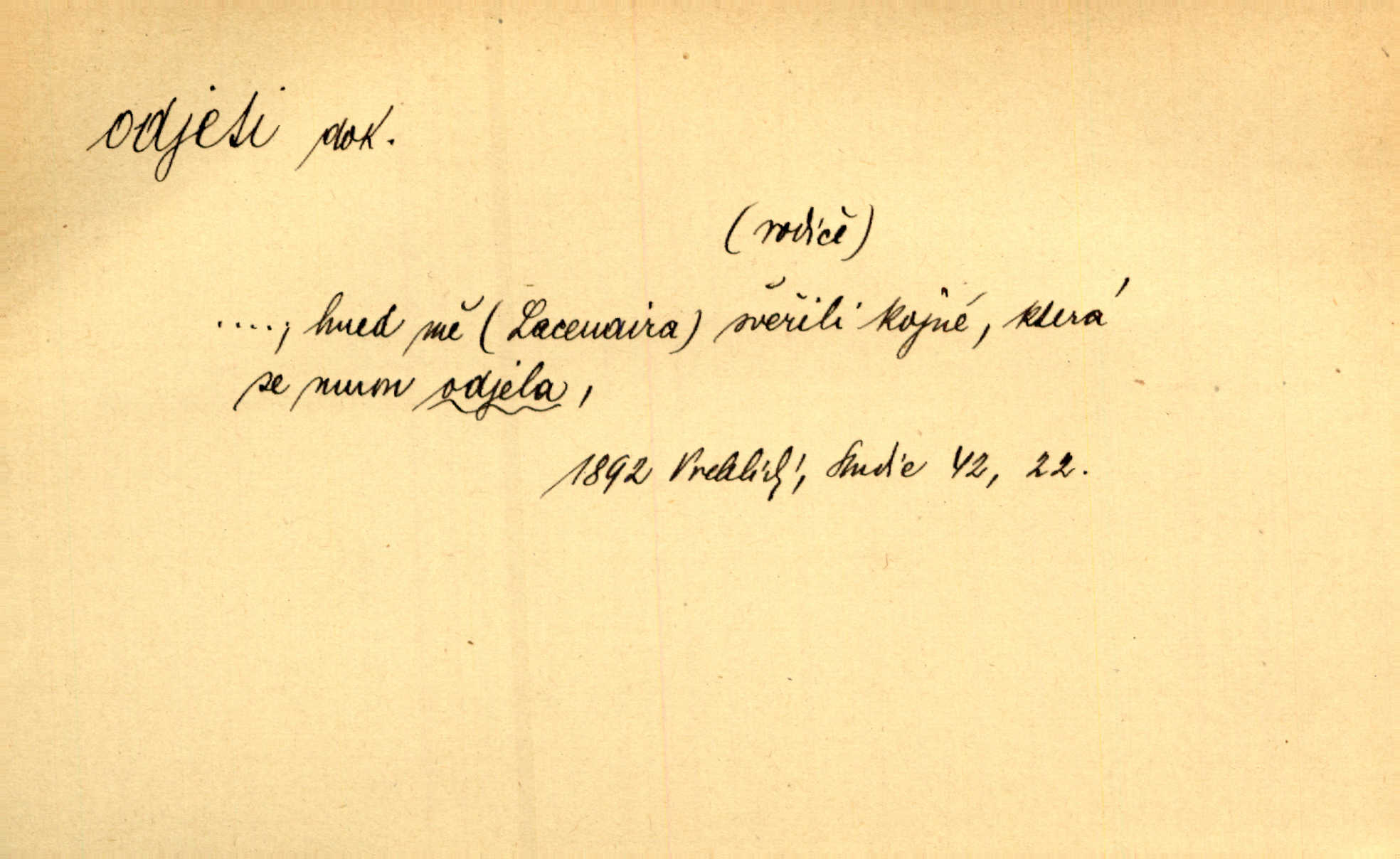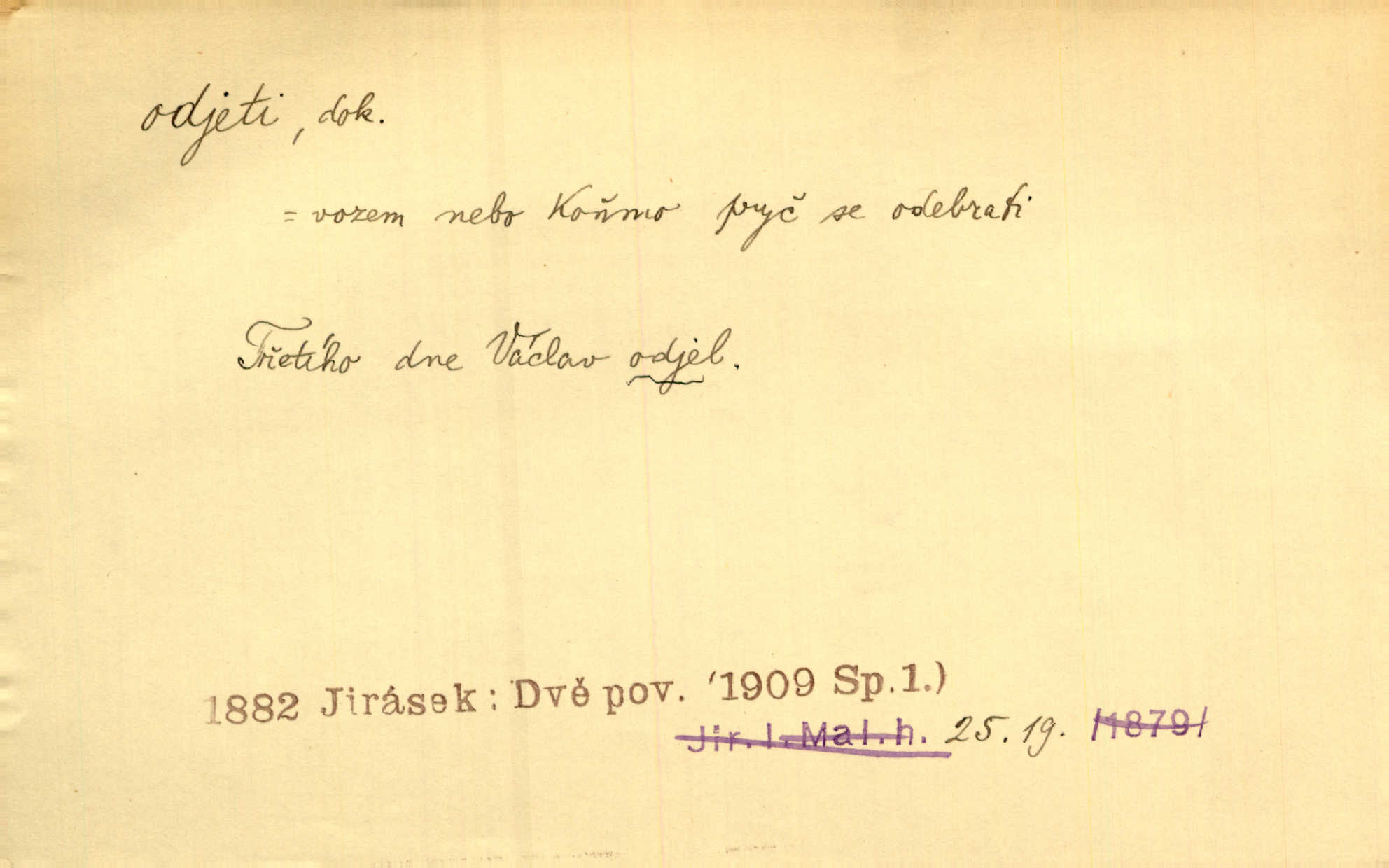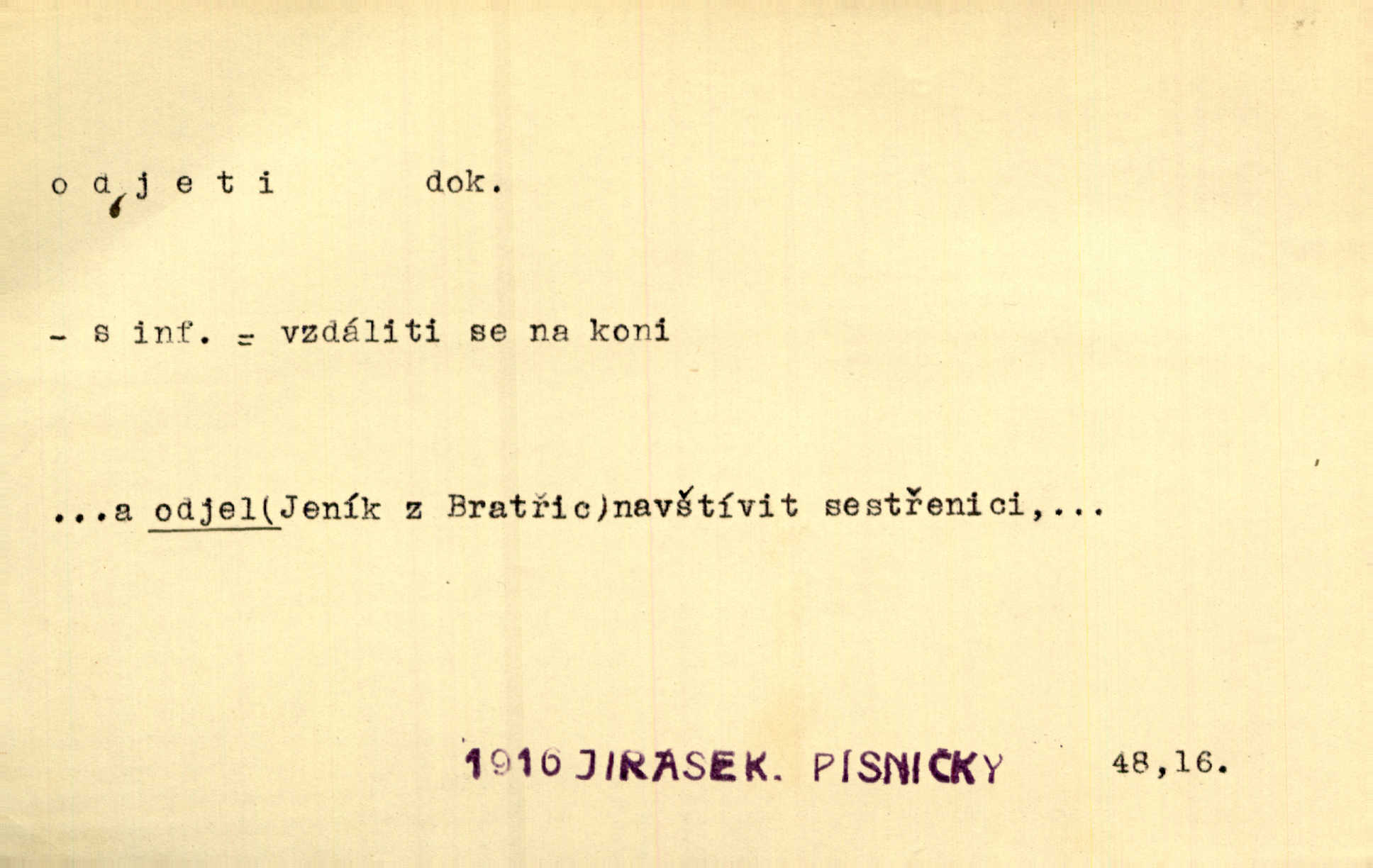 - odjeti (řidč. odejeti) dok. (o člověku n. jiném tvoru) vozmo n. jízdmo nějaké místo opustiti. Císař s dvorem odjeli z Prahy, císař v krytém voze. Jir. Odjel [vozka] za svou povinností. Šmil. Vskočil do fiakru a odjel. Ner. Prohlásila, že večerním vlakem odjede k mamince. Vach. Neříkaje nikomu kam a proč, odjel si sám do Libějic. Podl. Sardus, syn Heraklův, odjel do Lybie s loďstvem odplul. Vrch. Rozloučil se mladý manžel s drahou Dobrunkou a odejel do boje. Něm. [Kněžna] pokynula comtesse k odjetí, obě vsedly na koně. Něm. Odjede, odkud není návratu zemře. Šmil. D (o vozidle n. plavidle) opustiti nějaké místo. Kočí práskl do koně a povoz, seč sešlý kůň klusati mohl, odejel. Arb. S Blaženou promluvil spěšně několik slov, ani vozu nedal odejet. R. Svob.