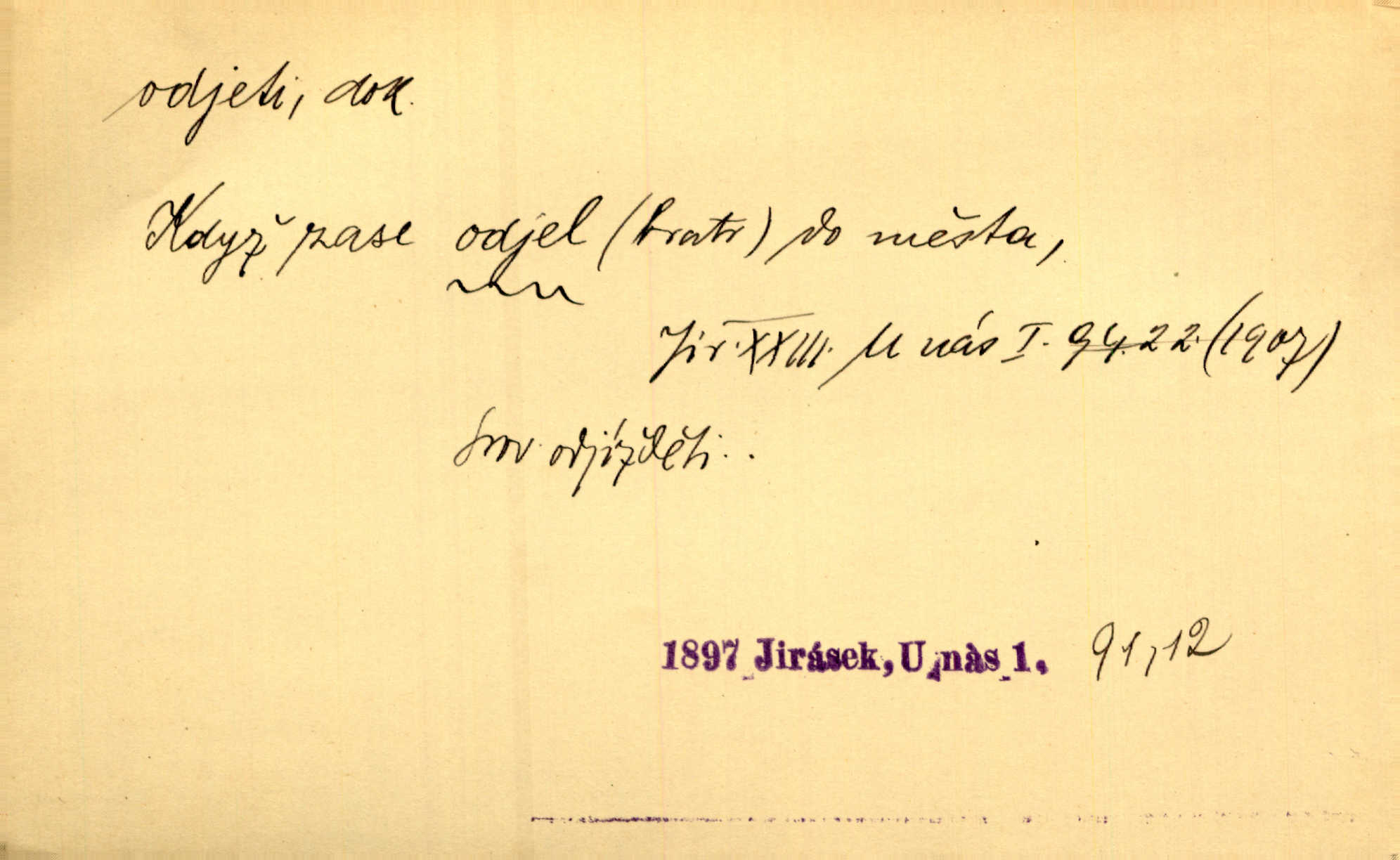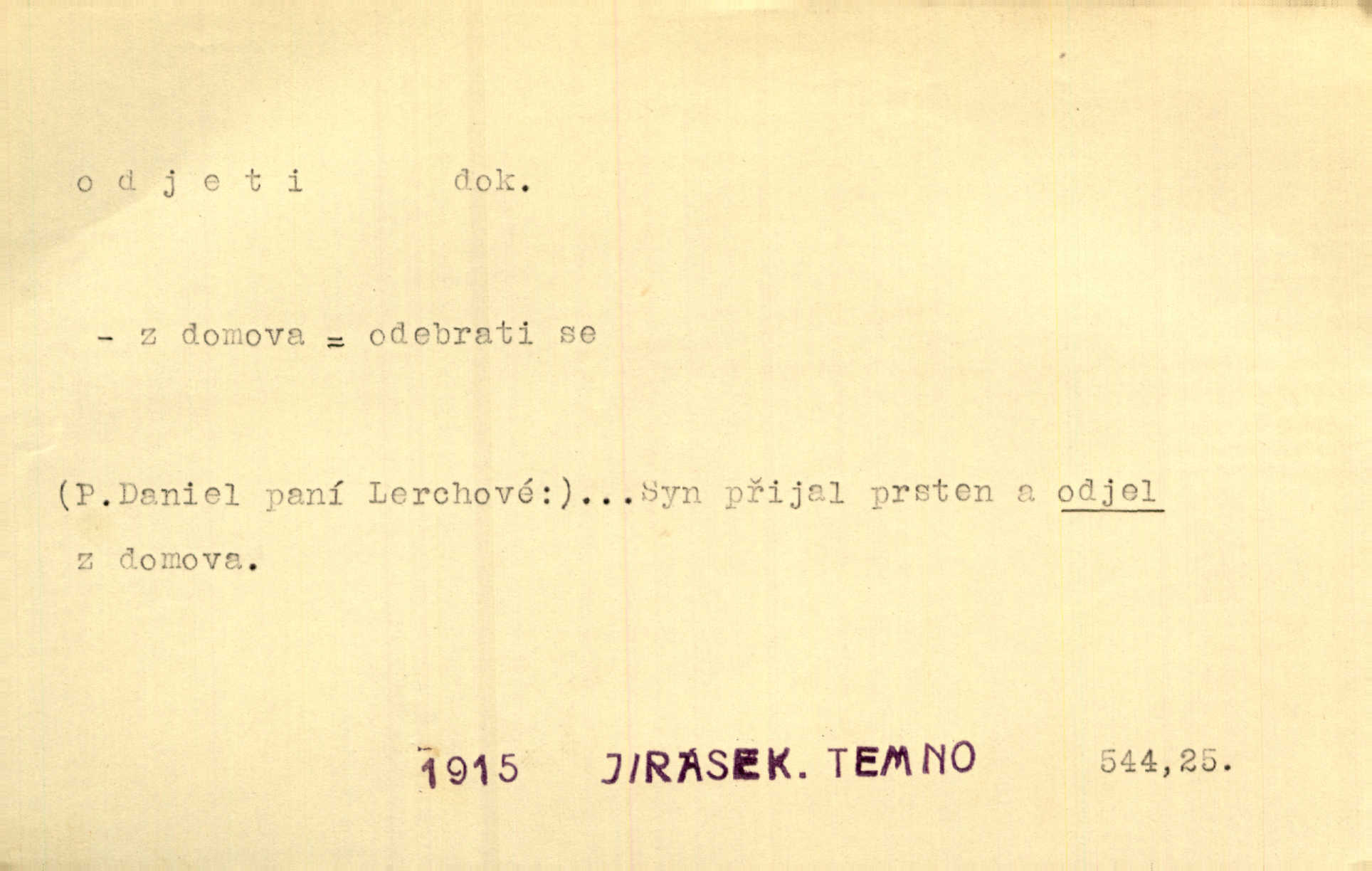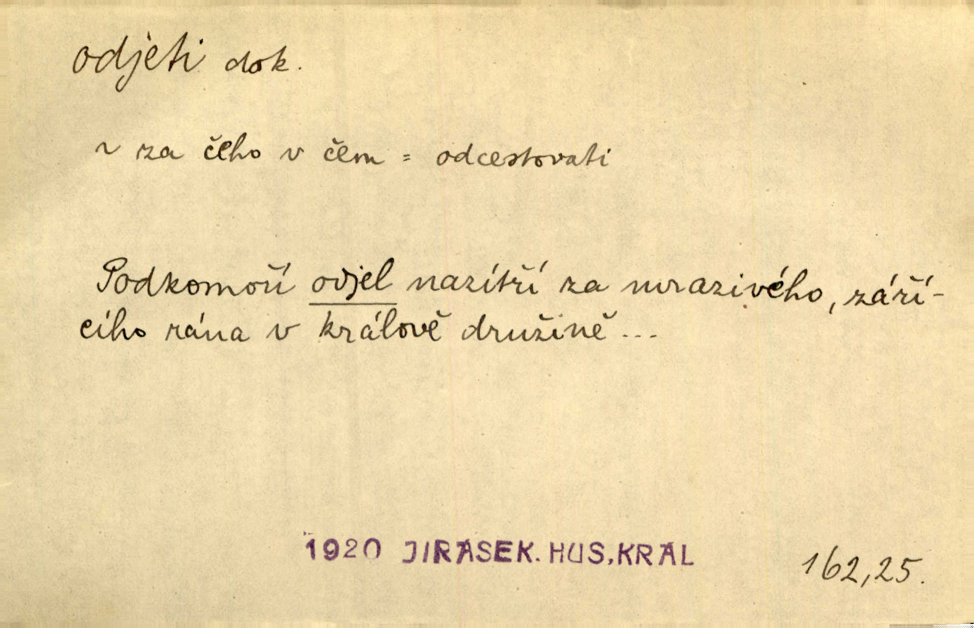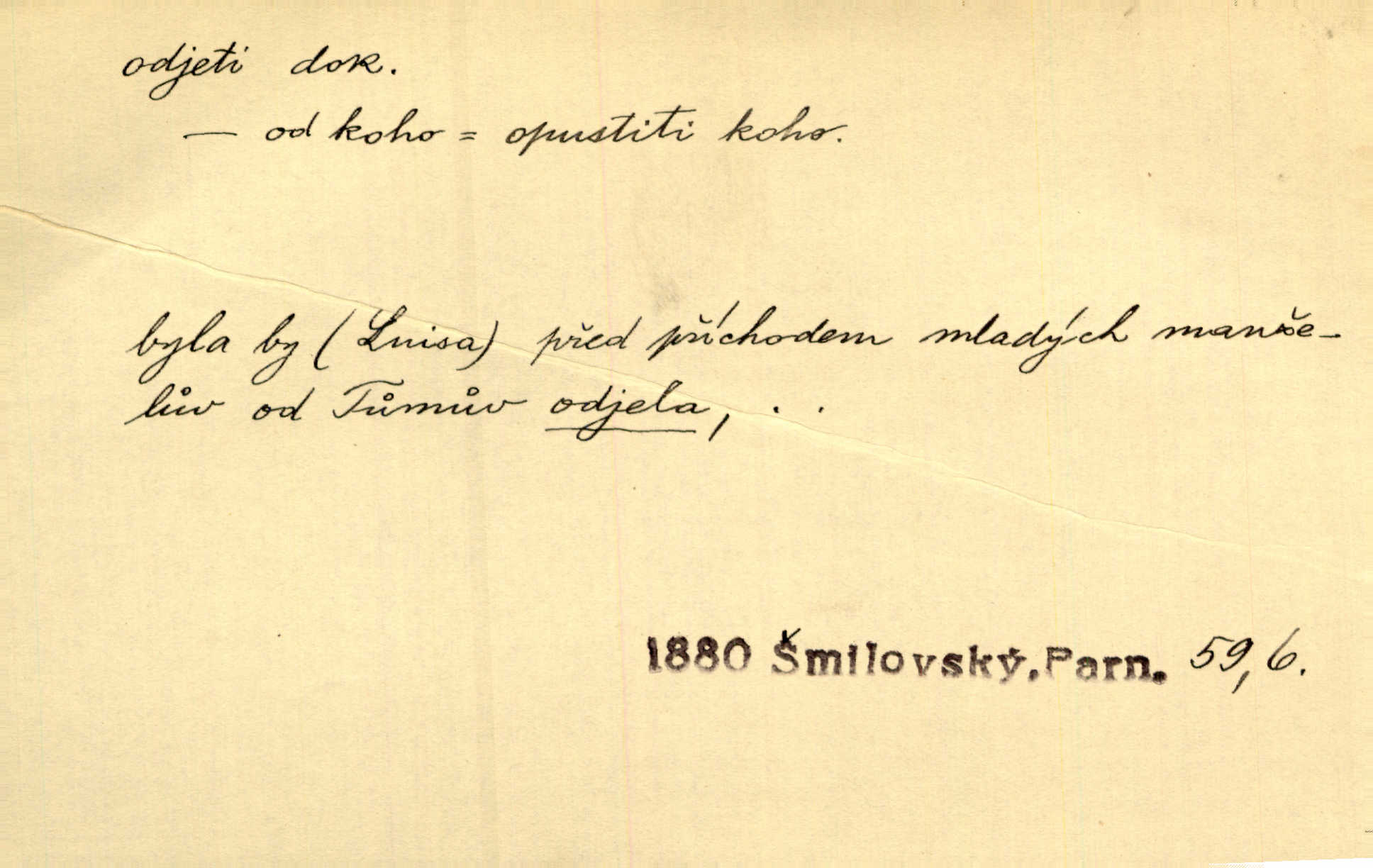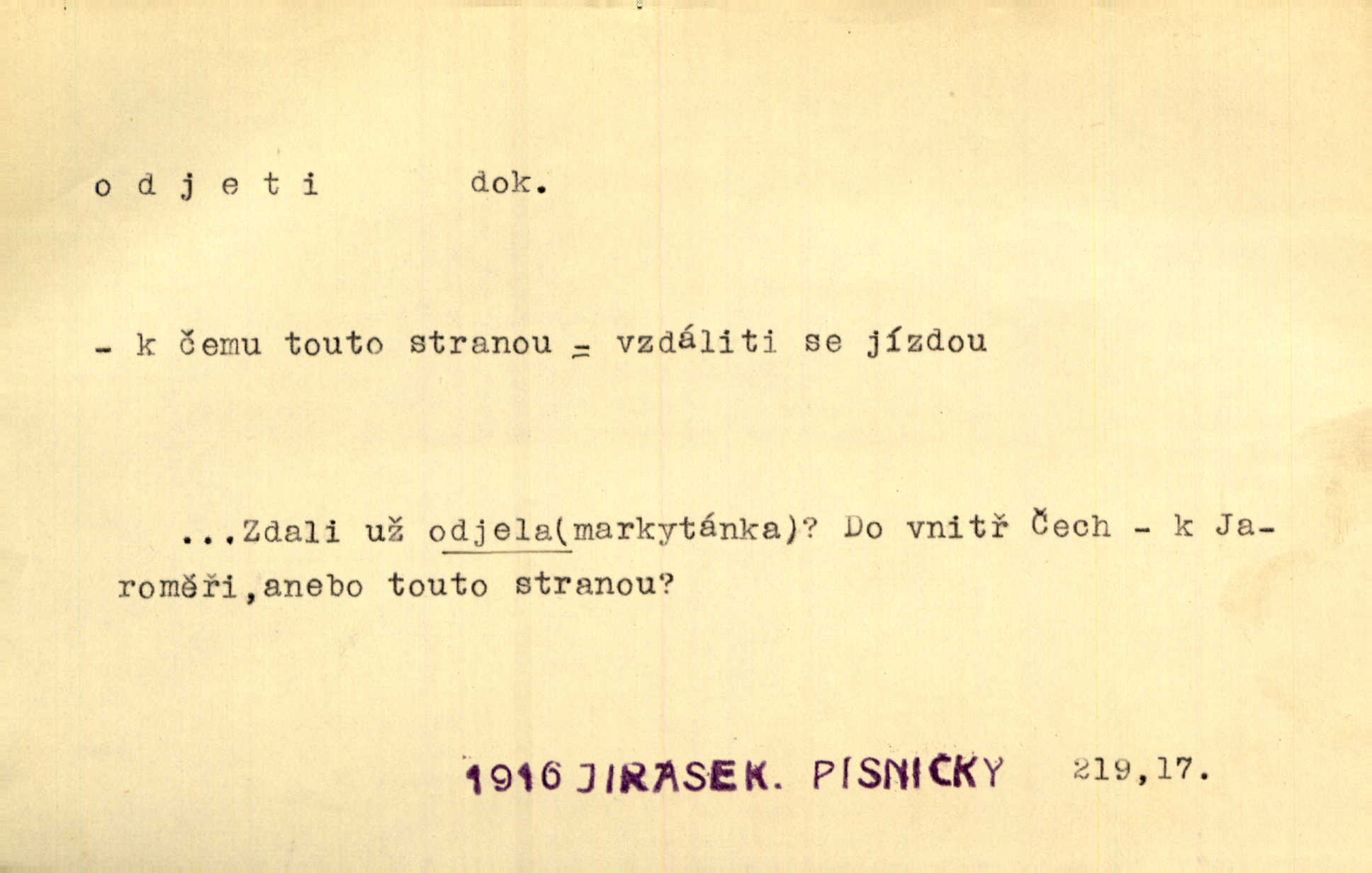 - odjeti (řidč. odejeti) dok. (o člověku n. jiném tvoru) vozmo n. jízdmo nějaké místo opustiti. Císař s dvorem odjeli z Prahy, císař v krytém voze. Jir. Odjel [vozka] za svou povinností. Šmil. Vskočil do fiakru a odjel. Ner. Prohlásila, že večerním vlakem odjede k mamince. Vach. Neříkaje nikomu kam a proč, odjel si sám do Libějic. Podl. Sardus, syn Heraklův, odjel do Lybie s loďstvem odplul. Vrch. Rozloučil se mladý manžel s drahou Dobrunkou a odejel do boje. Něm. [Kněžna] pokynula comtesse k odjetí, obě vsedly na koně. Něm. Odjede, odkud není návratu zemře. Šmil. D (o vozidle n. plavidle) opustiti nějaké místo. Kočí práskl do koně a povoz, seč sešlý kůň klusati mohl, odejel. Arb. S Blaženou promluvil spěšně několik slov, ani vozu nedal odejet. R. Svob.