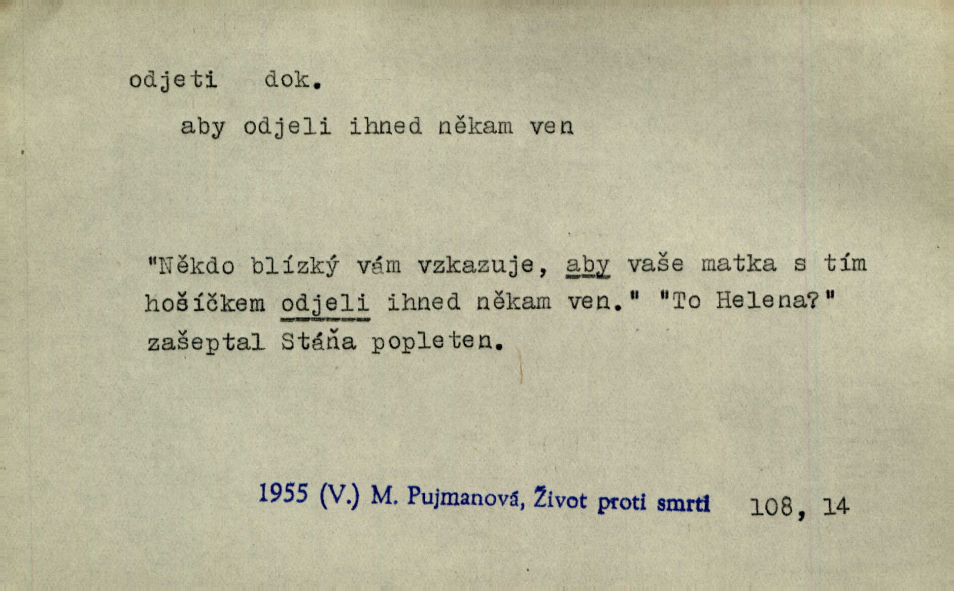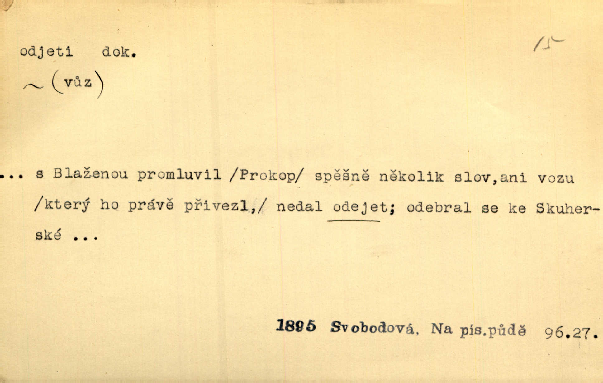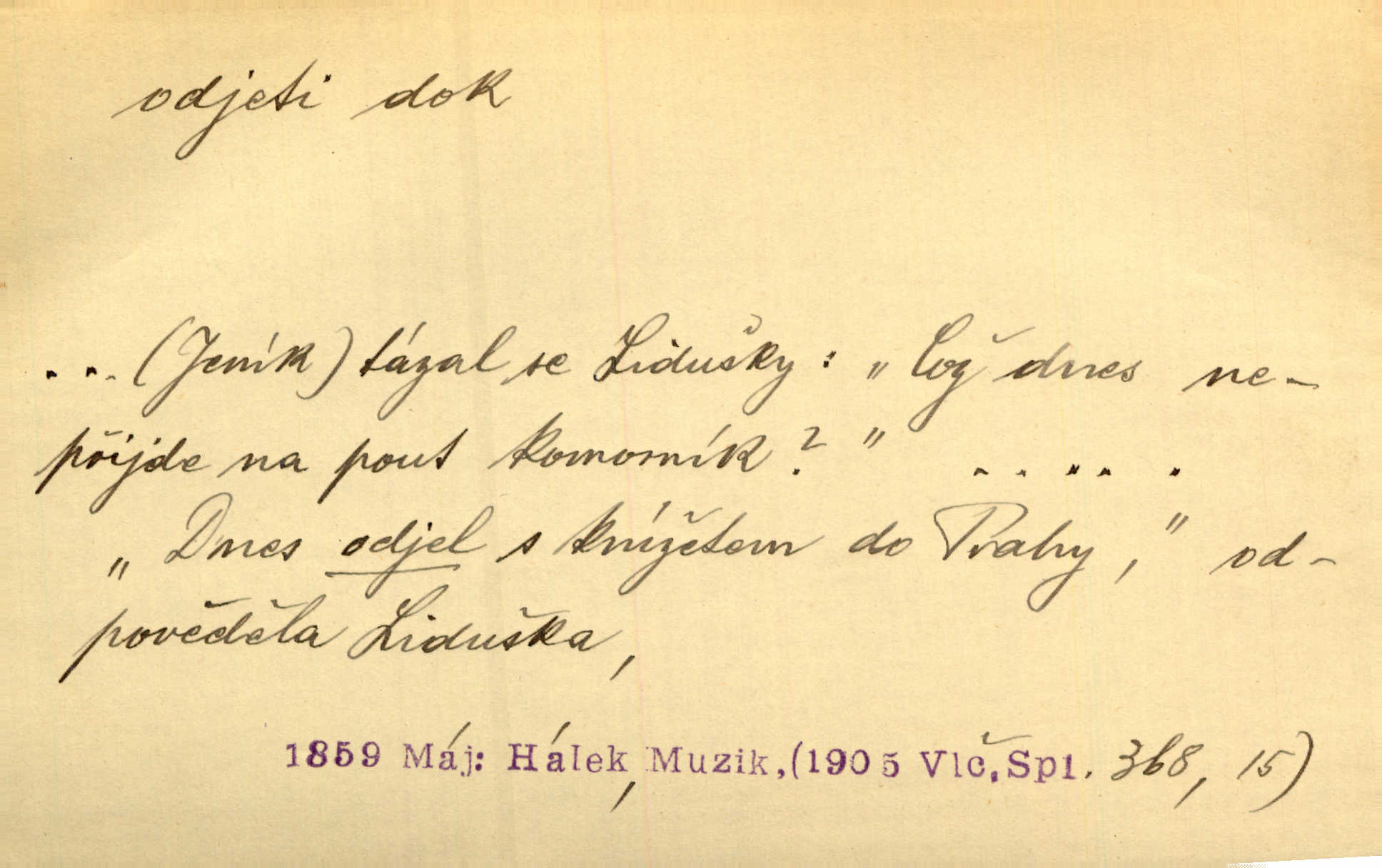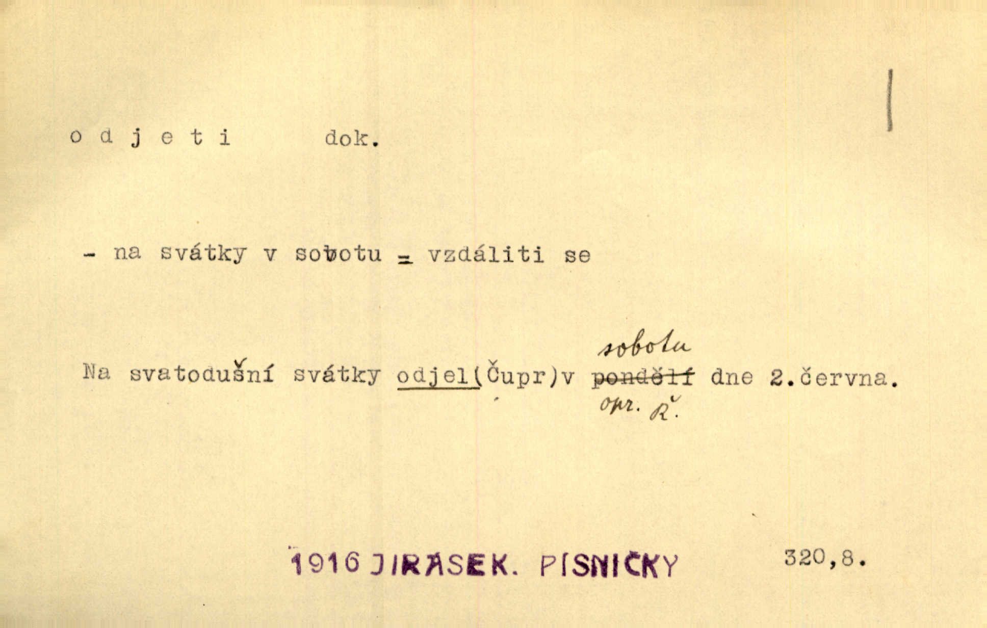 - odjeti (řidč. odejeti) dok. (o člověku n. jiném tvoru) vozmo n. jízdmo nějaké místo opustiti. Císař s dvorem odjeli z Prahy, císař v krytém voze. Jir. Odjel [vozka] za svou povinností. Šmil. Vskočil do fiakru a odjel. Ner. Prohlásila, že večerním vlakem odjede k mamince. Vach. Neříkaje nikomu kam a proč, odjel si sám do Libějic. Podl. Sardus, syn Heraklův, odjel do Lybie s loďstvem odplul. Vrch. Rozloučil se mladý manžel s drahou Dobrunkou a odejel do boje. Něm. [Kněžna] pokynula comtesse k odjetí, obě vsedly na koně. Něm. Odjede, odkud není návratu zemře. Šmil. D (o vozidle n. plavidle) opustiti nějaké místo. Kočí práskl do koně a povoz, seč sešlý kůň klusati mohl, odejel. Arb. S Blaženou promluvil spěšně několik slov, ani vozu nedal odejet. R. Svob.
