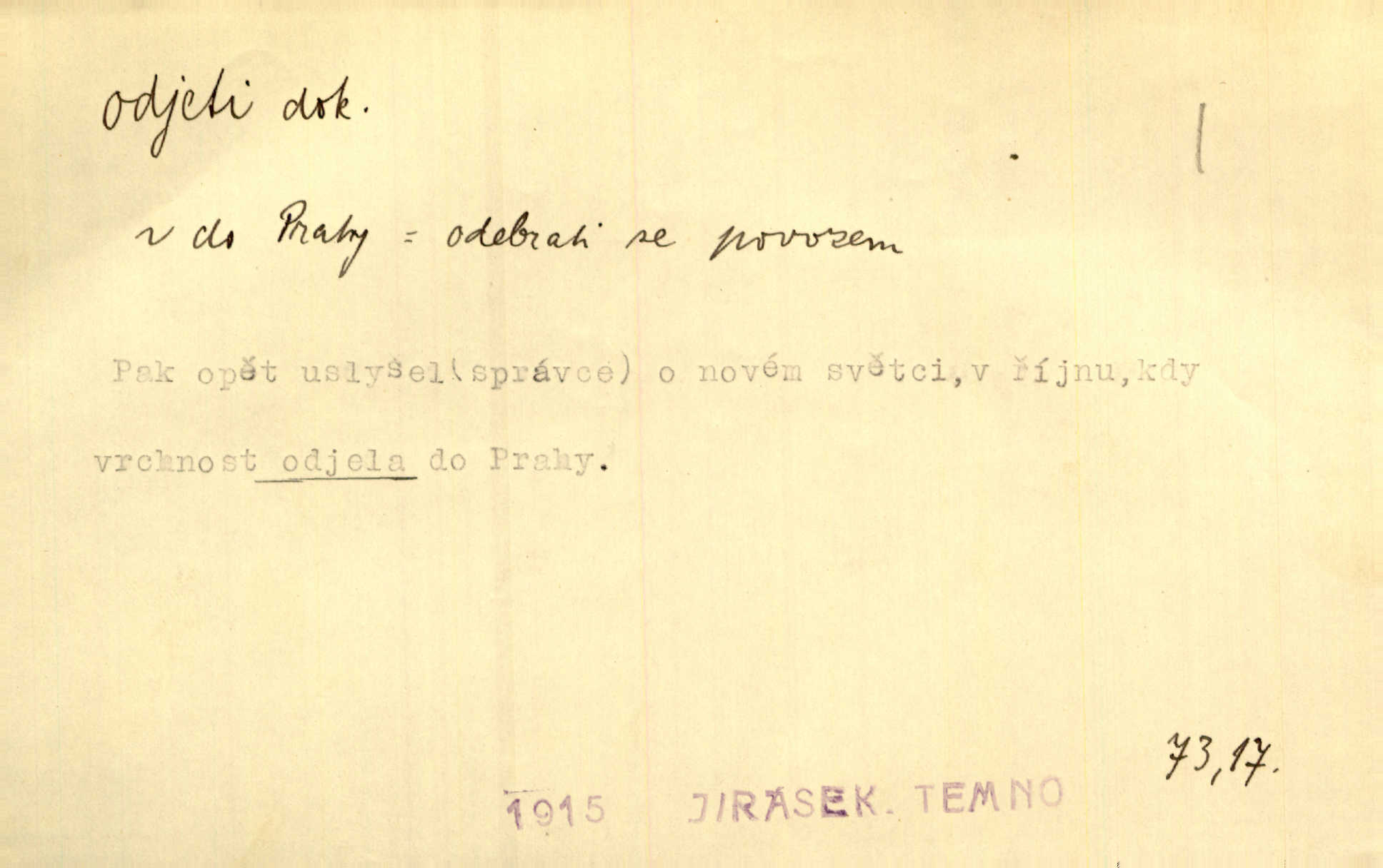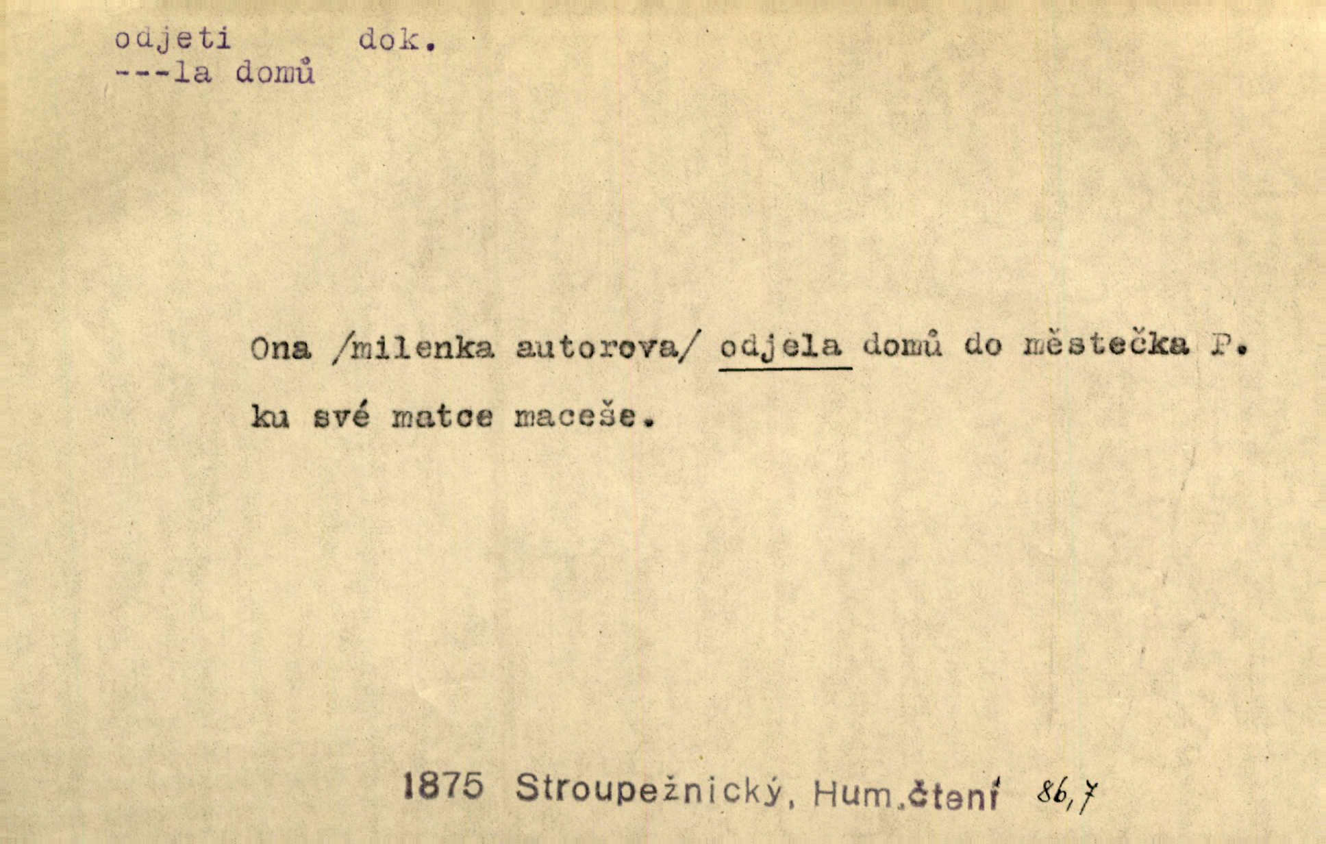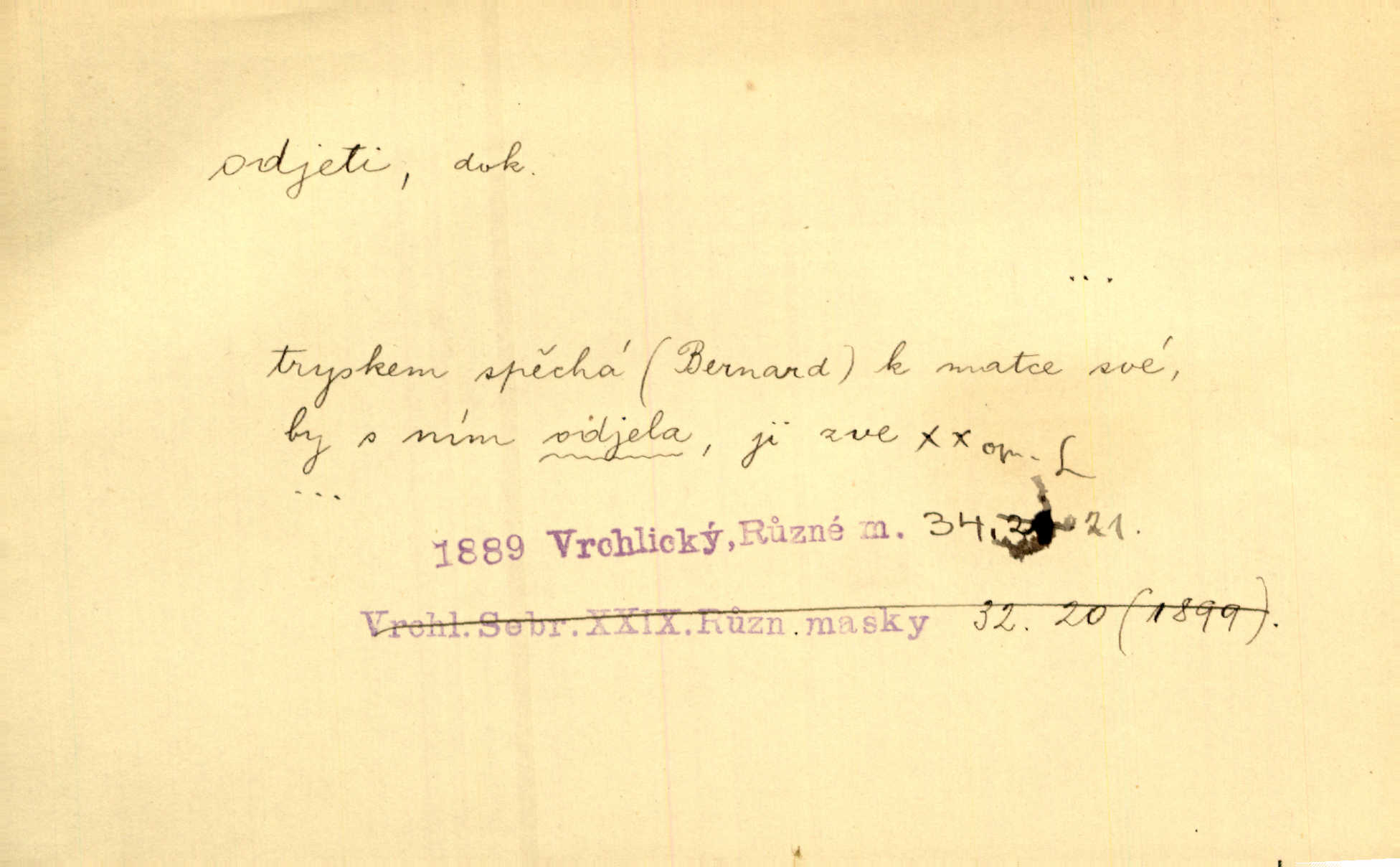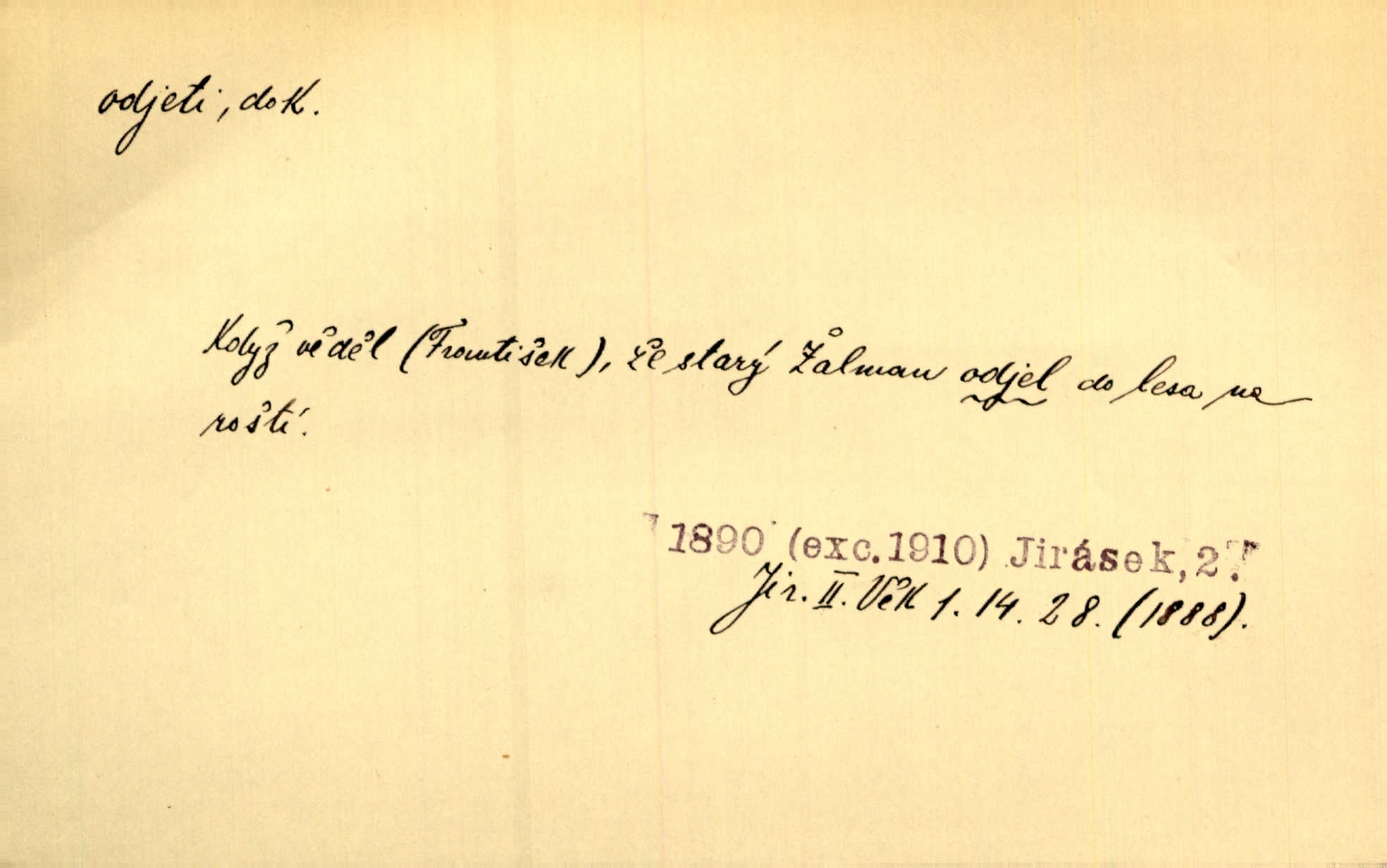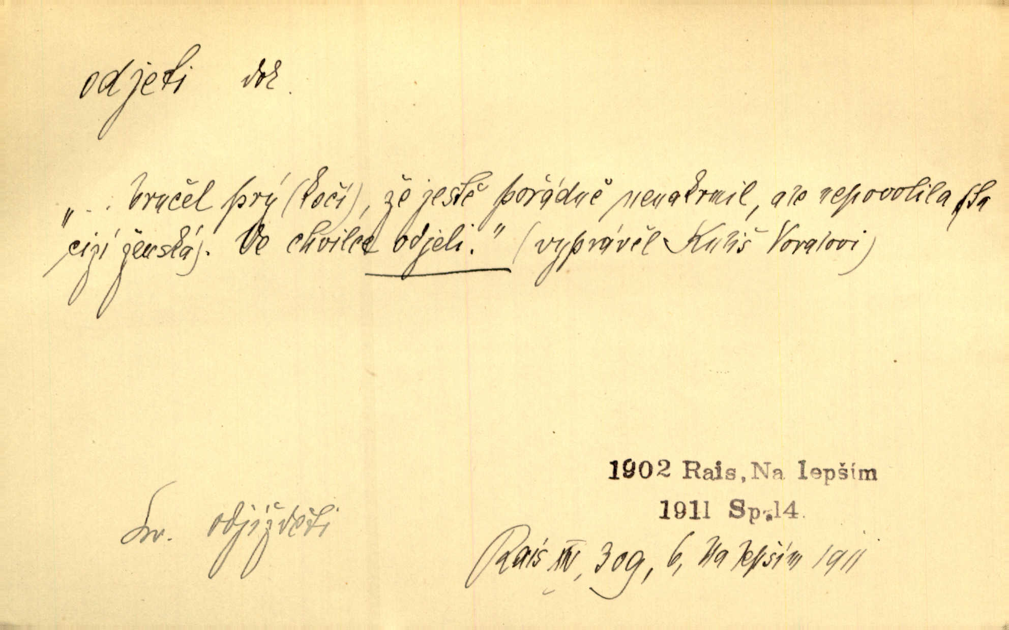 - odjeti (řidč. odejeti) dok. (o člověku n. jiném tvoru) vozmo n. jízdmo nějaké místo opustiti. Císař s dvorem odjeli z Prahy, císař v krytém voze. Jir. Odjel [vozka] za svou povinností. Šmil. Vskočil do fiakru a odjel. Ner. Prohlásila, že večerním vlakem odjede k mamince. Vach. Neříkaje nikomu kam a proč, odjel si sám do Libějic. Podl. Sardus, syn Heraklův, odjel do Lybie s loďstvem odplul. Vrch. Rozloučil se mladý manžel s drahou Dobrunkou a odejel do boje. Něm. [Kněžna] pokynula comtesse k odjetí, obě vsedly na koně. Něm. Odjede, odkud není návratu zemře. Šmil. D (o vozidle n. plavidle) opustiti nějaké místo. Kočí práskl do koně a povoz, seč sešlý kůň klusati mohl, odejel. Arb. S Blaženou promluvil spěšně několik slov, ani vozu nedal odejet. R. Svob.