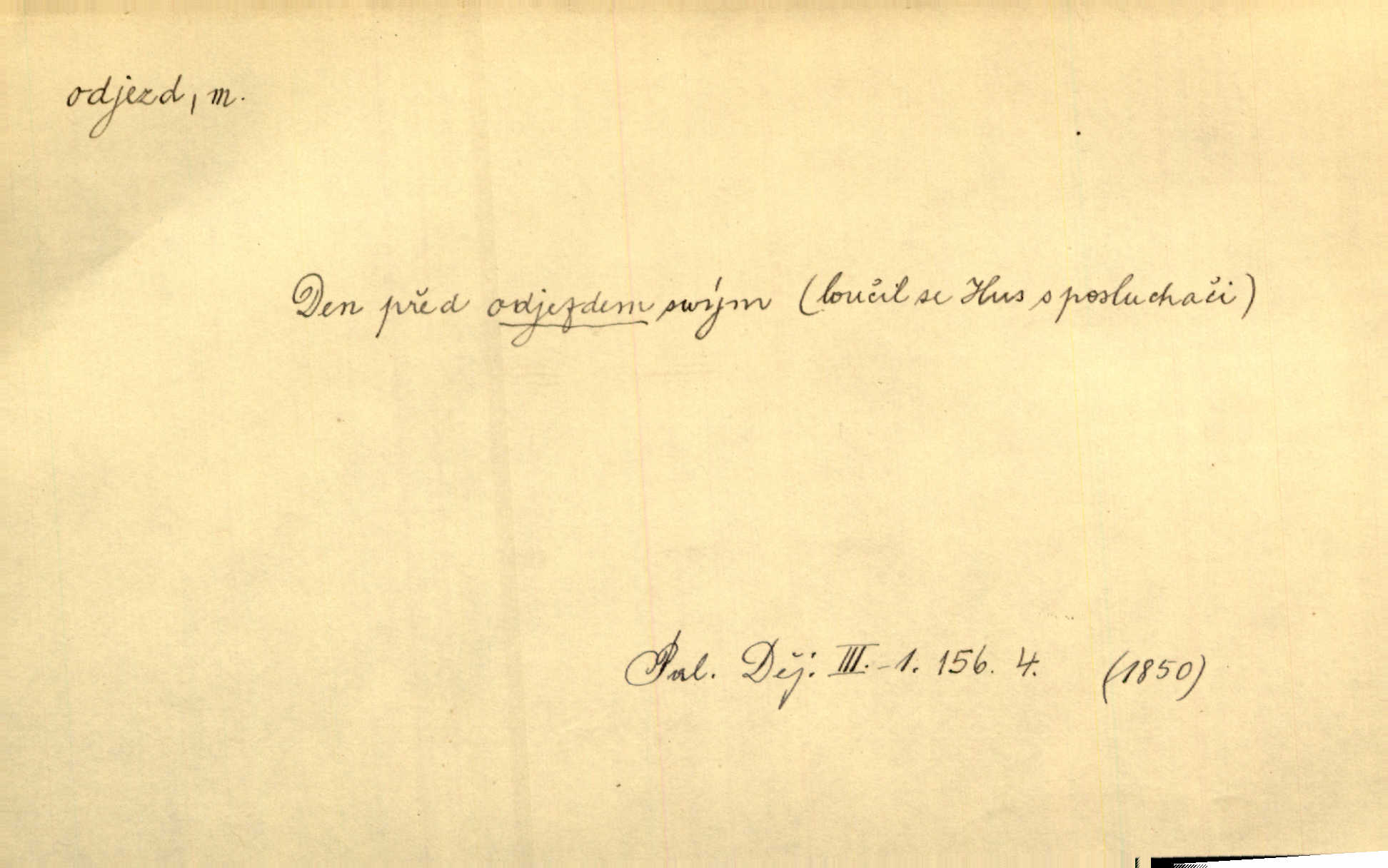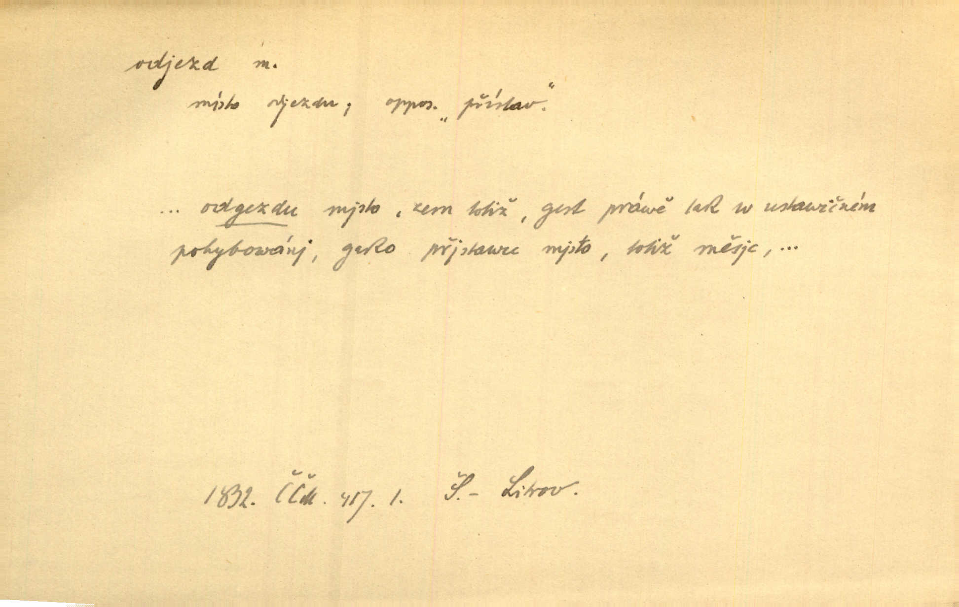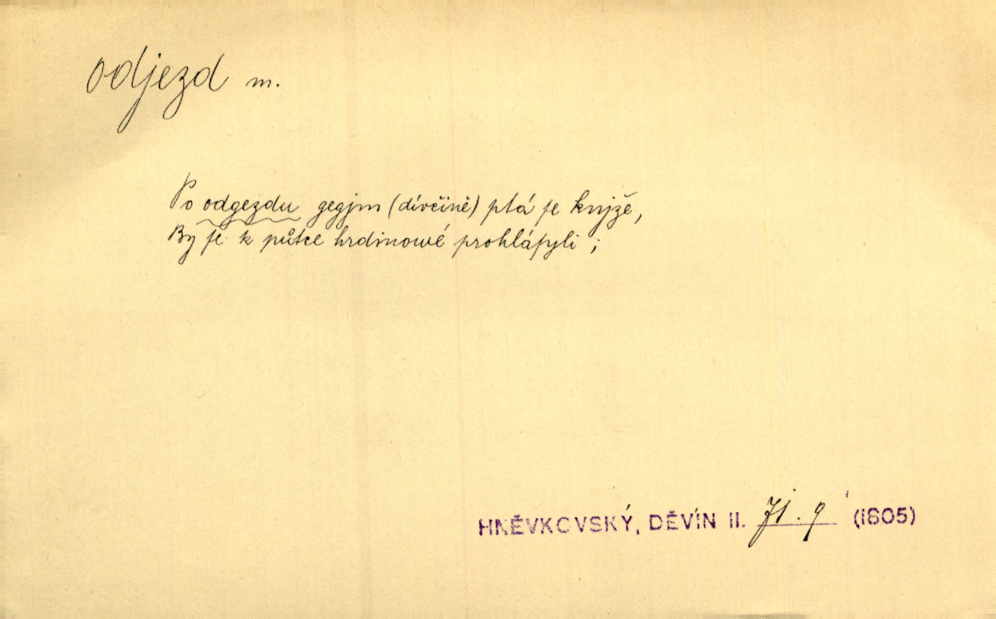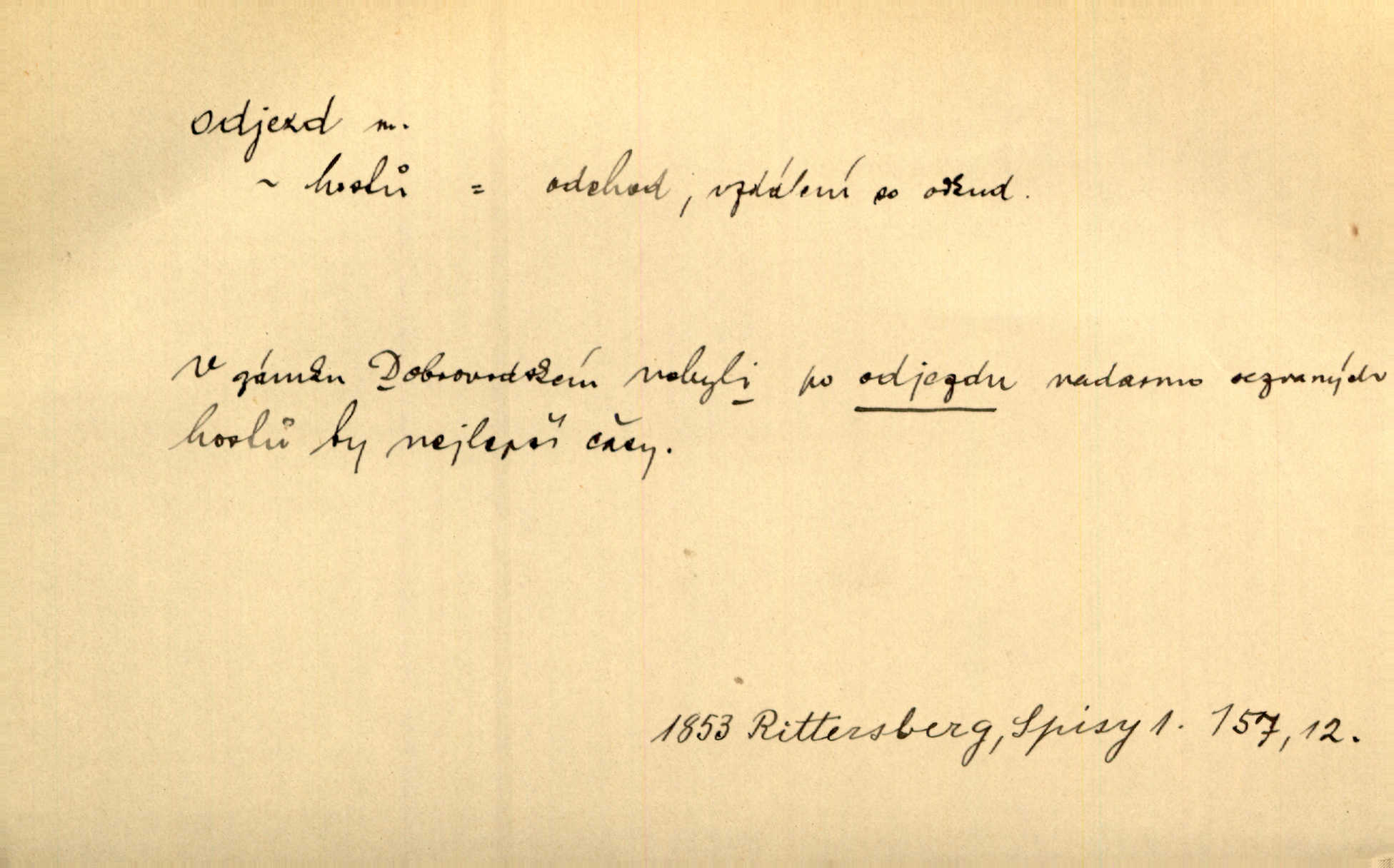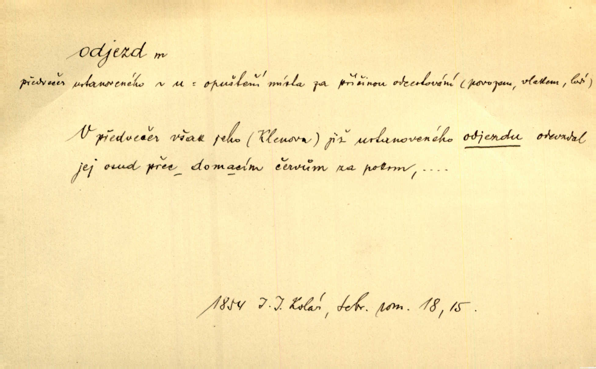 - odjezd, -u m. opuštění místa vozmo, jízdmo n. plavidlem, odjetí. Na vozech seděli již vozkové k odjezdu připravení. Rais. Po odjezdu kočáru hovořilo se hlučně u Taliána. Maj. Loď, která je měla převézti, byla pohotově a čekala na znamení k odjezdu. Pfleg. Odjezd vlaku. Us. Najal jsem vraha, který milence vašeho stíhá, a doufám, že vám v brzku zprávu o jeho odjezdu do nebeského království sdělím o smrti. Zey.
