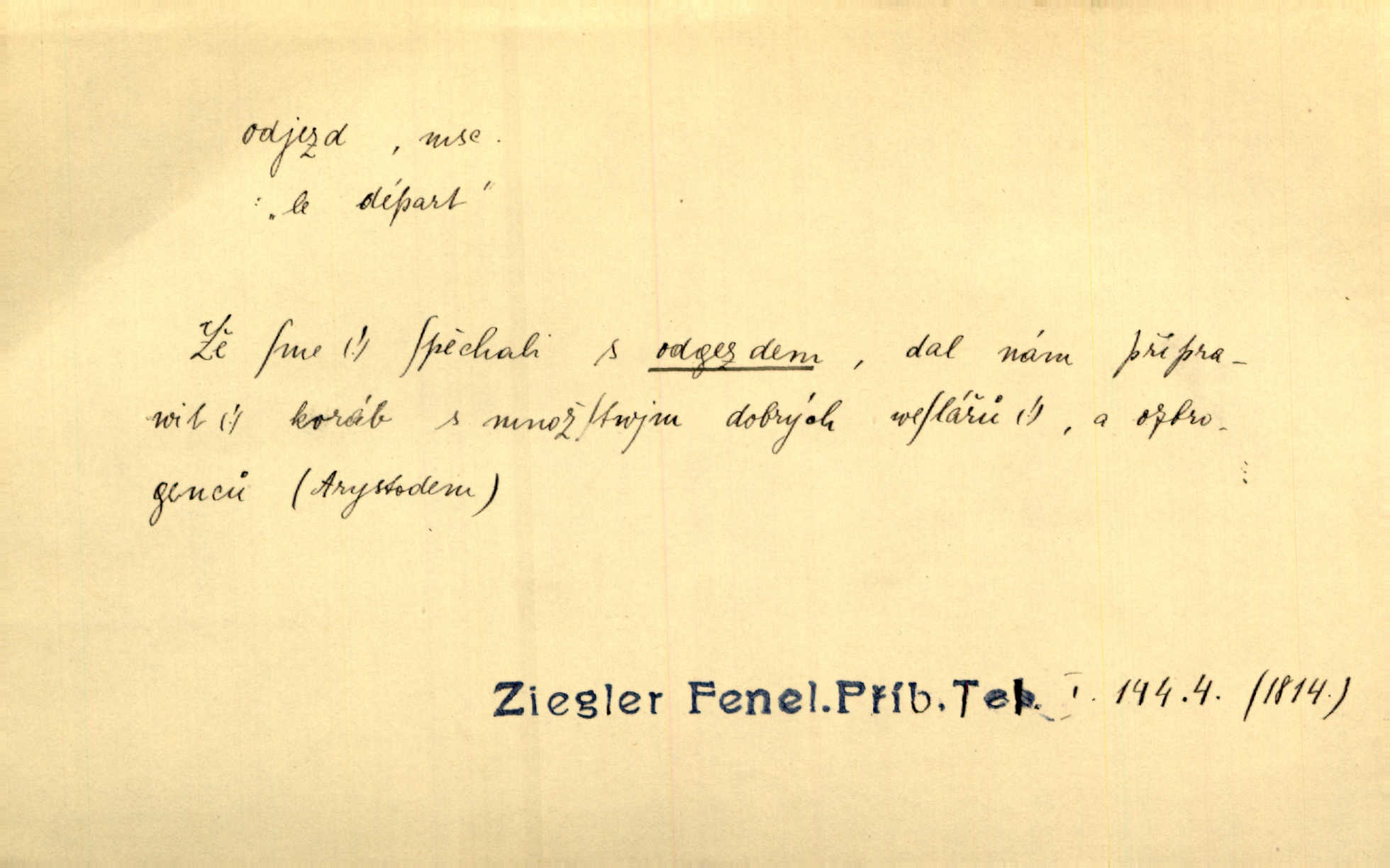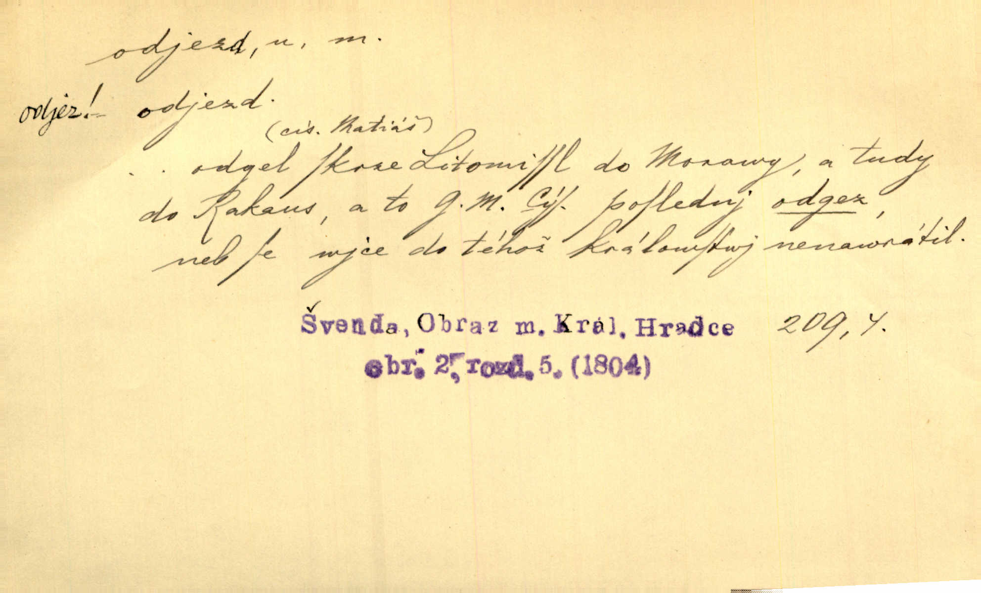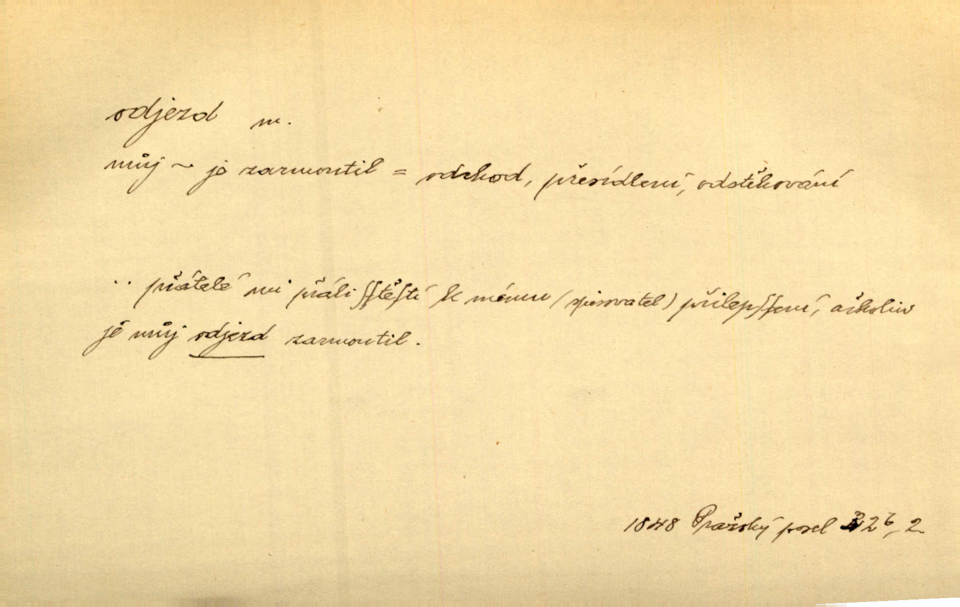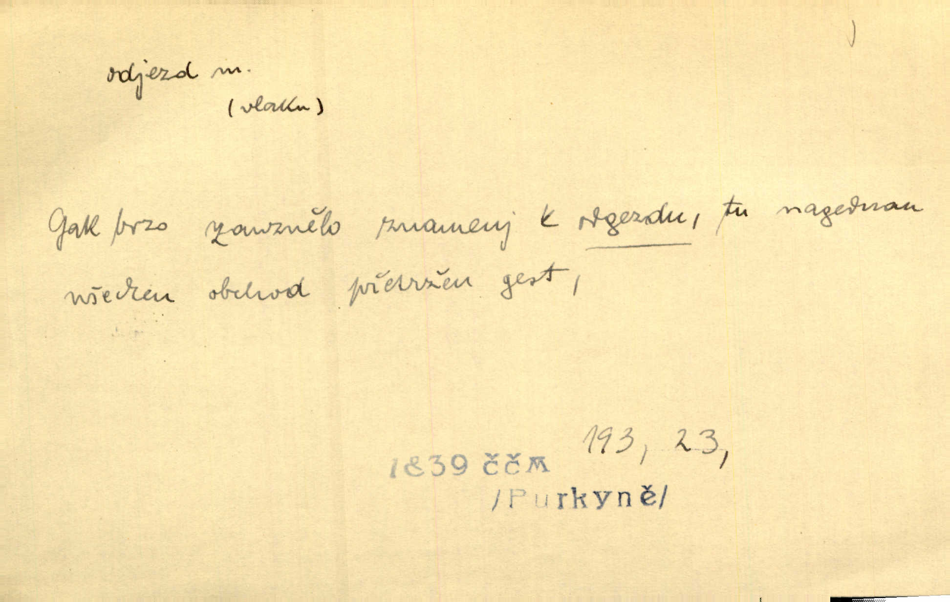 - odjezd, -u m. opuštění místa vozmo, jízdmo n. plavidlem, odjetí. Na vozech seděli již vozkové k odjezdu připravení. Rais. Po odjezdu kočáru hovořilo se hlučně u Taliána. Maj. Loď, která je měla převézti, byla pohotově a čekala na znamení k odjezdu. Pfleg. Odjezd vlaku. Us. Najal jsem vraha, který milence vašeho stíhá, a doufám, že vám v brzku zprávu o jeho odjezdu do nebeského království sdělím o smrti. Zey.