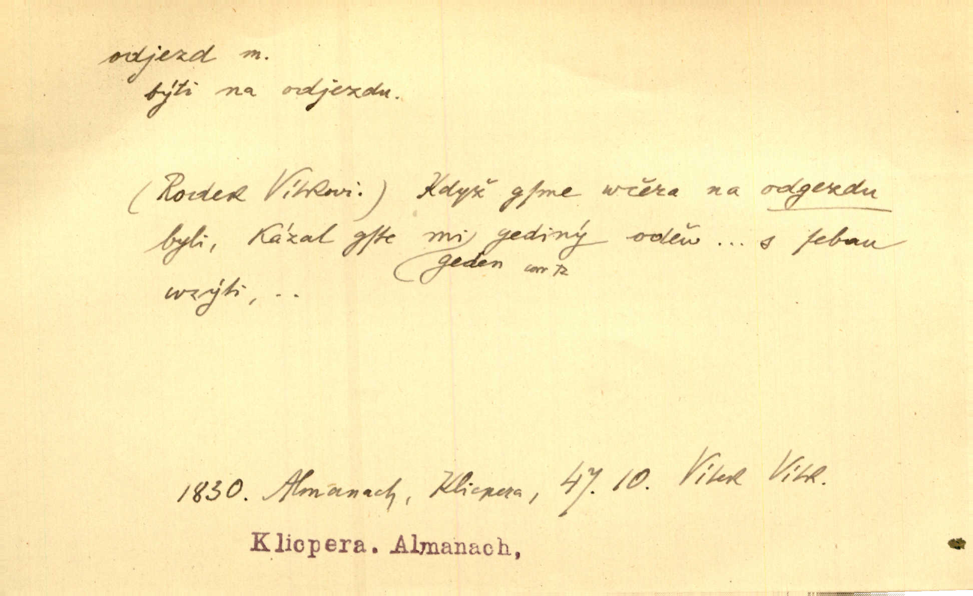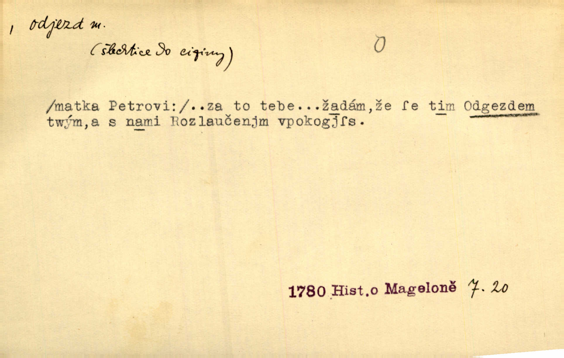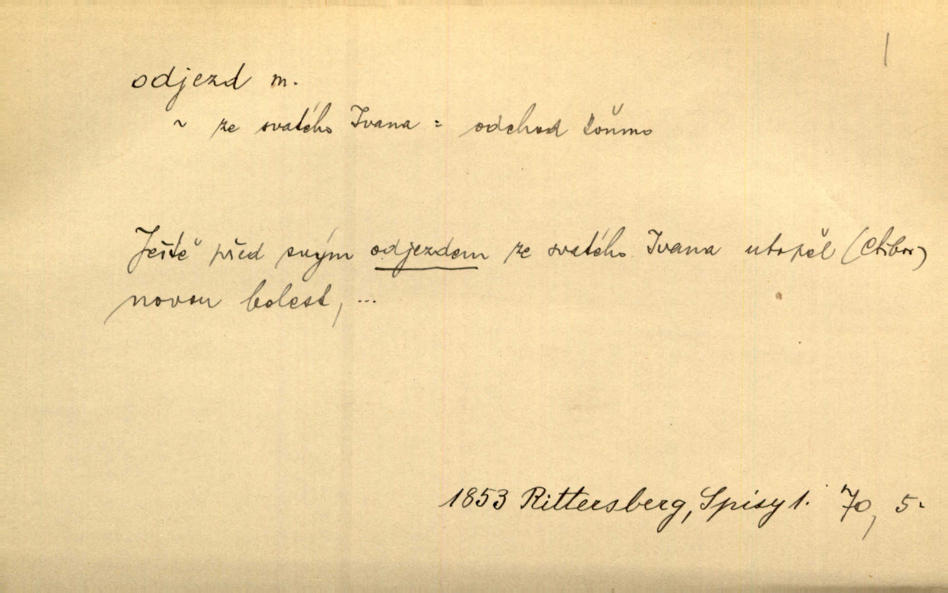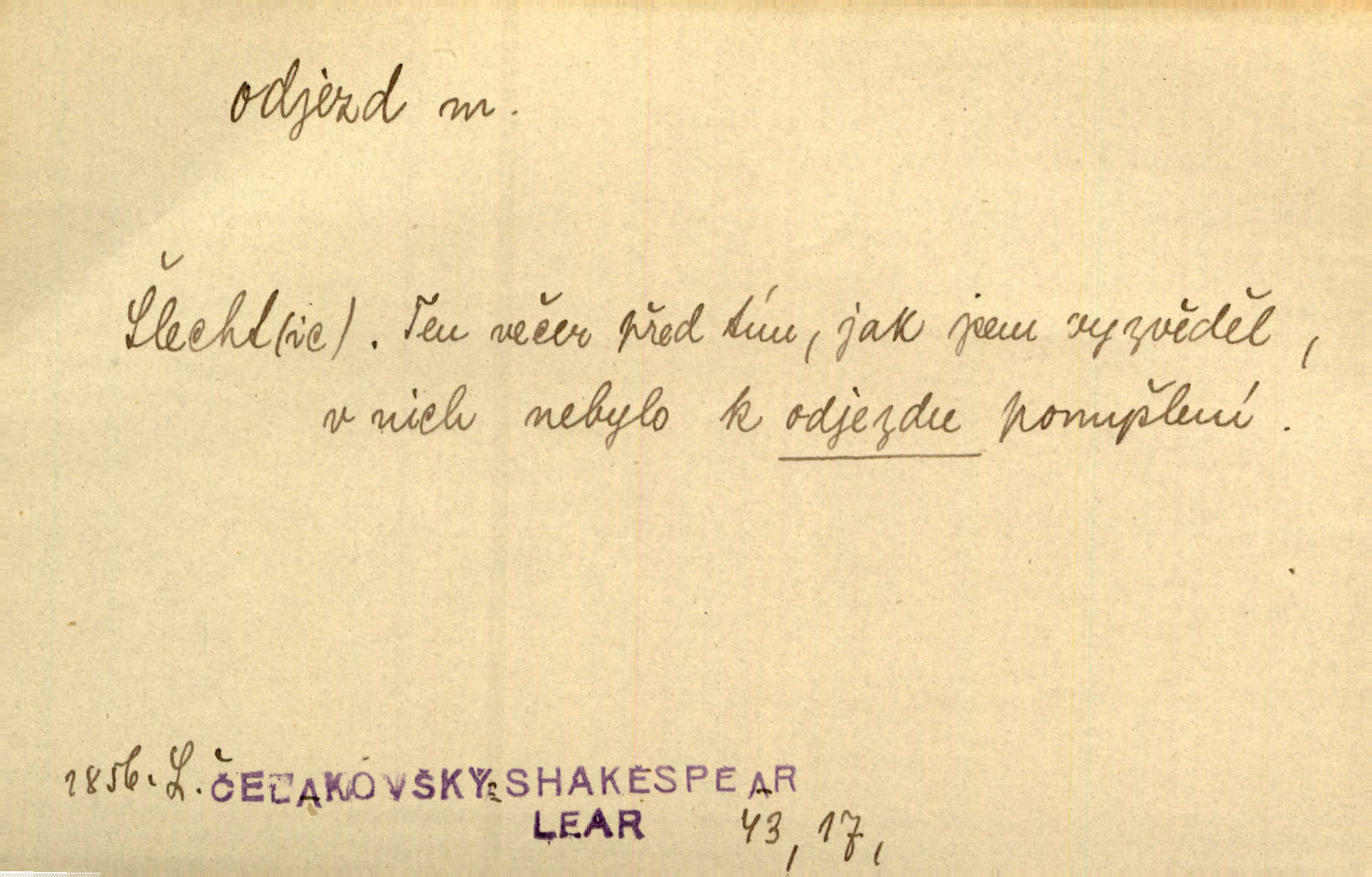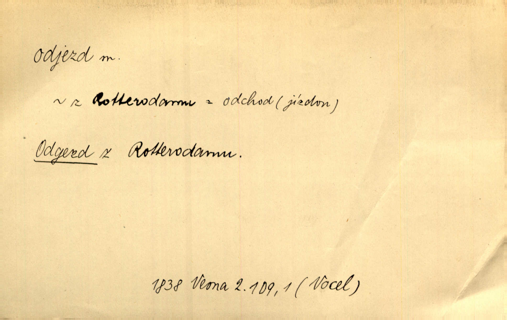 - odjezd, -u m. opuštění místa vozmo, jízdmo n. plavidlem, odjetí. Na vozech seděli již vozkové k odjezdu připravení. Rais. Po odjezdu kočáru hovořilo se hlučně u Taliána. Maj. Loď, která je měla převézti, byla pohotově a čekala na znamení k odjezdu. Pfleg. Odjezd vlaku. Us. Najal jsem vraha, který milence vašeho stíhá, a doufám, že vám v brzku zprávu o jeho odjezdu do nebeského království sdělím o smrti. Zey.
