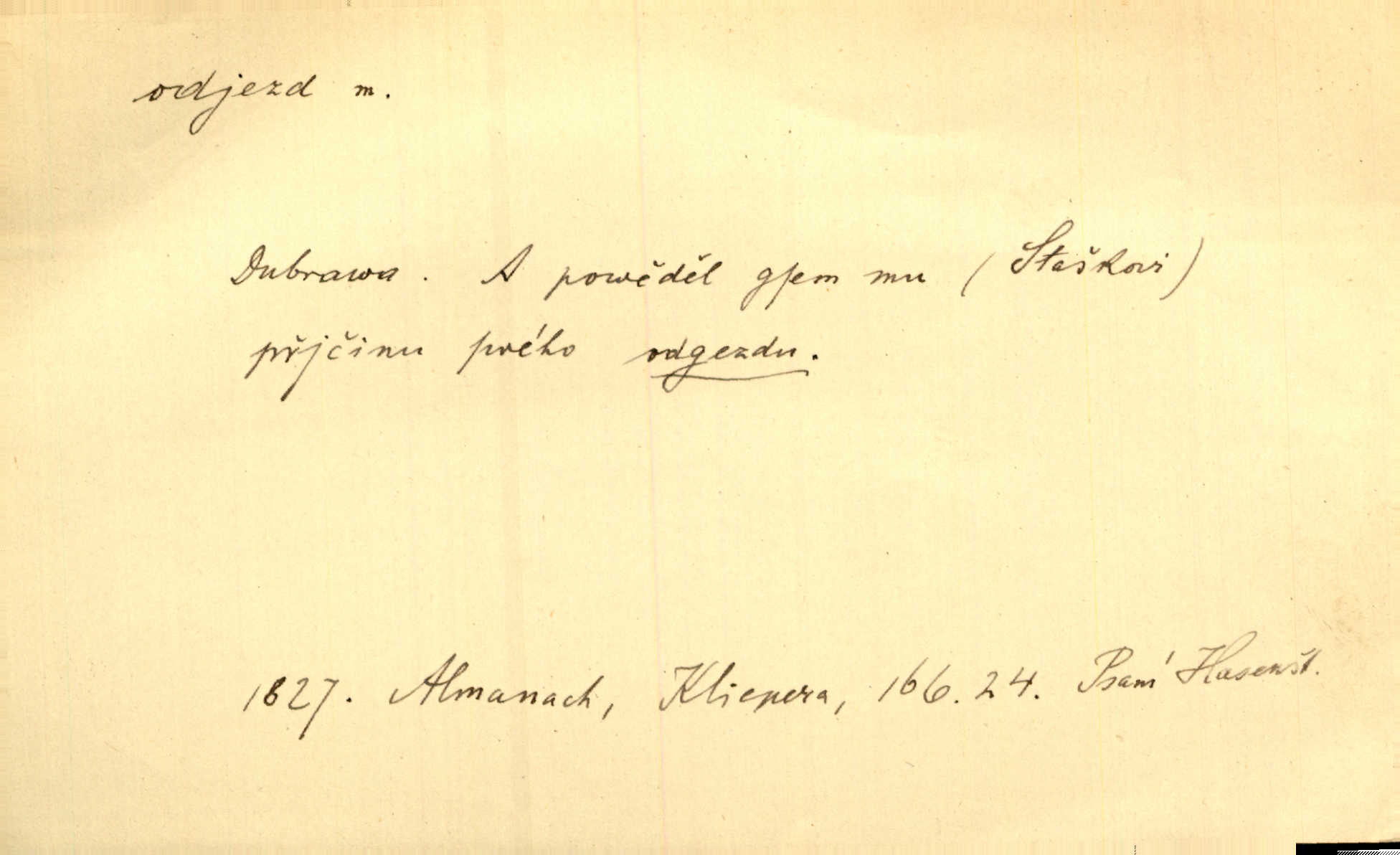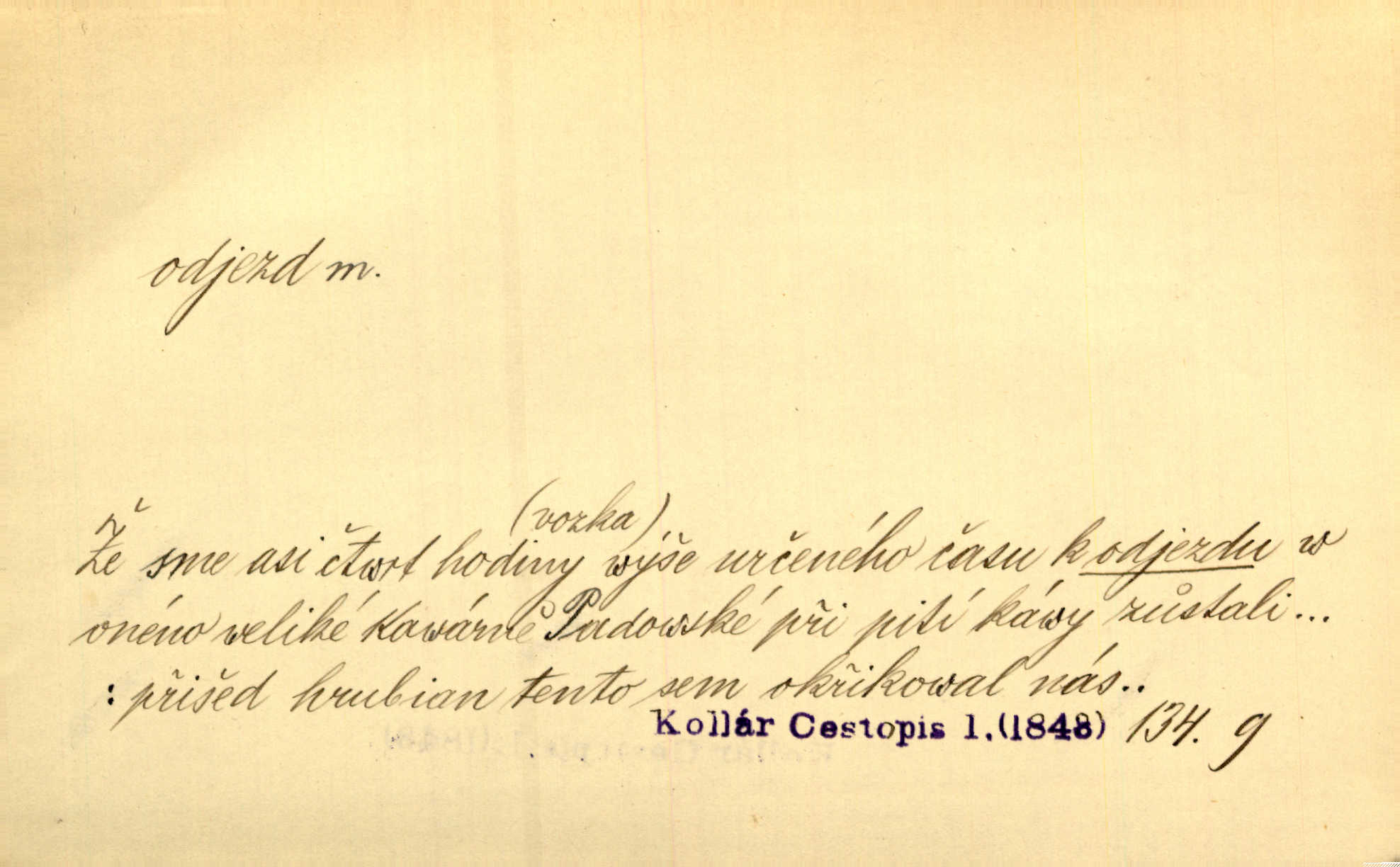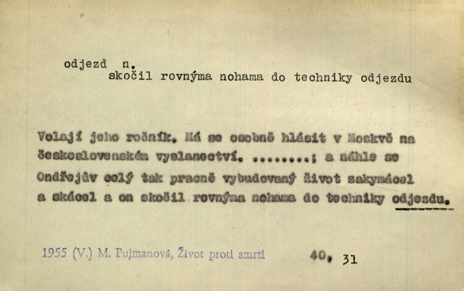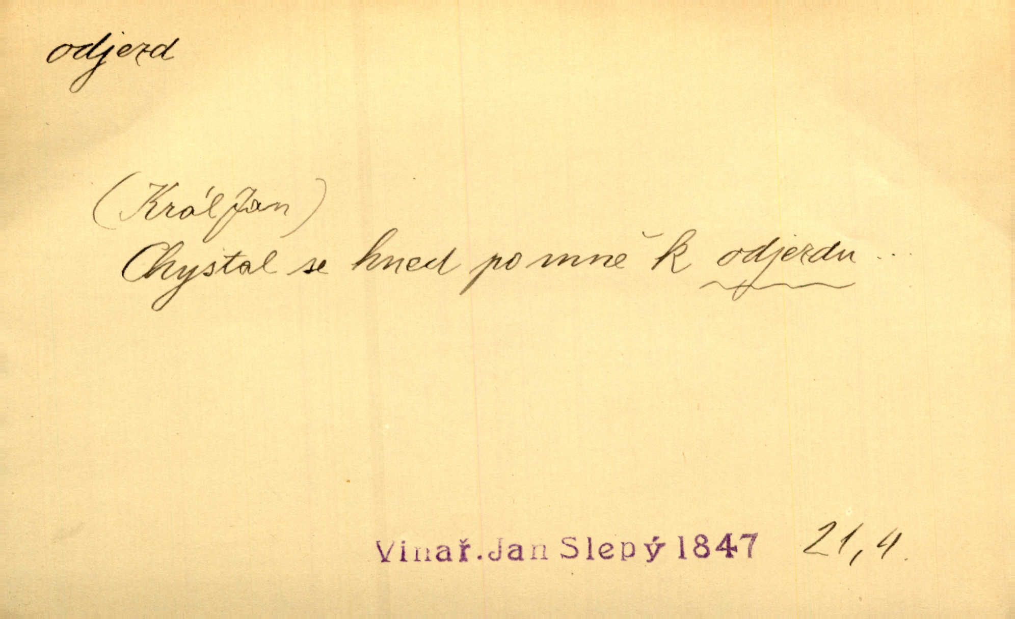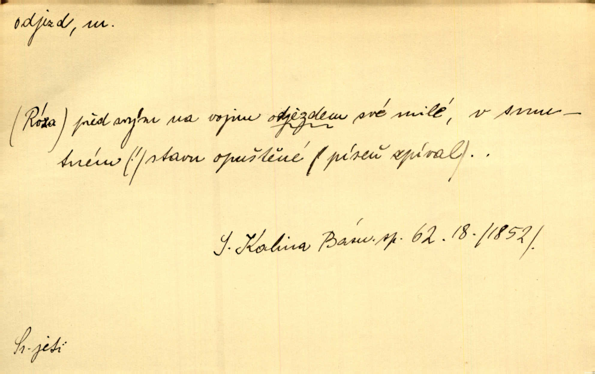 - odjezd, -u m. opuštění místa vozmo, jízdmo n. plavidlem, odjetí. Na vozech seděli již vozkové k odjezdu připravení. Rais. Po odjezdu kočáru hovořilo se hlučně u Taliána. Maj. Loď, která je měla převézti, byla pohotově a čekala na znamení k odjezdu. Pfleg. Odjezd vlaku. Us. Najal jsem vraha, který milence vašeho stíhá, a doufám, že vám v brzku zprávu o jeho odjezdu do nebeského království sdělím o smrti. Zey.