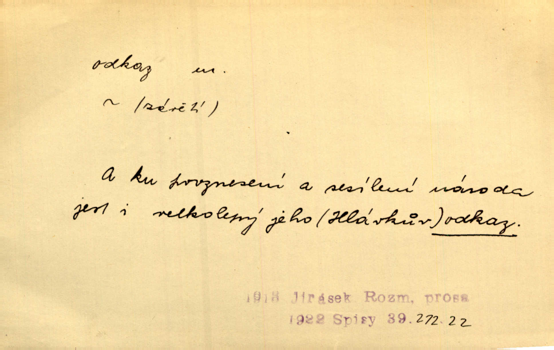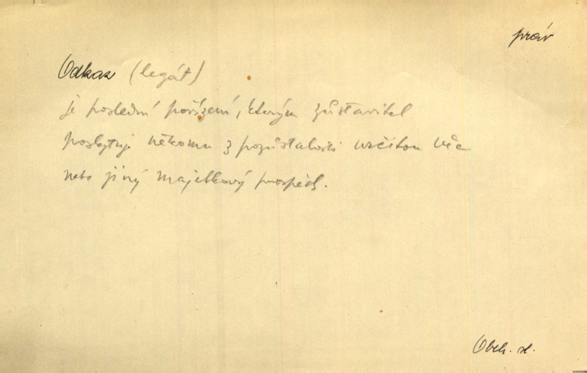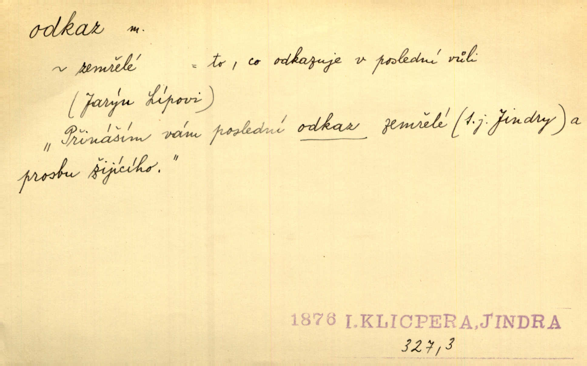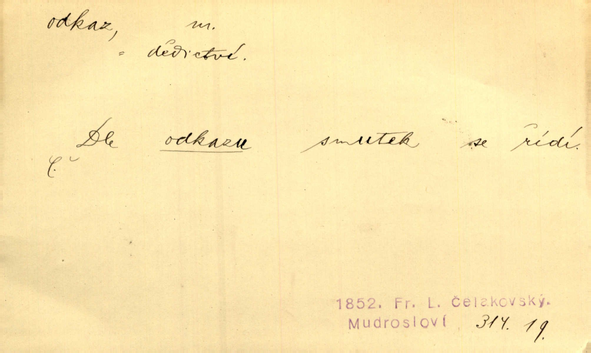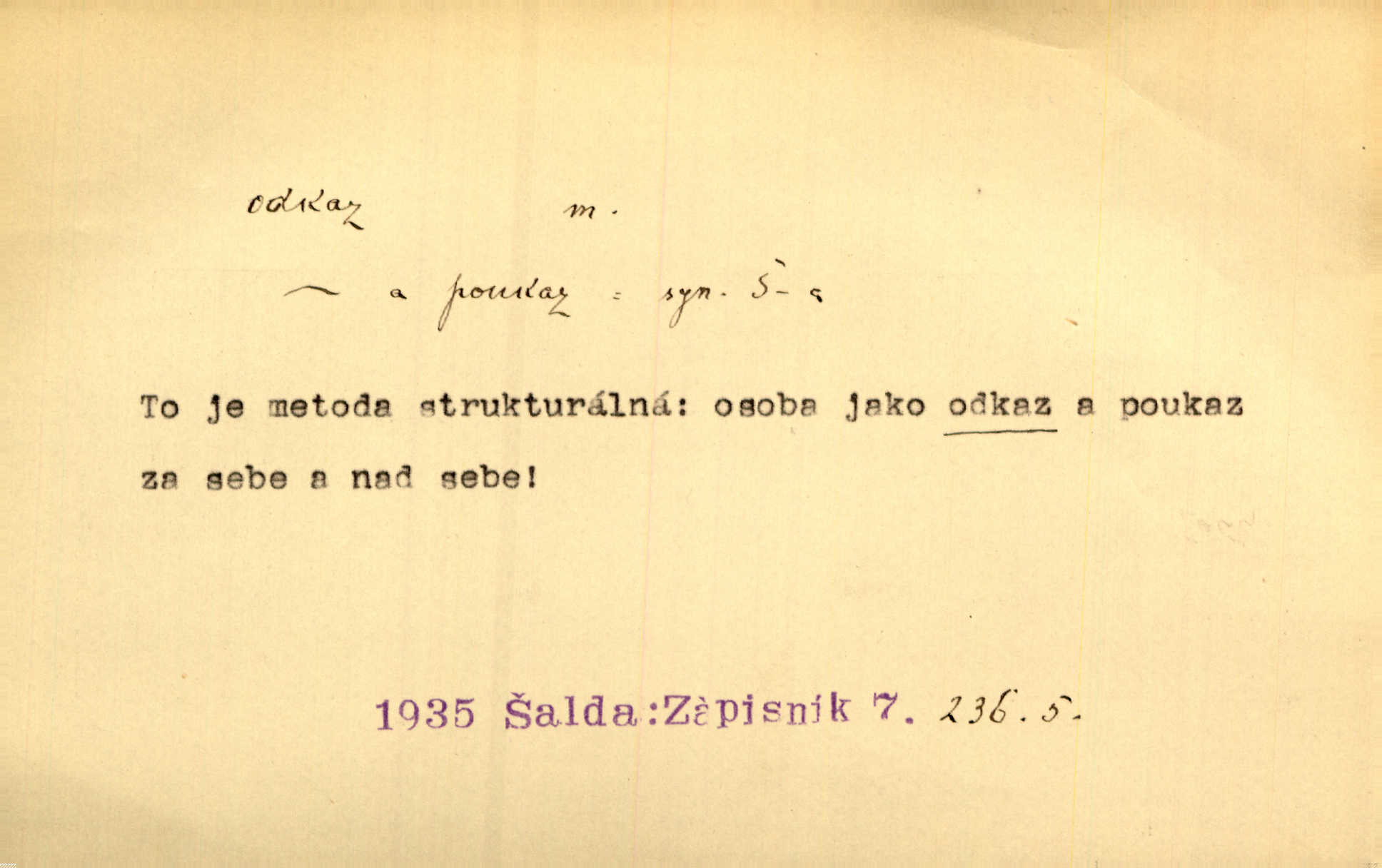 - odkaz, -u m. odkázání nějaké věci n. peněžité částky poslední vůlí; věc takto odkázaná, věnování, legát. [Kšaft] neobsahoval žádných odkazův ni služebnictvu, ni ústavům veřejným. Svět. Do pokladnice místní školní rady plynou dary a odkazy (legáty) k věcným potřebám školním učiněné. Služ. min. škol. Ku povznesení národa jest i velkolepý jeho [Hlávkův] odkaz. Jir. Literární cena z odkazu Jana Novotného. Herrm. Dědictví, jež Černohorci obdrželi od junáckých dědů v odkaz: handžár a gusle. Hol. Nám [lidem] v odkaz dala [Hesperis] sladkou lyru svoji. Vrch. Práv. nařízení (zprav. v posledním pořízení), kterým zůstavitel poskytuje někomu z pozůstalosti nějakou věc n. jiný majetkový prospěch, legát. D něco na způsob odkazu přecházejícího na potomstvo n. svěřeného, uloženého k vyplnění. Rodná mluvo, ty drahý skvoste, jediný z velkého odkazu dědů. Slád. Poetický odkaz Nerudův řadíme k svým velkým básnickým pokladům zanechané životní dílo. Vrch. Dělat podle odkazu Havlíčkova politiku rozumnou a poctivou. Mas. Lotinčin svatý odkaz bylo mi dopřáno doslovně splniti poslední přání. Podl. D Arch. závěť, poslední vůle. Já na tě budu v posledním odkazu pamatovat. Štěp. Umře bez odkazu. A. Mar. D poukaz, upozornění. [Matka] nechala ho přes hodinu za dveřmi s odkazem, aby si šel služby hledat. Herb. Císař motivuje svou žádost odkazem na neochotu Španělů přispívati na útraty válečné. Pek. Jednoduchými znaménky jsou odkazy [v rejstříku] s ušetřením místa. Kraus. Odkaz [v legendě o Jidáši] na zavraždění posledního Přemyslovce narážka. J. Vlč.