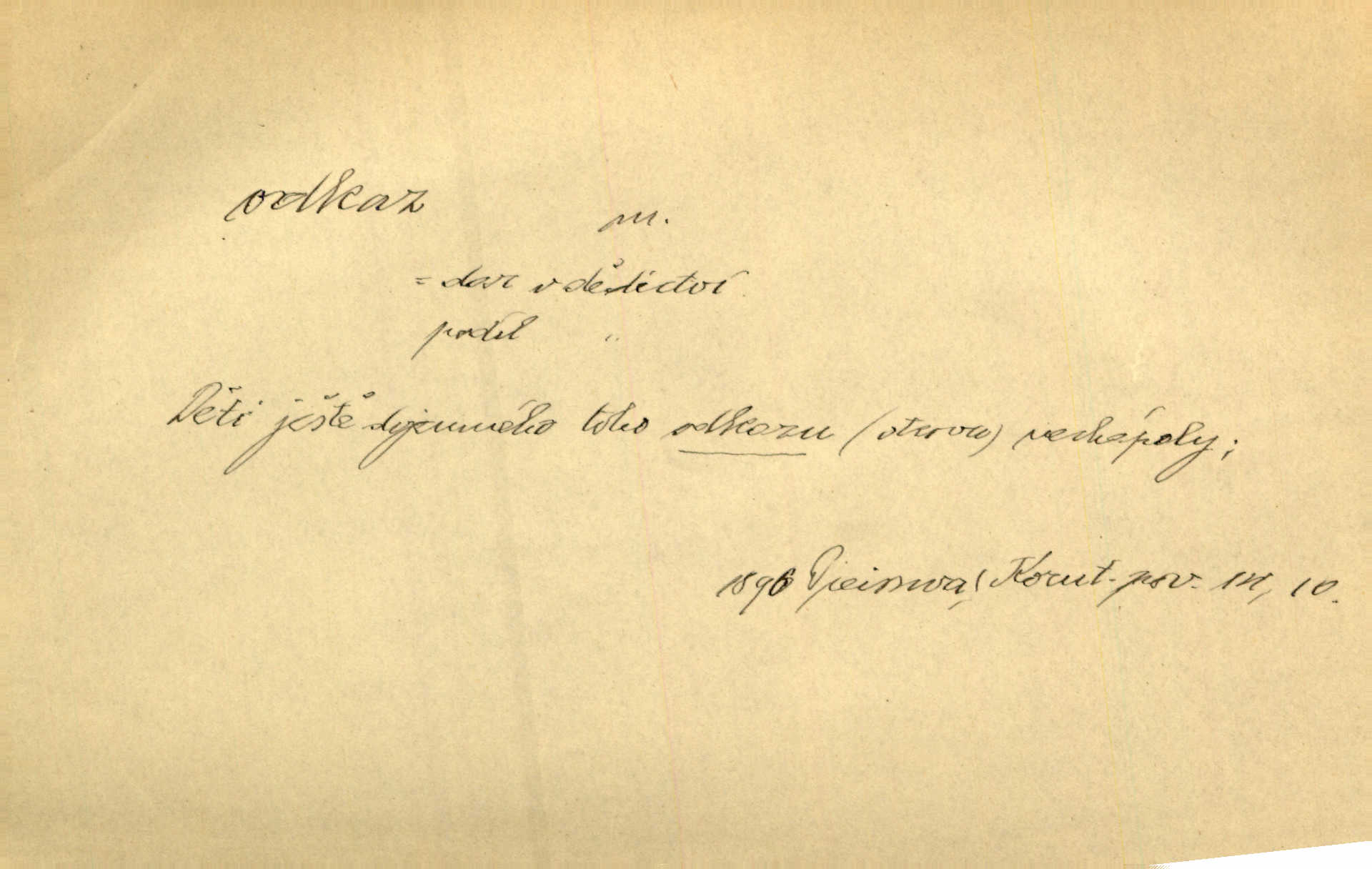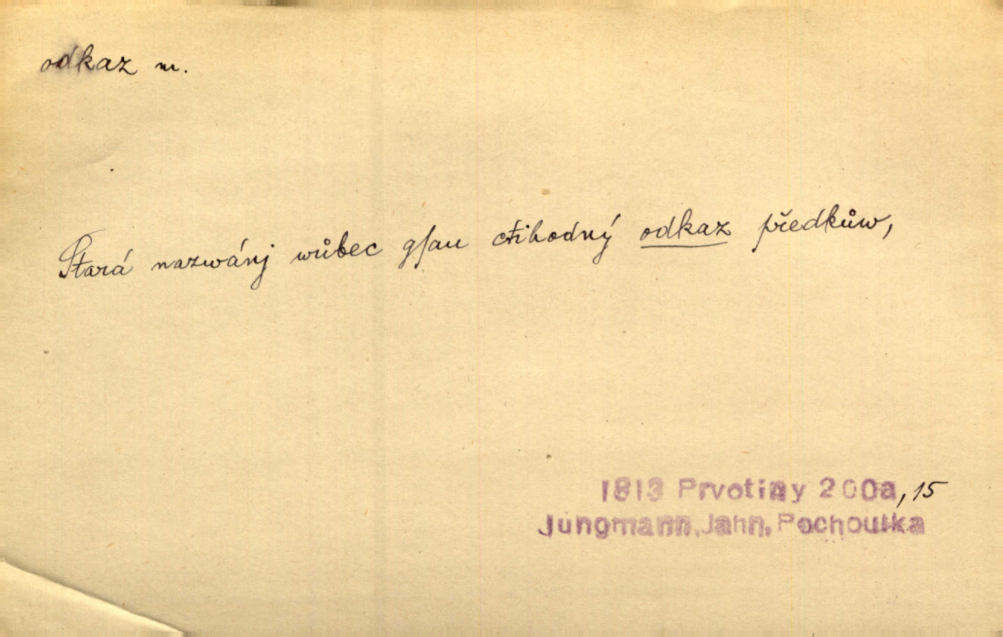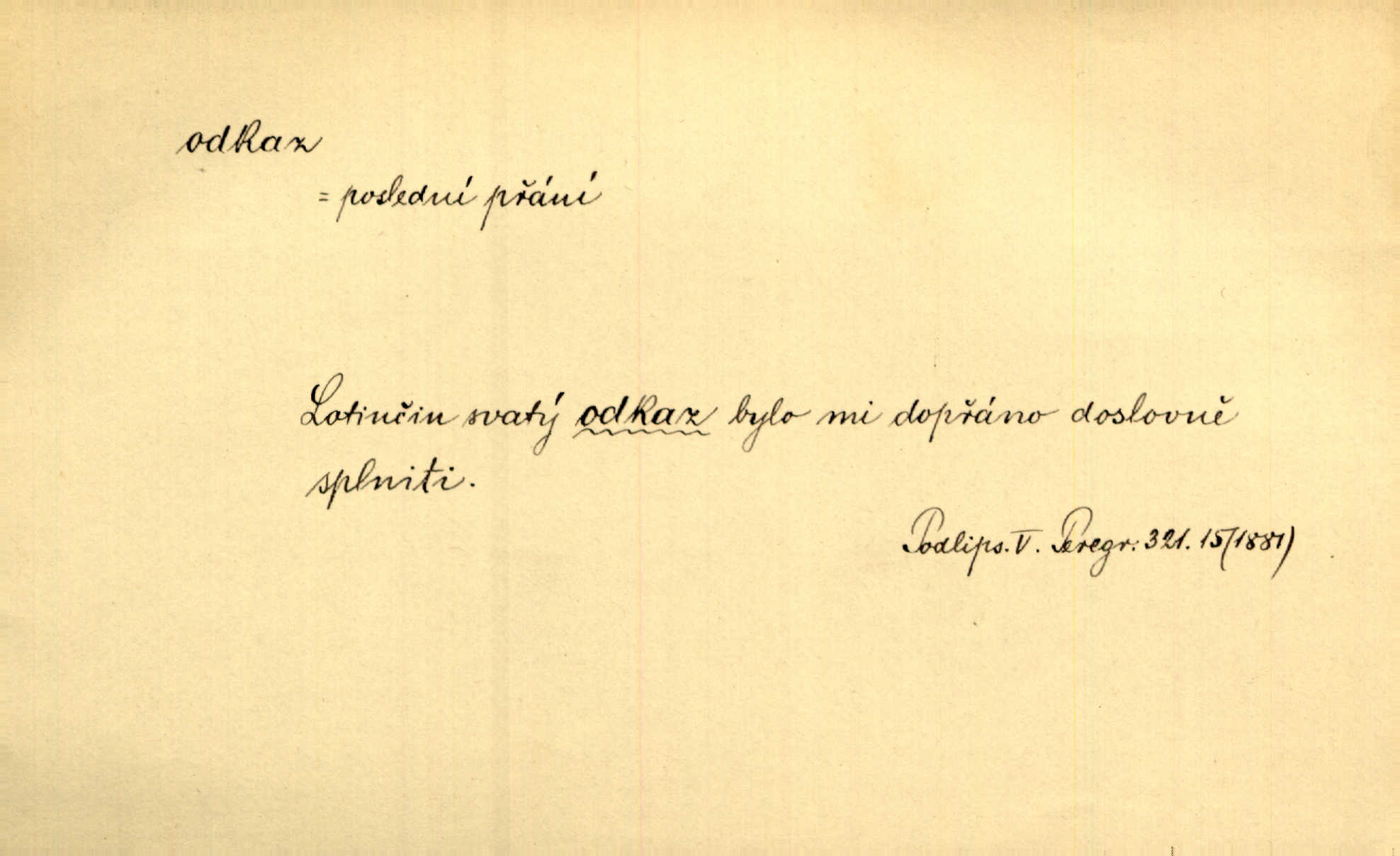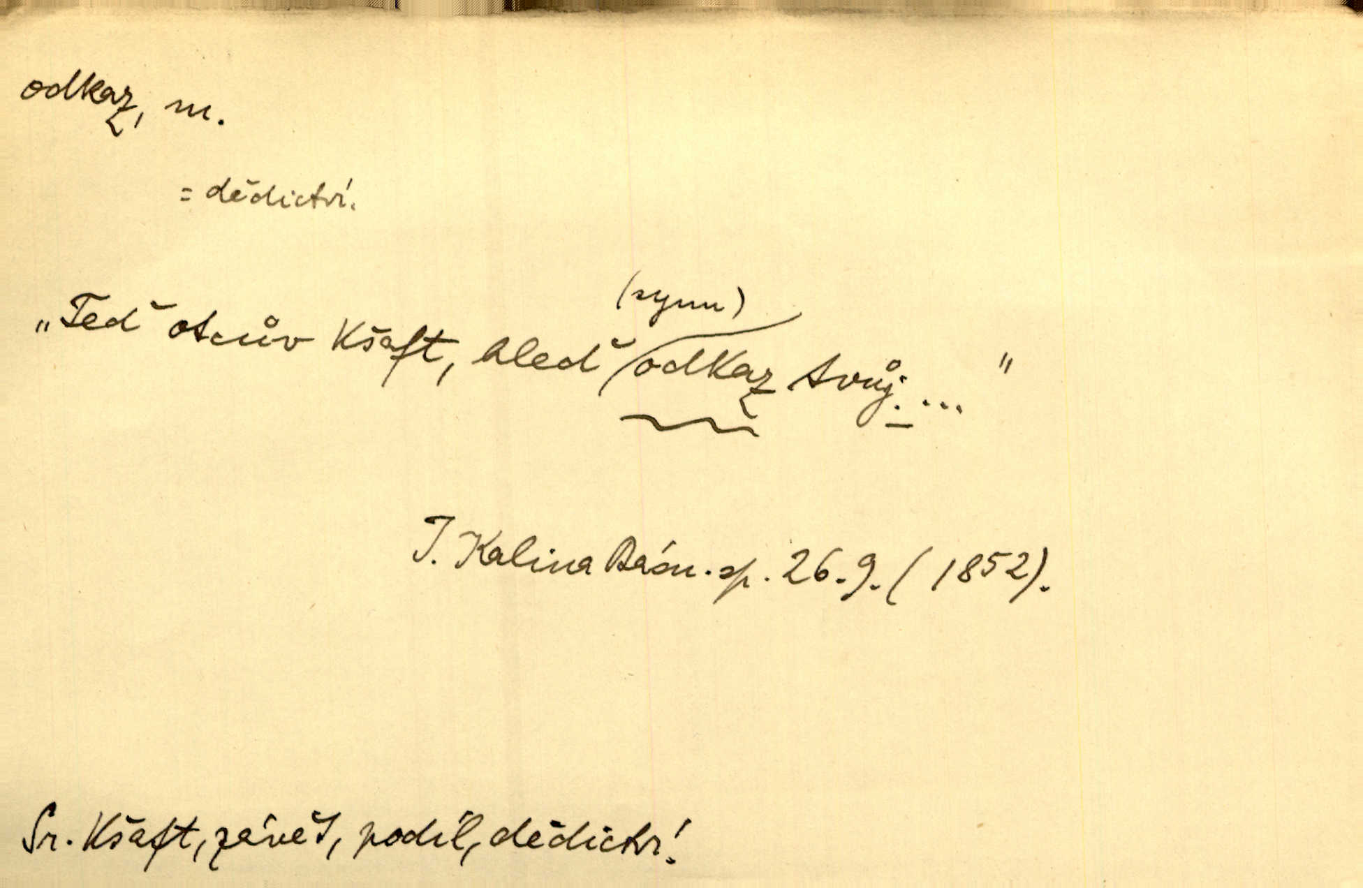 - odkaz, -u m. odkázání nějaké věci n. peněžité částky poslední vůlí; věc takto odkázaná, věnování, legát. [Kšaft] neobsahoval žádných odkazův ni služebnictvu, ni ústavům veřejným. Svět. Do pokladnice místní školní rady plynou dary a odkazy (legáty) k věcným potřebám školním učiněné. Služ. min. škol. Ku povznesení národa jest i velkolepý jeho [Hlávkův] odkaz. Jir. Literární cena z odkazu Jana Novotného. Herrm. Dědictví, jež Černohorci obdrželi od junáckých dědů v odkaz: handžár a gusle. Hol. Nám [lidem] v odkaz dala [Hesperis] sladkou lyru svoji. Vrch. Práv. nařízení (zprav. v posledním pořízení), kterým zůstavitel poskytuje někomu z pozůstalosti nějakou věc n. jiný majetkový prospěch, legát. D něco na způsob odkazu přecházejícího na potomstvo n. svěřeného, uloženého k vyplnění. Rodná mluvo, ty drahý skvoste, jediný z velkého odkazu dědů. Slád. Poetický odkaz Nerudův řadíme k svým velkým básnickým pokladům zanechané životní dílo. Vrch. Dělat podle odkazu Havlíčkova politiku rozumnou a poctivou. Mas. Lotinčin svatý odkaz bylo mi dopřáno doslovně splniti poslední přání. Podl. D Arch. závěť, poslední vůle. Já na tě budu v posledním odkazu pamatovat. Štěp. Umře bez odkazu. A. Mar. D poukaz, upozornění. [Matka] nechala ho přes hodinu za dveřmi s odkazem, aby si šel služby hledat. Herb. Císař motivuje svou žádost odkazem na neochotu Španělů přispívati na útraty válečné. Pek. Jednoduchými znaménky jsou odkazy [v rejstříku] s ušetřením místa. Kraus. Odkaz [v legendě o Jidáši] na zavraždění posledního Přemyslovce narážka. J. Vlč.