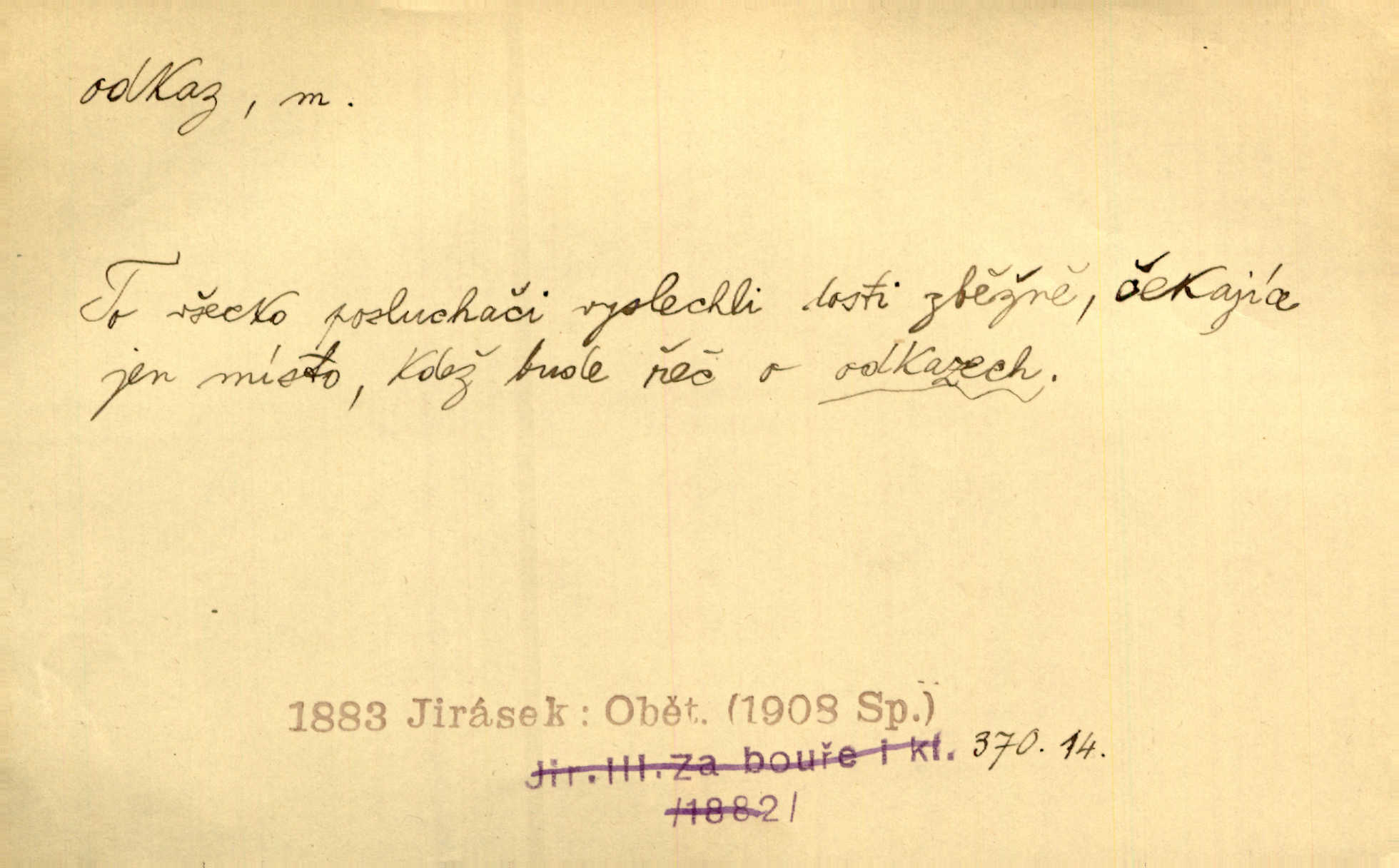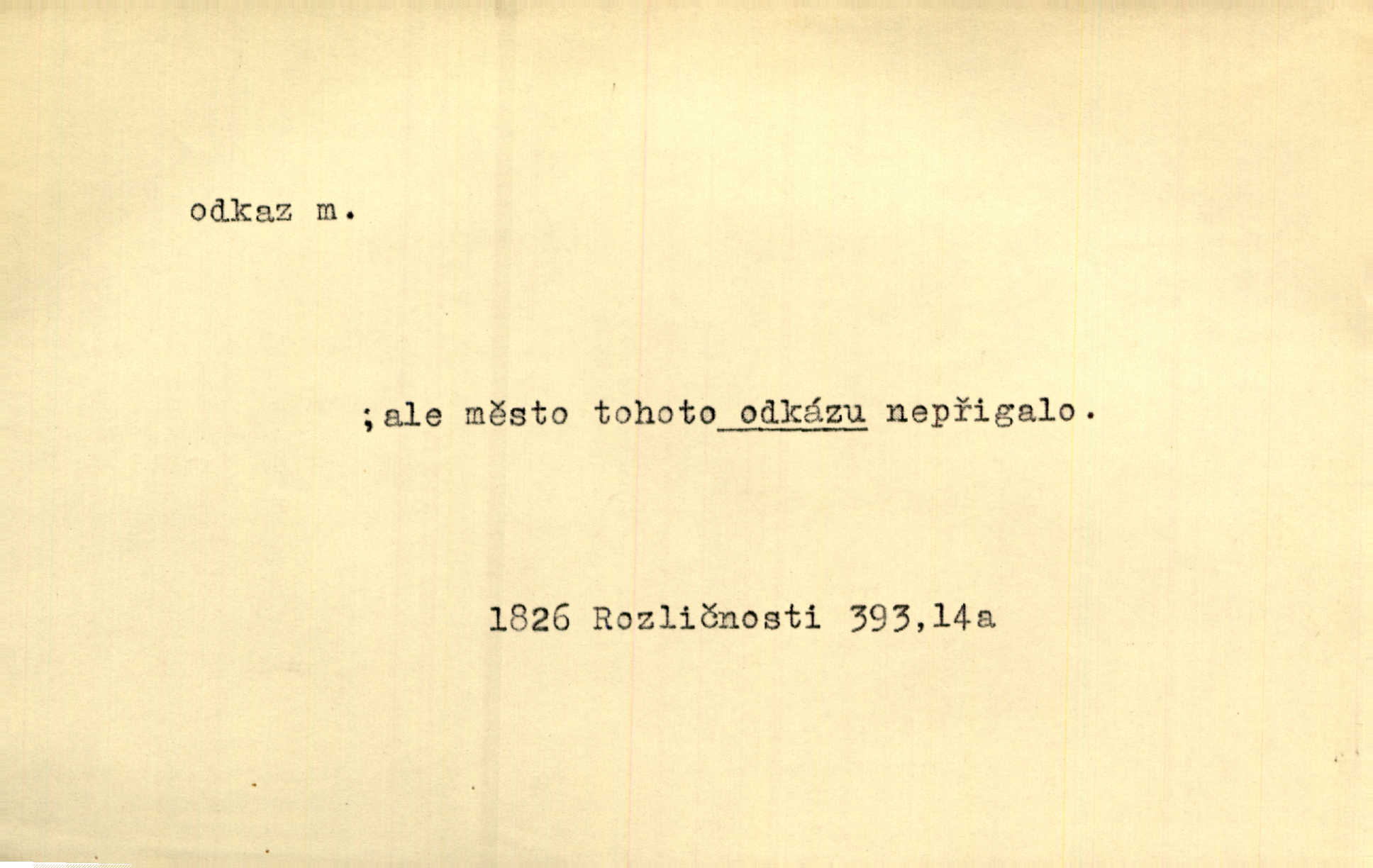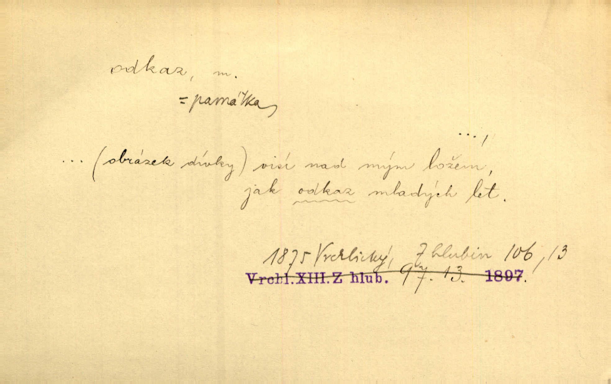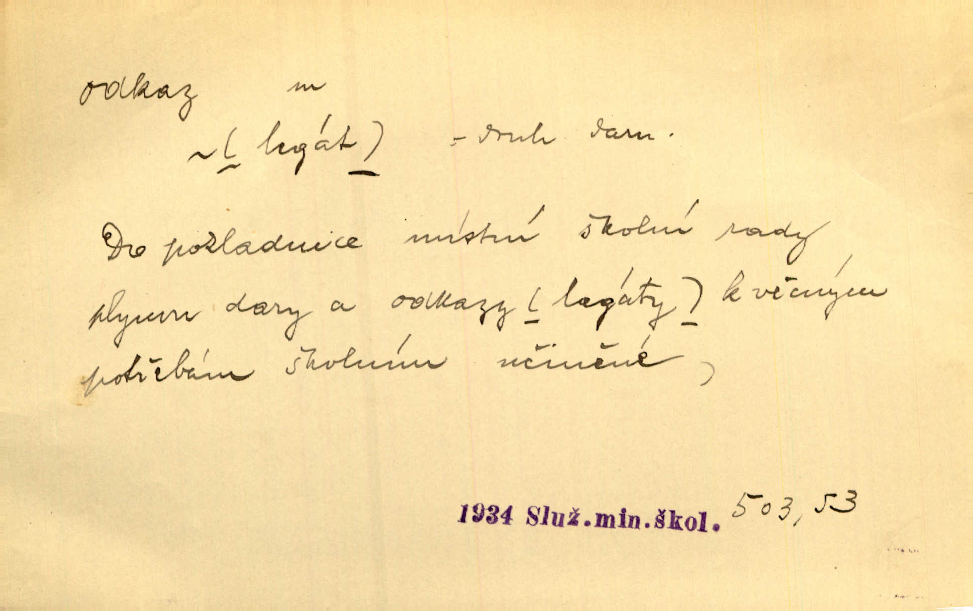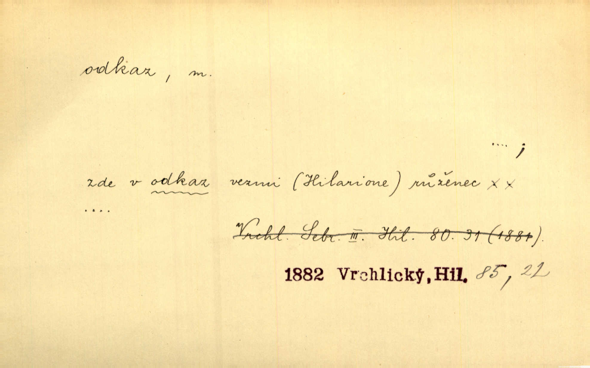 - odkaz, -u m. odkázání nějaké věci n. peněžité částky poslední vůlí; věc takto odkázaná, věnování, legát. [Kšaft] neobsahoval žádných odkazův ni služebnictvu, ni ústavům veřejným. Svět. Do pokladnice místní školní rady plynou dary a odkazy (legáty) k věcným potřebám školním učiněné. Služ. min. škol. Ku povznesení národa jest i velkolepý jeho [Hlávkův] odkaz. Jir. Literární cena z odkazu Jana Novotného. Herrm. Dědictví, jež Černohorci obdrželi od junáckých dědů v odkaz: handžár a gusle. Hol. Nám [lidem] v odkaz dala [Hesperis] sladkou lyru svoji. Vrch. Práv. nařízení (zprav. v posledním pořízení), kterým zůstavitel poskytuje někomu z pozůstalosti nějakou věc n. jiný majetkový prospěch, legát. D něco na způsob odkazu přecházejícího na potomstvo n. svěřeného, uloženého k vyplnění. Rodná mluvo, ty drahý skvoste, jediný z velkého odkazu dědů. Slád. Poetický odkaz Nerudův řadíme k svým velkým básnickým pokladům zanechané životní dílo. Vrch. Dělat podle odkazu Havlíčkova politiku rozumnou a poctivou. Mas. Lotinčin svatý odkaz bylo mi dopřáno doslovně splniti poslední přání. Podl. D Arch. závěť, poslední vůle. Já na tě budu v posledním odkazu pamatovat. Štěp. Umře bez odkazu. A. Mar. D poukaz, upozornění. [Matka] nechala ho přes hodinu za dveřmi s odkazem, aby si šel služby hledat. Herb. Císař motivuje svou žádost odkazem na neochotu Španělů přispívati na útraty válečné. Pek. Jednoduchými znaménky jsou odkazy [v rejstříku] s ušetřením místa. Kraus. Odkaz [v legendě o Jidáši] na zavraždění posledního Přemyslovce narážka. J. Vlč.