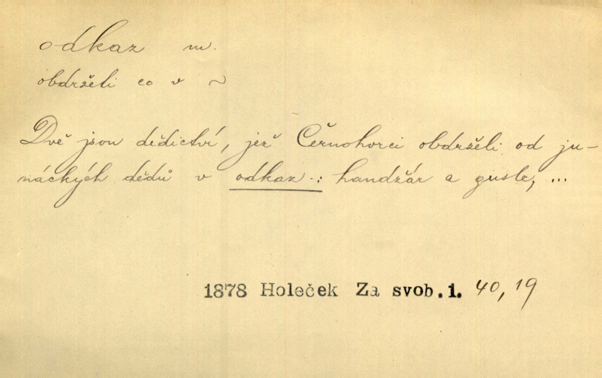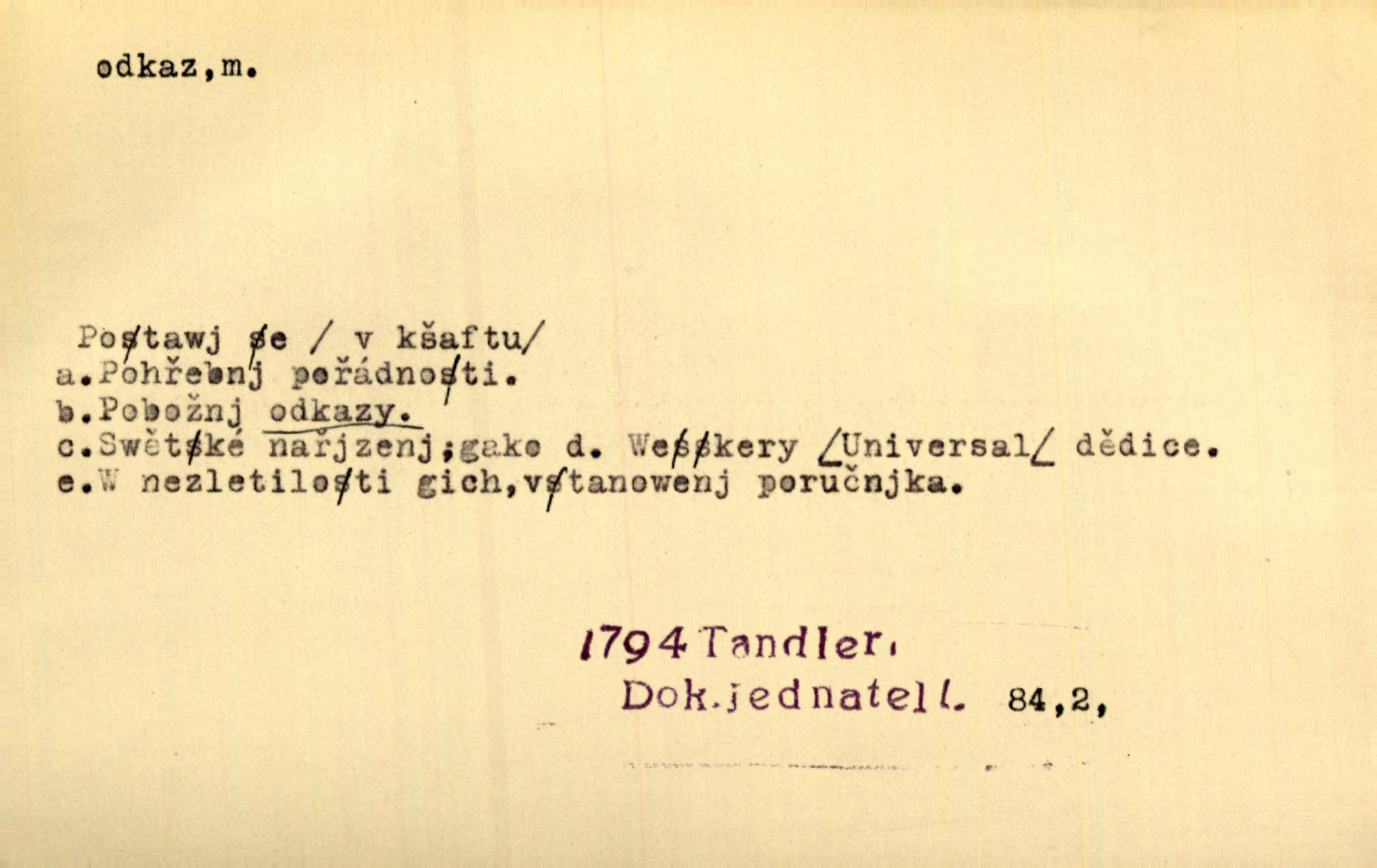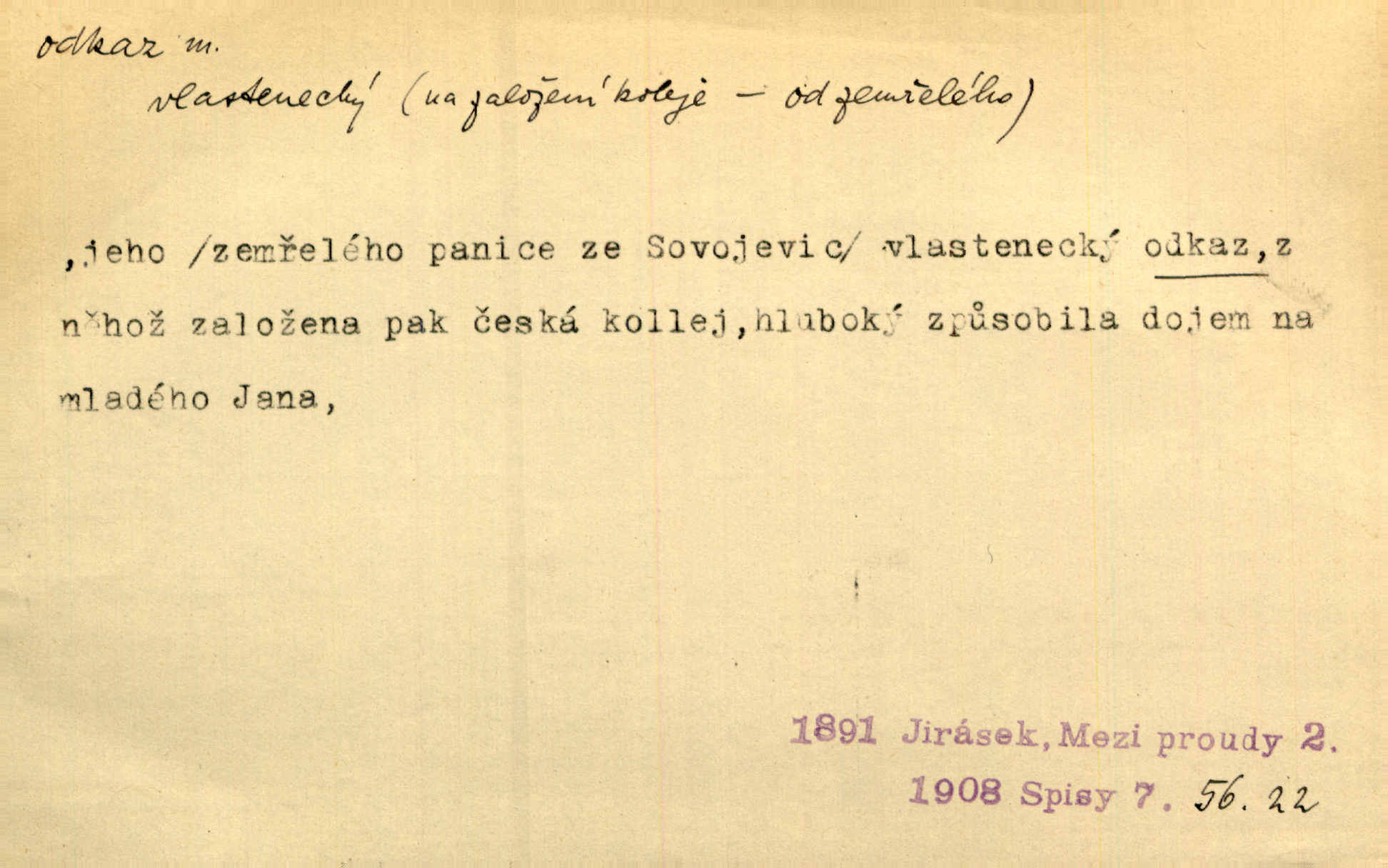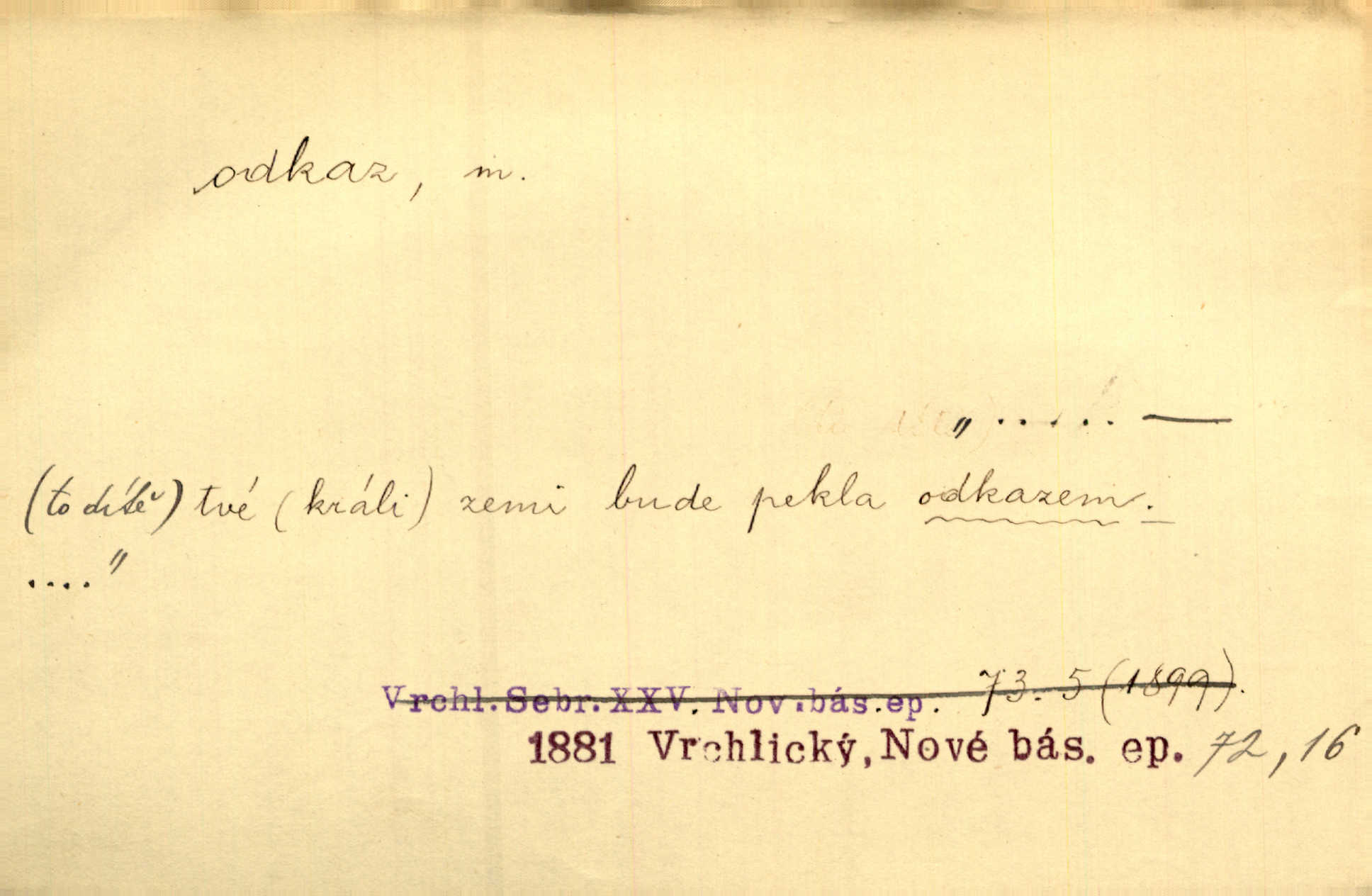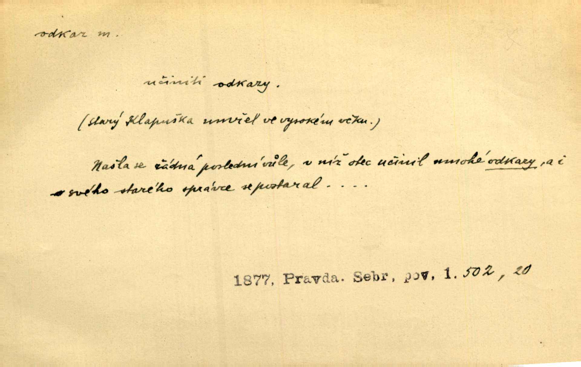 - odkaz, -u m. odkázání nějaké věci n. peněžité částky poslední vůlí; věc takto odkázaná, věnování, legát. [Kšaft] neobsahoval žádných odkazův ni služebnictvu, ni ústavům veřejným. Svět. Do pokladnice místní školní rady plynou dary a odkazy (legáty) k věcným potřebám školním učiněné. Služ. min. škol. Ku povznesení národa jest i velkolepý jeho [Hlávkův] odkaz. Jir. Literární cena z odkazu Jana Novotného. Herrm. Dědictví, jež Černohorci obdrželi od junáckých dědů v odkaz: handžár a gusle. Hol. Nám [lidem] v odkaz dala [Hesperis] sladkou lyru svoji. Vrch. Práv. nařízení (zprav. v posledním pořízení), kterým zůstavitel poskytuje někomu z pozůstalosti nějakou věc n. jiný majetkový prospěch, legát. D něco na způsob odkazu přecházejícího na potomstvo n. svěřeného, uloženého k vyplnění. Rodná mluvo, ty drahý skvoste, jediný z velkého odkazu dědů. Slád. Poetický odkaz Nerudův řadíme k svým velkým básnickým pokladům zanechané životní dílo. Vrch. Dělat podle odkazu Havlíčkova politiku rozumnou a poctivou. Mas. Lotinčin svatý odkaz bylo mi dopřáno doslovně splniti poslední přání. Podl. D Arch. závěť, poslední vůle. Já na tě budu v posledním odkazu pamatovat. Štěp. Umře bez odkazu. A. Mar. D poukaz, upozornění. [Matka] nechala ho přes hodinu za dveřmi s odkazem, aby si šel služby hledat. Herb. Císař motivuje svou žádost odkazem na neochotu Španělů přispívati na útraty válečné. Pek. Jednoduchými znaménky jsou odkazy [v rejstříku] s ušetřením místa. Kraus. Odkaz [v legendě o Jidáši] na zavraždění posledního Přemyslovce narážka. J. Vlč.