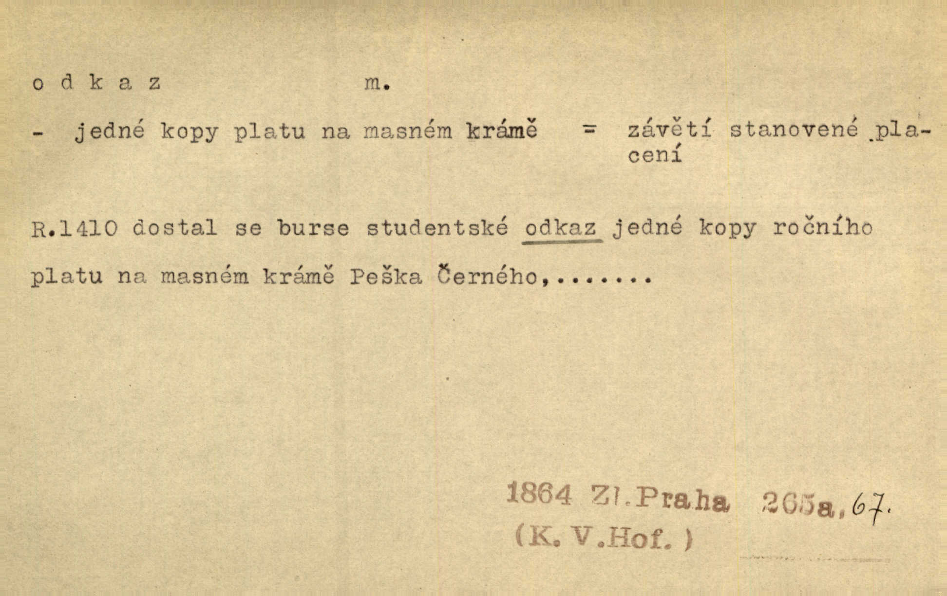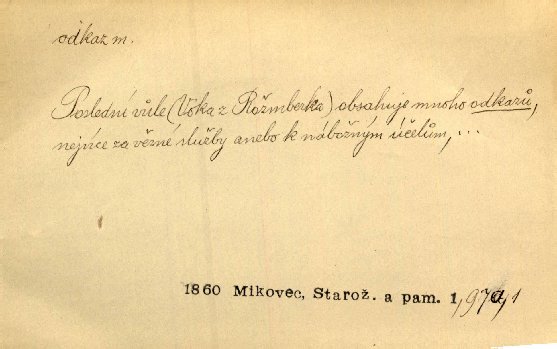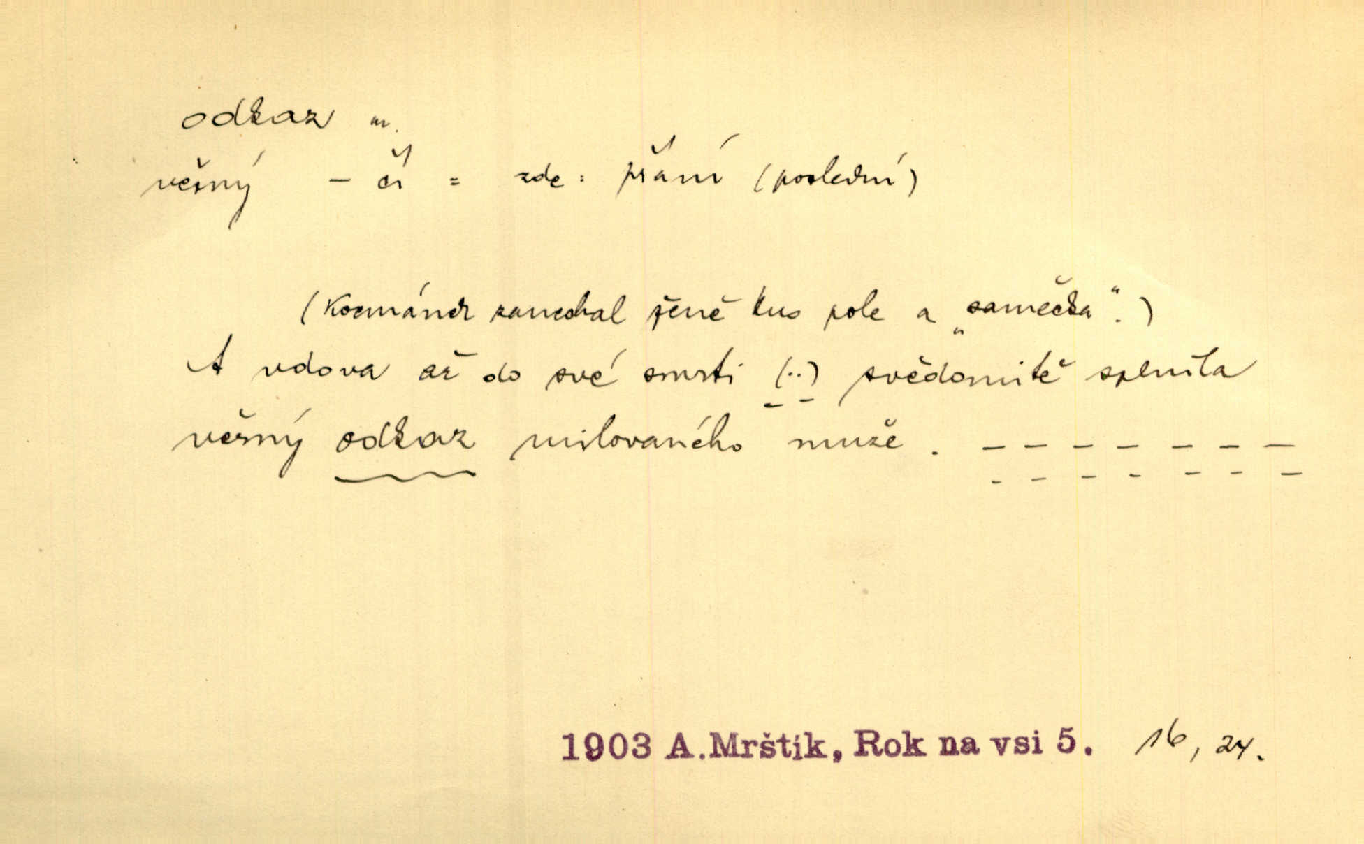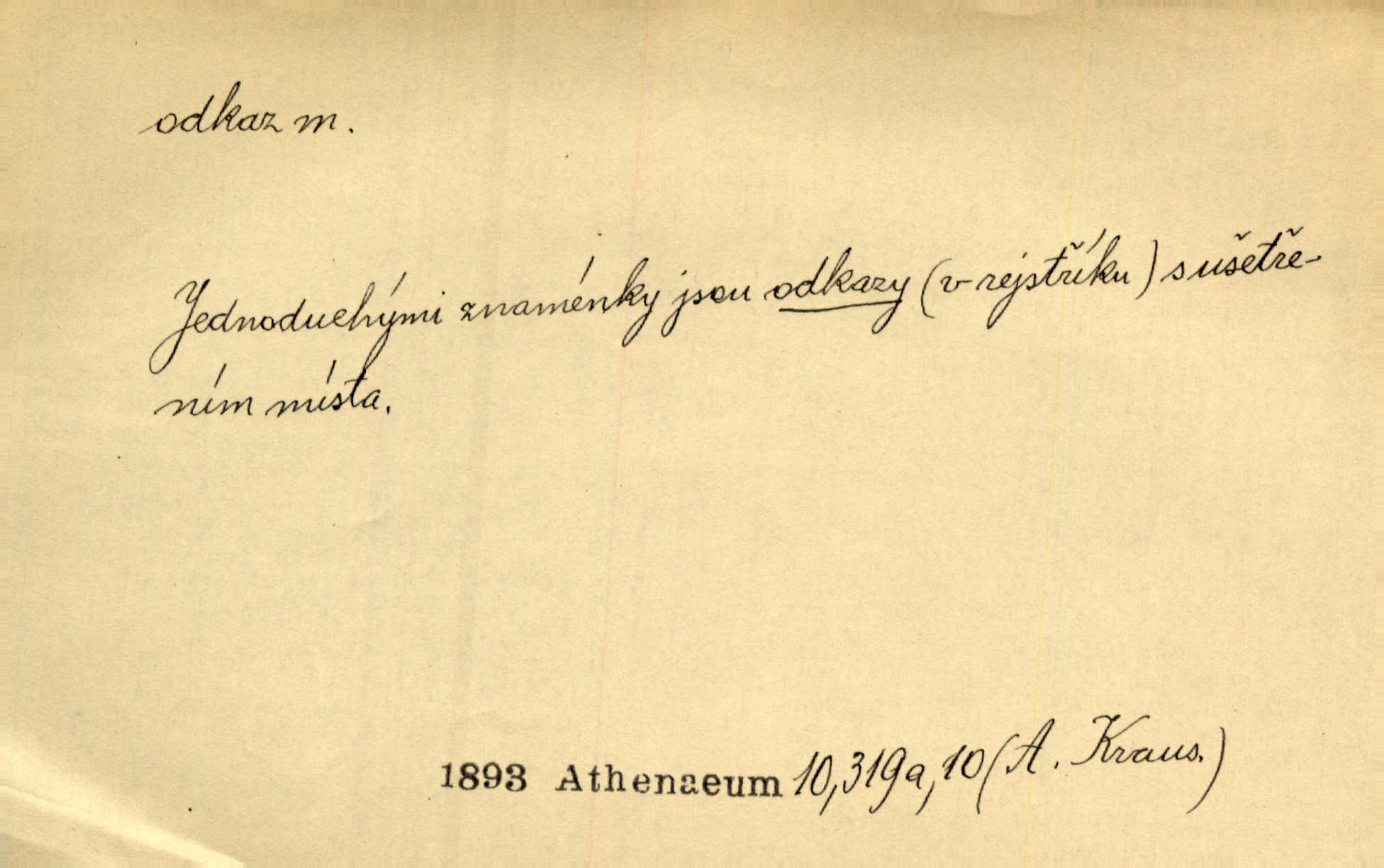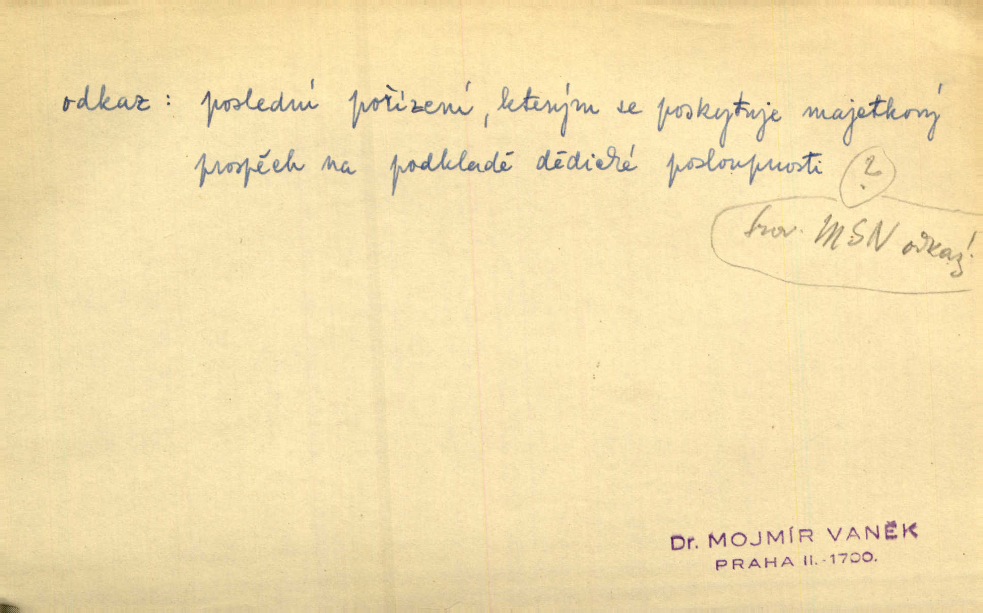 - odkaz, -u m. odkázání nějaké věci n. peněžité částky poslední vůlí; věc takto odkázaná, věnování, legát. [Kšaft] neobsahoval žádných odkazův ni služebnictvu, ni ústavům veřejným. Svět. Do pokladnice místní školní rady plynou dary a odkazy (legáty) k věcným potřebám školním učiněné. Služ. min. škol. Ku povznesení národa jest i velkolepý jeho [Hlávkův] odkaz. Jir. Literární cena z odkazu Jana Novotného. Herrm. Dědictví, jež Černohorci obdrželi od junáckých dědů v odkaz: handžár a gusle. Hol. Nám [lidem] v odkaz dala [Hesperis] sladkou lyru svoji. Vrch. Práv. nařízení (zprav. v posledním pořízení), kterým zůstavitel poskytuje někomu z pozůstalosti nějakou věc n. jiný majetkový prospěch, legát. D něco na způsob odkazu přecházejícího na potomstvo n. svěřeného, uloženého k vyplnění. Rodná mluvo, ty drahý skvoste, jediný z velkého odkazu dědů. Slád. Poetický odkaz Nerudův řadíme k svým velkým básnickým pokladům zanechané životní dílo. Vrch. Dělat podle odkazu Havlíčkova politiku rozumnou a poctivou. Mas. Lotinčin svatý odkaz bylo mi dopřáno doslovně splniti poslední přání. Podl. D Arch. závěť, poslední vůle. Já na tě budu v posledním odkazu pamatovat. Štěp. Umře bez odkazu. A. Mar. D poukaz, upozornění. [Matka] nechala ho přes hodinu za dveřmi s odkazem, aby si šel služby hledat. Herb. Císař motivuje svou žádost odkazem na neochotu Španělů přispívati na útraty válečné. Pek. Jednoduchými znaménky jsou odkazy [v rejstříku] s ušetřením místa. Kraus. Odkaz [v legendě o Jidáši] na zavraždění posledního Přemyslovce narážka. J. Vlč.