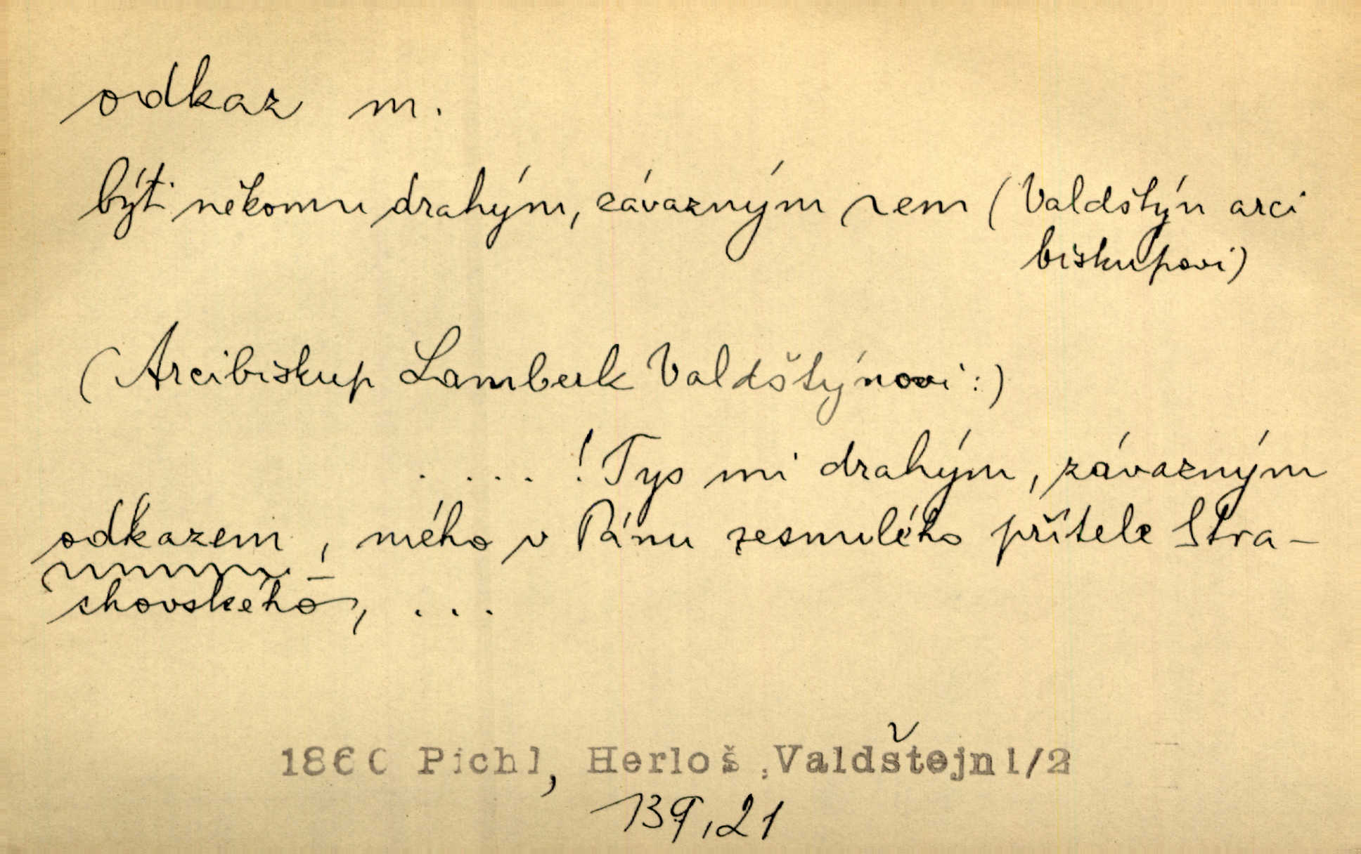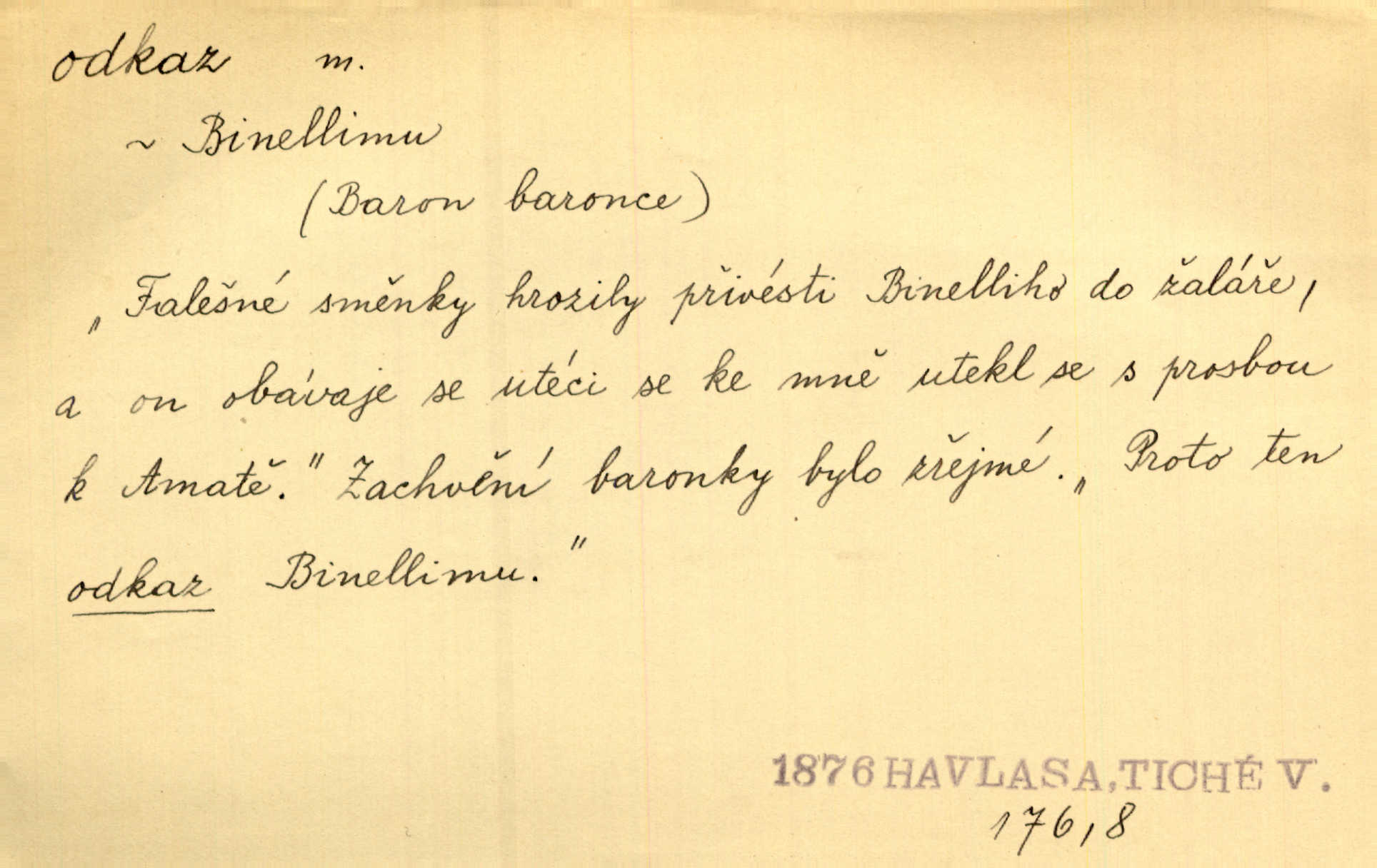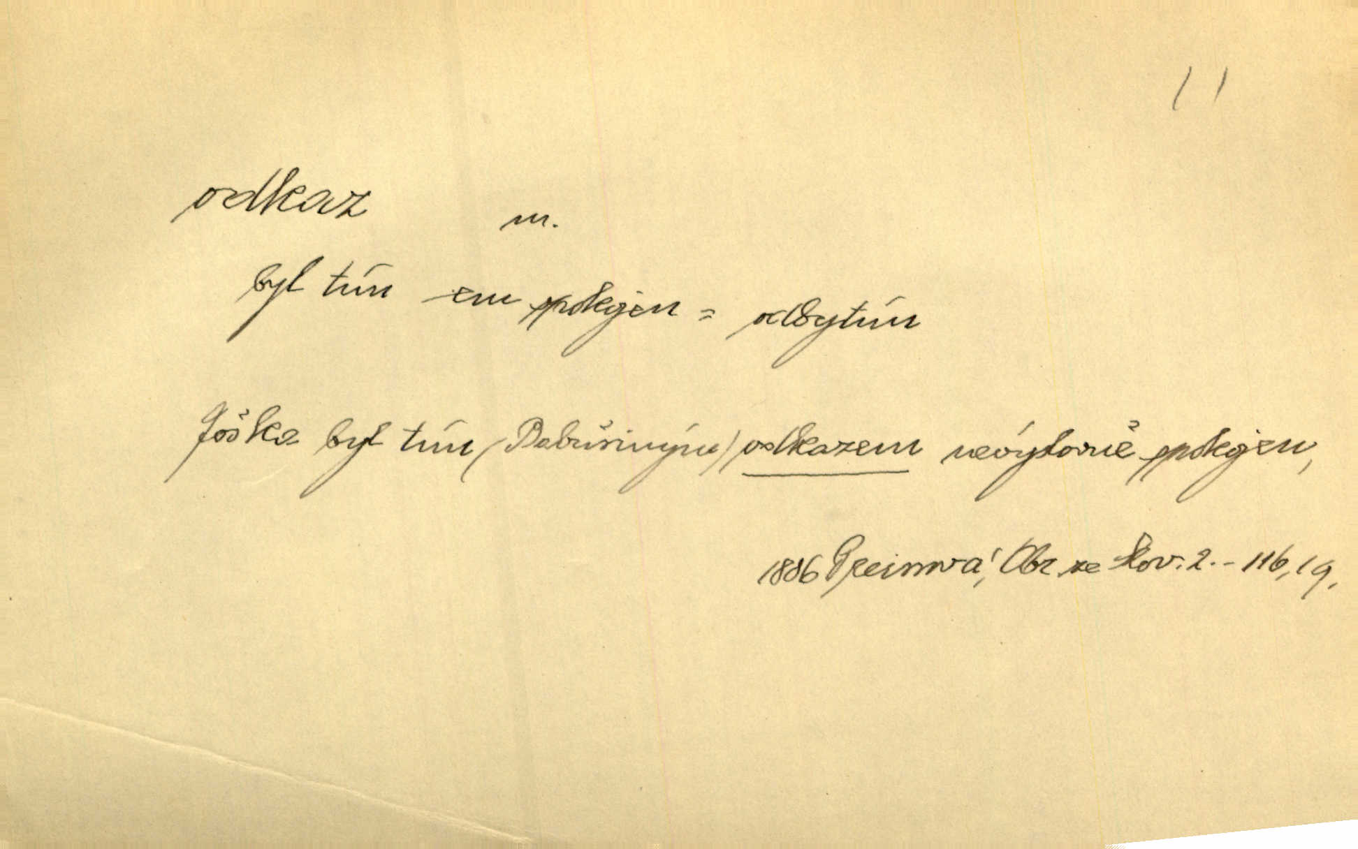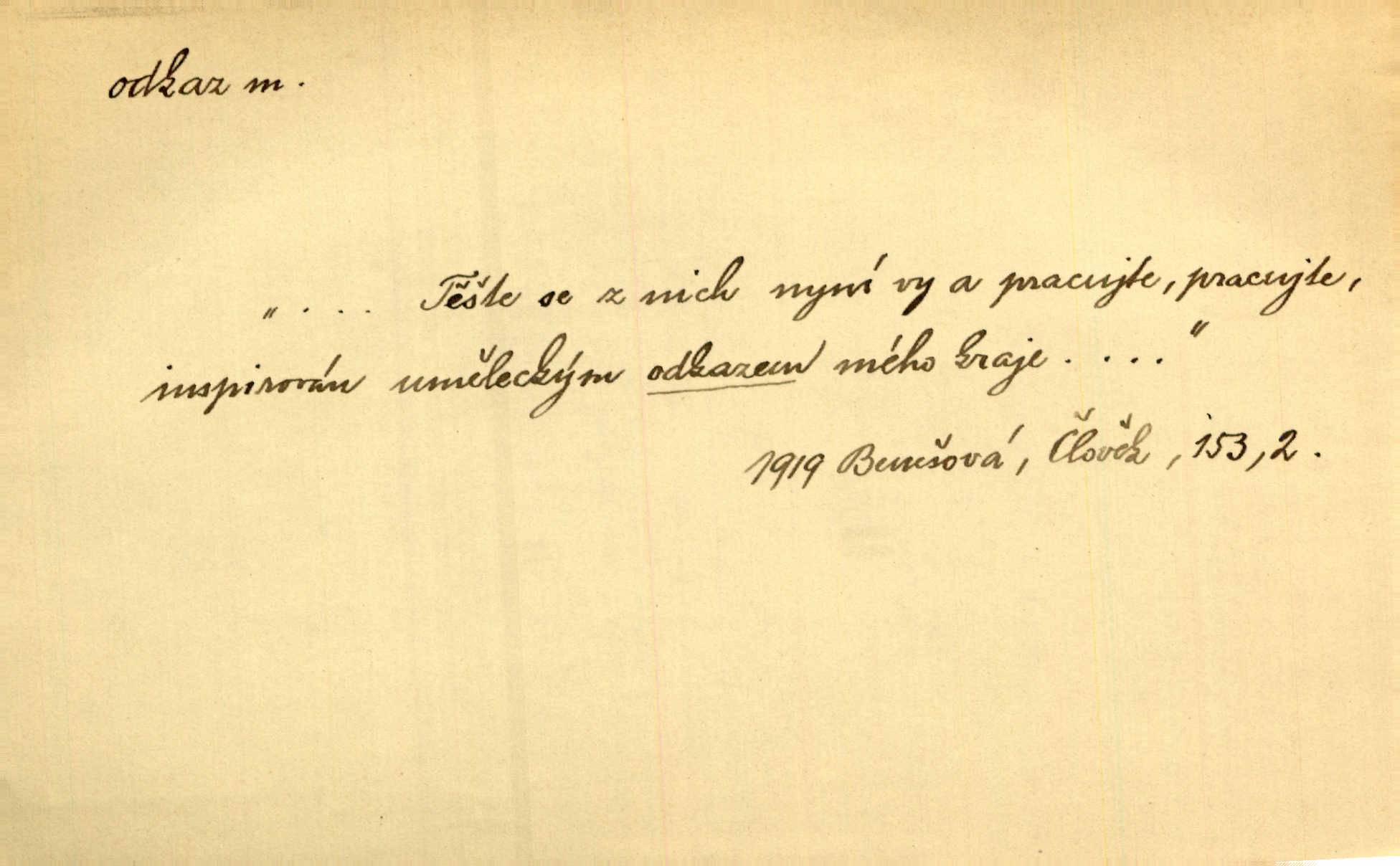 - odkaz, -u m. odkázání nějaké věci n. peněžité částky poslední vůlí; věc takto odkázaná, věnování, legát. [Kšaft] neobsahoval žádných odkazův ni služebnictvu, ni ústavům veřejným. Svět. Do pokladnice místní školní rady plynou dary a odkazy (legáty) k věcným potřebám školním učiněné. Služ. min. škol. Ku povznesení národa jest i velkolepý jeho [Hlávkův] odkaz. Jir. Literární cena z odkazu Jana Novotného. Herrm. Dědictví, jež Černohorci obdrželi od junáckých dědů v odkaz: handžár a gusle. Hol. Nám [lidem] v odkaz dala [Hesperis] sladkou lyru svoji. Vrch. Práv. nařízení (zprav. v posledním pořízení), kterým zůstavitel poskytuje někomu z pozůstalosti nějakou věc n. jiný majetkový prospěch, legát. D něco na způsob odkazu přecházejícího na potomstvo n. svěřeného, uloženého k vyplnění. Rodná mluvo, ty drahý skvoste, jediný z velkého odkazu dědů. Slád. Poetický odkaz Nerudův řadíme k svým velkým básnickým pokladům zanechané životní dílo. Vrch. Dělat podle odkazu Havlíčkova politiku rozumnou a poctivou. Mas. Lotinčin svatý odkaz bylo mi dopřáno doslovně splniti poslední přání. Podl. D Arch. závěť, poslední vůle. Já na tě budu v posledním odkazu pamatovat. Štěp. Umře bez odkazu. A. Mar. D poukaz, upozornění. [Matka] nechala ho přes hodinu za dveřmi s odkazem, aby si šel služby hledat. Herb. Císař motivuje svou žádost odkazem na neochotu Španělů přispívati na útraty válečné. Pek. Jednoduchými znaménky jsou odkazy [v rejstříku] s ušetřením místa. Kraus. Odkaz [v legendě o Jidáši] na zavraždění posledního Přemyslovce narážka. J. Vlč.
