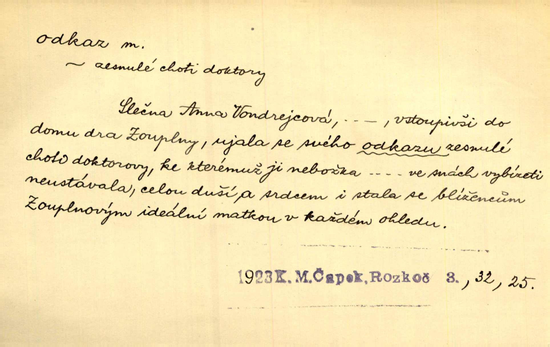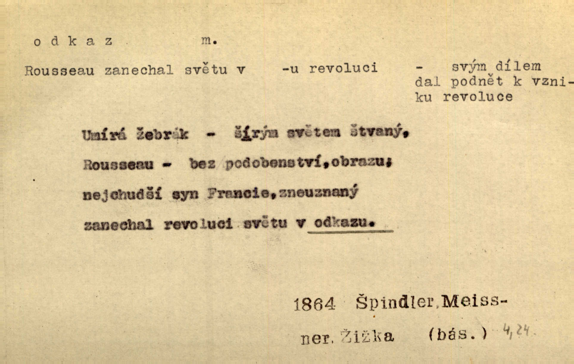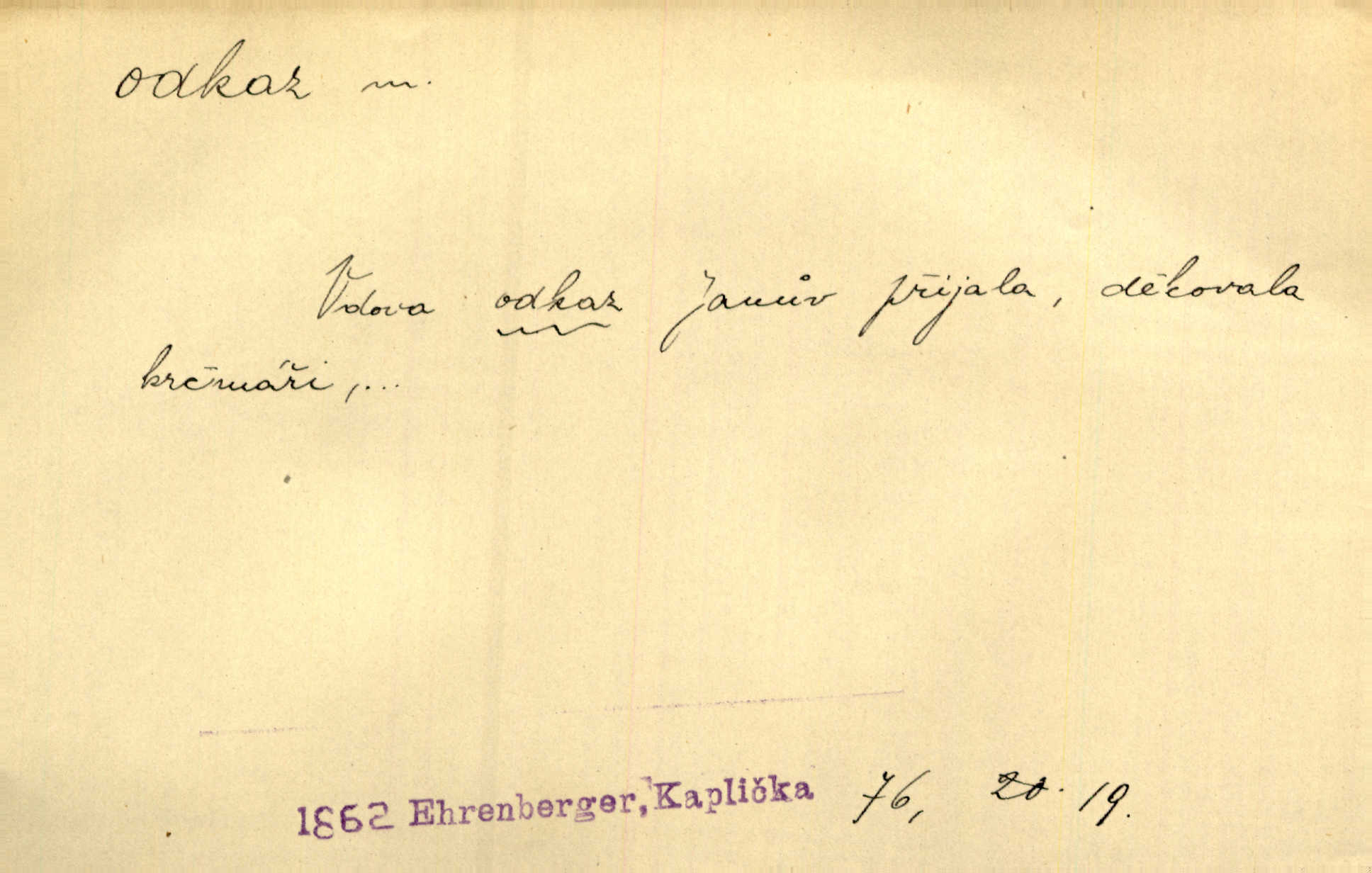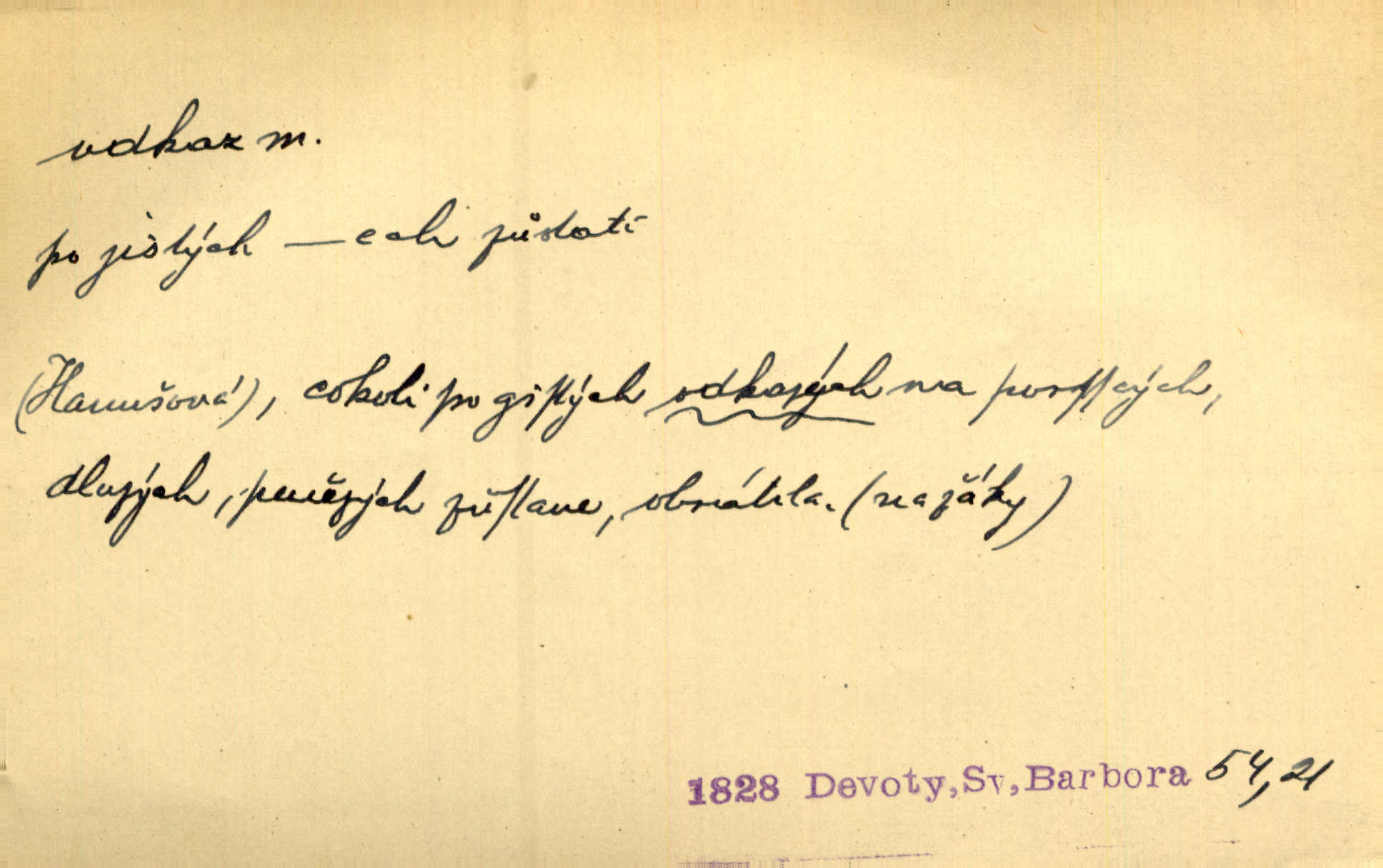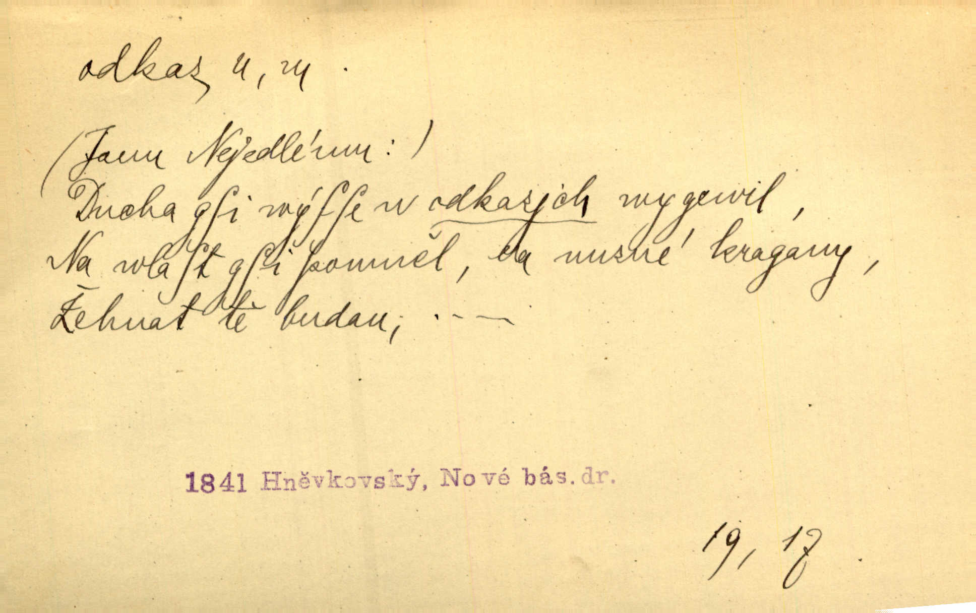 - odkaz, -u m. odkázání nějaké věci n. peněžité částky poslední vůlí; věc takto odkázaná, věnování, legát. [Kšaft] neobsahoval žádných odkazův ni služebnictvu, ni ústavům veřejným. Svět. Do pokladnice místní školní rady plynou dary a odkazy (legáty) k věcným potřebám školním učiněné. Služ. min. škol. Ku povznesení národa jest i velkolepý jeho [Hlávkův] odkaz. Jir. Literární cena z odkazu Jana Novotného. Herrm. Dědictví, jež Černohorci obdrželi od junáckých dědů v odkaz: handžár a gusle. Hol. Nám [lidem] v odkaz dala [Hesperis] sladkou lyru svoji. Vrch. Práv. nařízení (zprav. v posledním pořízení), kterým zůstavitel poskytuje někomu z pozůstalosti nějakou věc n. jiný majetkový prospěch, legát. D něco na způsob odkazu přecházejícího na potomstvo n. svěřeného, uloženého k vyplnění. Rodná mluvo, ty drahý skvoste, jediný z velkého odkazu dědů. Slád. Poetický odkaz Nerudův řadíme k svým velkým básnickým pokladům zanechané životní dílo. Vrch. Dělat podle odkazu Havlíčkova politiku rozumnou a poctivou. Mas. Lotinčin svatý odkaz bylo mi dopřáno doslovně splniti poslední přání. Podl. D Arch. závěť, poslední vůle. Já na tě budu v posledním odkazu pamatovat. Štěp. Umře bez odkazu. A. Mar. D poukaz, upozornění. [Matka] nechala ho přes hodinu za dveřmi s odkazem, aby si šel služby hledat. Herb. Císař motivuje svou žádost odkazem na neochotu Španělů přispívati na útraty válečné. Pek. Jednoduchými znaménky jsou odkazy [v rejstříku] s ušetřením místa. Kraus. Odkaz [v legendě o Jidáši] na zavraždění posledního Přemyslovce narážka. J. Vlč.