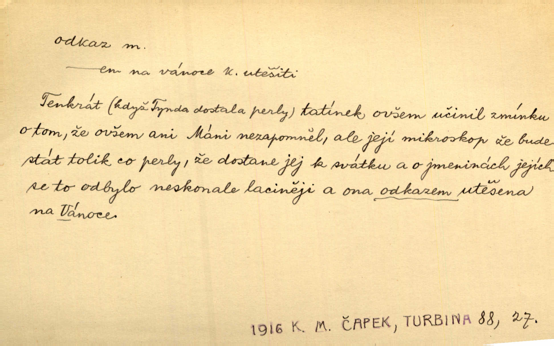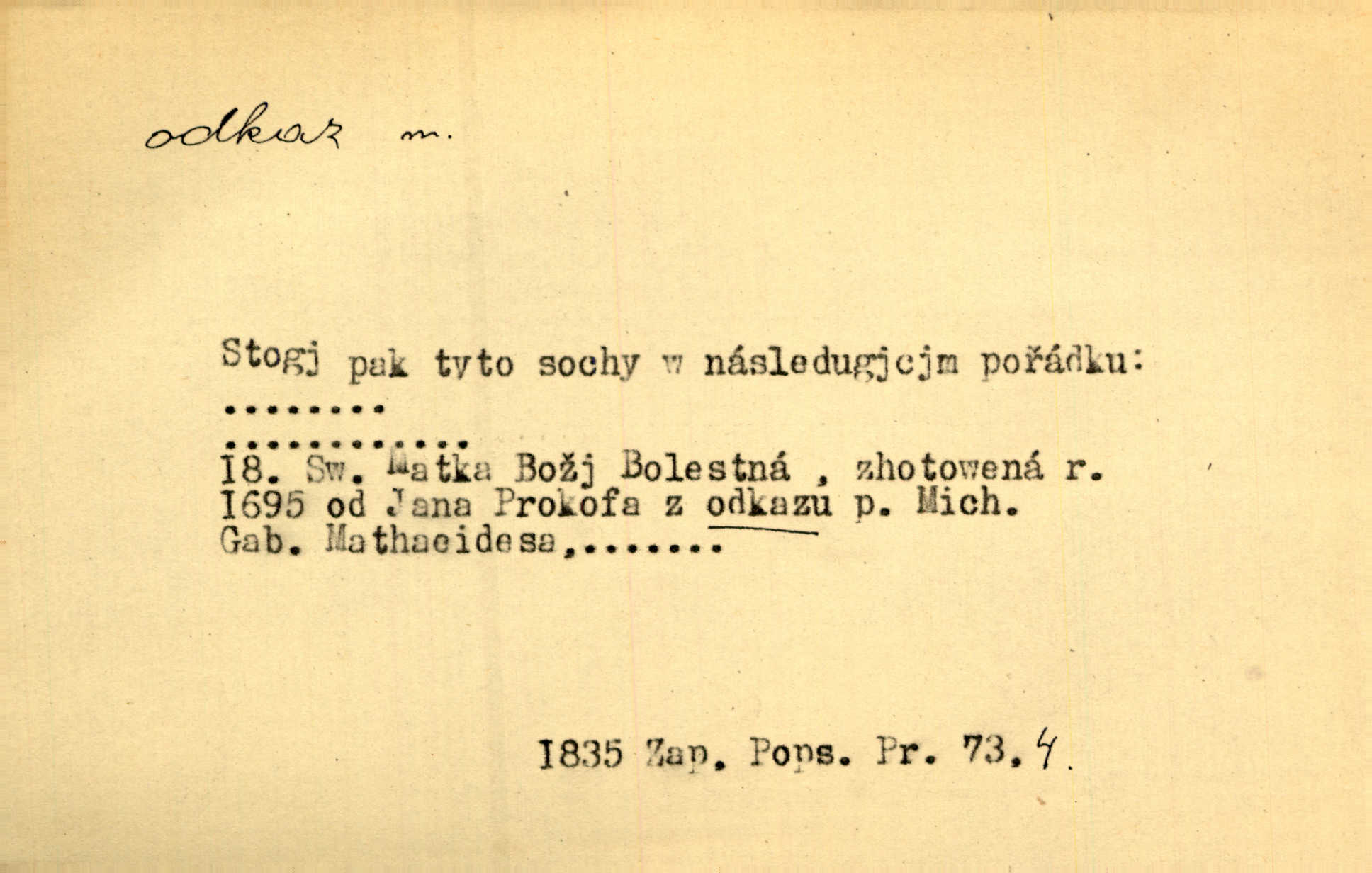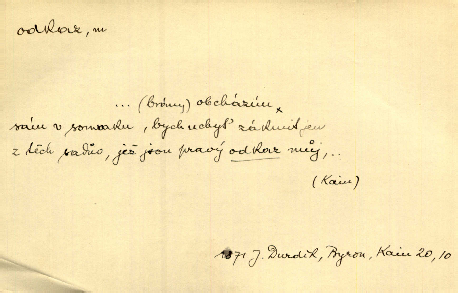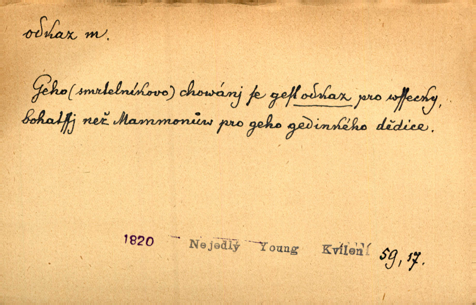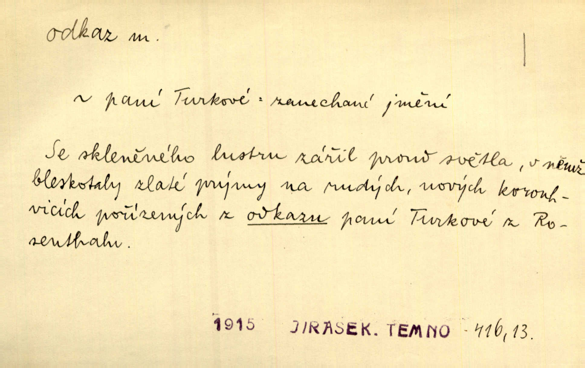 - odkaz, -u m. odkázání nějaké věci n. peněžité částky poslední vůlí; věc takto odkázaná, věnování, legát. [Kšaft] neobsahoval žádných odkazův ni služebnictvu, ni ústavům veřejným. Svět. Do pokladnice místní školní rady plynou dary a odkazy (legáty) k věcným potřebám školním učiněné. Služ. min. škol. Ku povznesení národa jest i velkolepý jeho [Hlávkův] odkaz. Jir. Literární cena z odkazu Jana Novotného. Herrm. Dědictví, jež Černohorci obdrželi od junáckých dědů v odkaz: handžár a gusle. Hol. Nám [lidem] v odkaz dala [Hesperis] sladkou lyru svoji. Vrch. Práv. nařízení (zprav. v posledním pořízení), kterým zůstavitel poskytuje někomu z pozůstalosti nějakou věc n. jiný majetkový prospěch, legát. D něco na způsob odkazu přecházejícího na potomstvo n. svěřeného, uloženého k vyplnění. Rodná mluvo, ty drahý skvoste, jediný z velkého odkazu dědů. Slád. Poetický odkaz Nerudův řadíme k svým velkým básnickým pokladům zanechané životní dílo. Vrch. Dělat podle odkazu Havlíčkova politiku rozumnou a poctivou. Mas. Lotinčin svatý odkaz bylo mi dopřáno doslovně splniti poslední přání. Podl. D Arch. závěť, poslední vůle. Já na tě budu v posledním odkazu pamatovat. Štěp. Umře bez odkazu. A. Mar. D poukaz, upozornění. [Matka] nechala ho přes hodinu za dveřmi s odkazem, aby si šel služby hledat. Herb. Císař motivuje svou žádost odkazem na neochotu Španělů přispívati na útraty válečné. Pek. Jednoduchými znaménky jsou odkazy [v rejstříku] s ušetřením místa. Kraus. Odkaz [v legendě o Jidáši] na zavraždění posledního Přemyslovce narážka. J. Vlč.