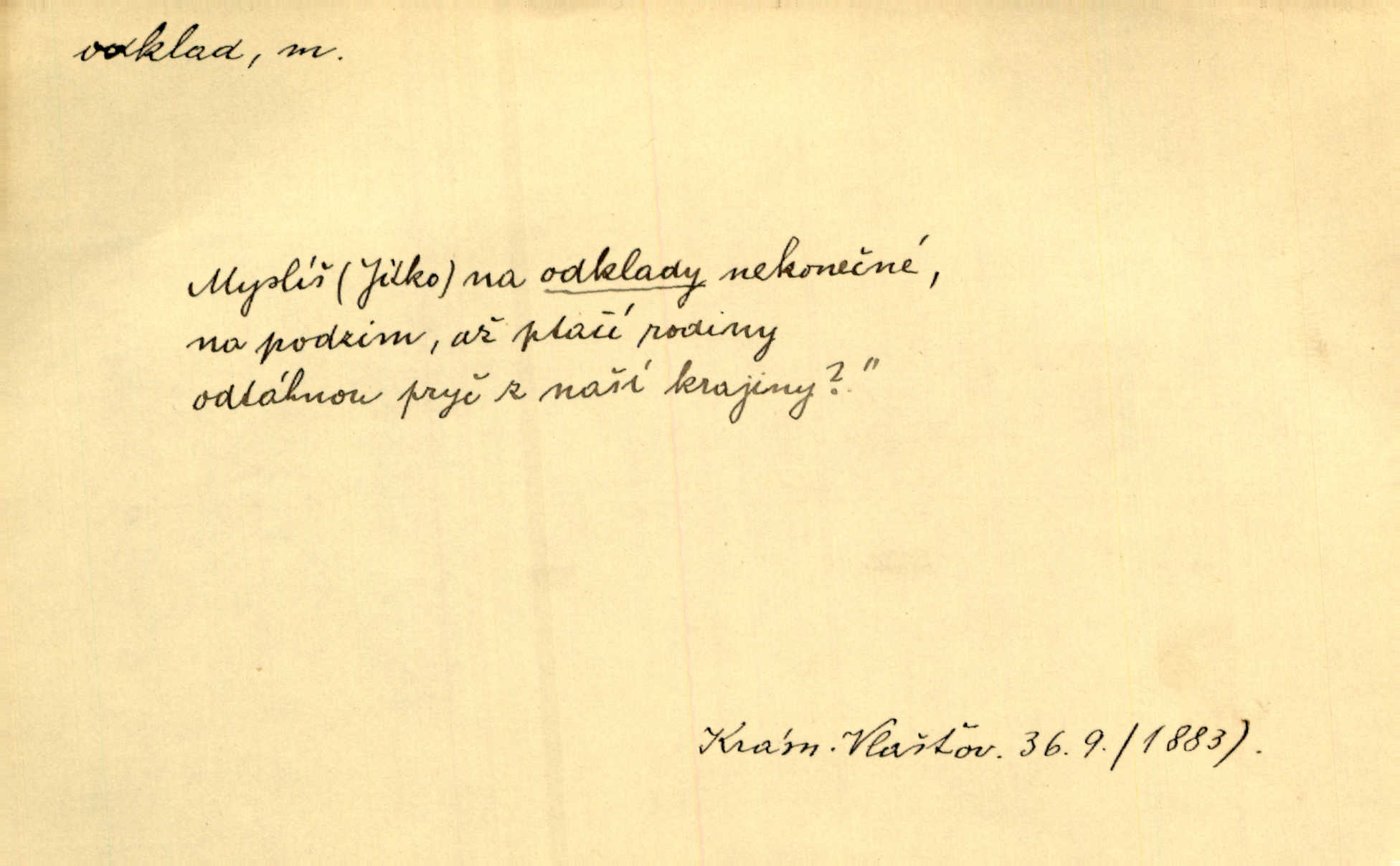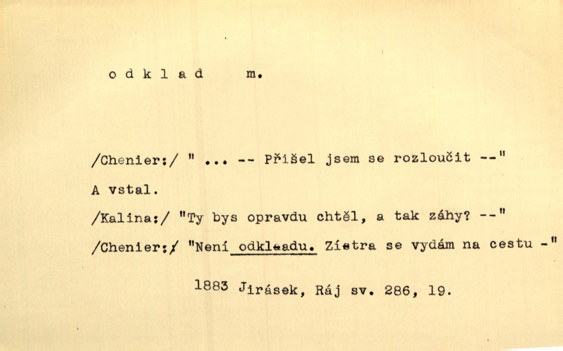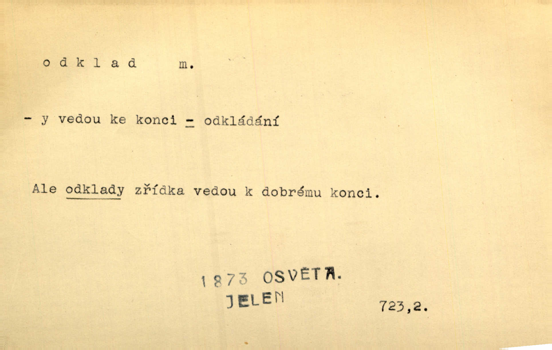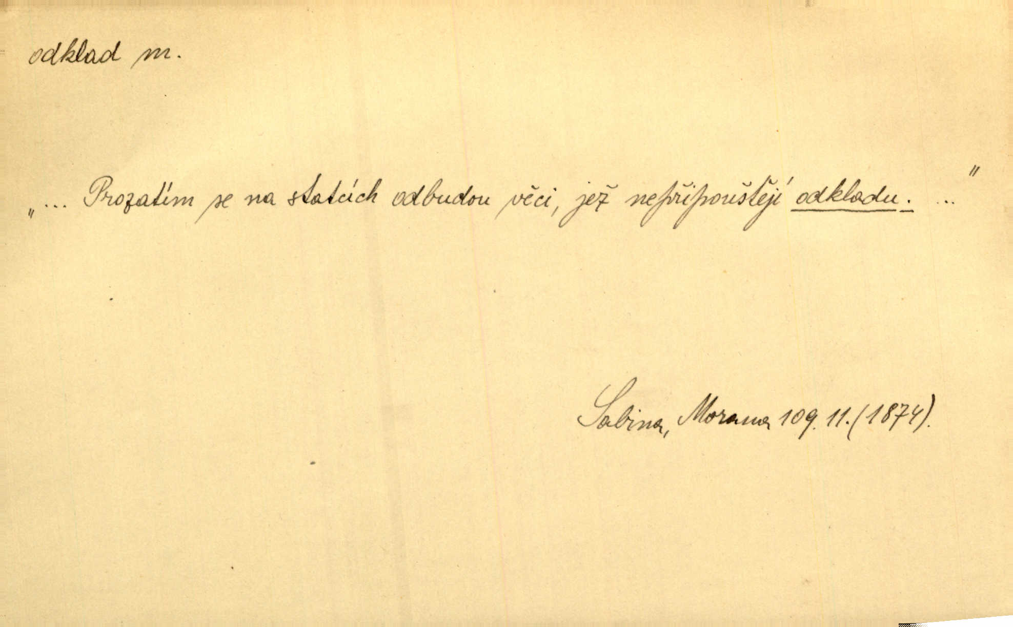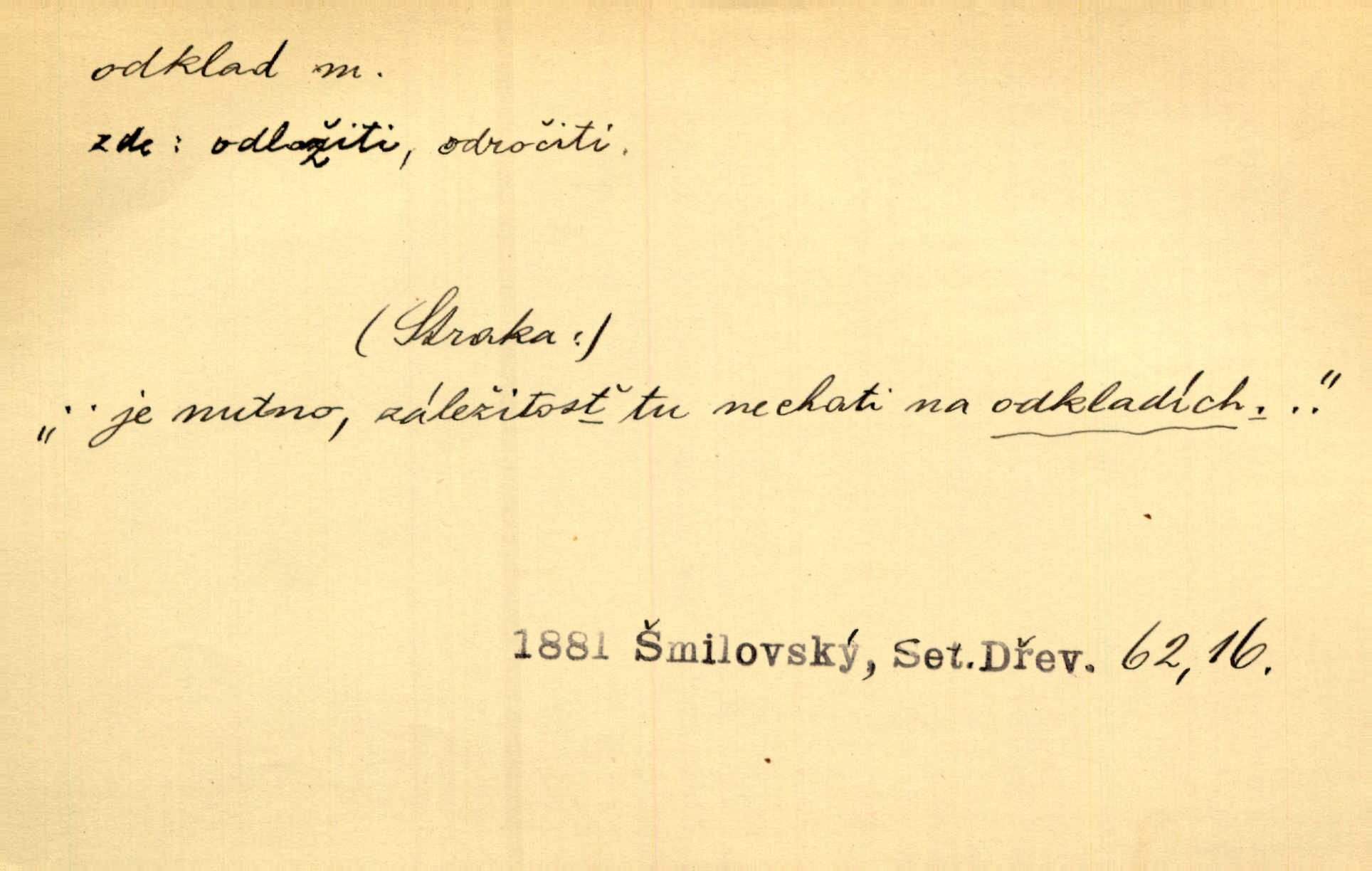 - odklad, -u m. odložení, odsunutí něčeho na pozdější dobu. Prozatím se na statcích odbudou věci, jež nepřipouštějí odkladu. Sab. Práce ta netrpí nijakého odkladu. Vlč. Soud jí [odsouzené] povolil odklad trestu. Vach. Odklad školného. Us. [Lékař k nemocnému:] „Do postele, a bez odkladu, hned.“ Jir. Vida nebezpečenství v dalším odkladu, pospíšil [opat] do Vídně. Mik. Vy jste byla dnes samý odklad! stále jste odkládala. R. Svob. Odklady zřídka vedou k dobrému konci odkládání, průtahy. Osv. Není odkladu. Zítra se vydám na cestu nelze odkládati. Jir. Vy souhlasíte, — tedy jaké odklady? Herrm. Arch. Sněm neodpověděl k žádostem, nýbrž vše ostalo na odkladu. Rez. Je nutno, záležitosť tu nechati na odkladích. Šmil. Voj. odklad nastoupení vojenské služby.