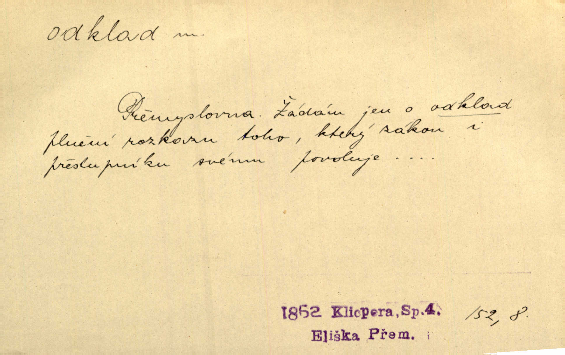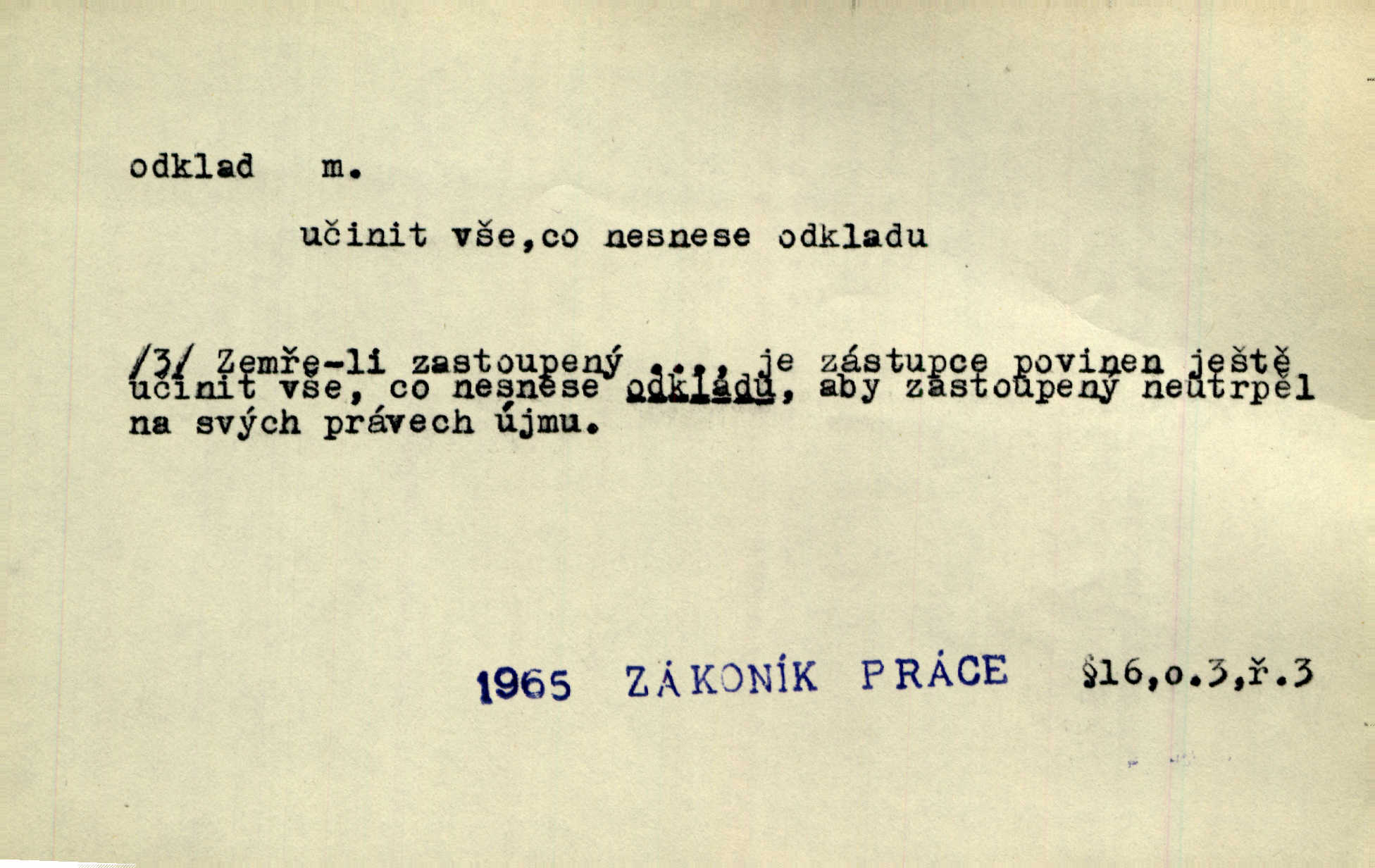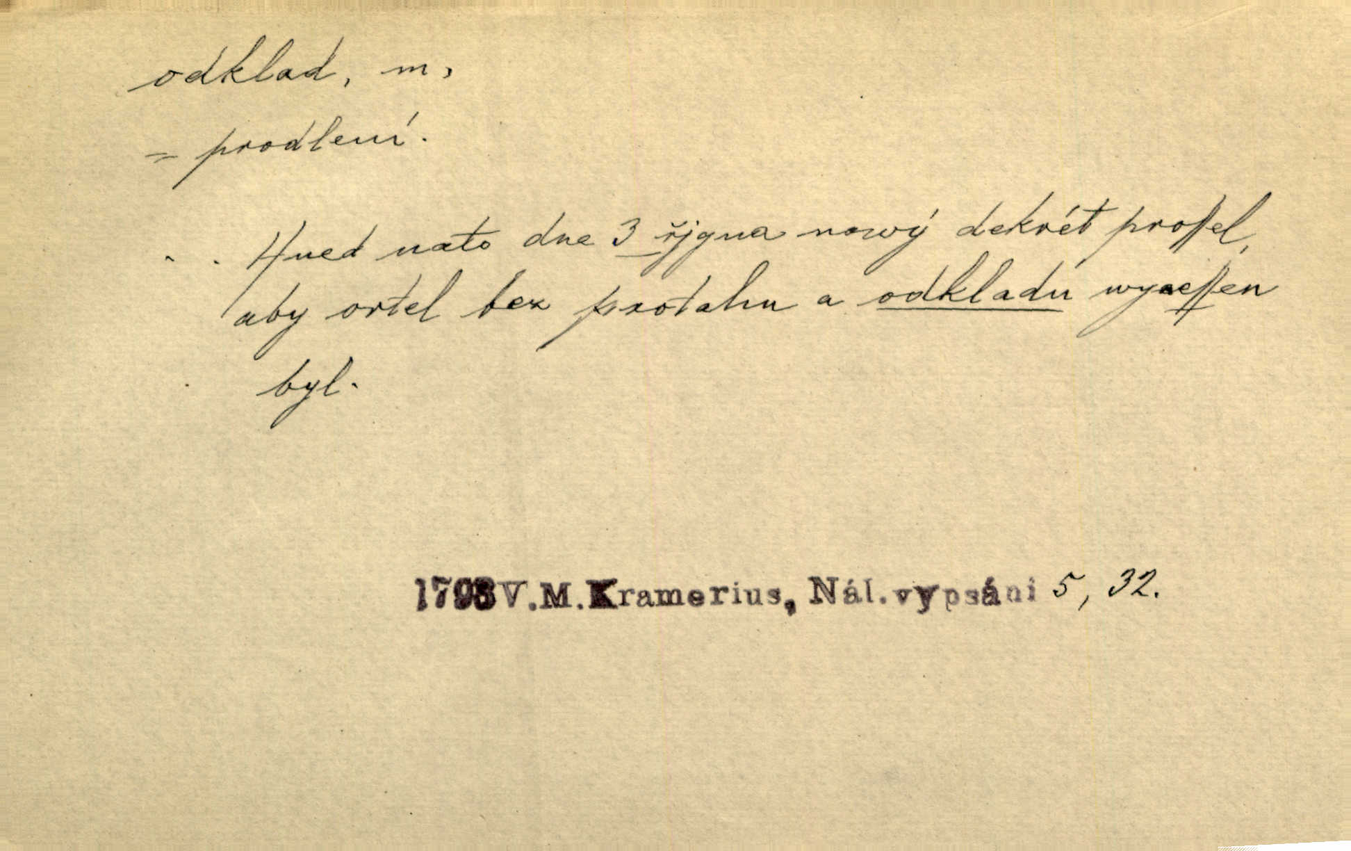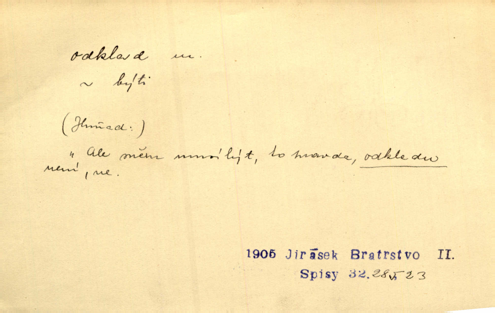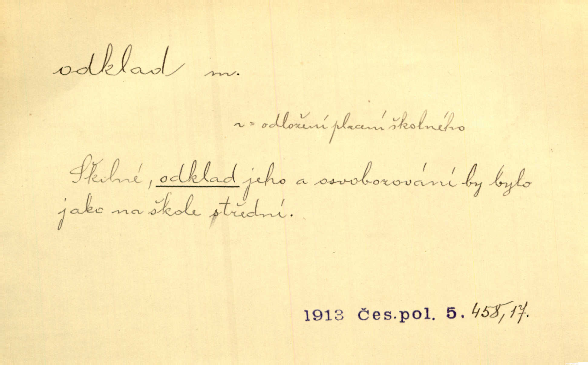 - odklad, -u m. odložení, odsunutí něčeho na pozdější dobu. Prozatím se na statcích odbudou věci, jež nepřipouštějí odkladu. Sab. Práce ta netrpí nijakého odkladu. Vlč. Soud jí [odsouzené] povolil odklad trestu. Vach. Odklad školného. Us. [Lékař k nemocnému:] „Do postele, a bez odkladu, hned.“ Jir. Vida nebezpečenství v dalším odkladu, pospíšil [opat] do Vídně. Mik. Vy jste byla dnes samý odklad! stále jste odkládala. R. Svob. Odklady zřídka vedou k dobrému konci odkládání, průtahy. Osv. Není odkladu. Zítra se vydám na cestu nelze odkládati. Jir. Vy souhlasíte, — tedy jaké odklady? Herrm. Arch. Sněm neodpověděl k žádostem, nýbrž vše ostalo na odkladu. Rez. Je nutno, záležitosť tu nechati na odkladích. Šmil. Voj. odklad nastoupení vojenské služby.