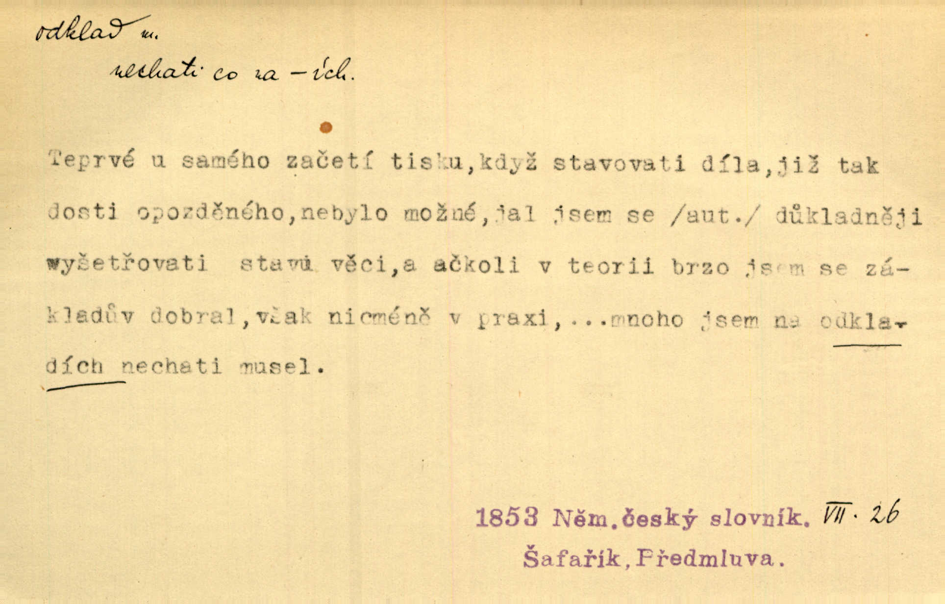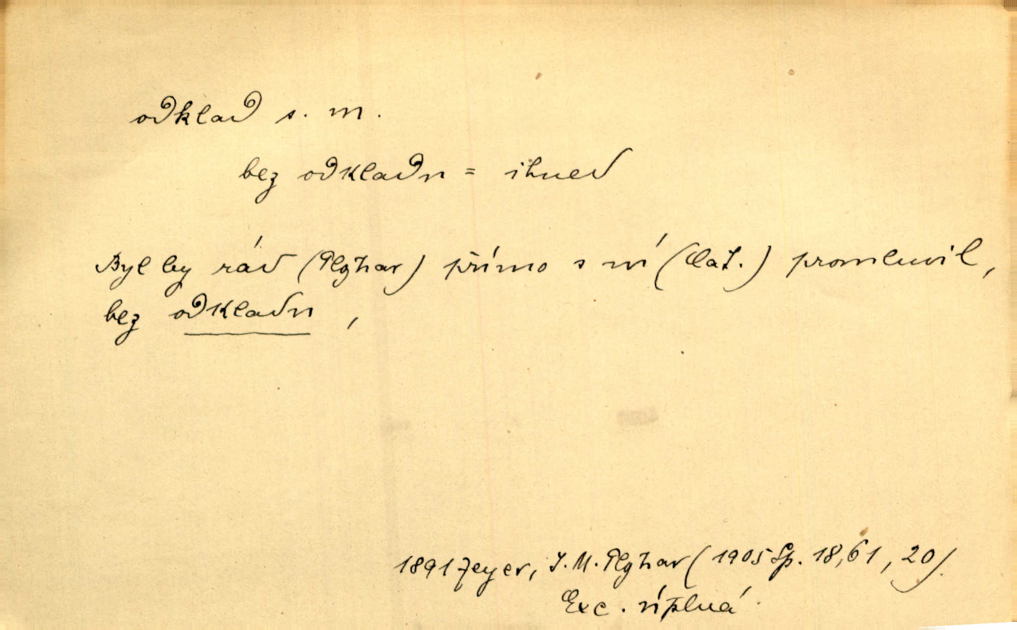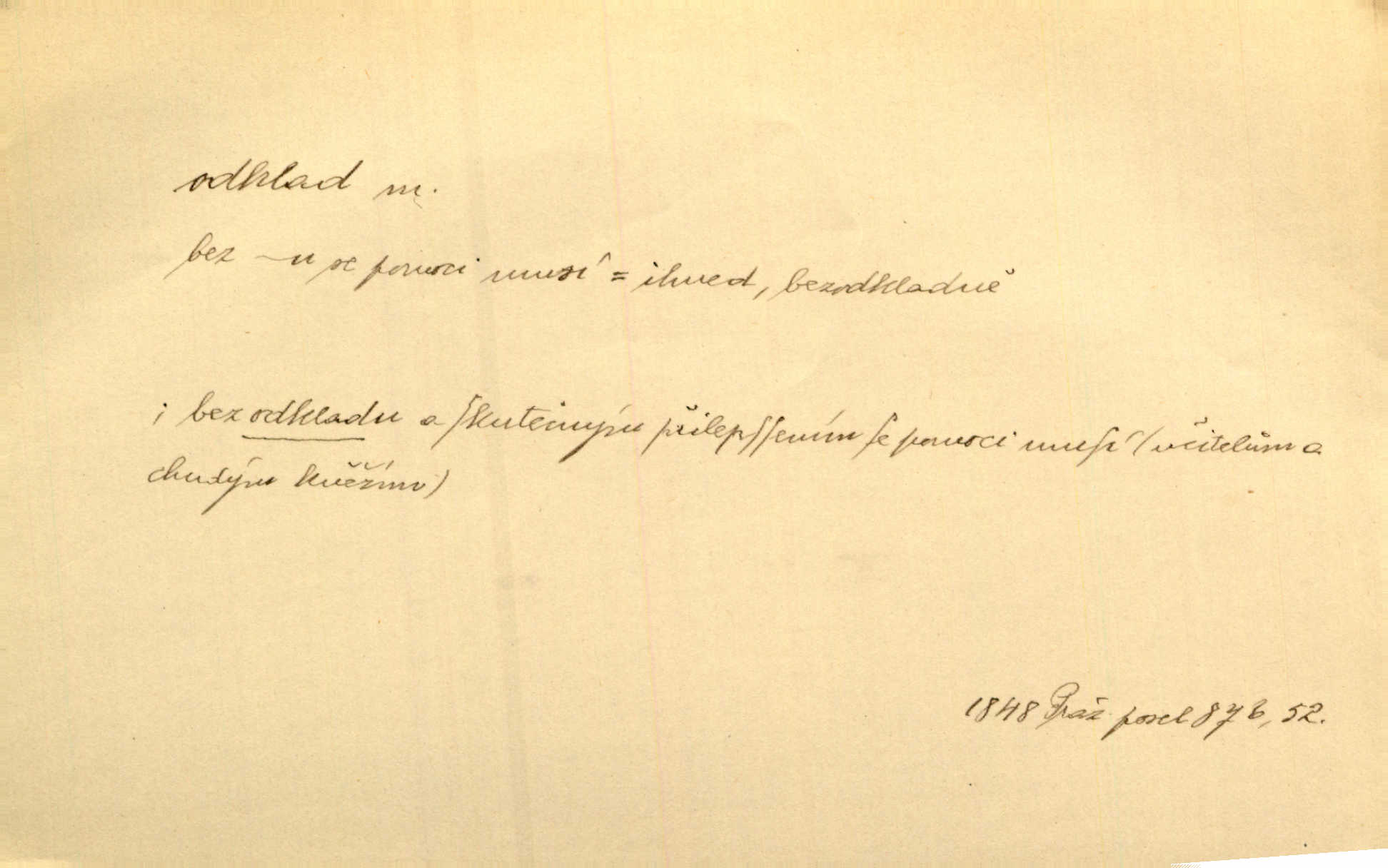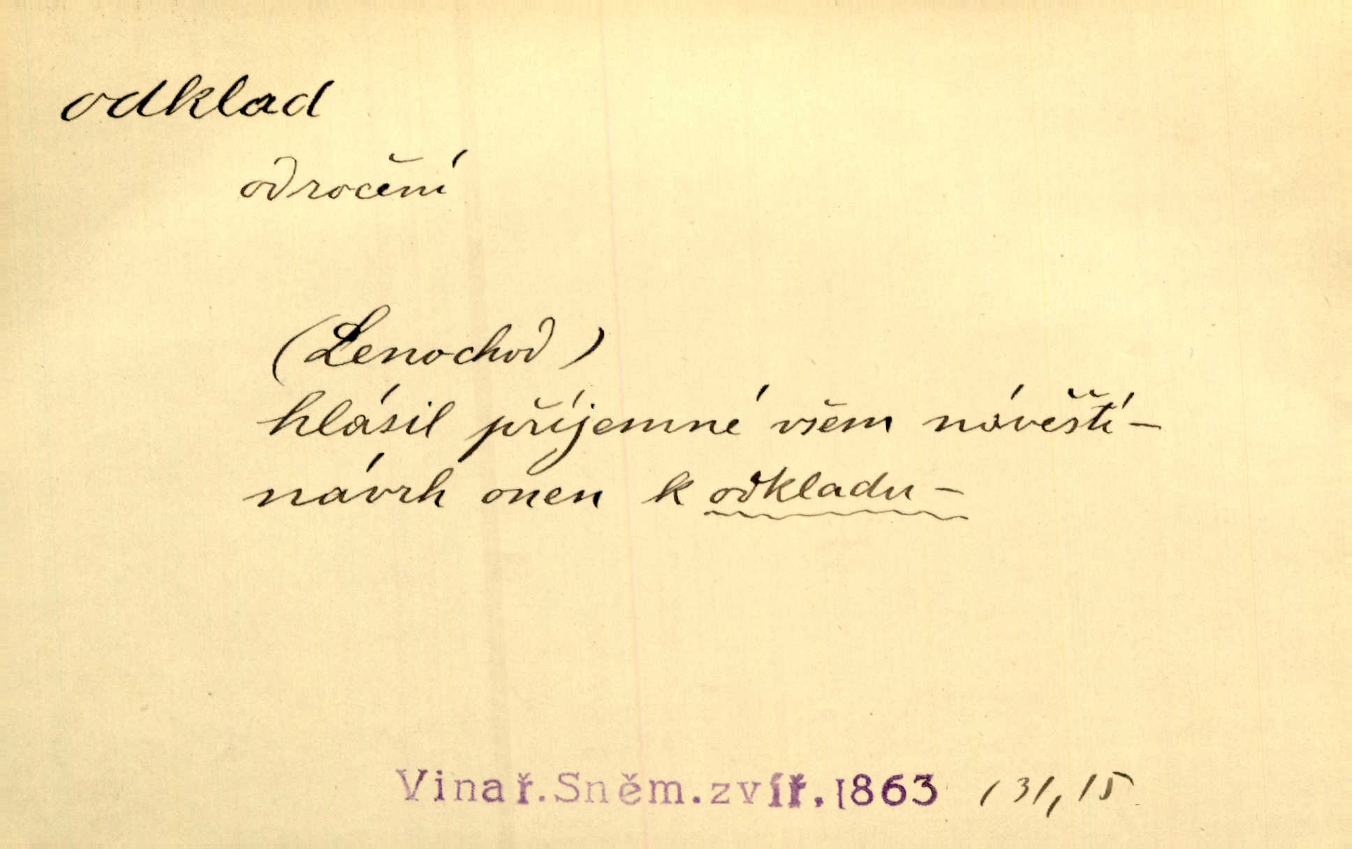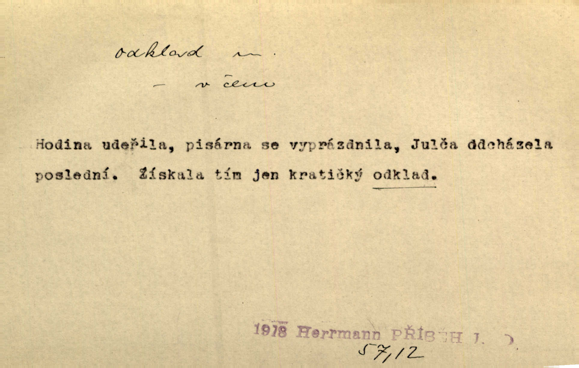 - odklad, -u m. odložení, odsunutí něčeho na pozdější dobu. Prozatím se na statcích odbudou věci, jež nepřipouštějí odkladu. Sab. Práce ta netrpí nijakého odkladu. Vlč. Soud jí [odsouzené] povolil odklad trestu. Vach. Odklad školného. Us. [Lékař k nemocnému:] „Do postele, a bez odkladu, hned.“ Jir. Vida nebezpečenství v dalším odkladu, pospíšil [opat] do Vídně. Mik. Vy jste byla dnes samý odklad! stále jste odkládala. R. Svob. Odklady zřídka vedou k dobrému konci odkládání, průtahy. Osv. Není odkladu. Zítra se vydám na cestu nelze odkládati. Jir. Vy souhlasíte, — tedy jaké odklady? Herrm. Arch. Sněm neodpověděl k žádostem, nýbrž vše ostalo na odkladu. Rez. Je nutno, záležitosť tu nechati na odkladích. Šmil. Voj. odklad nastoupení vojenské služby.