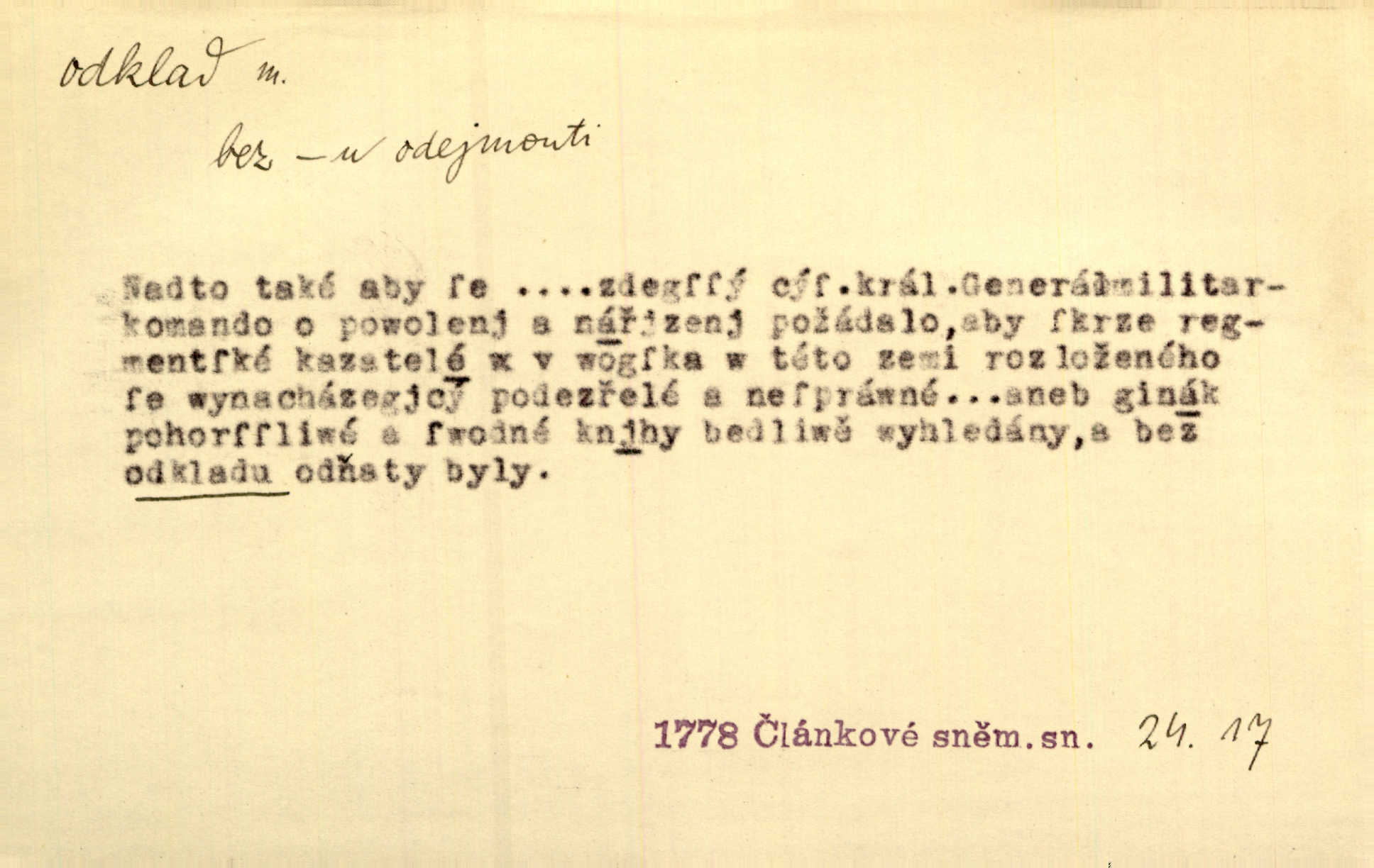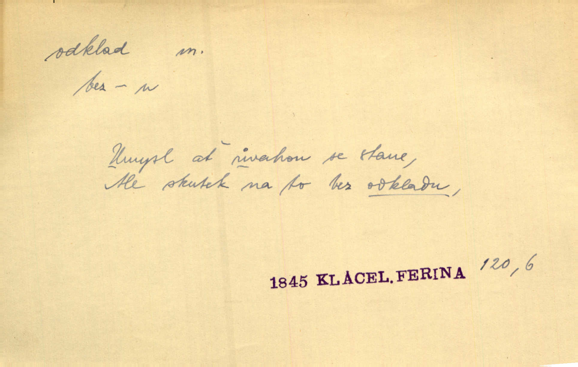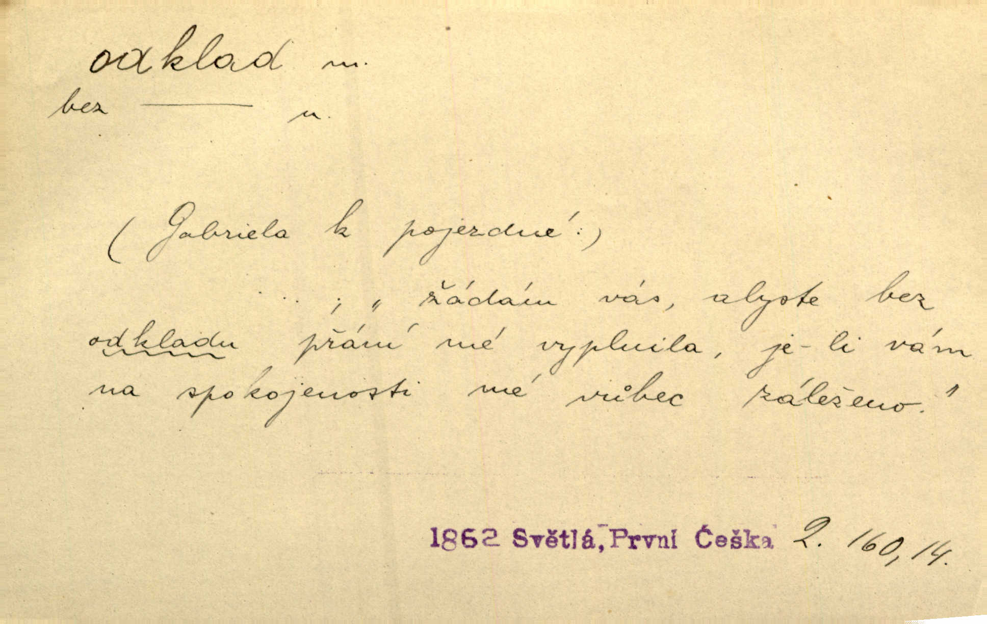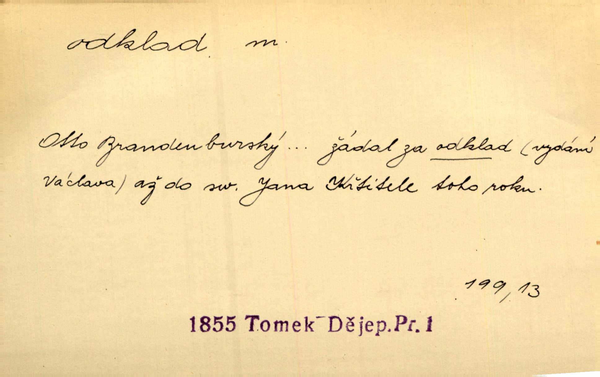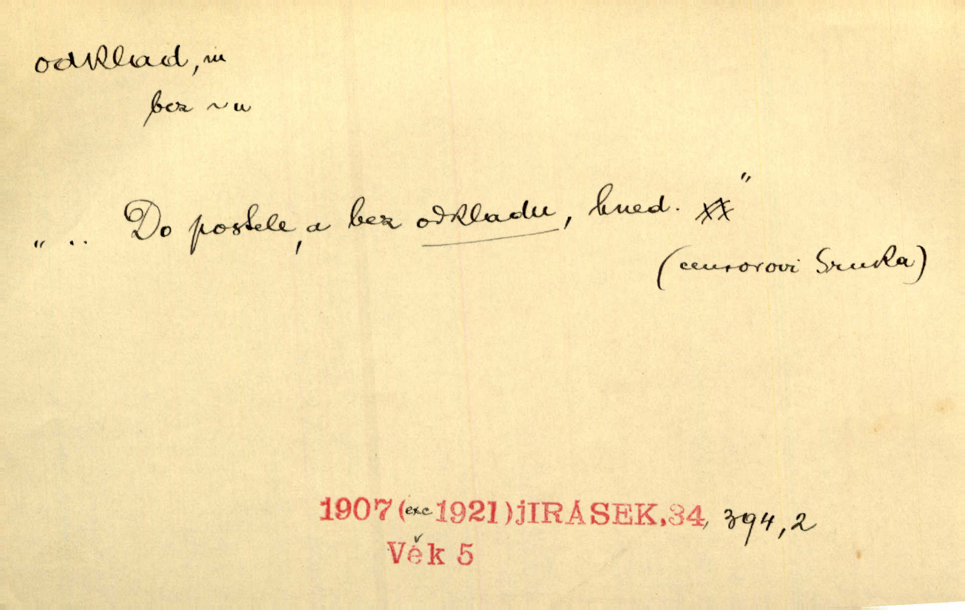 - odklad, -u m. odložení, odsunutí něčeho na pozdější dobu. Prozatím se na statcích odbudou věci, jež nepřipouštějí odkladu. Sab. Práce ta netrpí nijakého odkladu. Vlč. Soud jí [odsouzené] povolil odklad trestu. Vach. Odklad školného. Us. [Lékař k nemocnému:] „Do postele, a bez odkladu, hned.“ Jir. Vida nebezpečenství v dalším odkladu, pospíšil [opat] do Vídně. Mik. Vy jste byla dnes samý odklad! stále jste odkládala. R. Svob. Odklady zřídka vedou k dobrému konci odkládání, průtahy. Osv. Není odkladu. Zítra se vydám na cestu nelze odkládati. Jir. Vy souhlasíte, — tedy jaké odklady? Herrm. Arch. Sněm neodpověděl k žádostem, nýbrž vše ostalo na odkladu. Rez. Je nutno, záležitosť tu nechati na odkladích. Šmil. Voj. odklad nastoupení vojenské služby.