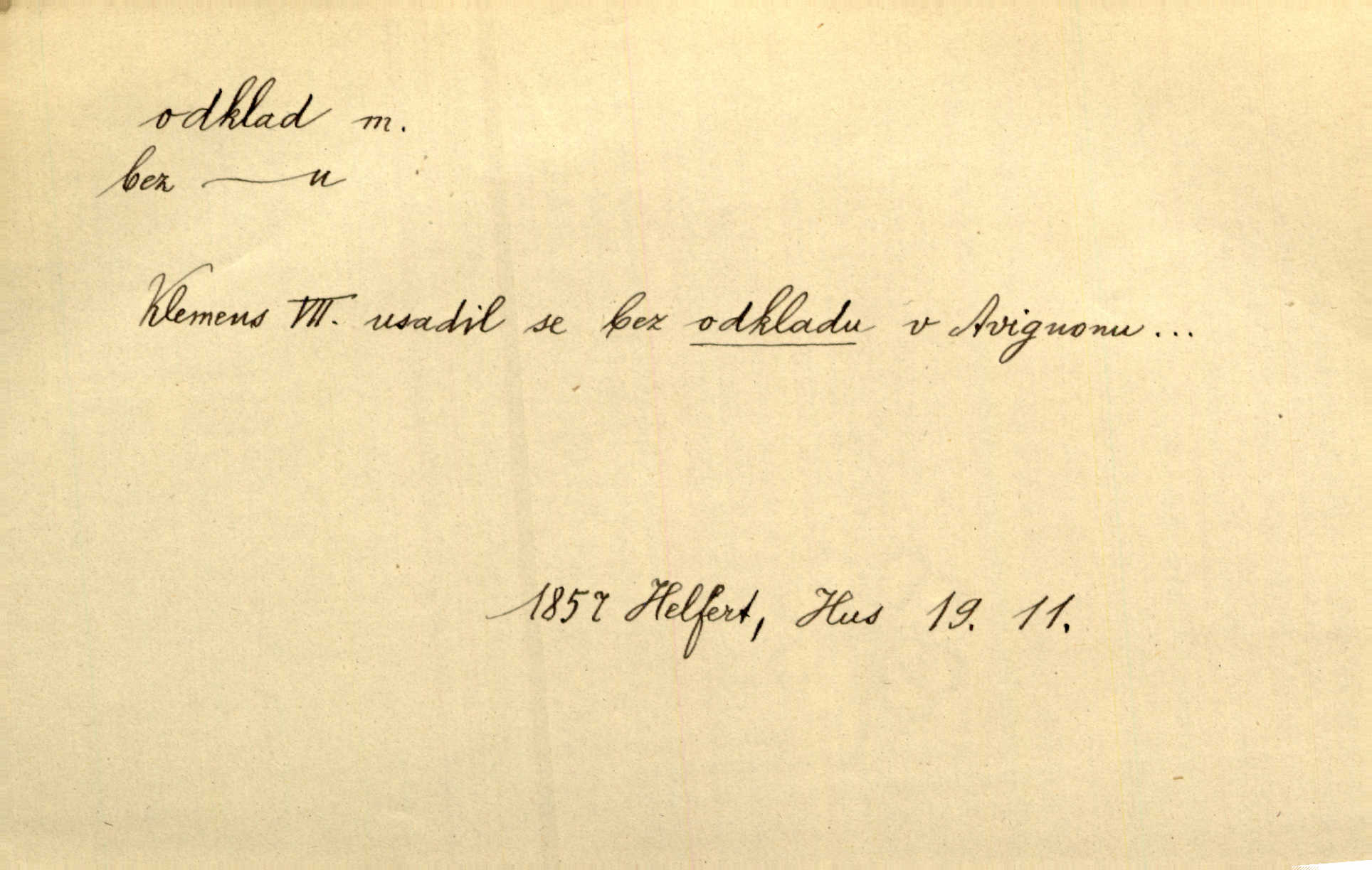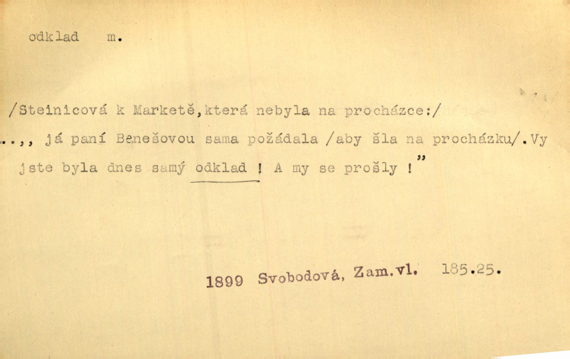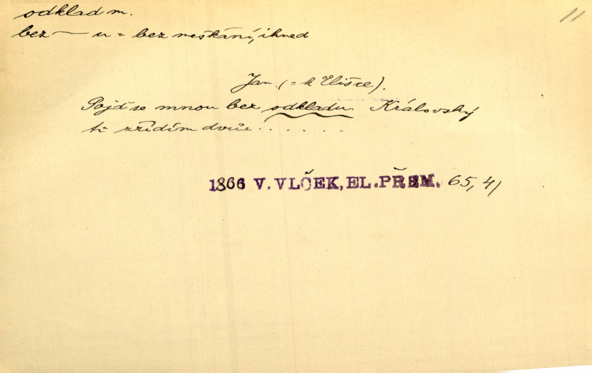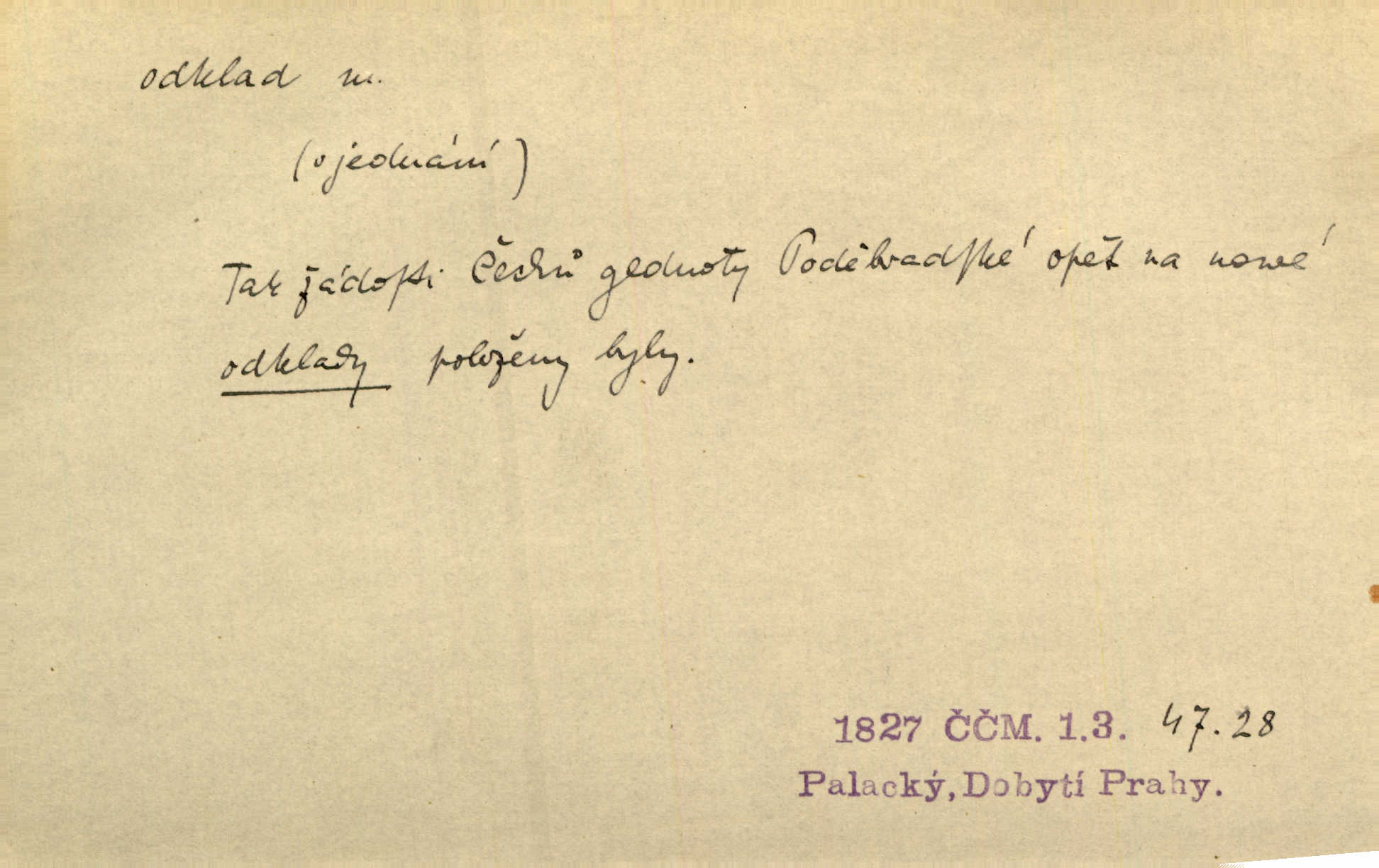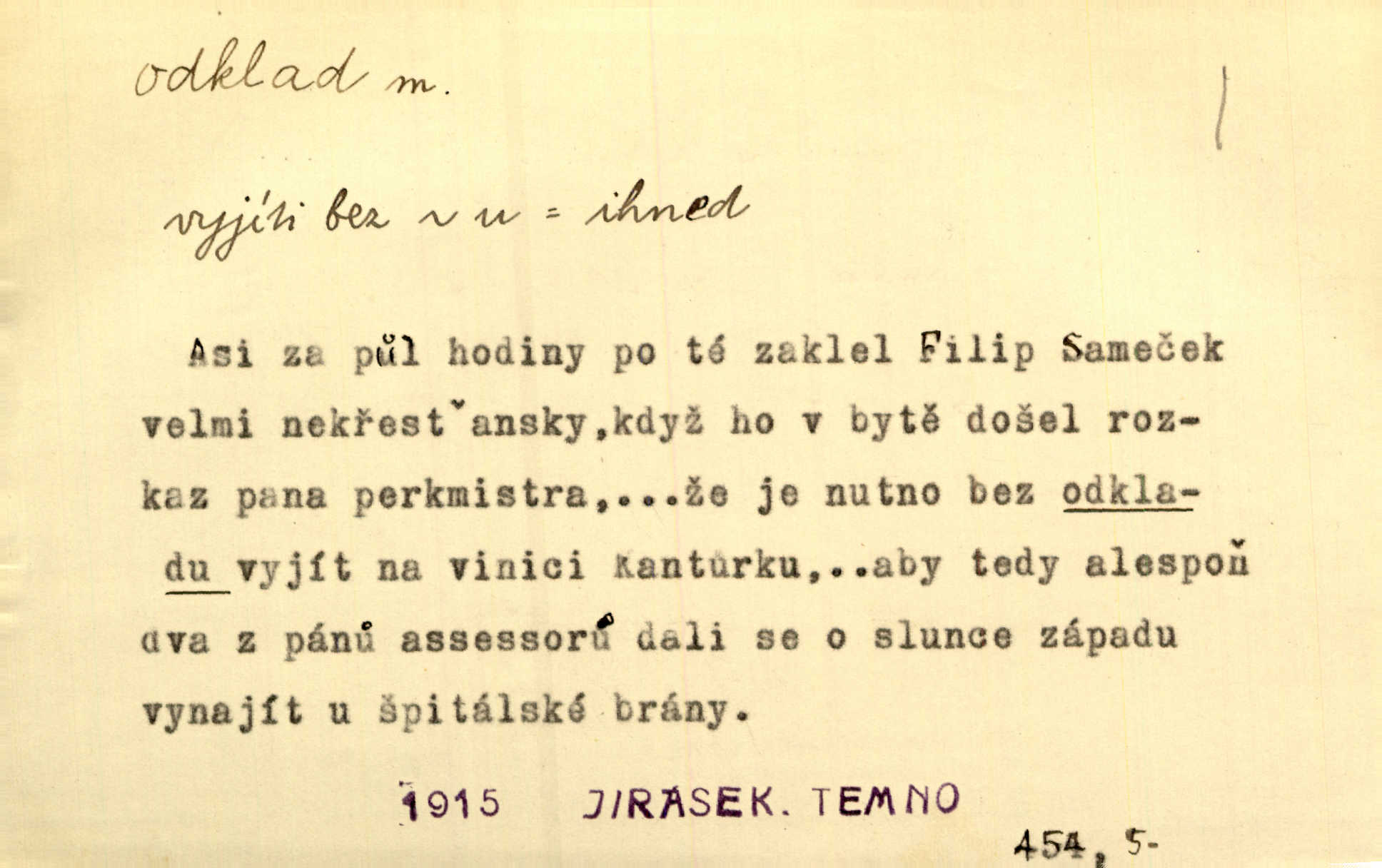 - odklad, -u m. odložení, odsunutí něčeho na pozdější dobu. Prozatím se na statcích odbudou věci, jež nepřipouštějí odkladu. Sab. Práce ta netrpí nijakého odkladu. Vlč. Soud jí [odsouzené] povolil odklad trestu. Vach. Odklad školného. Us. [Lékař k nemocnému:] „Do postele, a bez odkladu, hned.“ Jir. Vida nebezpečenství v dalším odkladu, pospíšil [opat] do Vídně. Mik. Vy jste byla dnes samý odklad! stále jste odkládala. R. Svob. Odklady zřídka vedou k dobrému konci odkládání, průtahy. Osv. Není odkladu. Zítra se vydám na cestu nelze odkládati. Jir. Vy souhlasíte, — tedy jaké odklady? Herrm. Arch. Sněm neodpověděl k žádostem, nýbrž vše ostalo na odkladu. Rez. Je nutno, záležitosť tu nechati na odkladích. Šmil. Voj. odklad nastoupení vojenské služby.