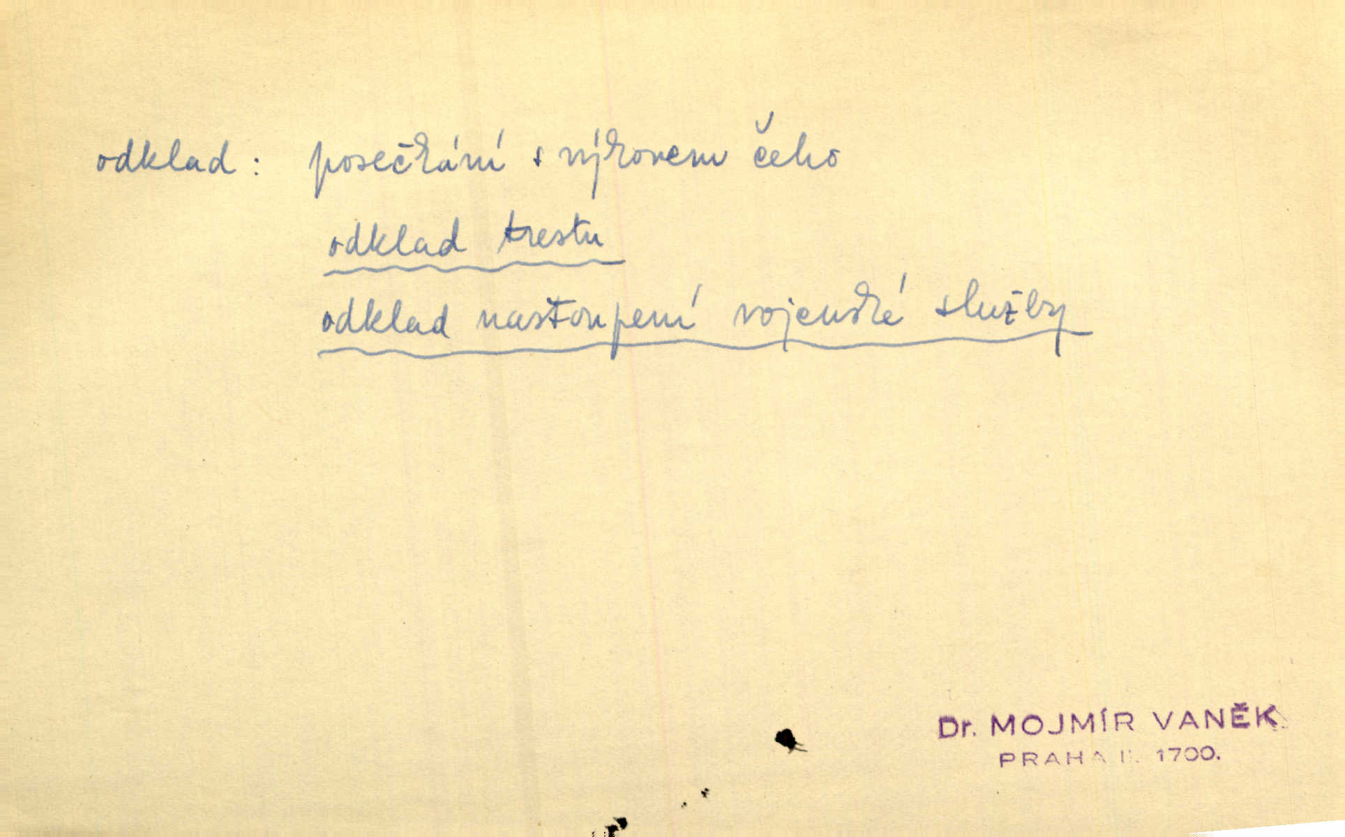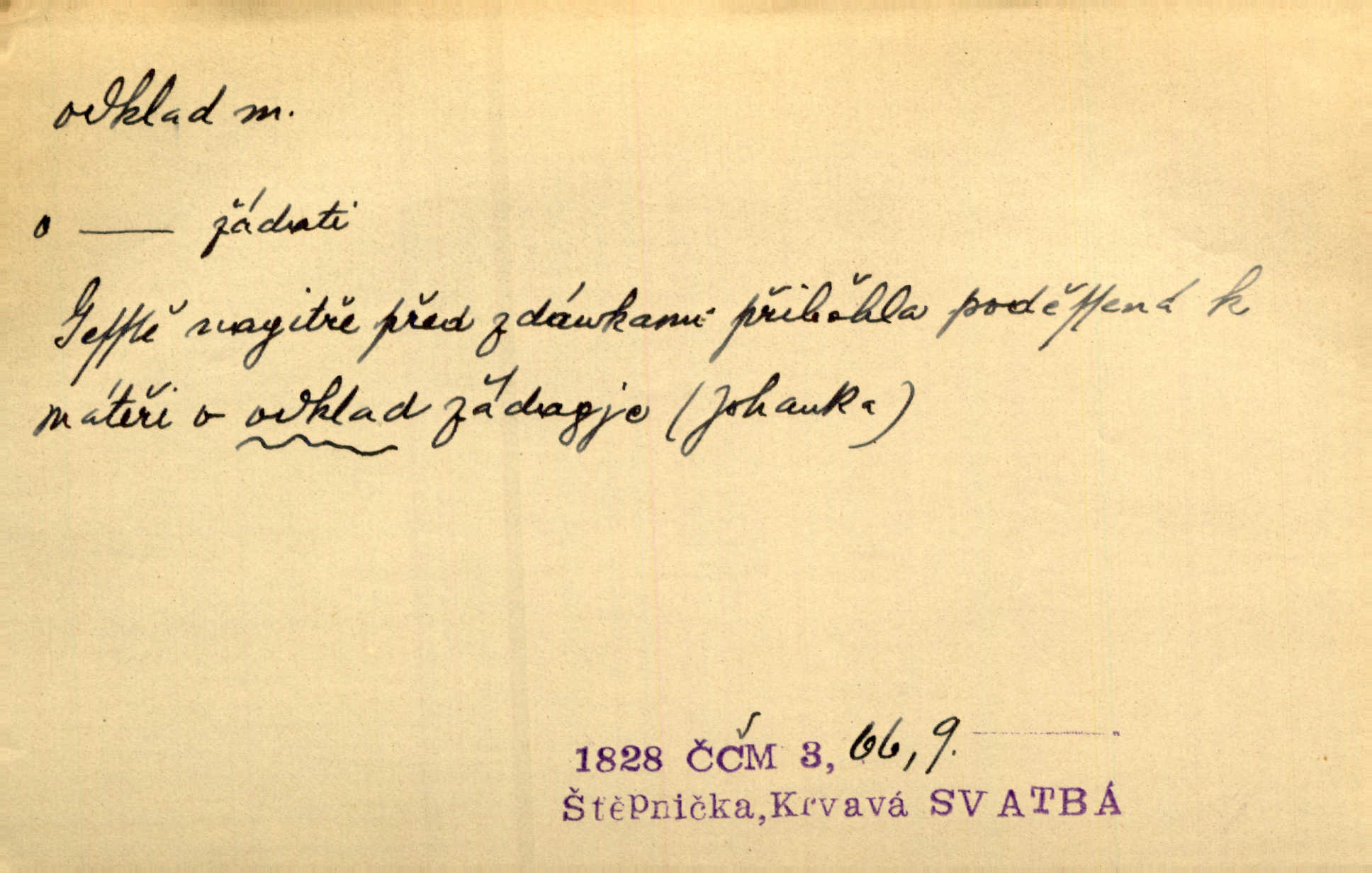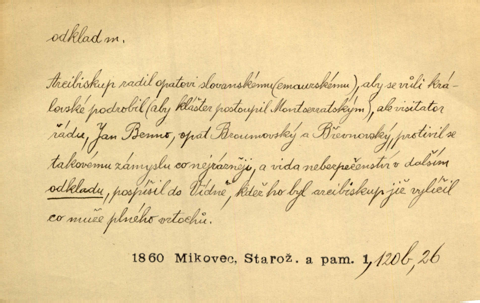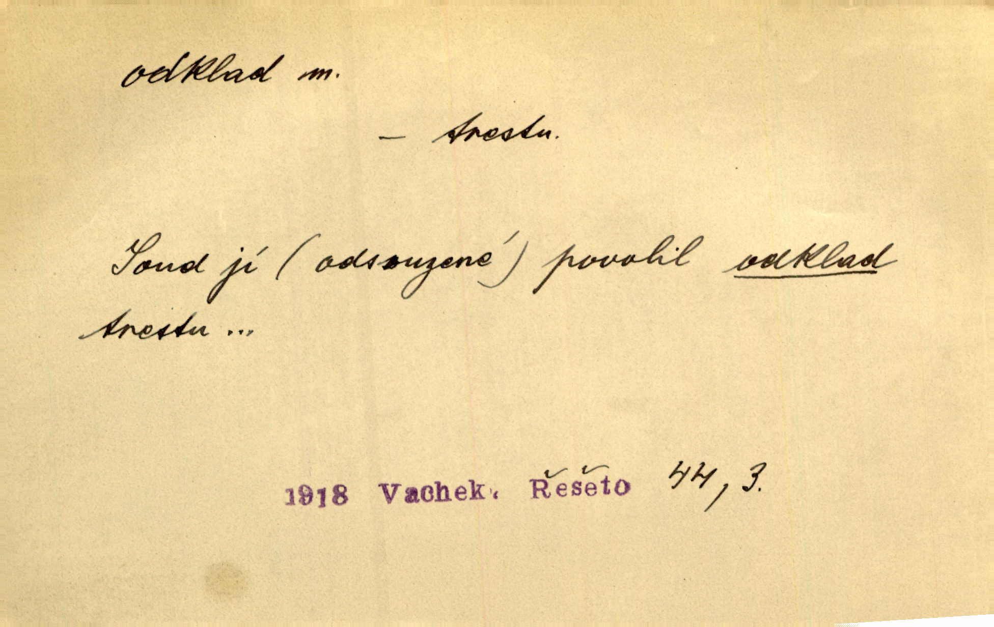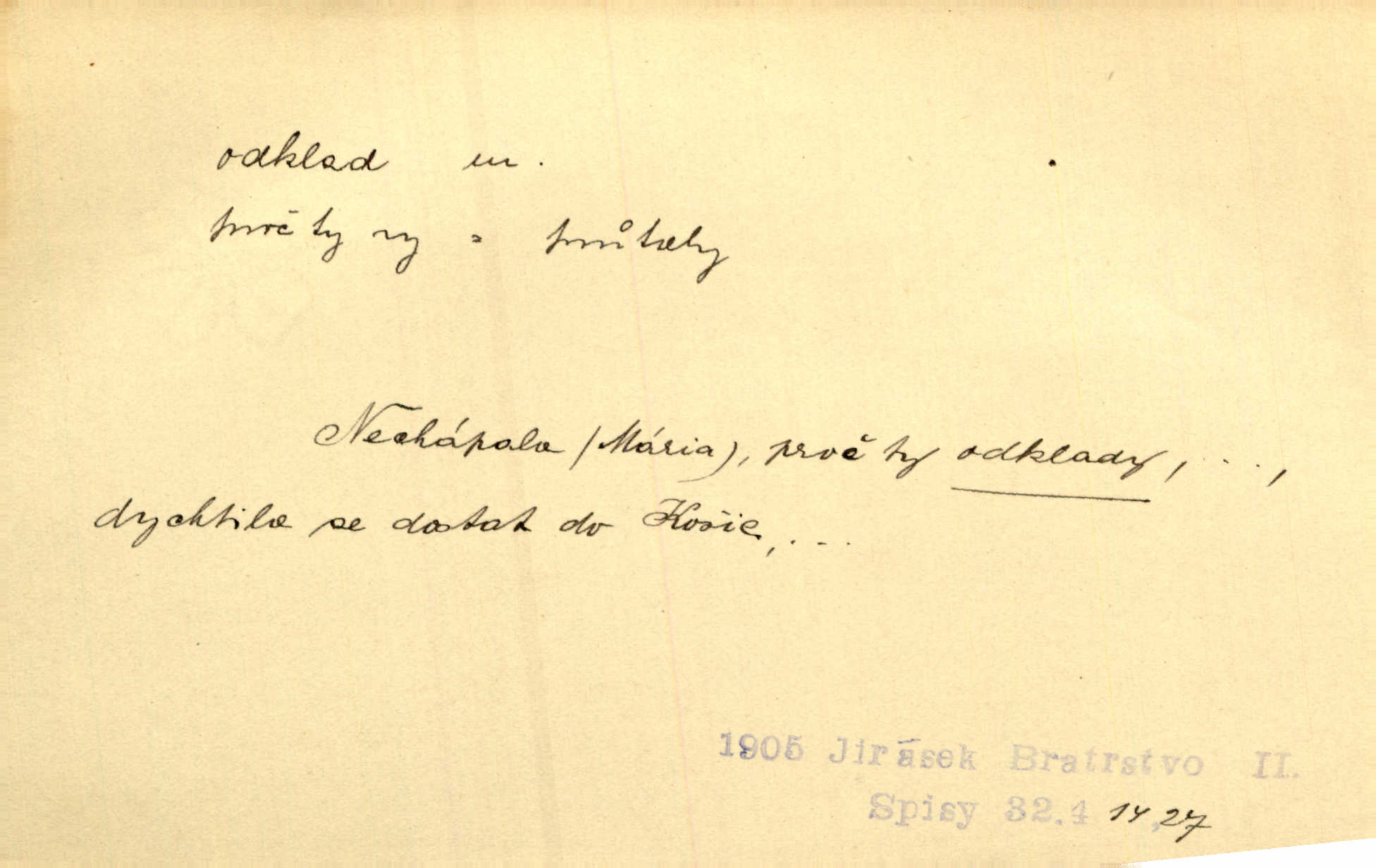- odklad, -u m. odložení, odsunutí něčeho na pozdější dobu. Prozatím se na statcích odbudou věci, jež nepřipouštějí odkladu. Sab. Práce ta netrpí nijakého odkladu. Vlč. Soud jí [odsouzené] povolil odklad trestu. Vach. Odklad školného. Us. [Lékař k nemocnému:] „Do postele, a bez odkladu, hned.“ Jir. Vida nebezpečenství v dalším odkladu, pospíšil [opat] do Vídně. Mik. Vy jste byla dnes samý odklad! stále jste odkládala. R. Svob. Odklady zřídka vedou k dobrému konci odkládání, průtahy. Osv. Není odkladu. Zítra se vydám na cestu nelze odkládati. Jir. Vy souhlasíte, — tedy jaké odklady? Herrm. Arch. Sněm neodpověděl k žádostem, nýbrž vše ostalo na odkladu. Rez. Je nutno, záležitosť tu nechati na odkladích. Šmil. Voj. odklad nastoupení vojenské služby.