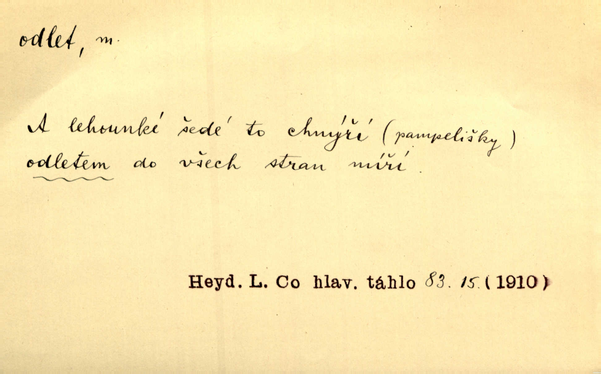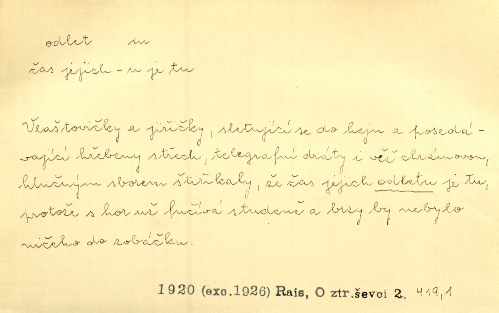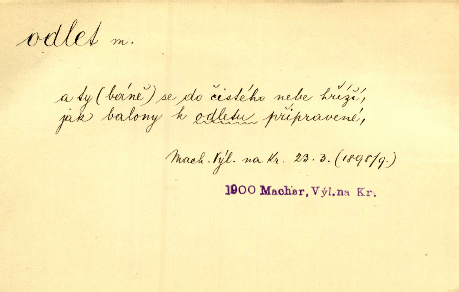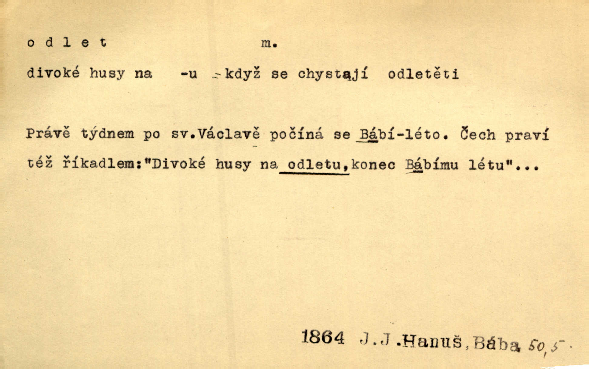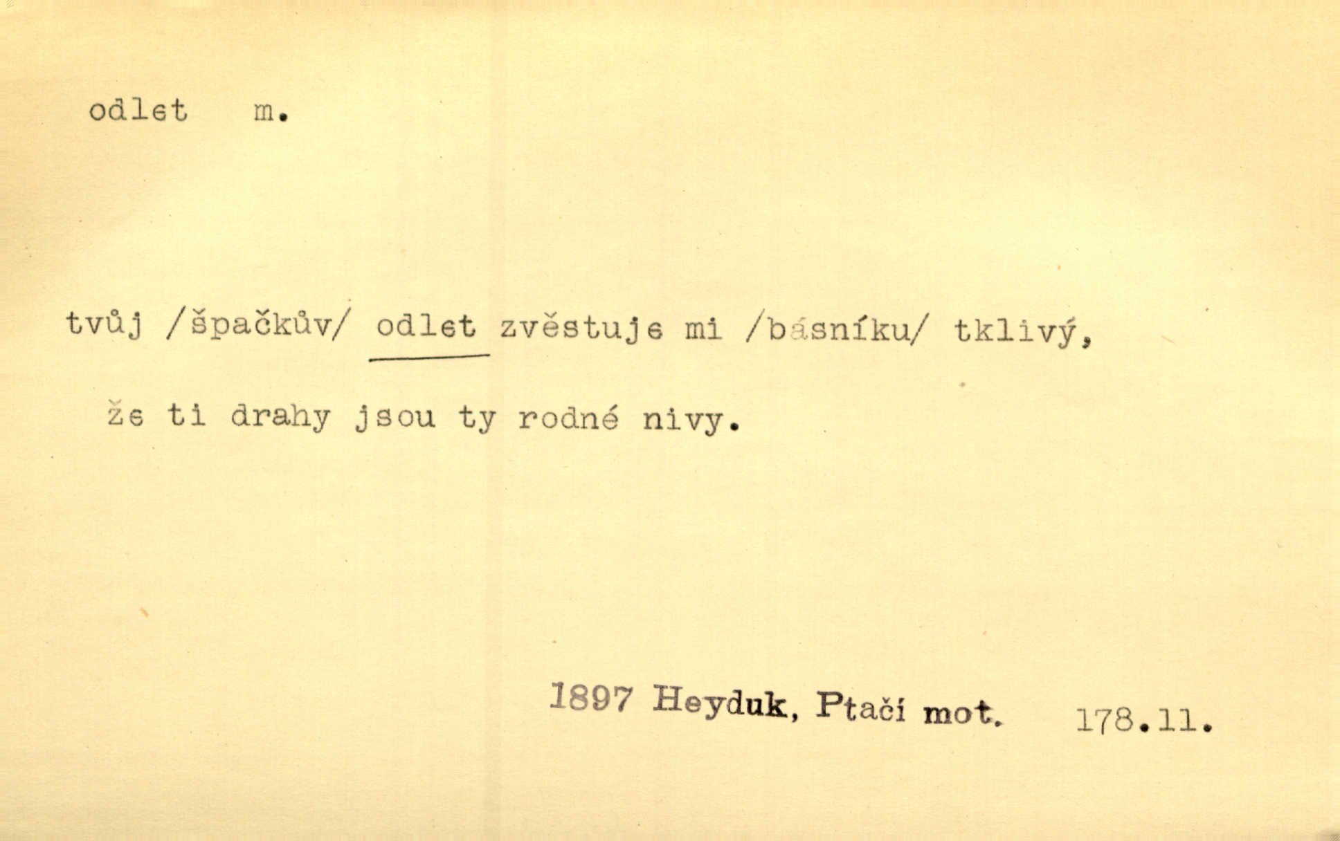- odlet, -u m. odletění, odletování. Divoké husy na odletu, konec i babímu létu. Čel. Dívali jsme se na přípravy vlaštovek k odletu. Herb. Mílová otevřela okno, „aby duše [babiččina] volnost měla k odletu“. Něm. Let. start, odletění. D Expr. odchod. Myslil jsem na klopotný vír života, na péči starých a lehký odlet mladých odchod dětí z domu do ciziny. Rais. Viktora, chystajíc se k odletu z domova, ostaví tam Hedviku samotnou. Herrm.