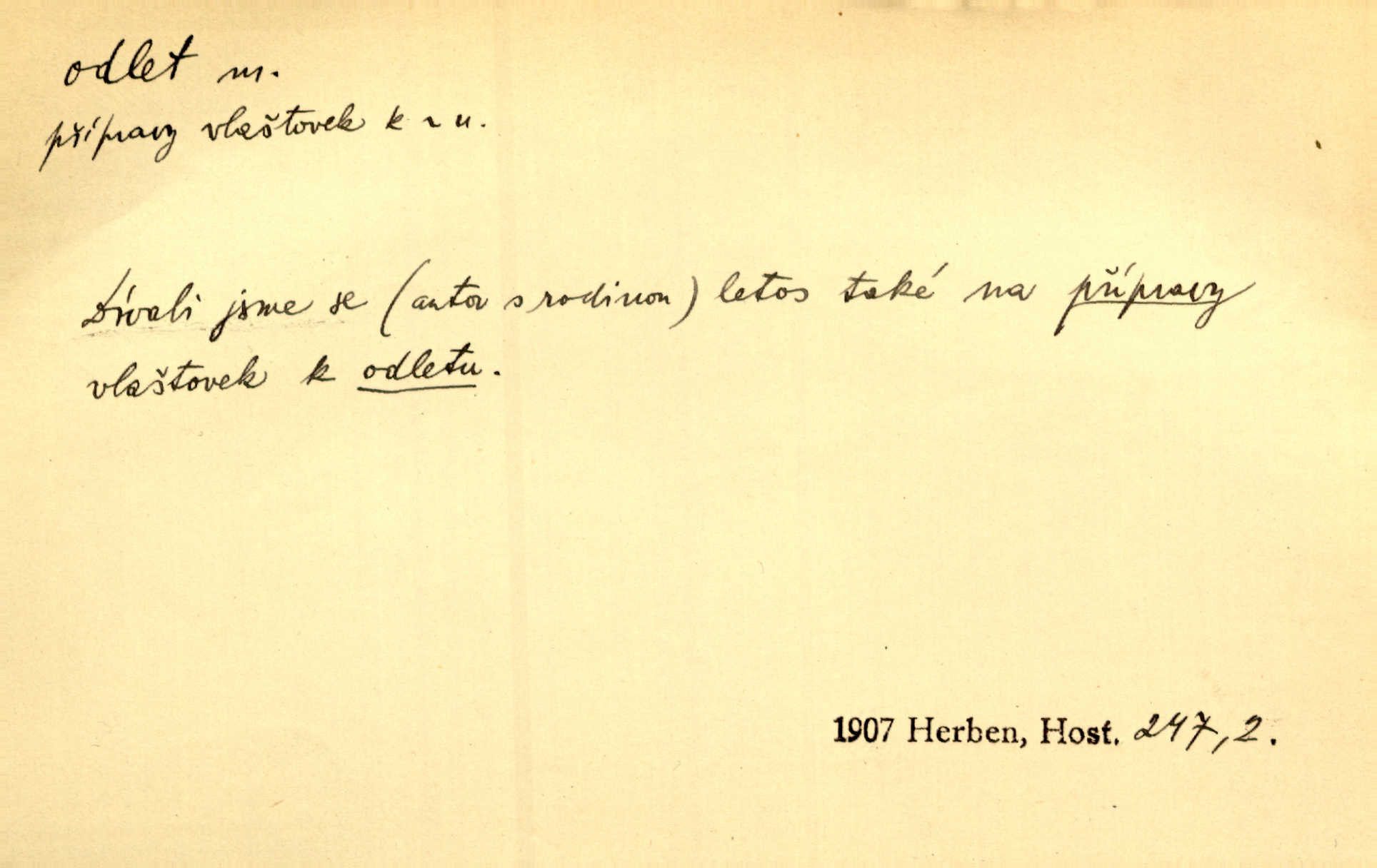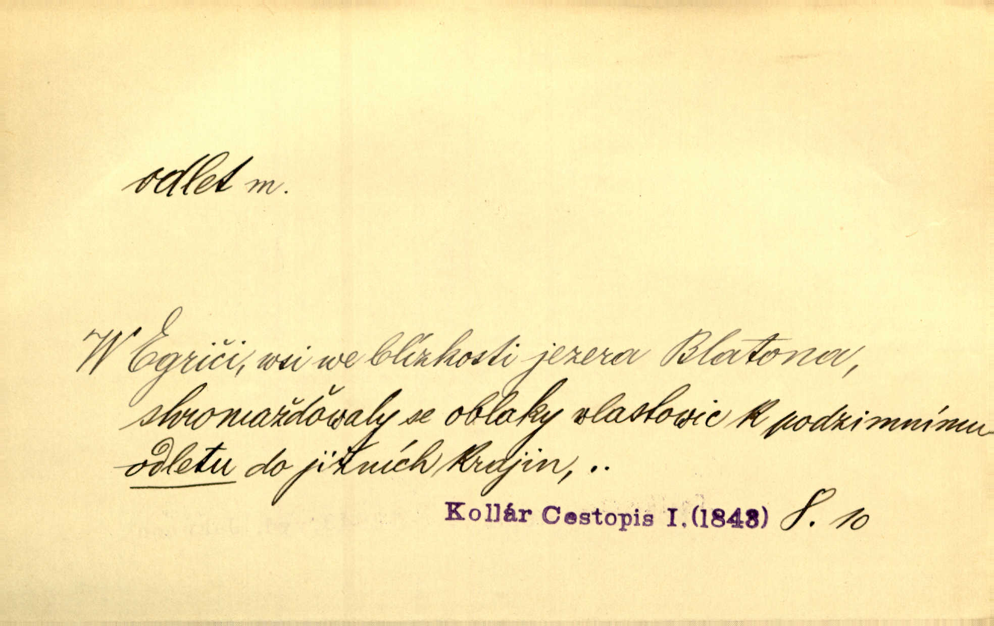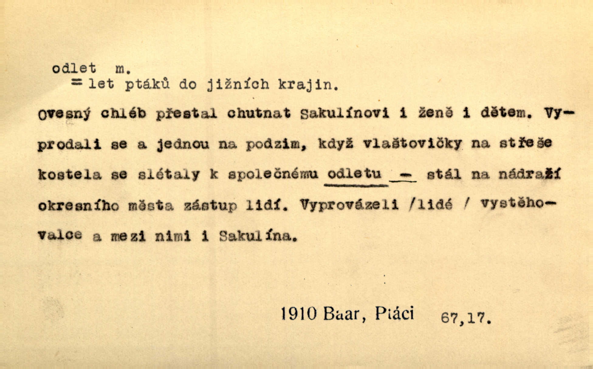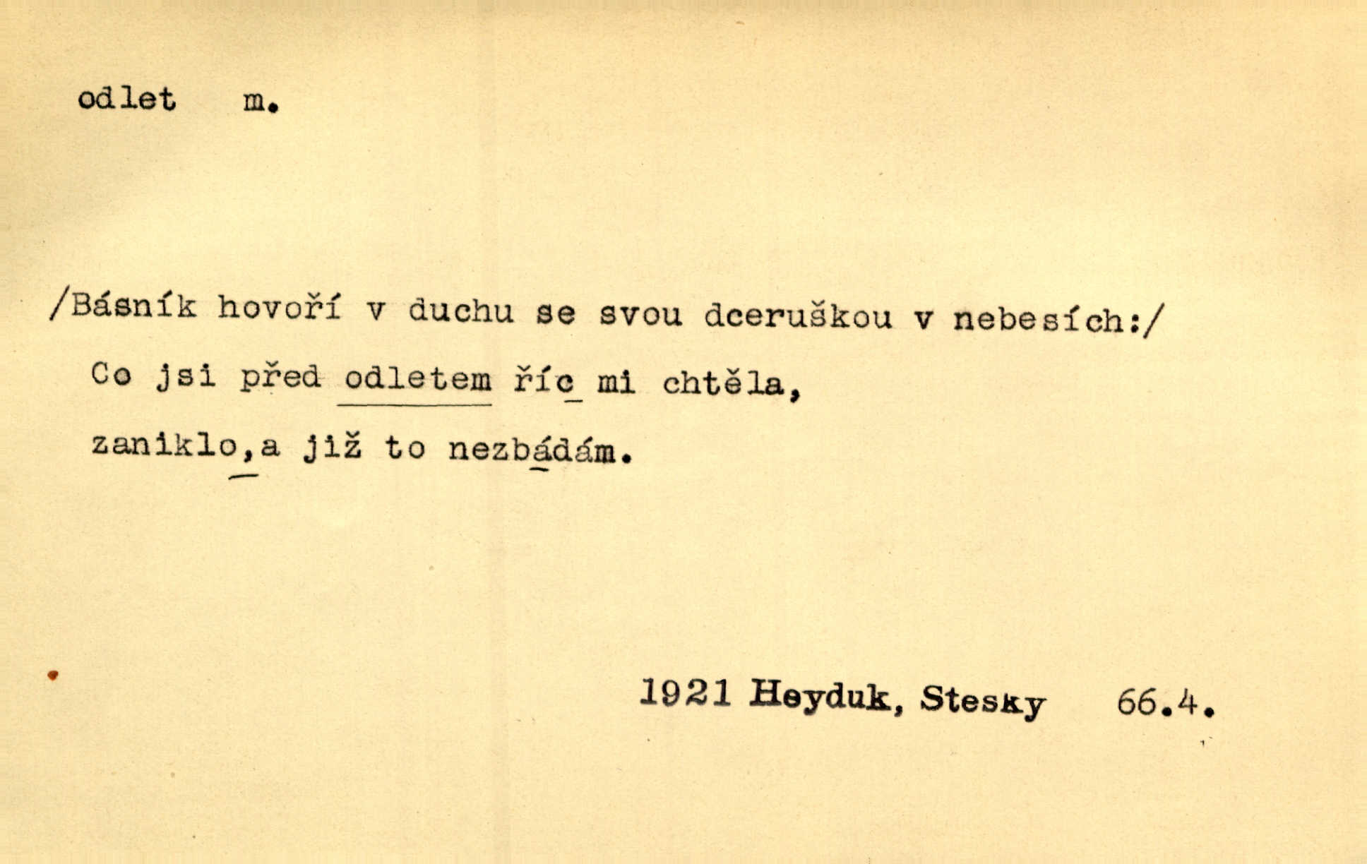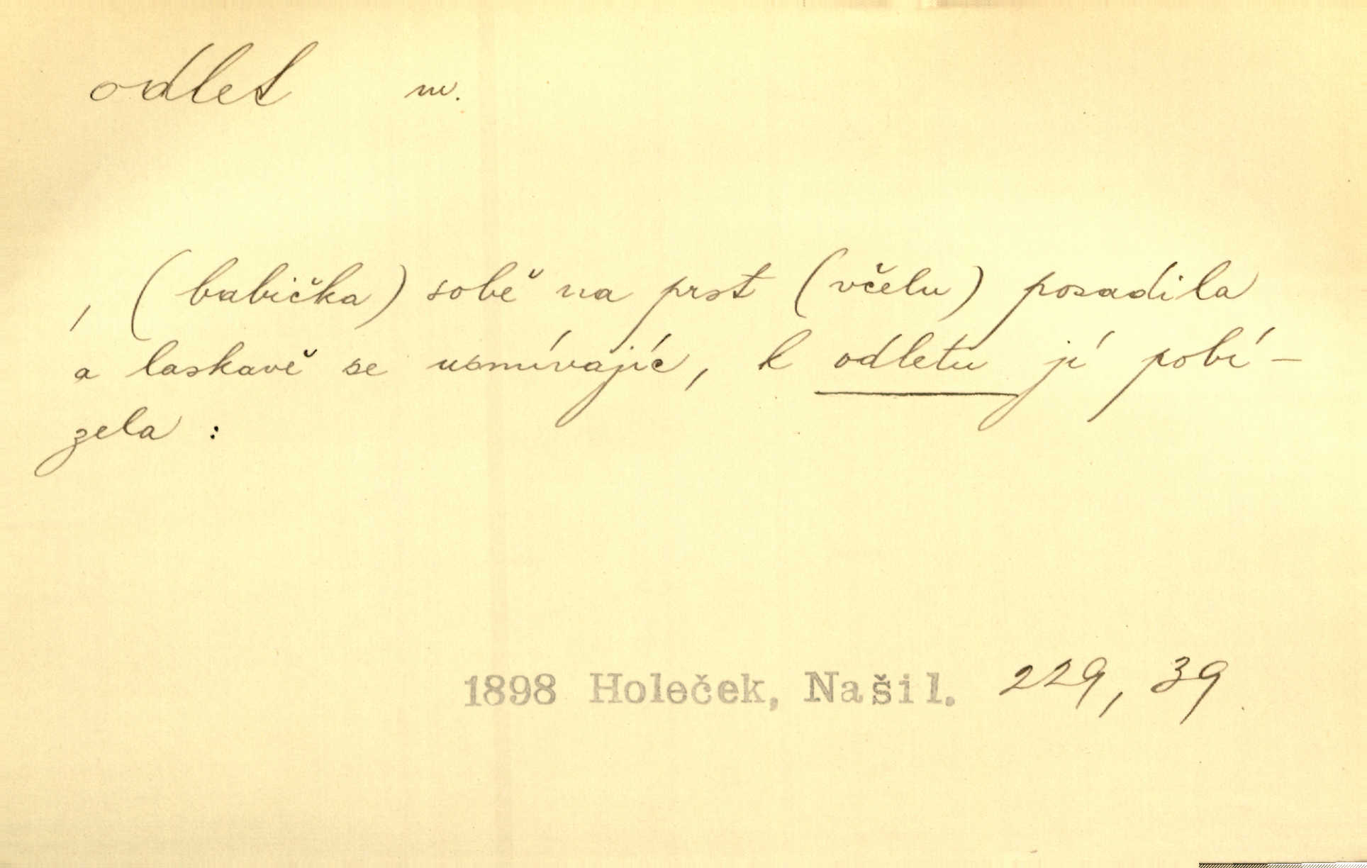 - odlet, -u m. odletění, odletování. Divoké husy na odletu, konec i babímu létu. Čel. Dívali jsme se na přípravy vlaštovek k odletu. Herb. Mílová otevřela okno, „aby duše [babiččina] volnost měla k odletu“. Něm. Let. start, odletění. D Expr. odchod. Myslil jsem na klopotný vír života, na péči starých a lehký odlet mladých odchod dětí z domu do ciziny. Rais. Viktora, chystajíc se k odletu z domova, ostaví tam Hedviku samotnou. Herrm.