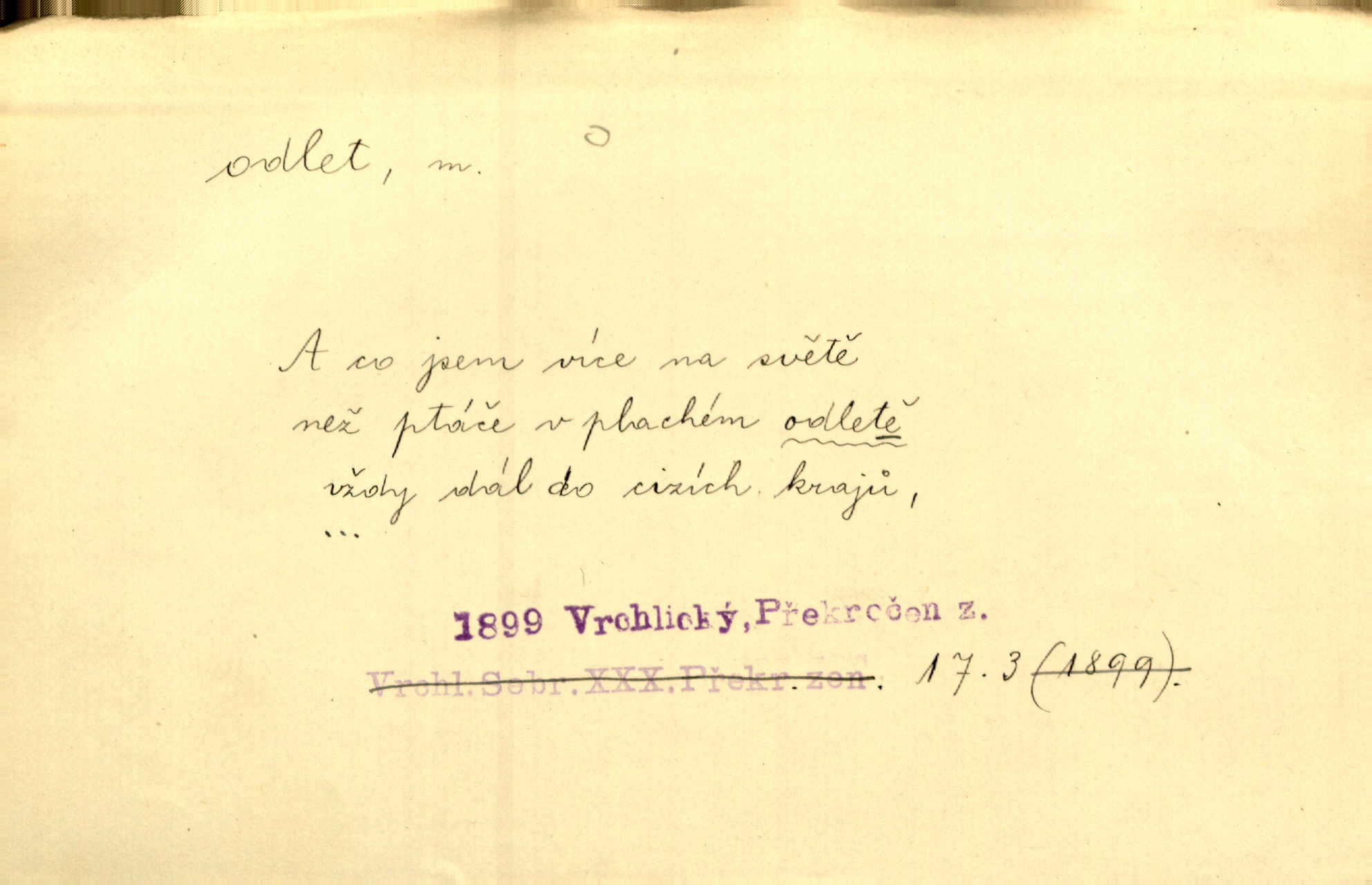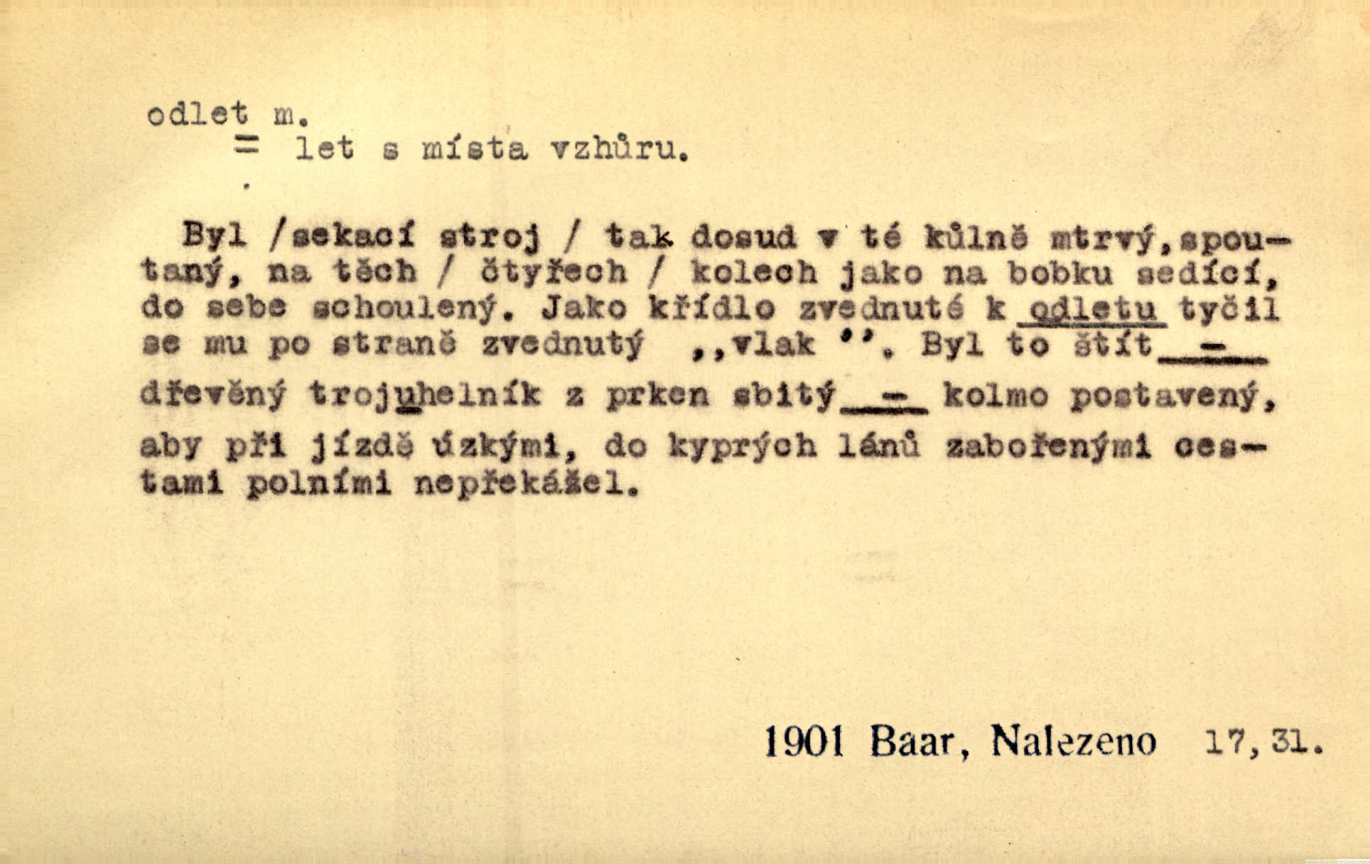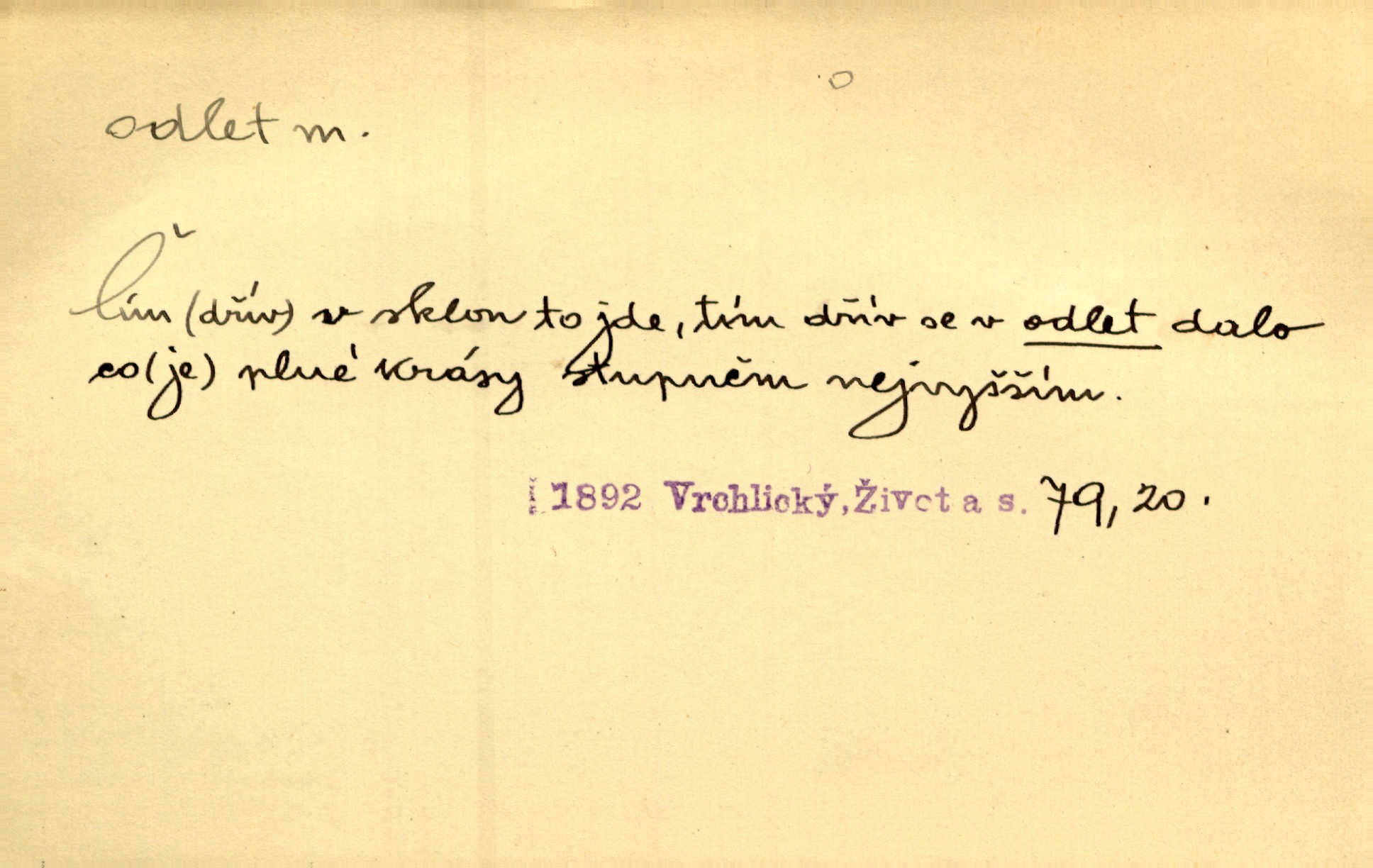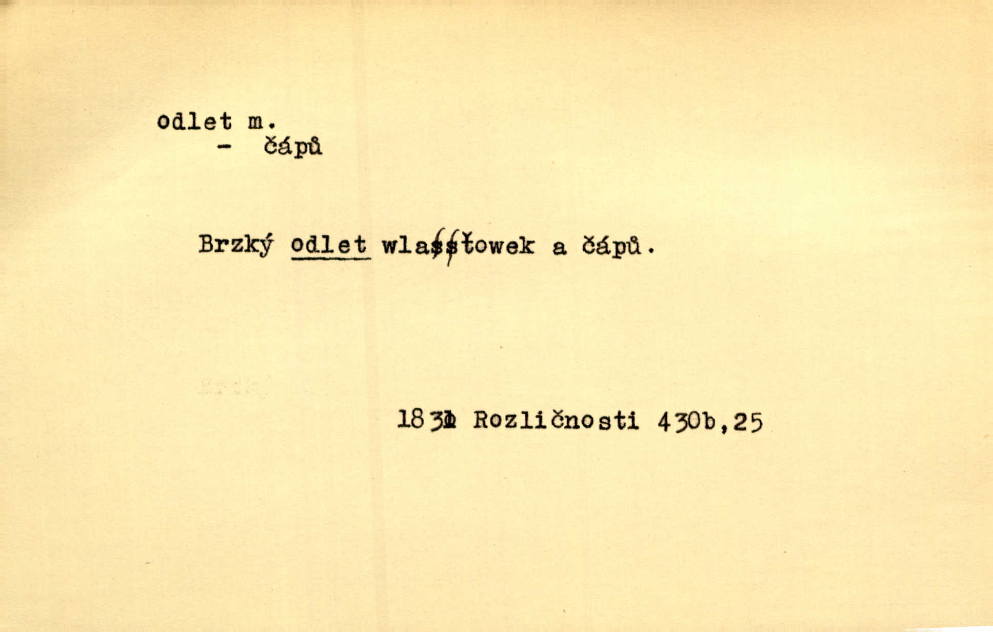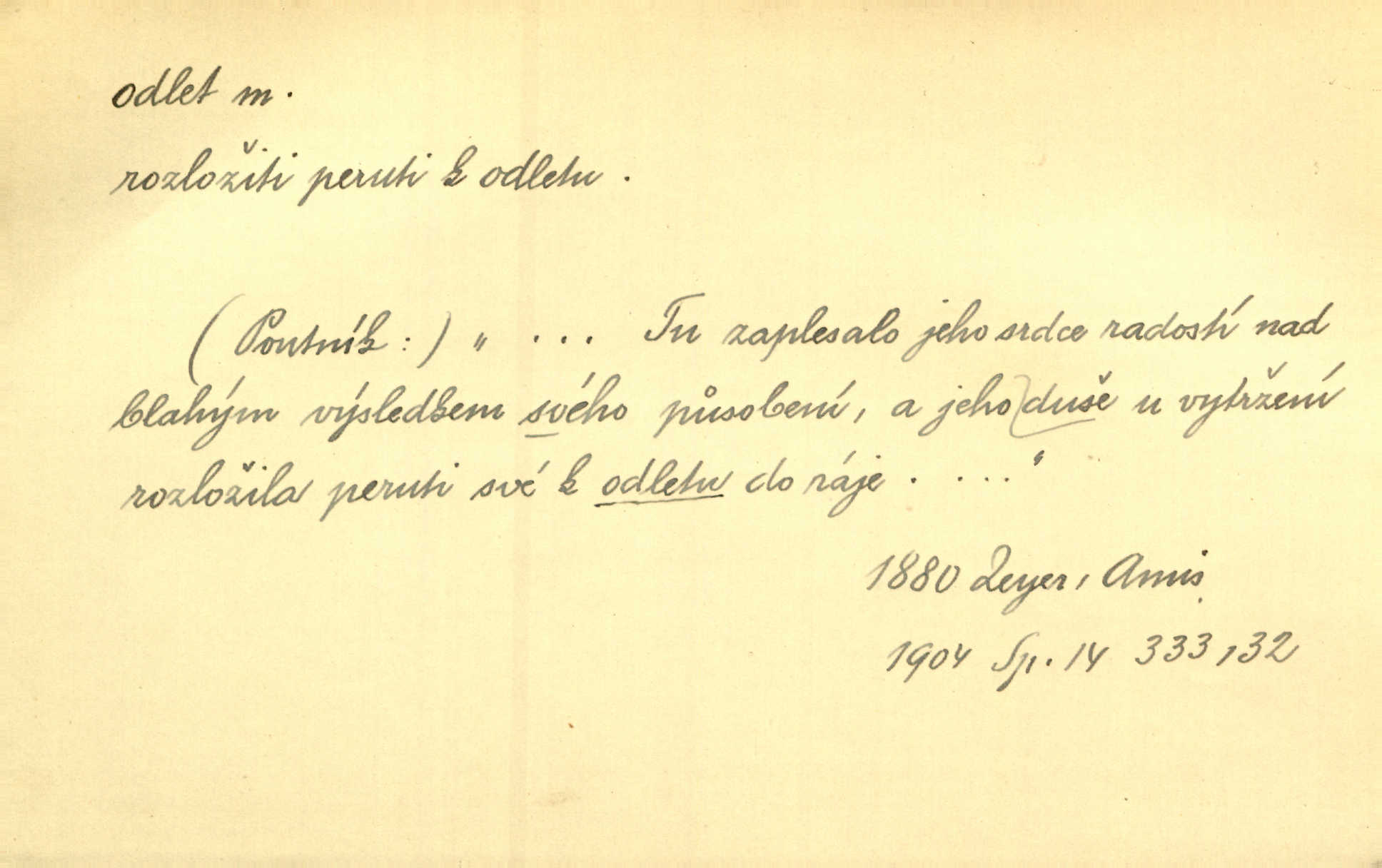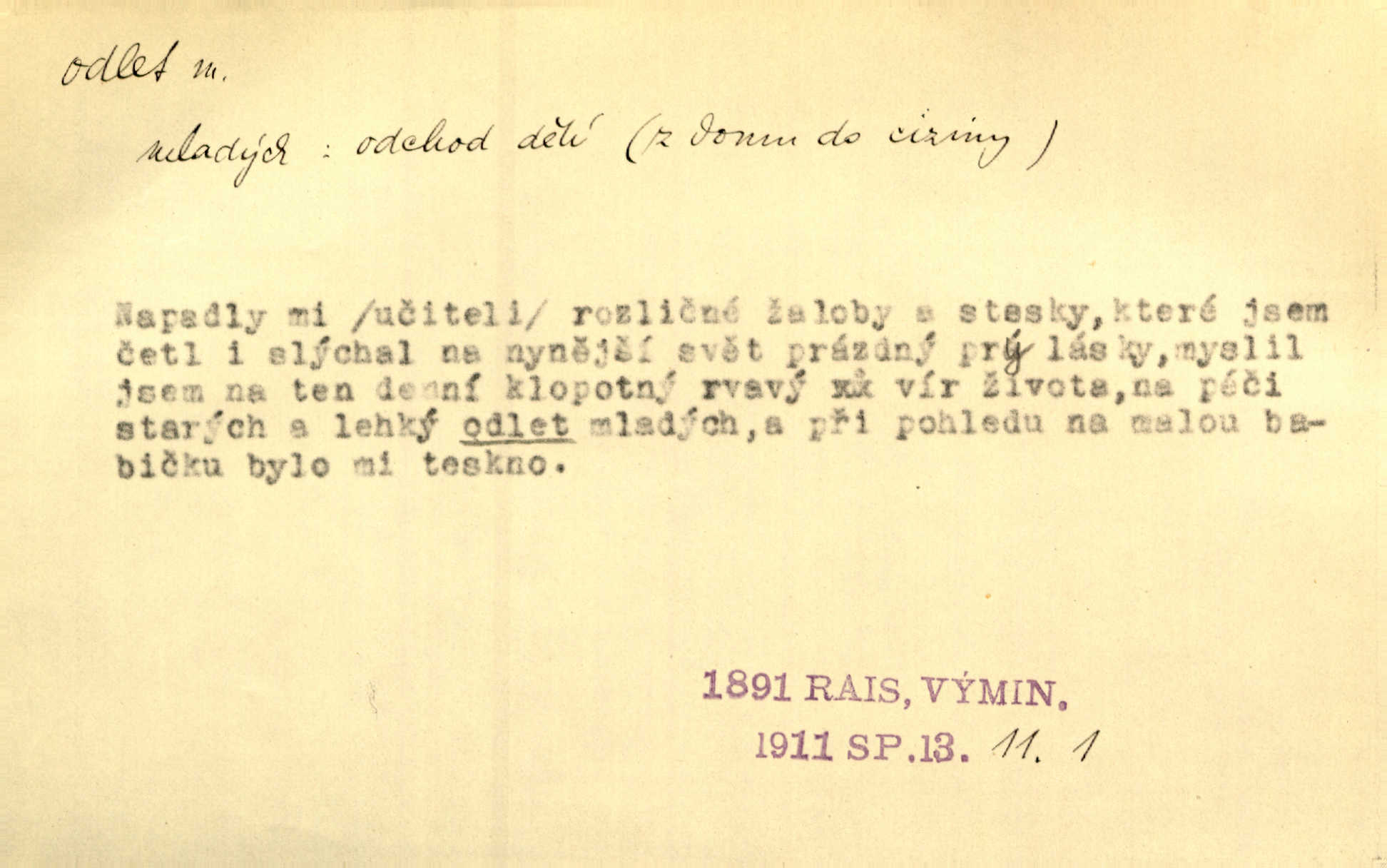 - odlet, -u m. odletění, odletování. Divoké husy na odletu, konec i babímu létu. Čel. Dívali jsme se na přípravy vlaštovek k odletu. Herb. Mílová otevřela okno, „aby duše [babiččina] volnost měla k odletu“. Něm. Let. start, odletění. D Expr. odchod. Myslil jsem na klopotný vír života, na péči starých a lehký odlet mladých odchod dětí z domu do ciziny. Rais. Viktora, chystajíc se k odletu z domova, ostaví tam Hedviku samotnou. Herrm.