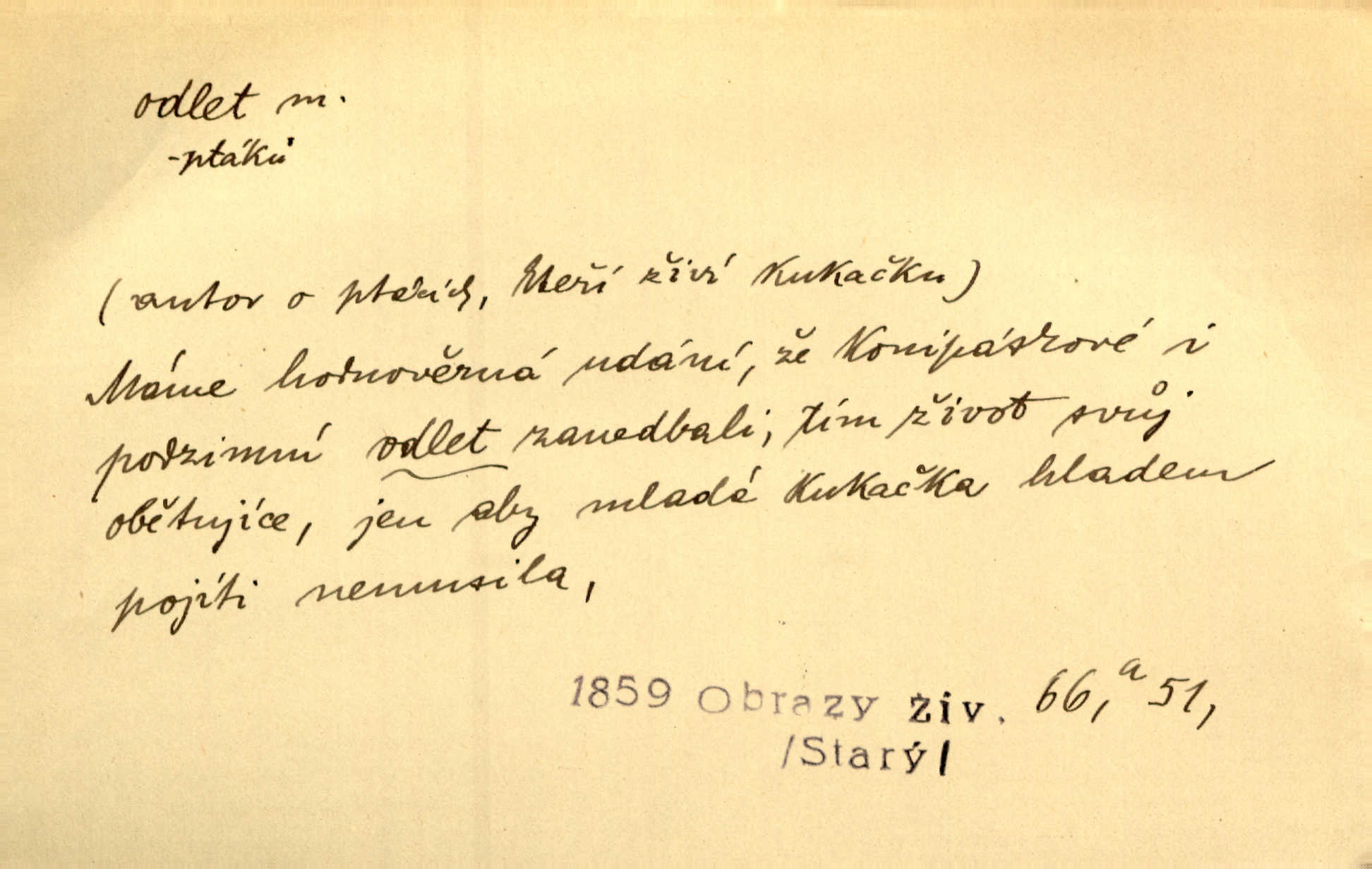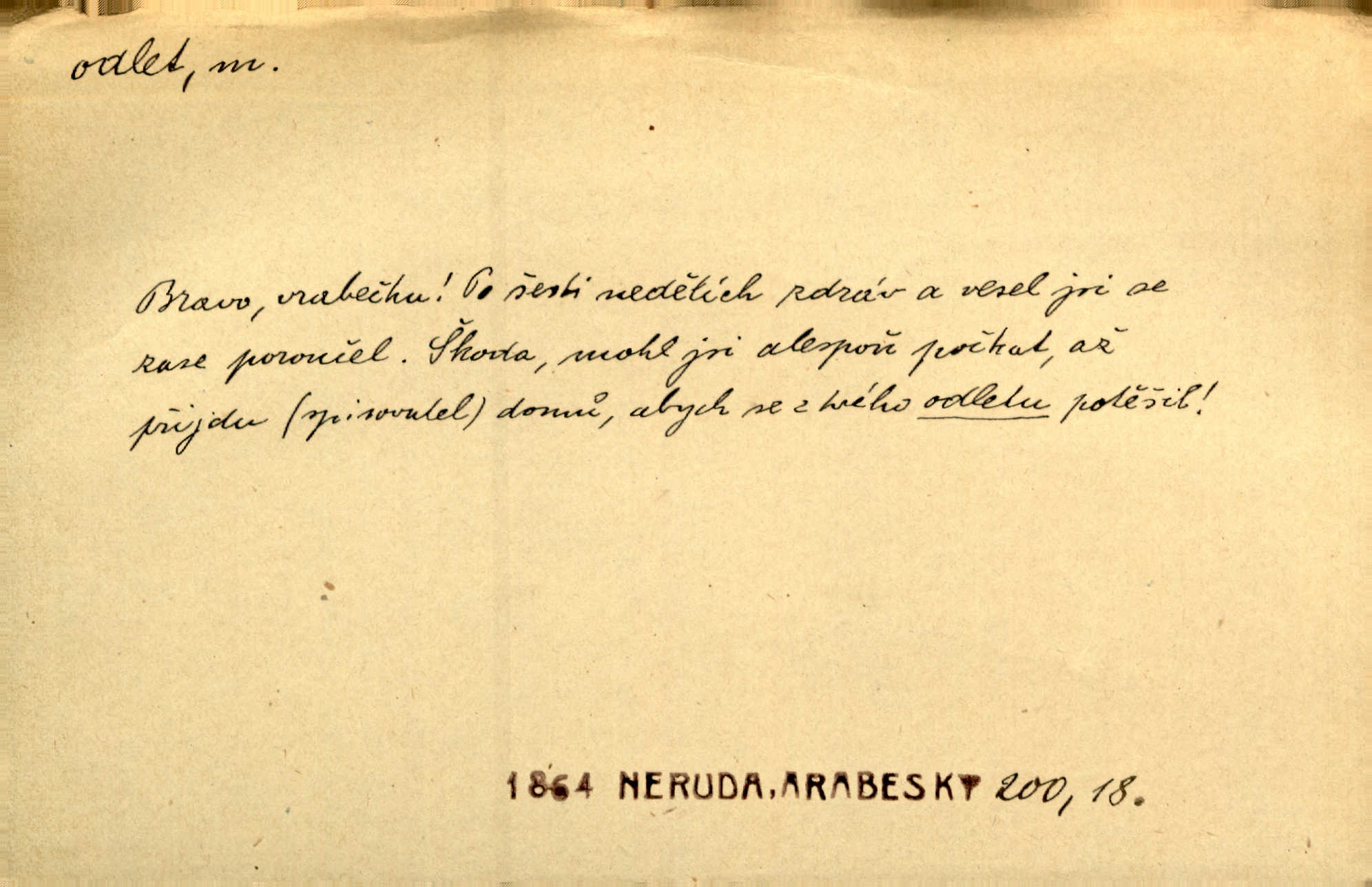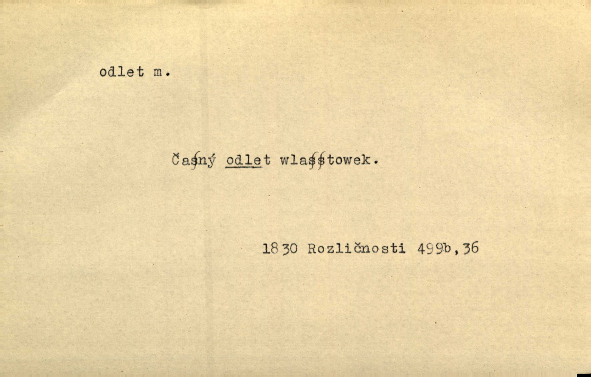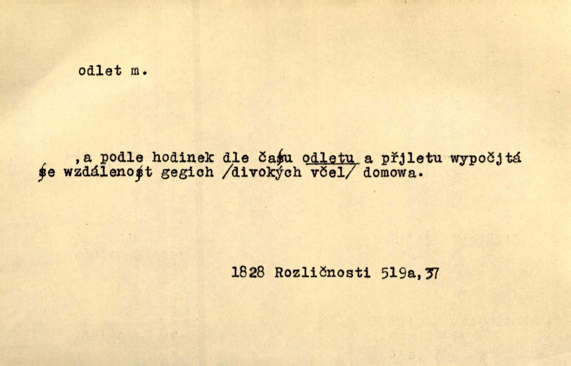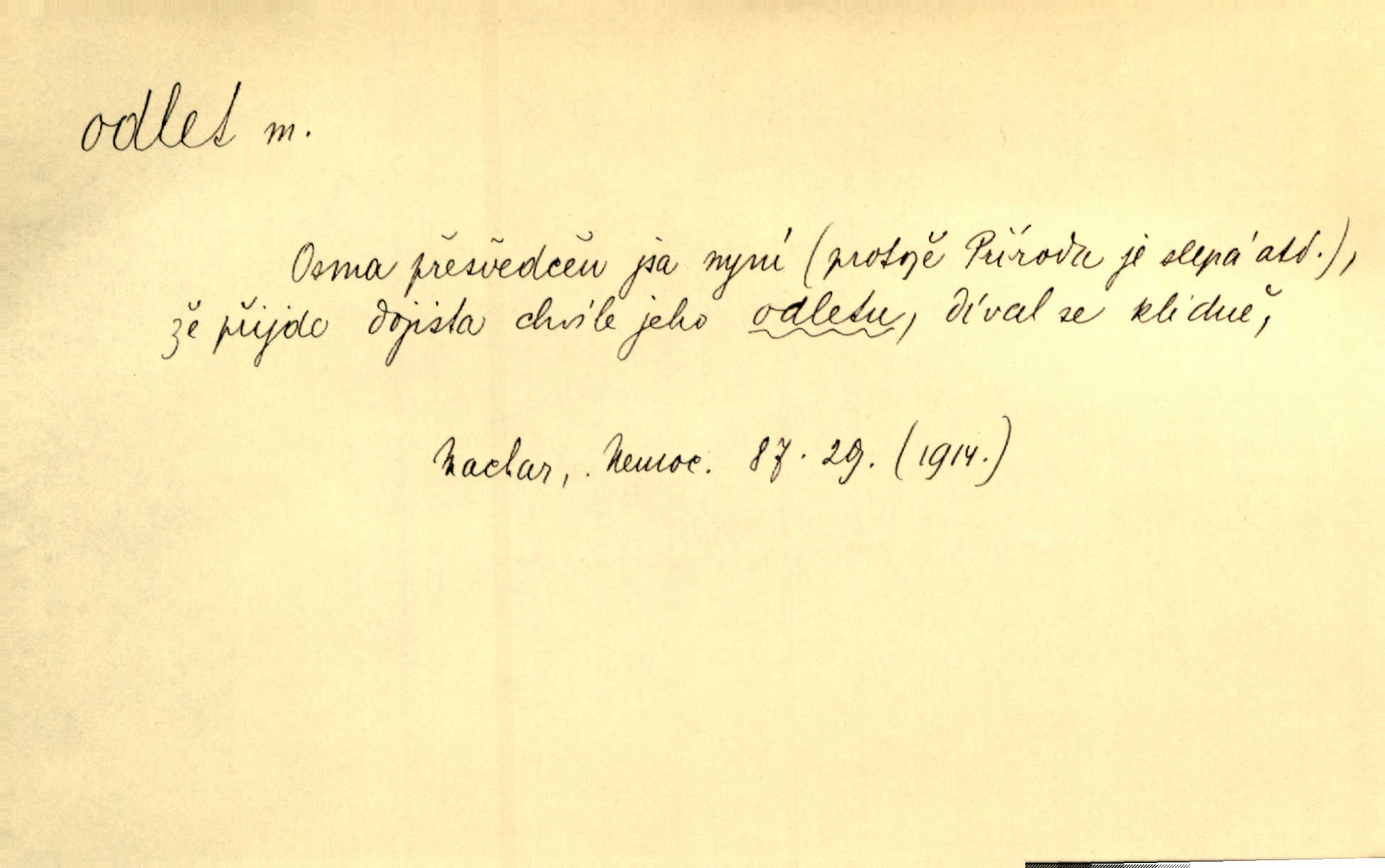 - odlet, -u m. odletění, odletování. Divoké husy na odletu, konec i babímu létu. Čel. Dívali jsme se na přípravy vlaštovek k odletu. Herb. Mílová otevřela okno, „aby duše [babiččina] volnost měla k odletu“. Něm. Let. start, odletění. D Expr. odchod. Myslil jsem na klopotný vír života, na péči starých a lehký odlet mladých odchod dětí z domu do ciziny. Rais. Viktora, chystajíc se k odletu z domova, ostaví tam Hedviku samotnou. Herrm.