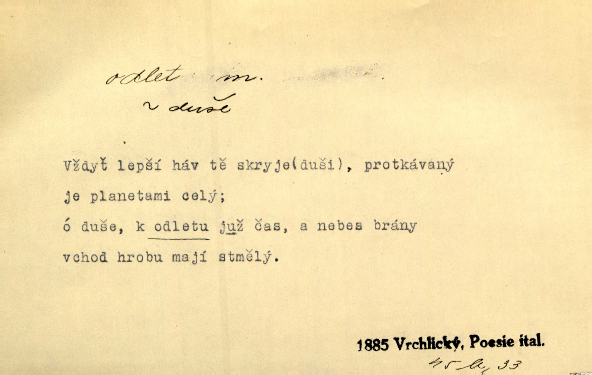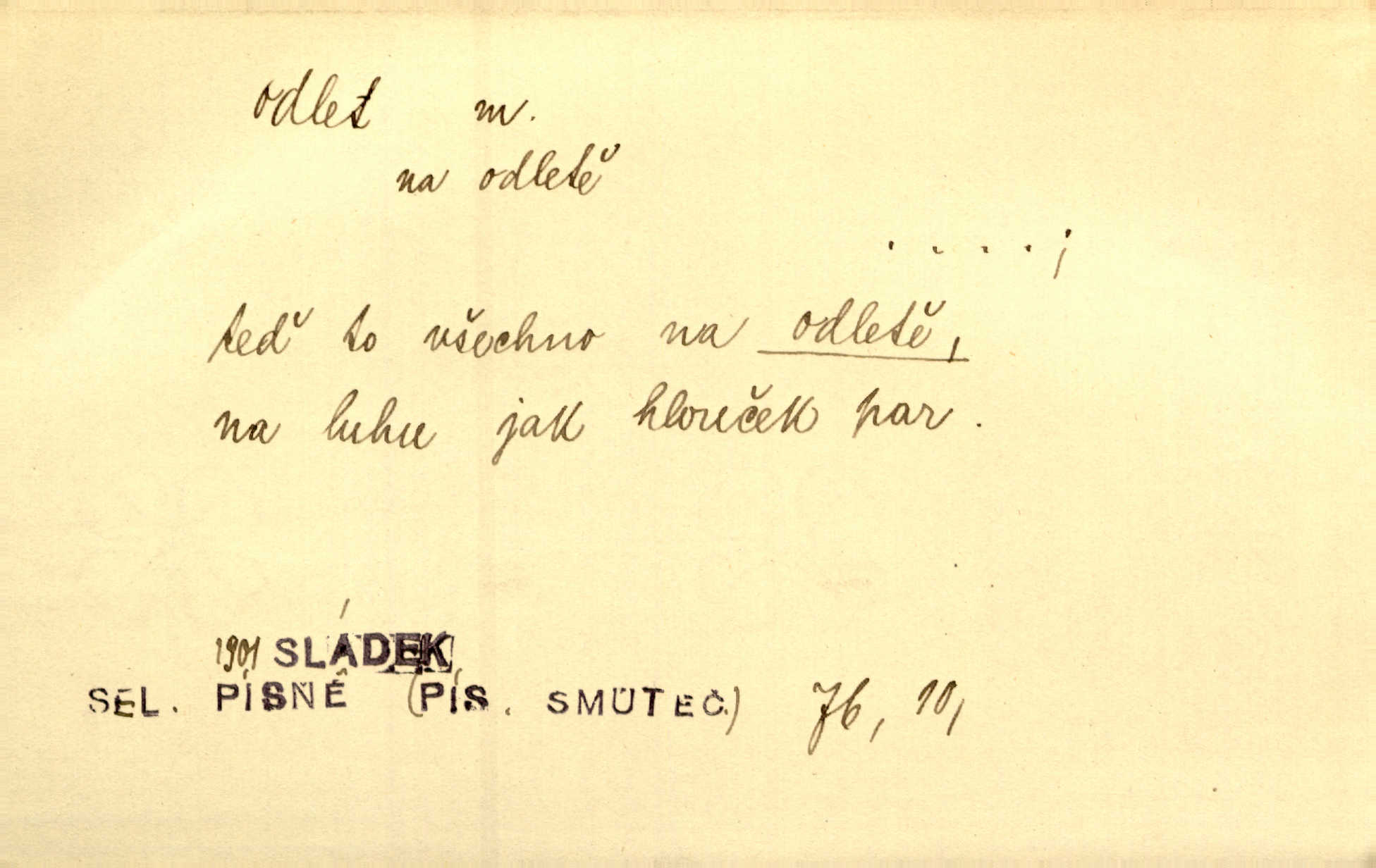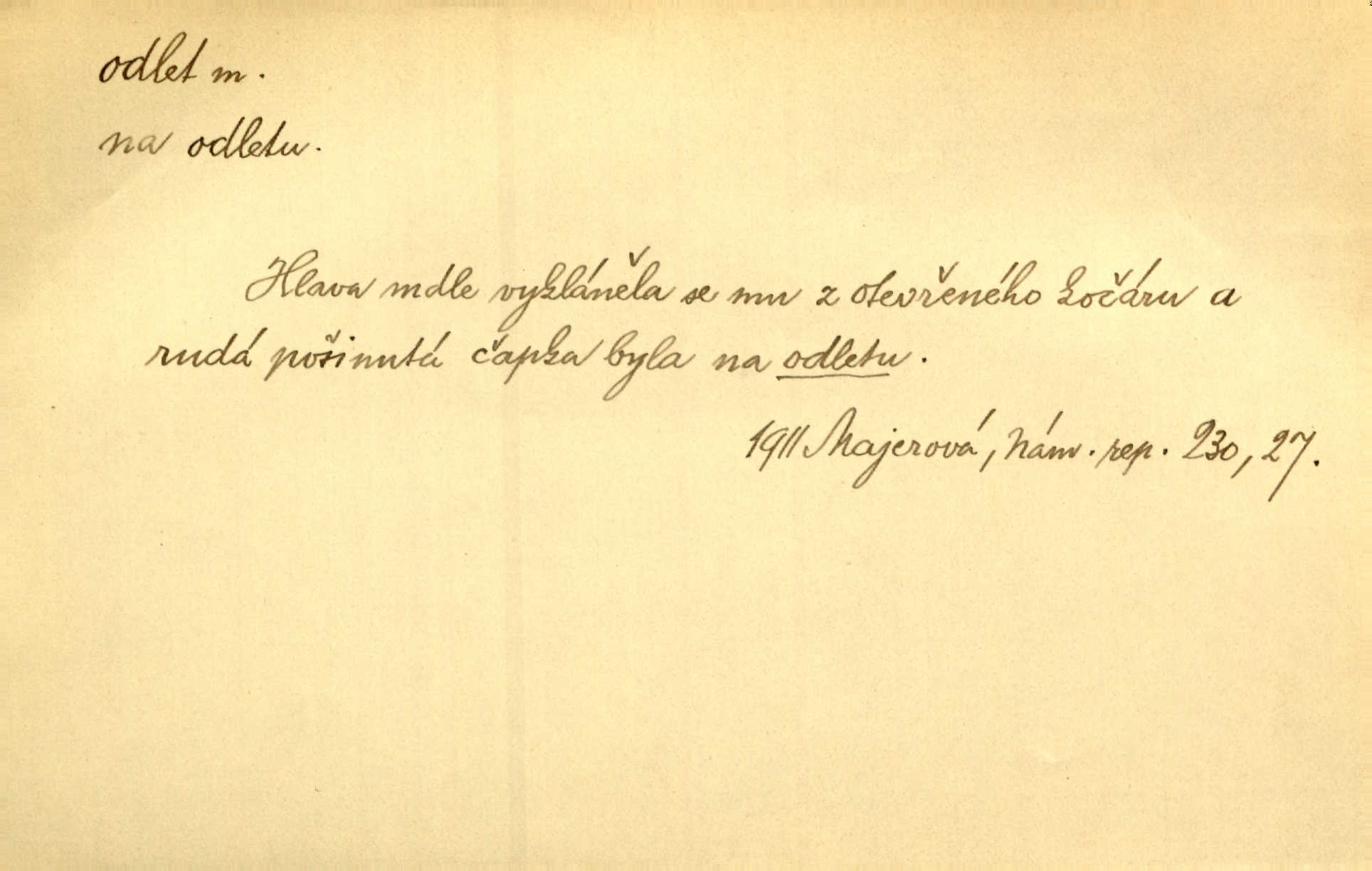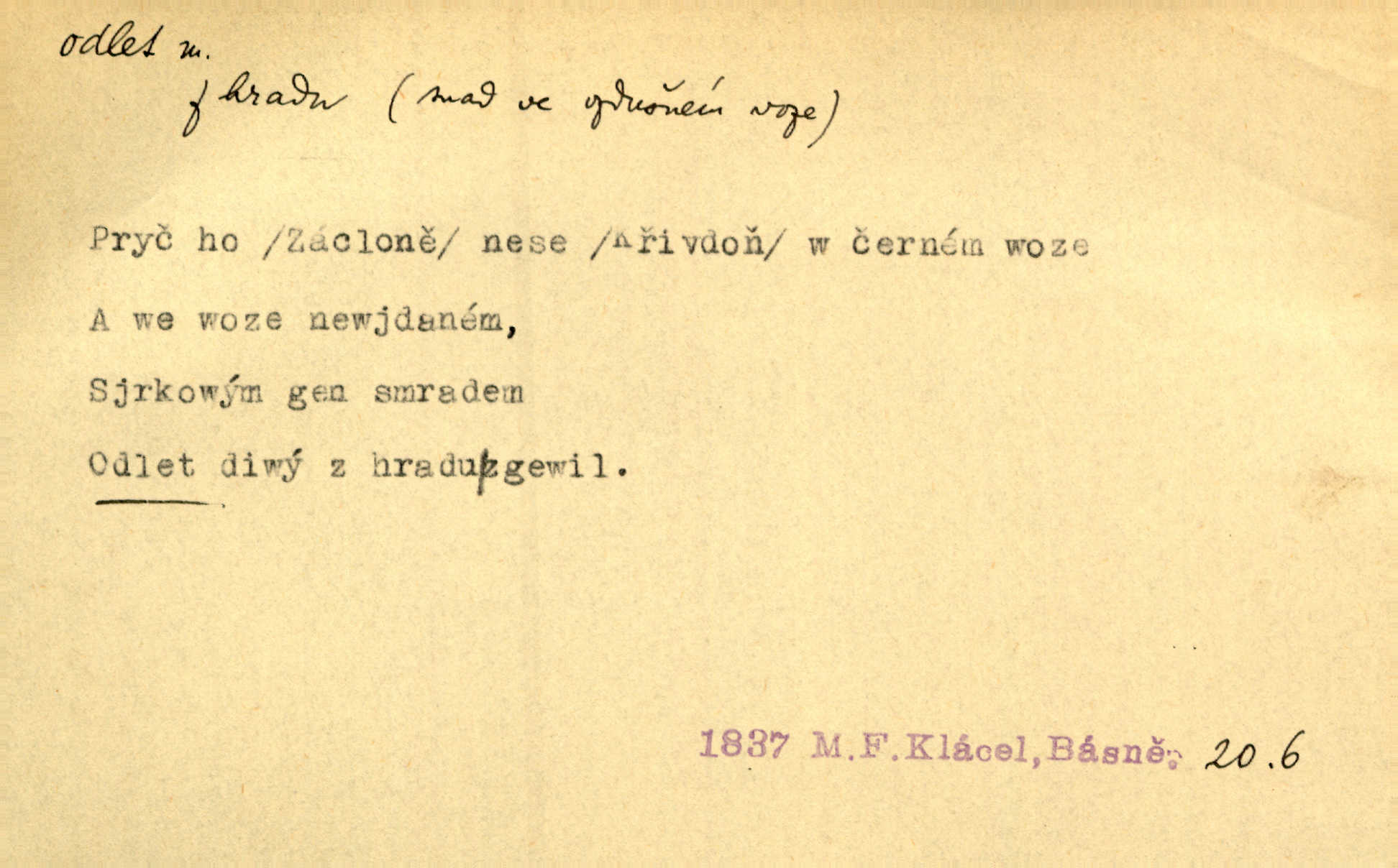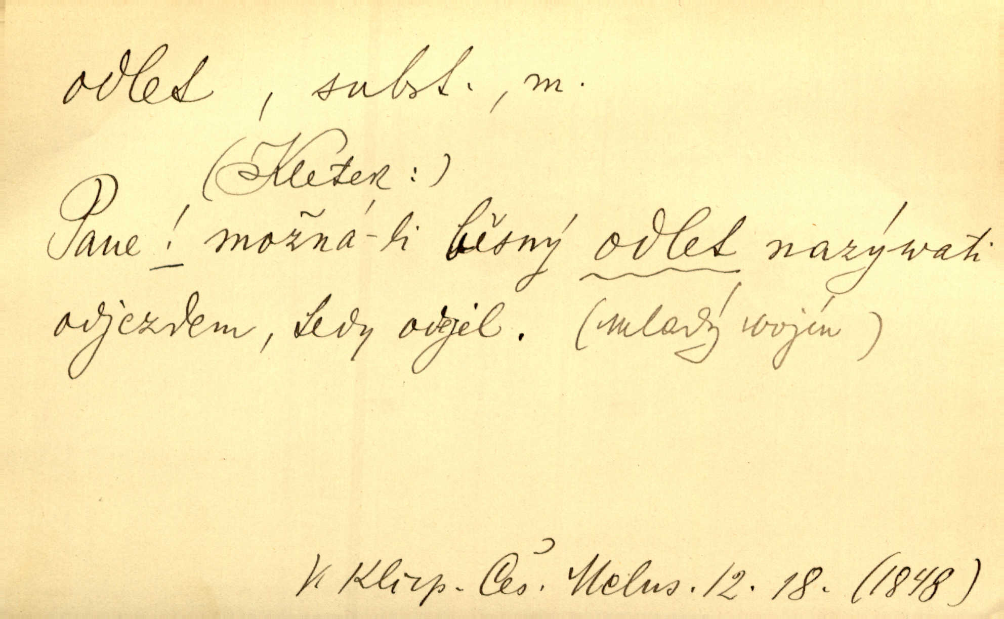 - odlet, -u m. odletění, odletování. Divoké husy na odletu, konec i babímu létu. Čel. Dívali jsme se na přípravy vlaštovek k odletu. Herb. Mílová otevřela okno, „aby duše [babiččina] volnost měla k odletu“. Něm. Let. start, odletění. D Expr. odchod. Myslil jsem na klopotný vír života, na péči starých a lehký odlet mladých odchod dětí z domu do ciziny. Rais. Viktora, chystajíc se k odletu z domova, ostaví tam Hedviku samotnou. Herrm.