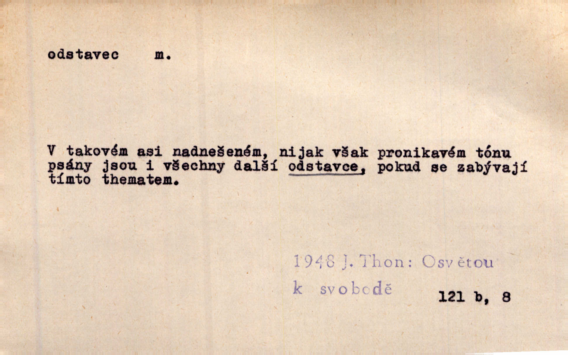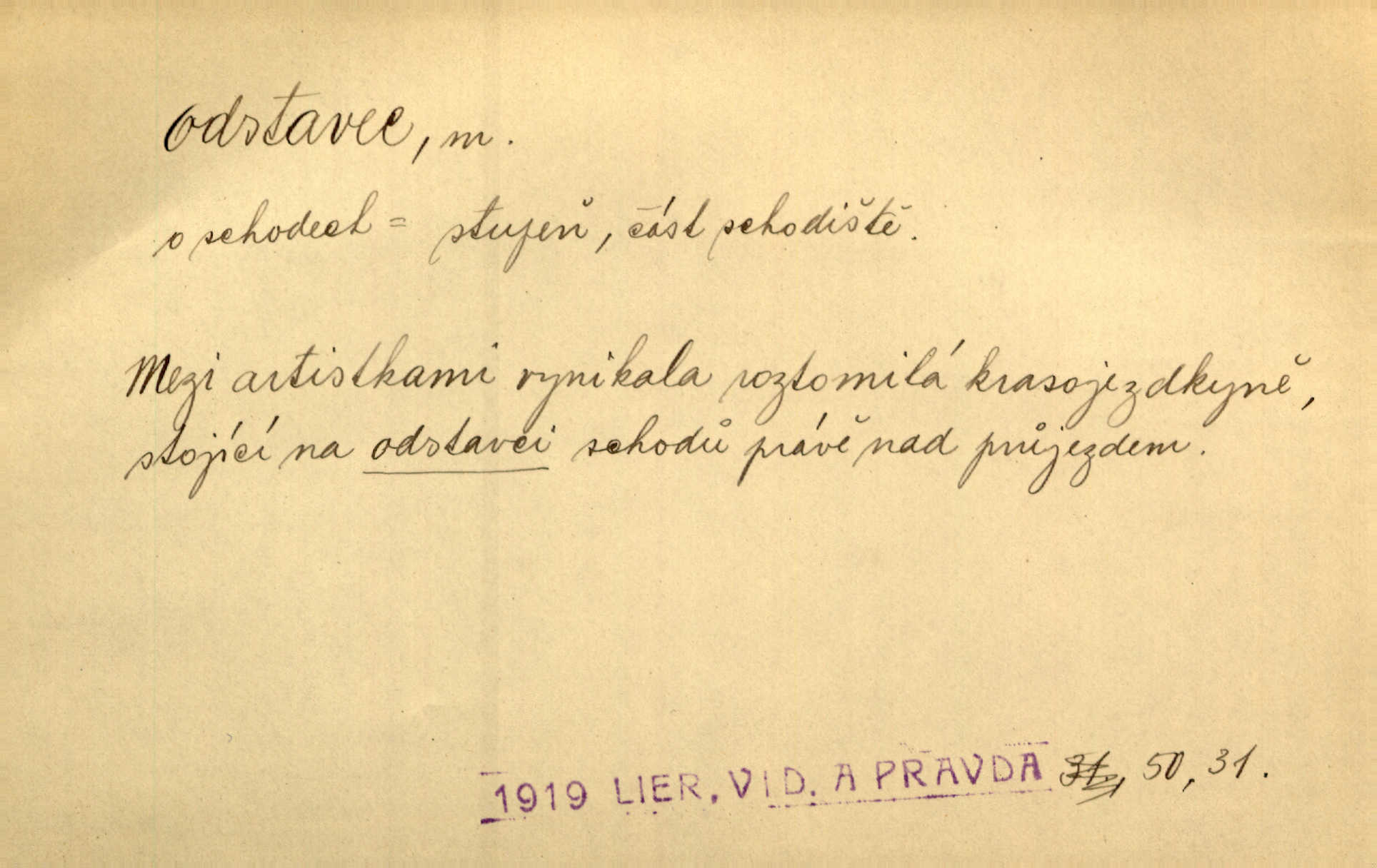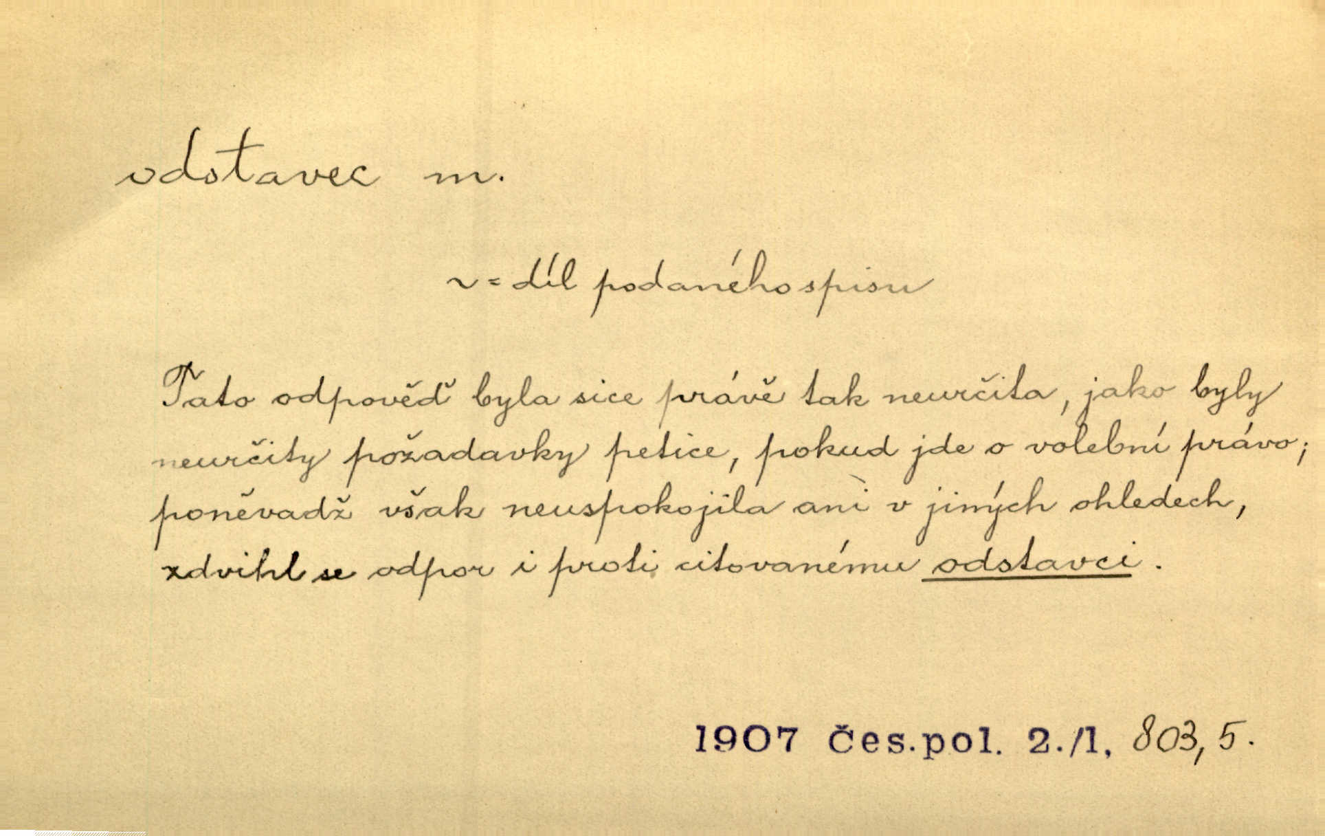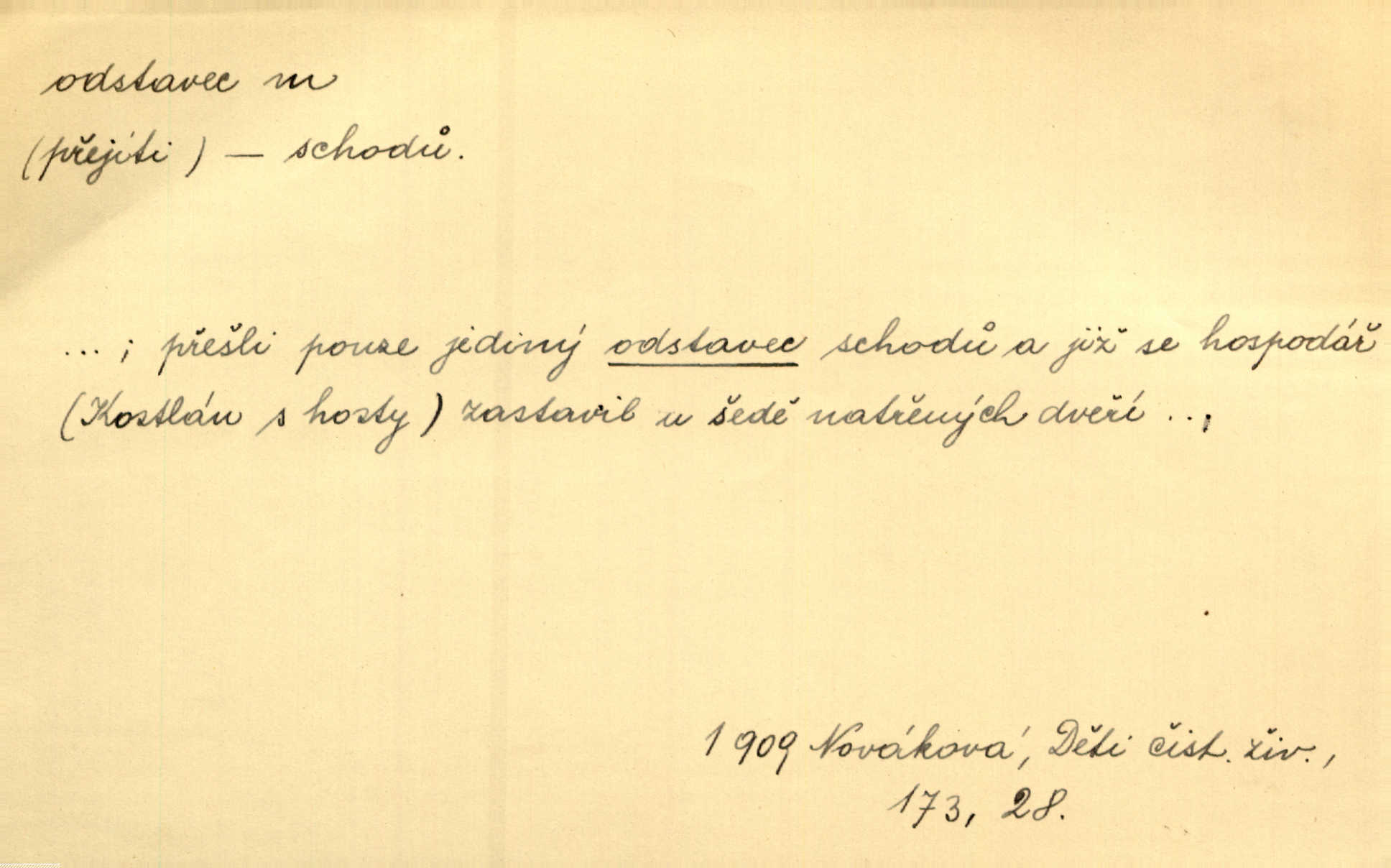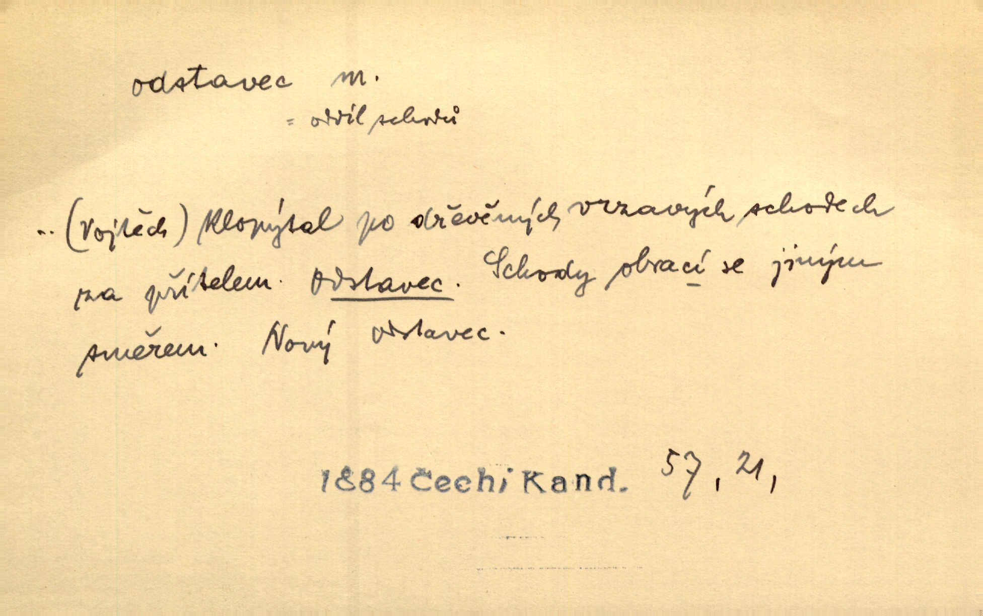 - odstavec, -vce m. oddíl nějakého textu. Dočetl odstavec, položil knížku. Jir. Tento odstavec nám minule konfiskovali. Mach. [Tak nebožtík] v poslední vůli své ve zvláštním odstavci ustanovil. Světozor. D oddíl něčeho vůbec, část. Společnost táhla se [z výletu] jako růženec v malých odstavcích po dvou a po třech. R. Svob. Rozděloval si celou vzdálenost na kratší odstavce. Čap. Ch. Snad může i pro mne začíti nový, lepší odstavec života. Čech. Čas plyne pořád stejně dál, v tom není odstavců ani změny. Ner. Mezi výhní a kovadlinou putují železné pruty v stejných odstavcích času nekonečně sem a tam intervalech. Ner. Potom další odstavec takové události rodinné: slavné zasnoubení článek. Herrm. Poslední odstavec slavnostního programu číslo. Čap. Ch. D Zř. plošina mezi dvěma oddíly schodů, odpočivadlo. Přešli jediný odstavec schodů a již se hospodář zastavil u šedě natřených dveří. Nov. Na prvním odstavci schodů viděl jsem řadu odevřených jizeb. Ner. Muž ji [na schodech] předhonil, a když konečně hlavu pozvedla, spatřila na druhém odstavci stát Heilbronna. Til.