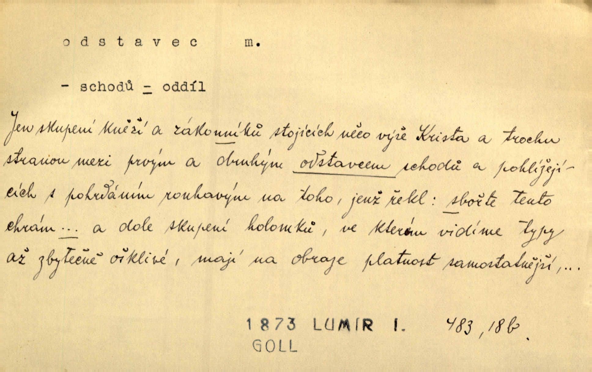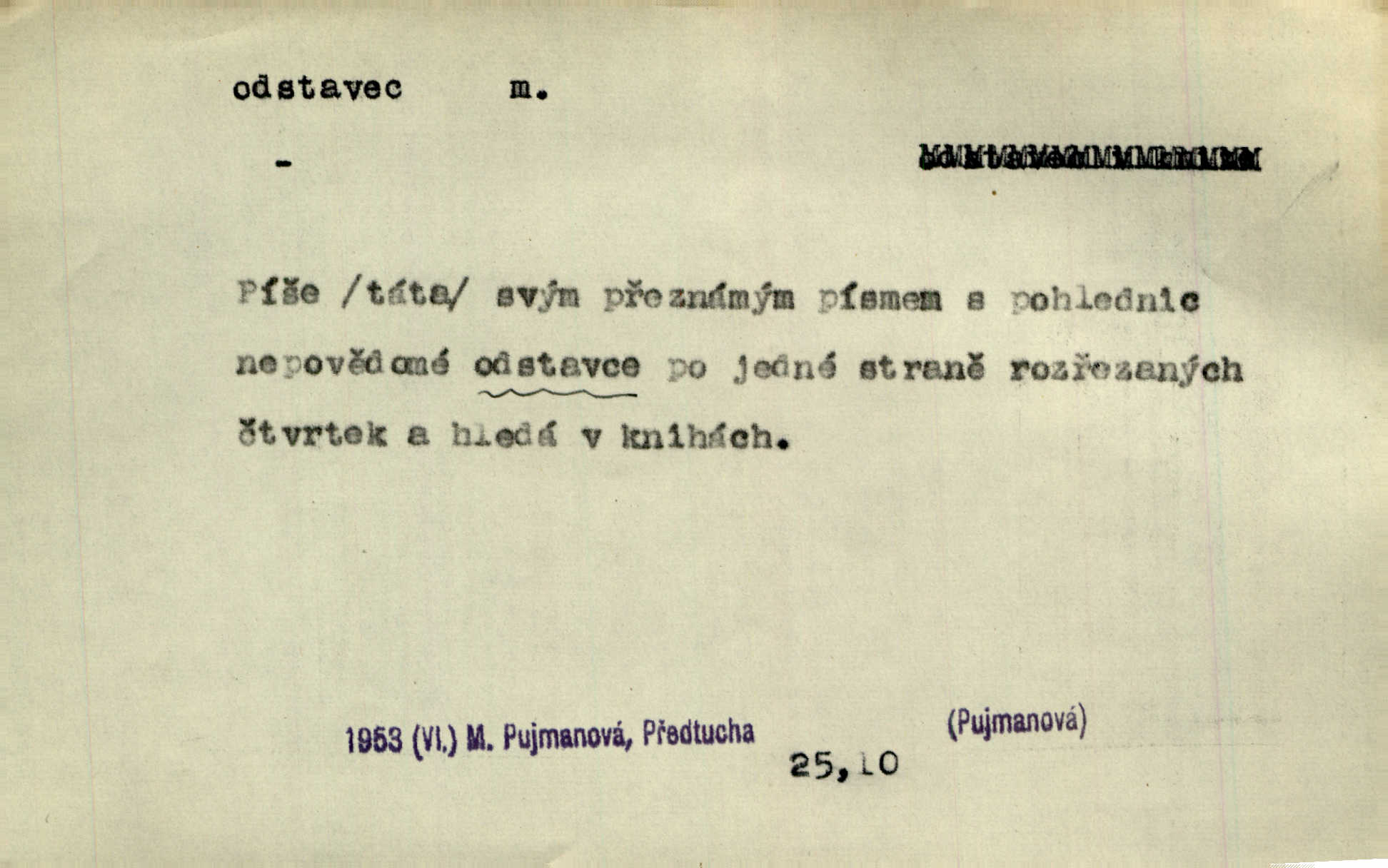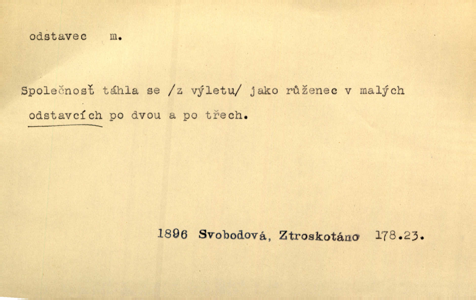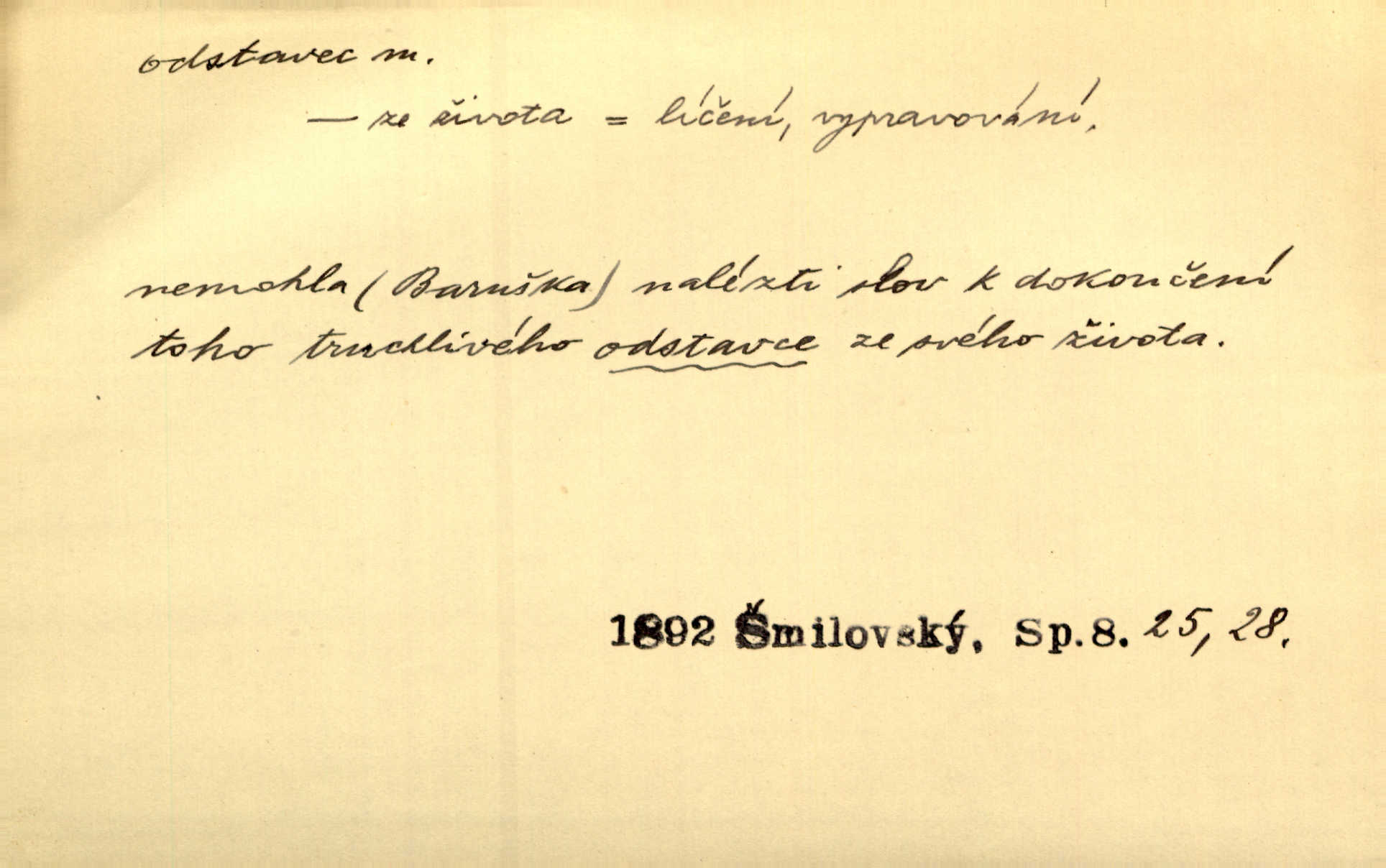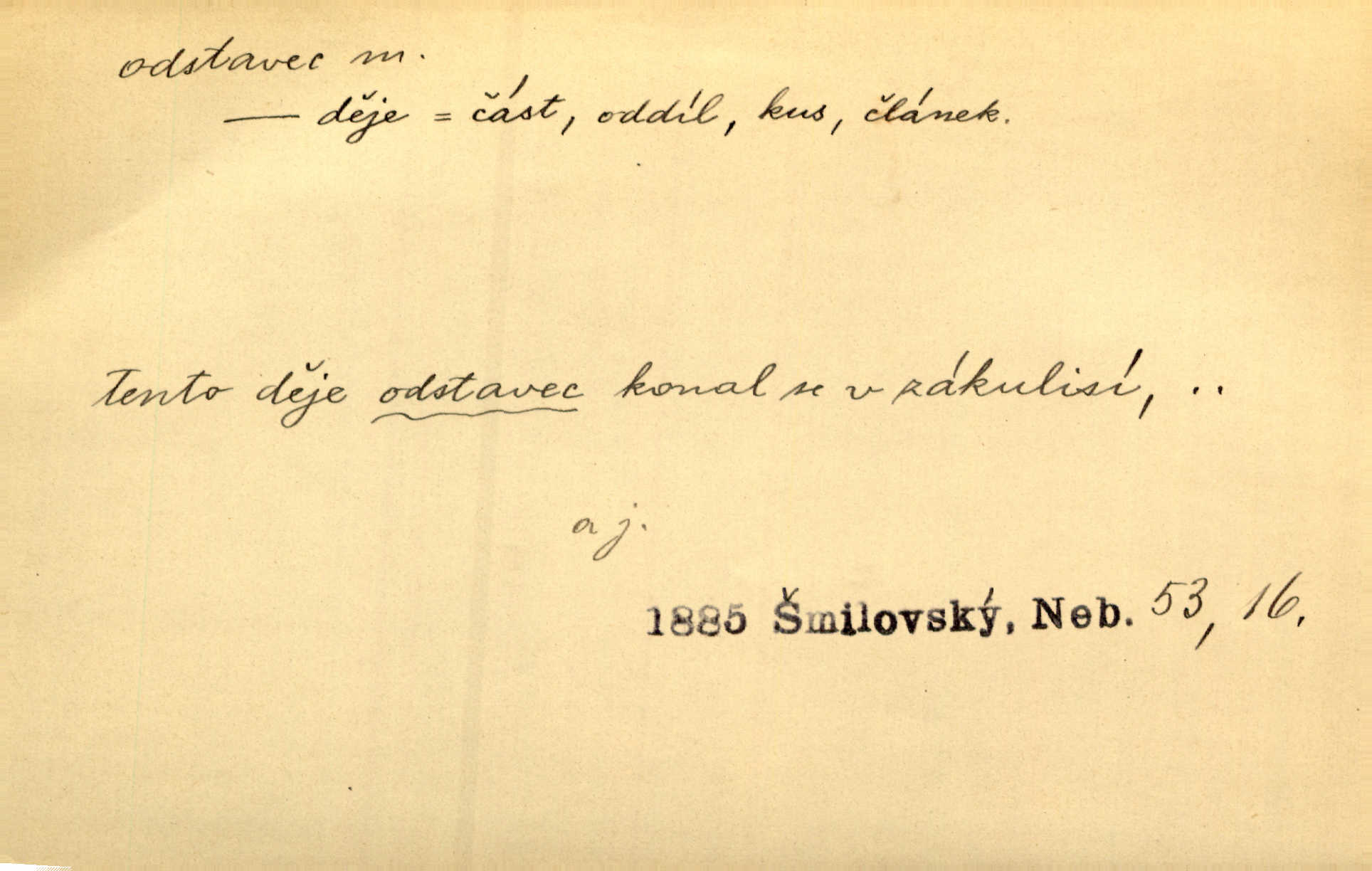 - odstavec, -vce m. oddíl nějakého textu. Dočetl odstavec, položil knížku. Jir. Tento odstavec nám minule konfiskovali. Mach. [Tak nebožtík] v poslední vůli své ve zvláštním odstavci ustanovil. Světozor. D oddíl něčeho vůbec, část. Společnost táhla se [z výletu] jako růženec v malých odstavcích po dvou a po třech. R. Svob. Rozděloval si celou vzdálenost na kratší odstavce. Čap. Ch. Snad může i pro mne začíti nový, lepší odstavec života. Čech. Čas plyne pořád stejně dál, v tom není odstavců ani změny. Ner. Mezi výhní a kovadlinou putují železné pruty v stejných odstavcích času nekonečně sem a tam intervalech. Ner. Potom další odstavec takové události rodinné: slavné zasnoubení článek. Herrm. Poslední odstavec slavnostního programu číslo. Čap. Ch. D Zř. plošina mezi dvěma oddíly schodů, odpočivadlo. Přešli jediný odstavec schodů a již se hospodář zastavil u šedě natřených dveří. Nov. Na prvním odstavci schodů viděl jsem řadu odevřených jizeb. Ner. Muž ji [na schodech] předhonil, a když konečně hlavu pozvedla, spatřila na druhém odstavci stát Heilbronna. Til.