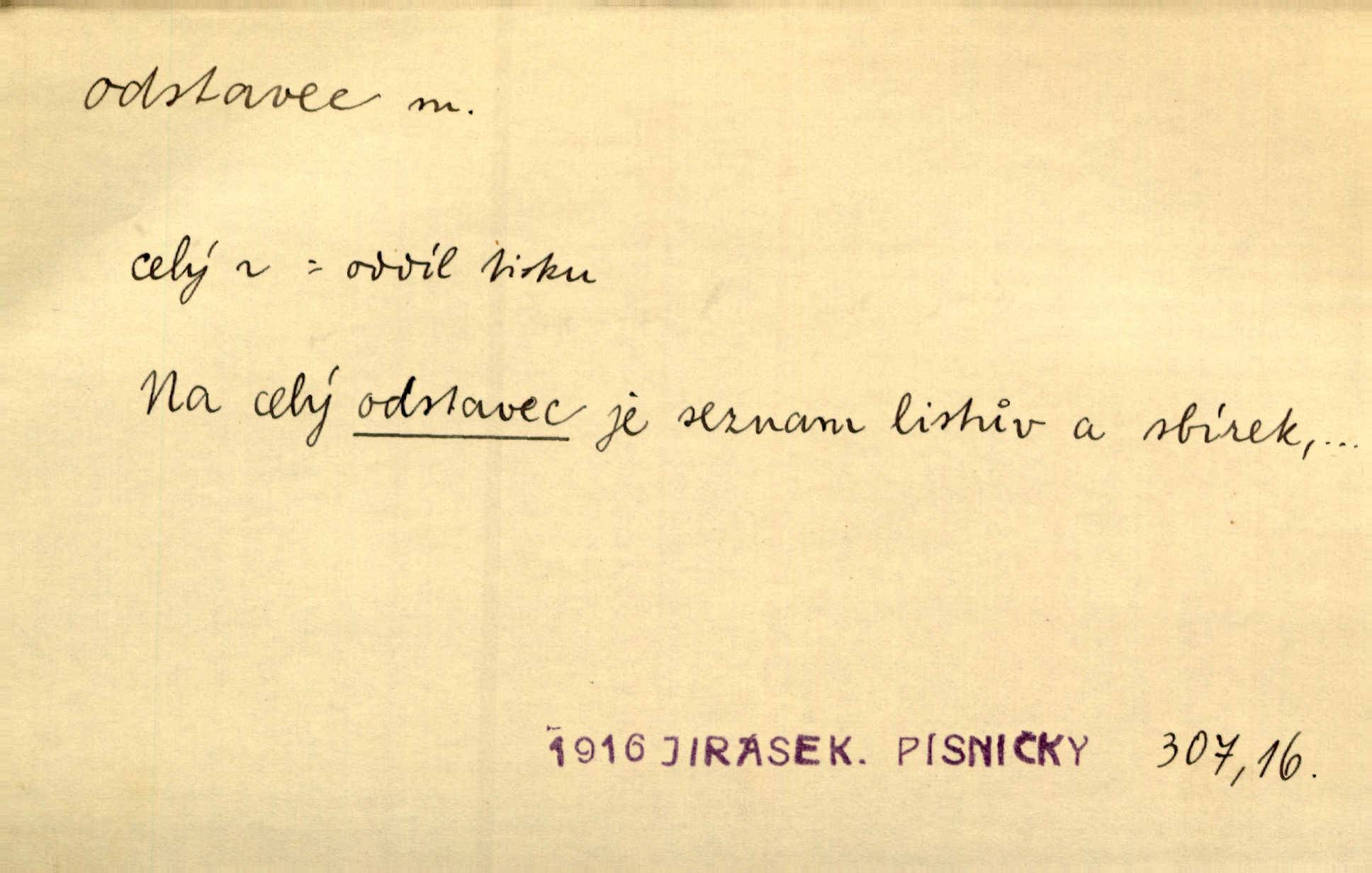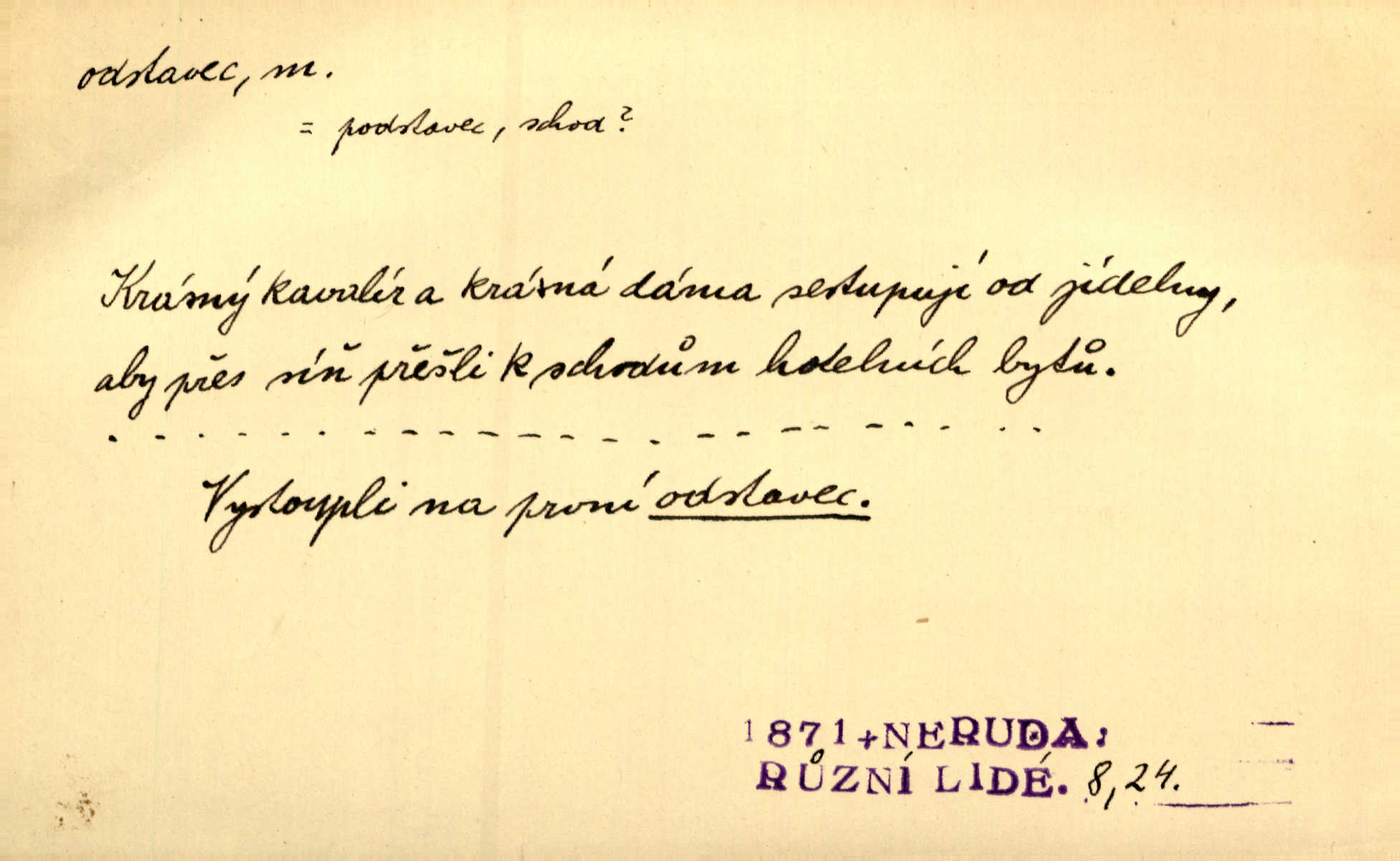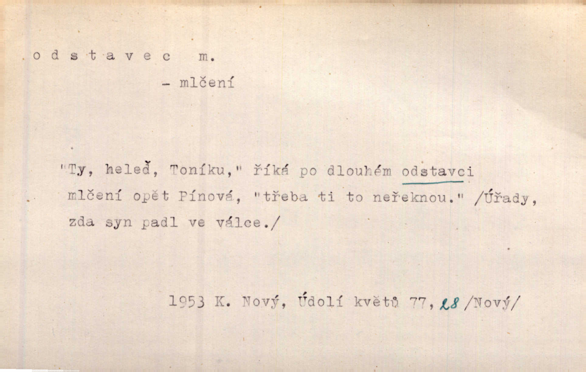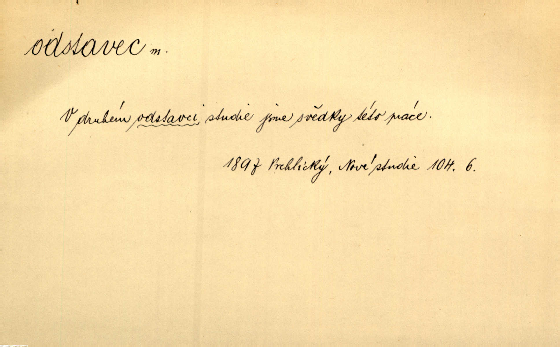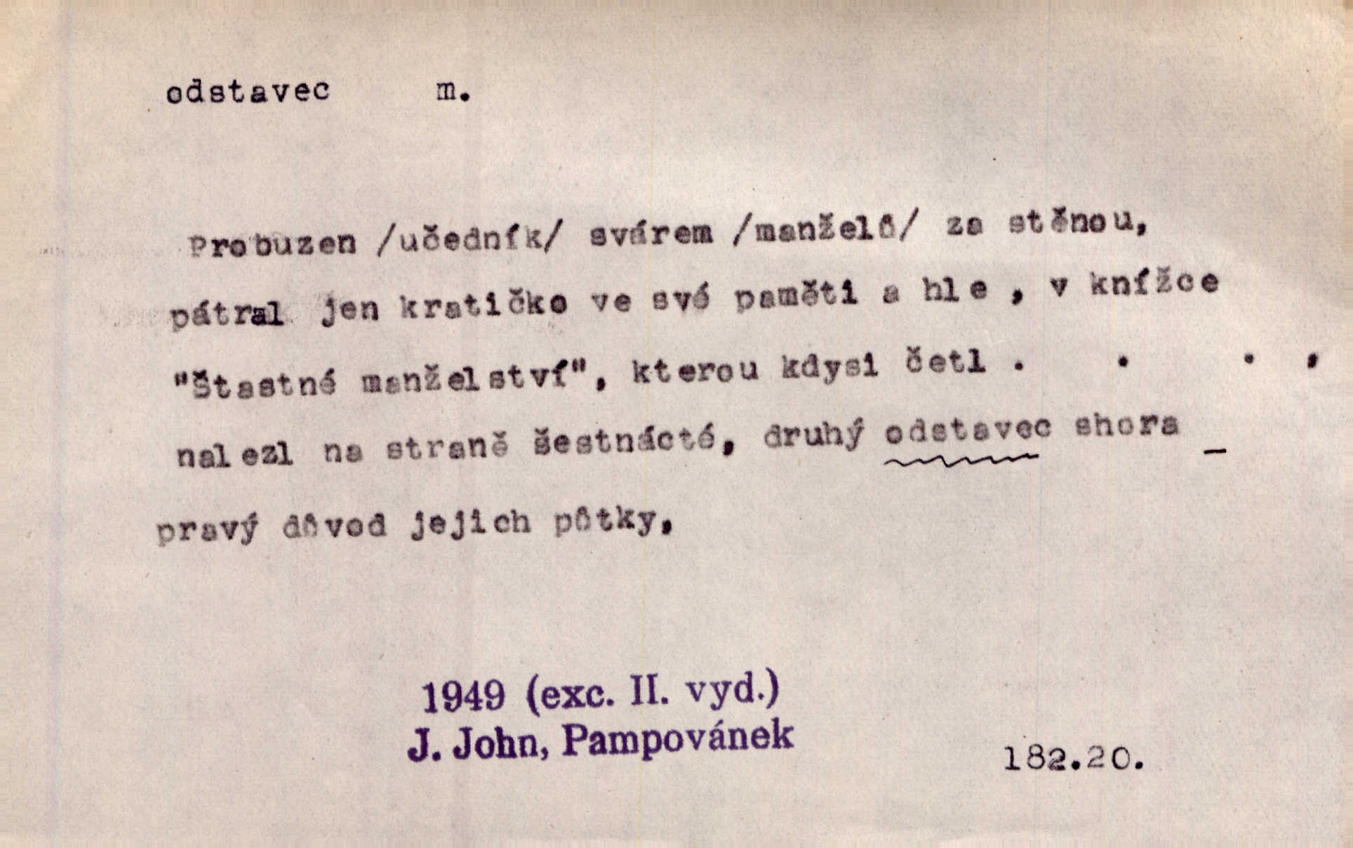 - odstavec, -vce m. oddíl nějakého textu. Dočetl odstavec, položil knížku. Jir. Tento odstavec nám minule konfiskovali. Mach. [Tak nebožtík] v poslední vůli své ve zvláštním odstavci ustanovil. Světozor. D oddíl něčeho vůbec, část. Společnost táhla se [z výletu] jako růženec v malých odstavcích po dvou a po třech. R. Svob. Rozděloval si celou vzdálenost na kratší odstavce. Čap. Ch. Snad může i pro mne začíti nový, lepší odstavec života. Čech. Čas plyne pořád stejně dál, v tom není odstavců ani změny. Ner. Mezi výhní a kovadlinou putují železné pruty v stejných odstavcích času nekonečně sem a tam intervalech. Ner. Potom další odstavec takové události rodinné: slavné zasnoubení článek. Herrm. Poslední odstavec slavnostního programu číslo. Čap. Ch. D Zř. plošina mezi dvěma oddíly schodů, odpočivadlo. Přešli jediný odstavec schodů a již se hospodář zastavil u šedě natřených dveří. Nov. Na prvním odstavci schodů viděl jsem řadu odevřených jizeb. Ner. Muž ji [na schodech] předhonil, a když konečně hlavu pozvedla, spatřila na druhém odstavci stát Heilbronna. Til.