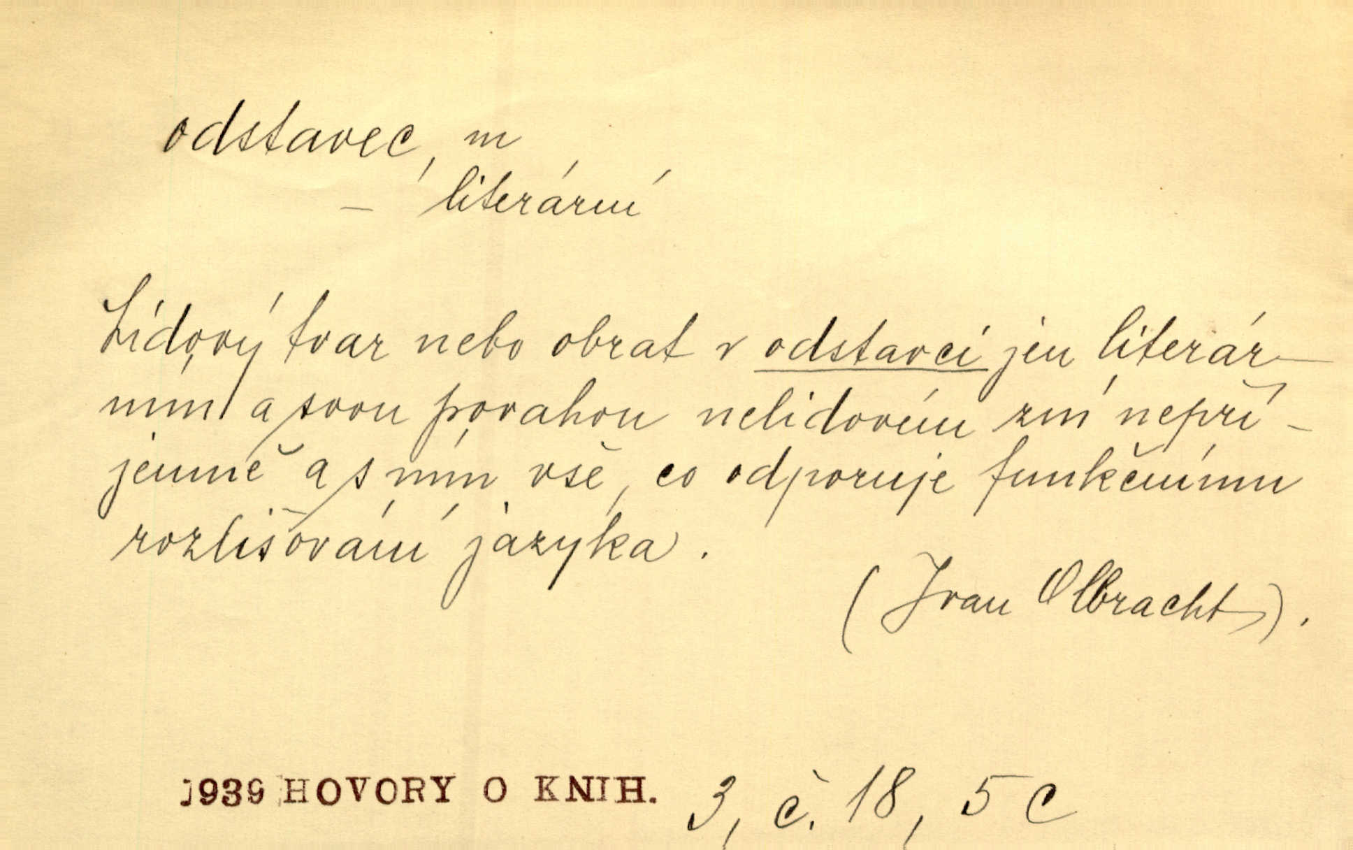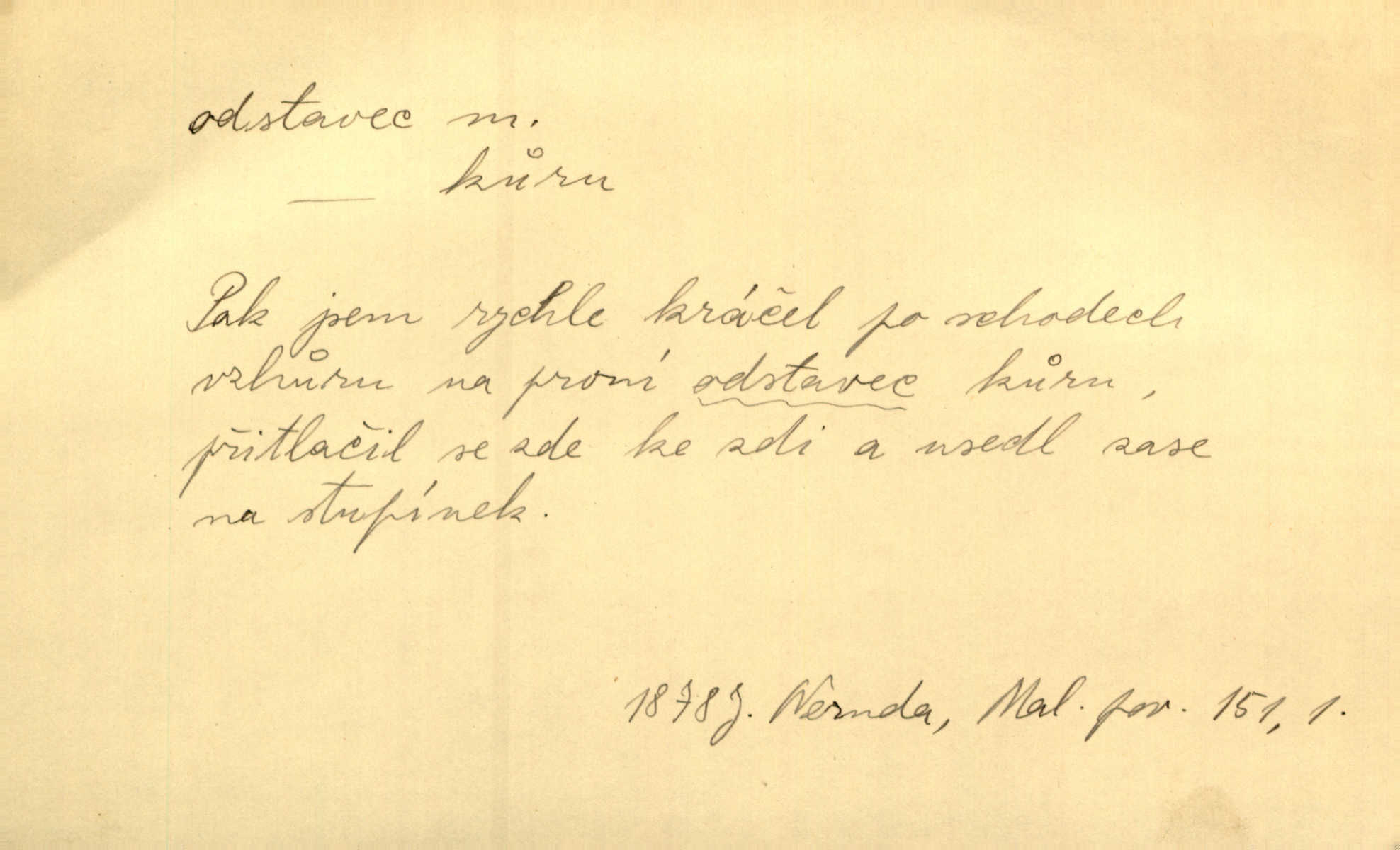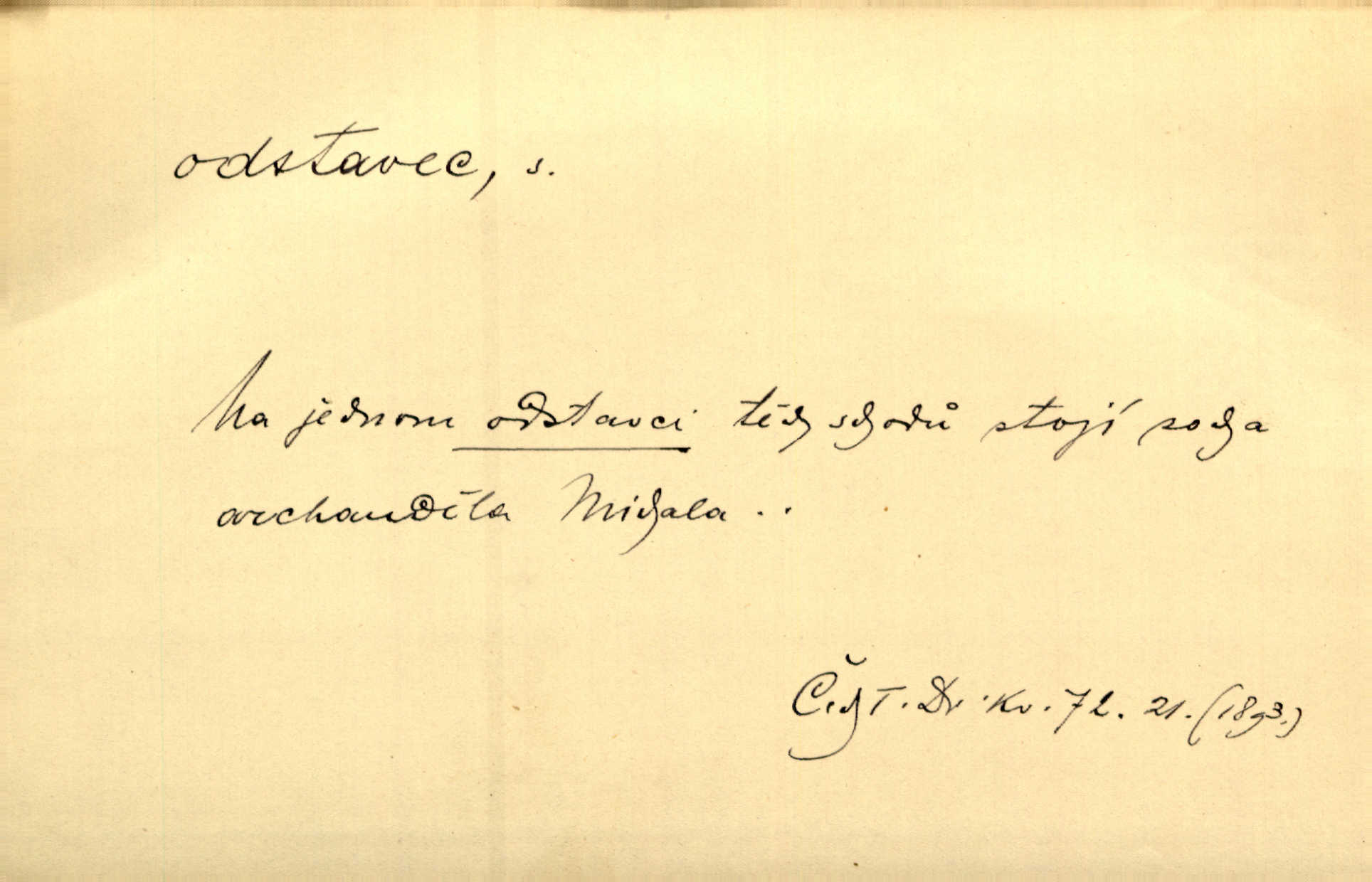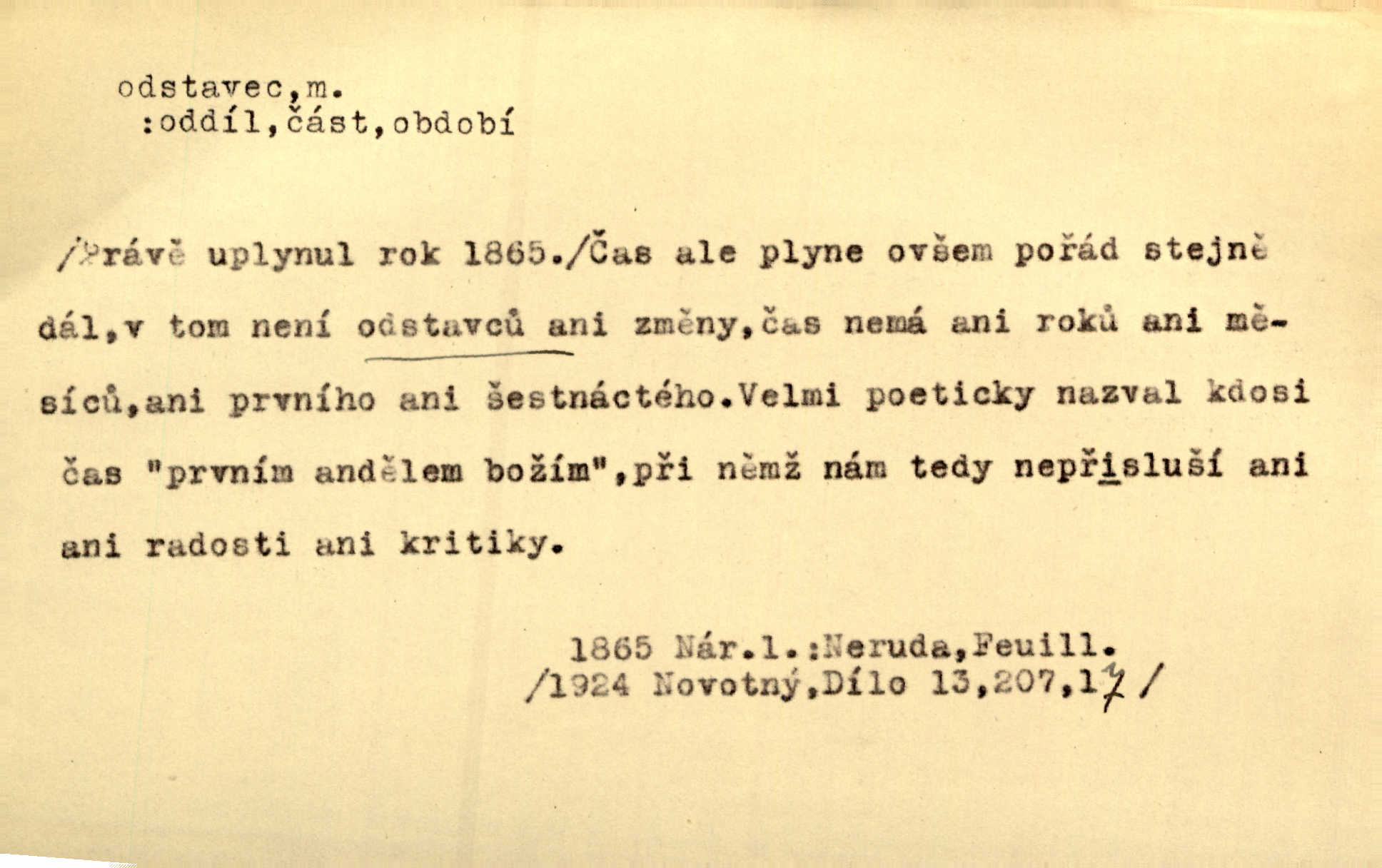 - odstavec, -vce m. oddíl nějakého textu. Dočetl odstavec, položil knížku. Jir. Tento odstavec nám minule konfiskovali. Mach. [Tak nebožtík] v poslední vůli své ve zvláštním odstavci ustanovil. Světozor. D oddíl něčeho vůbec, část. Společnost táhla se [z výletu] jako růženec v malých odstavcích po dvou a po třech. R. Svob. Rozděloval si celou vzdálenost na kratší odstavce. Čap. Ch. Snad může i pro mne začíti nový, lepší odstavec života. Čech. Čas plyne pořád stejně dál, v tom není odstavců ani změny. Ner. Mezi výhní a kovadlinou putují železné pruty v stejných odstavcích času nekonečně sem a tam intervalech. Ner. Potom další odstavec takové události rodinné: slavné zasnoubení článek. Herrm. Poslední odstavec slavnostního programu číslo. Čap. Ch. D Zř. plošina mezi dvěma oddíly schodů, odpočivadlo. Přešli jediný odstavec schodů a již se hospodář zastavil u šedě natřených dveří. Nov. Na prvním odstavci schodů viděl jsem řadu odevřených jizeb. Ner. Muž ji [na schodech] předhonil, a když konečně hlavu pozvedla, spatřila na druhém odstavci stát Heilbronna. Til.