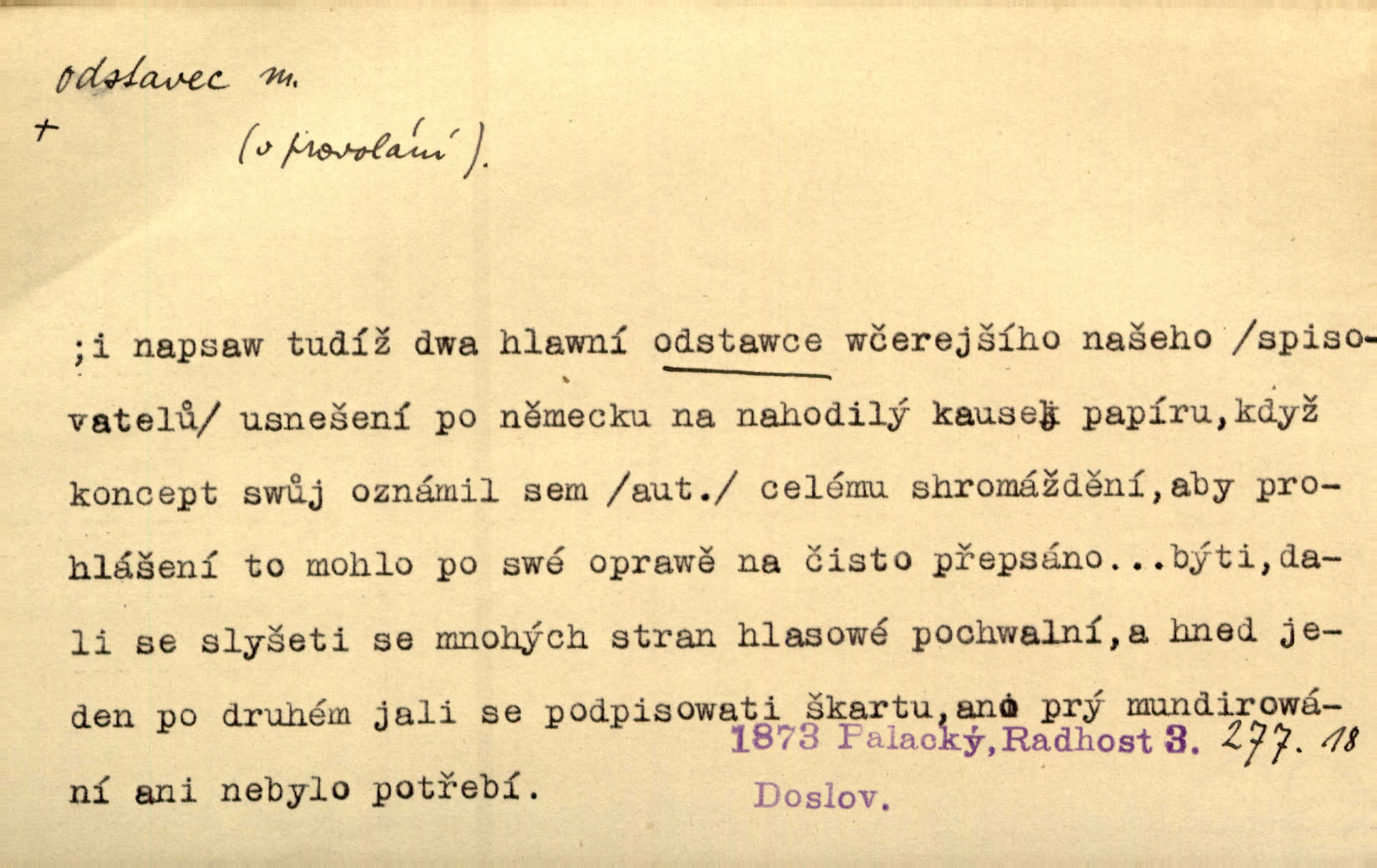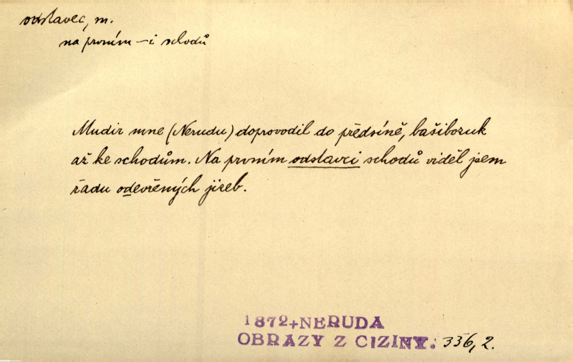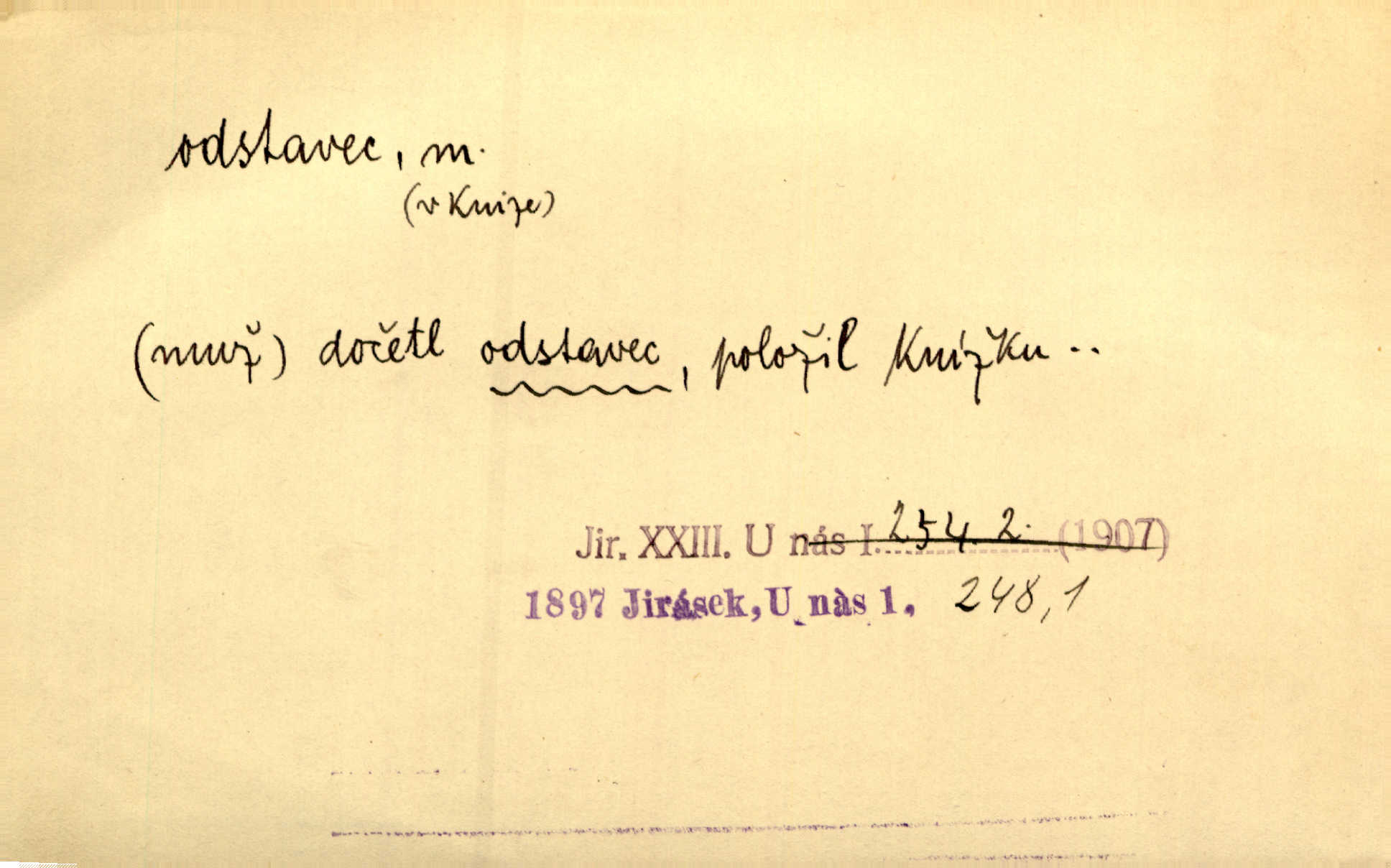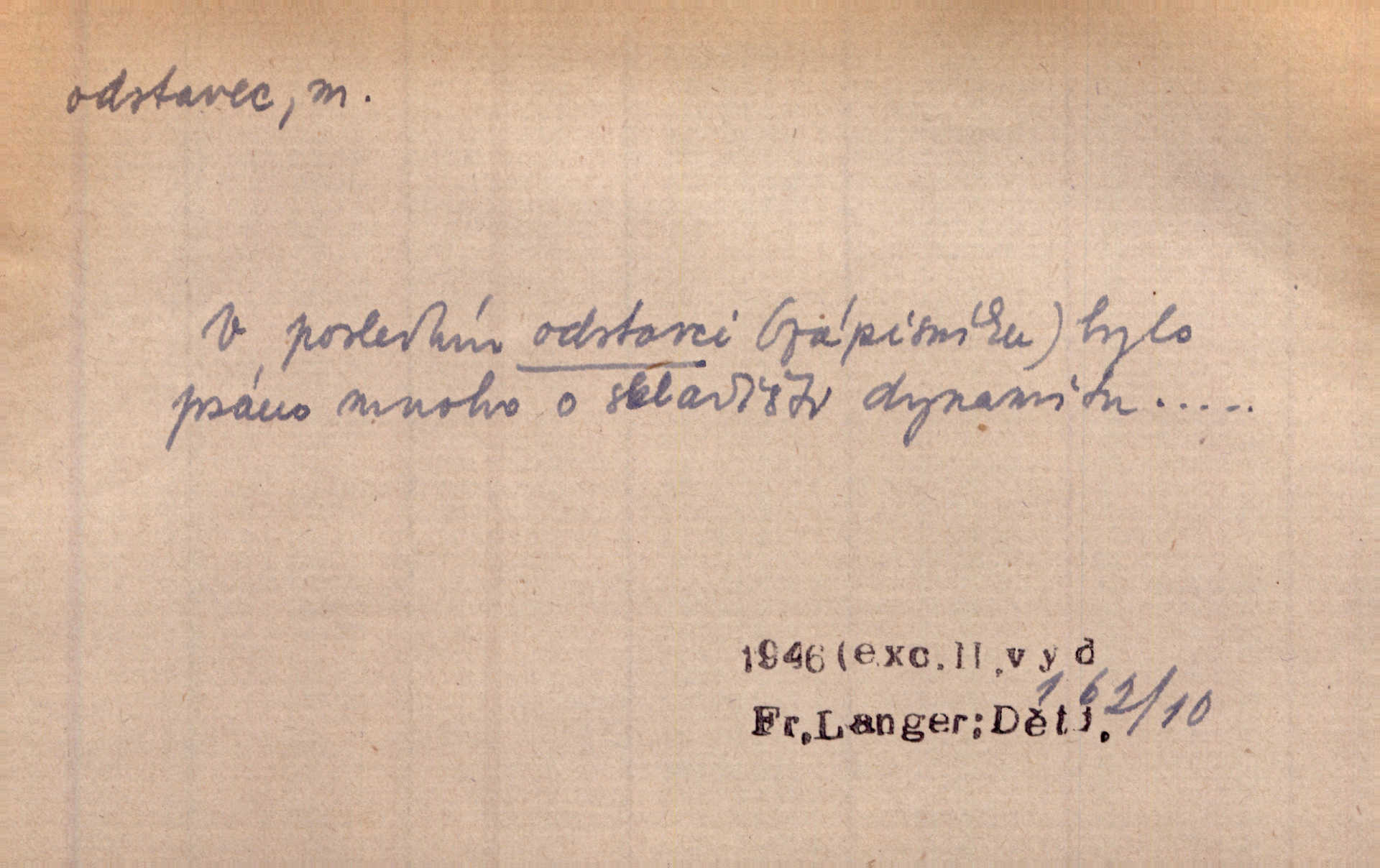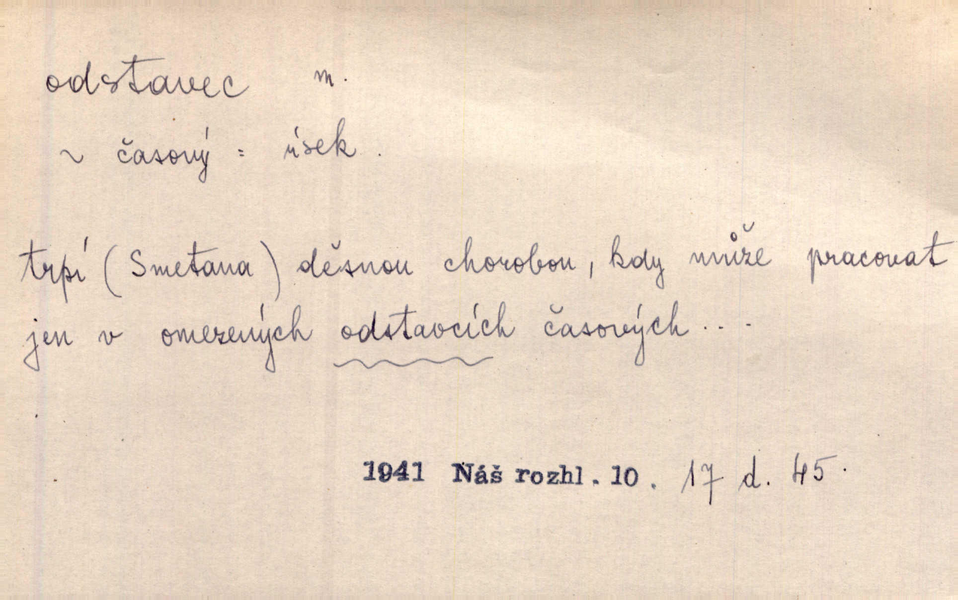 - odstavec, -vce m. oddíl nějakého textu. Dočetl odstavec, položil knížku. Jir. Tento odstavec nám minule konfiskovali. Mach. [Tak nebožtík] v poslední vůli své ve zvláštním odstavci ustanovil. Světozor. D oddíl něčeho vůbec, část. Společnost táhla se [z výletu] jako růženec v malých odstavcích po dvou a po třech. R. Svob. Rozděloval si celou vzdálenost na kratší odstavce. Čap. Ch. Snad může i pro mne začíti nový, lepší odstavec života. Čech. Čas plyne pořád stejně dál, v tom není odstavců ani změny. Ner. Mezi výhní a kovadlinou putují železné pruty v stejných odstavcích času nekonečně sem a tam intervalech. Ner. Potom další odstavec takové události rodinné: slavné zasnoubení článek. Herrm. Poslední odstavec slavnostního programu číslo. Čap. Ch. D Zř. plošina mezi dvěma oddíly schodů, odpočivadlo. Přešli jediný odstavec schodů a již se hospodář zastavil u šedě natřených dveří. Nov. Na prvním odstavci schodů viděl jsem řadu odevřených jizeb. Ner. Muž ji [na schodech] předhonil, a když konečně hlavu pozvedla, spatřila na druhém odstavci stát Heilbronna. Til.