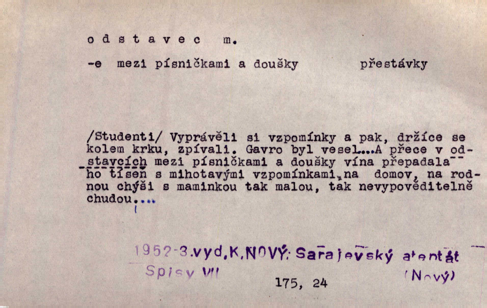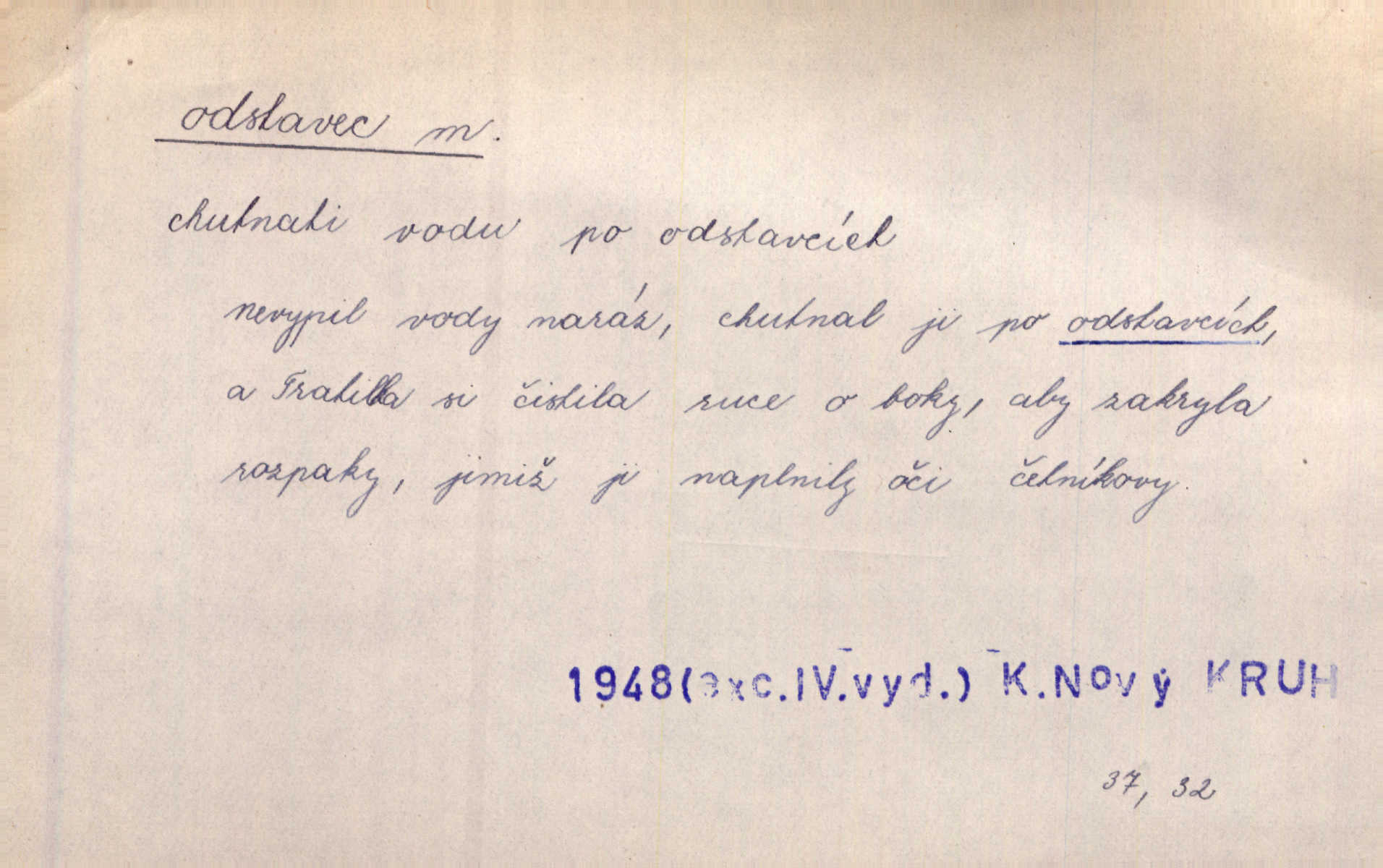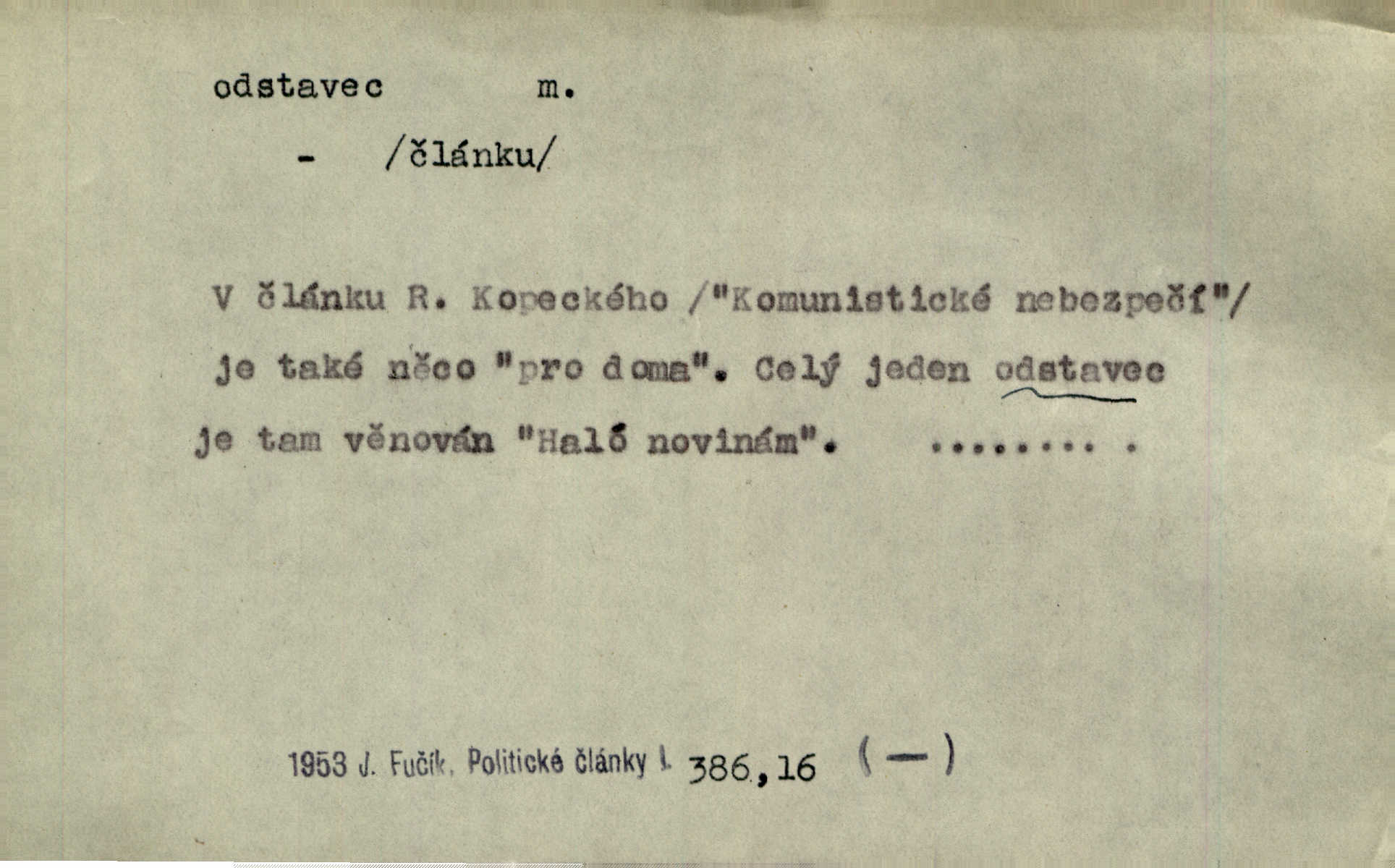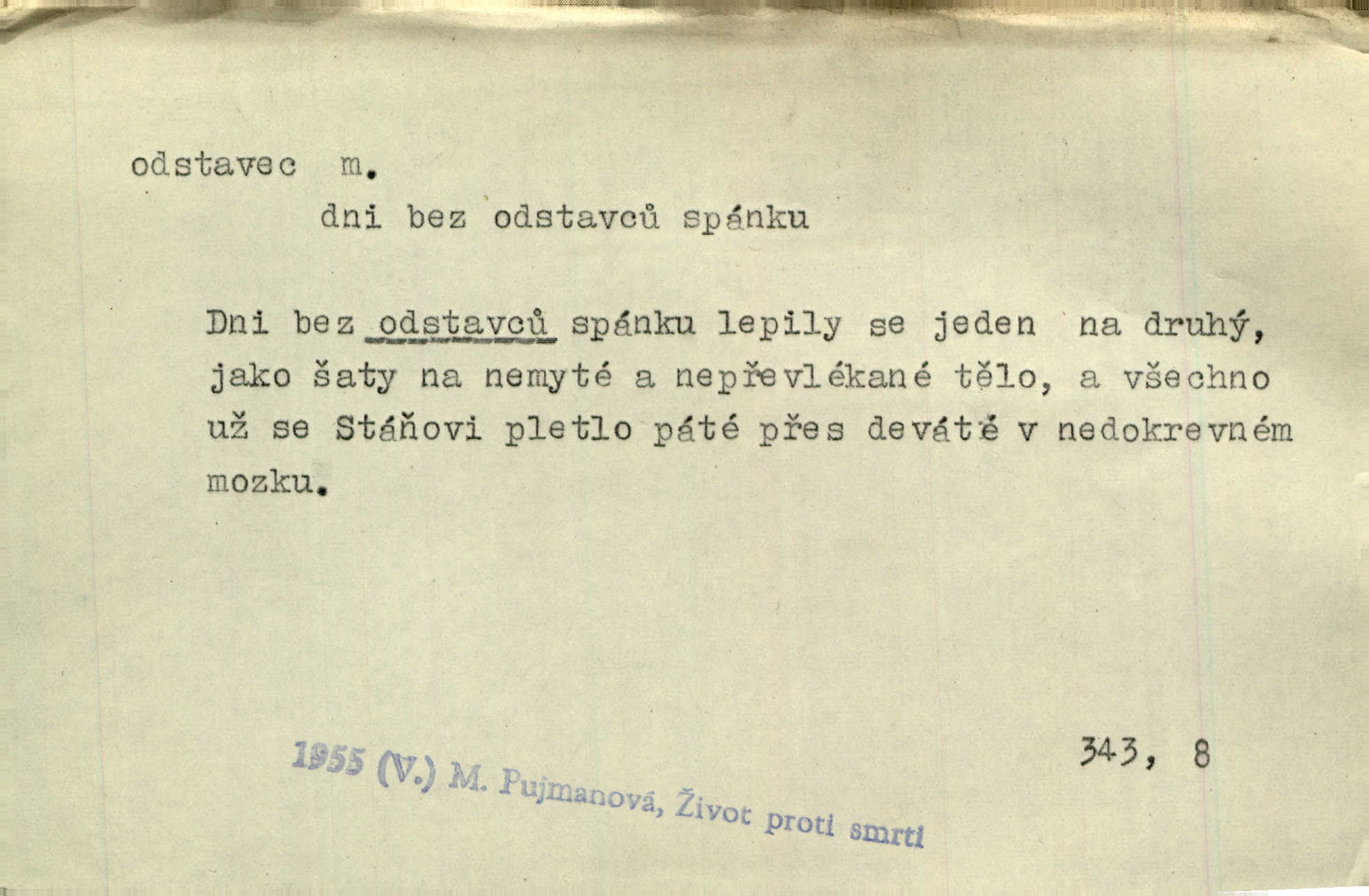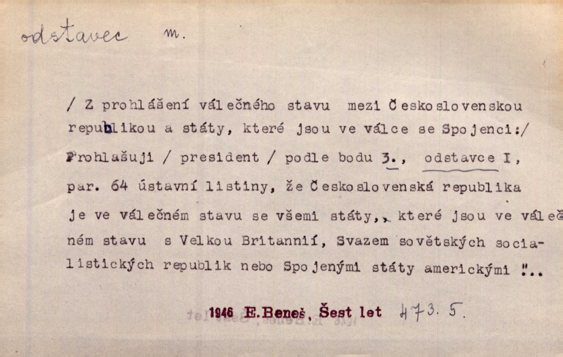 - odstavec, -vce m. oddíl nějakého textu. Dočetl odstavec, položil knížku. Jir. Tento odstavec nám minule konfiskovali. Mach. [Tak nebožtík] v poslední vůli své ve zvláštním odstavci ustanovil. Světozor. D oddíl něčeho vůbec, část. Společnost táhla se [z výletu] jako růženec v malých odstavcích po dvou a po třech. R. Svob. Rozděloval si celou vzdálenost na kratší odstavce. Čap. Ch. Snad může i pro mne začíti nový, lepší odstavec života. Čech. Čas plyne pořád stejně dál, v tom není odstavců ani změny. Ner. Mezi výhní a kovadlinou putují železné pruty v stejných odstavcích času nekonečně sem a tam intervalech. Ner. Potom další odstavec takové události rodinné: slavné zasnoubení článek. Herrm. Poslední odstavec slavnostního programu číslo. Čap. Ch. D Zř. plošina mezi dvěma oddíly schodů, odpočivadlo. Přešli jediný odstavec schodů a již se hospodář zastavil u šedě natřených dveří. Nov. Na prvním odstavci schodů viděl jsem řadu odevřených jizeb. Ner. Muž ji [na schodech] předhonil, a když konečně hlavu pozvedla, spatřila na druhém odstavci stát Heilbronna. Til.