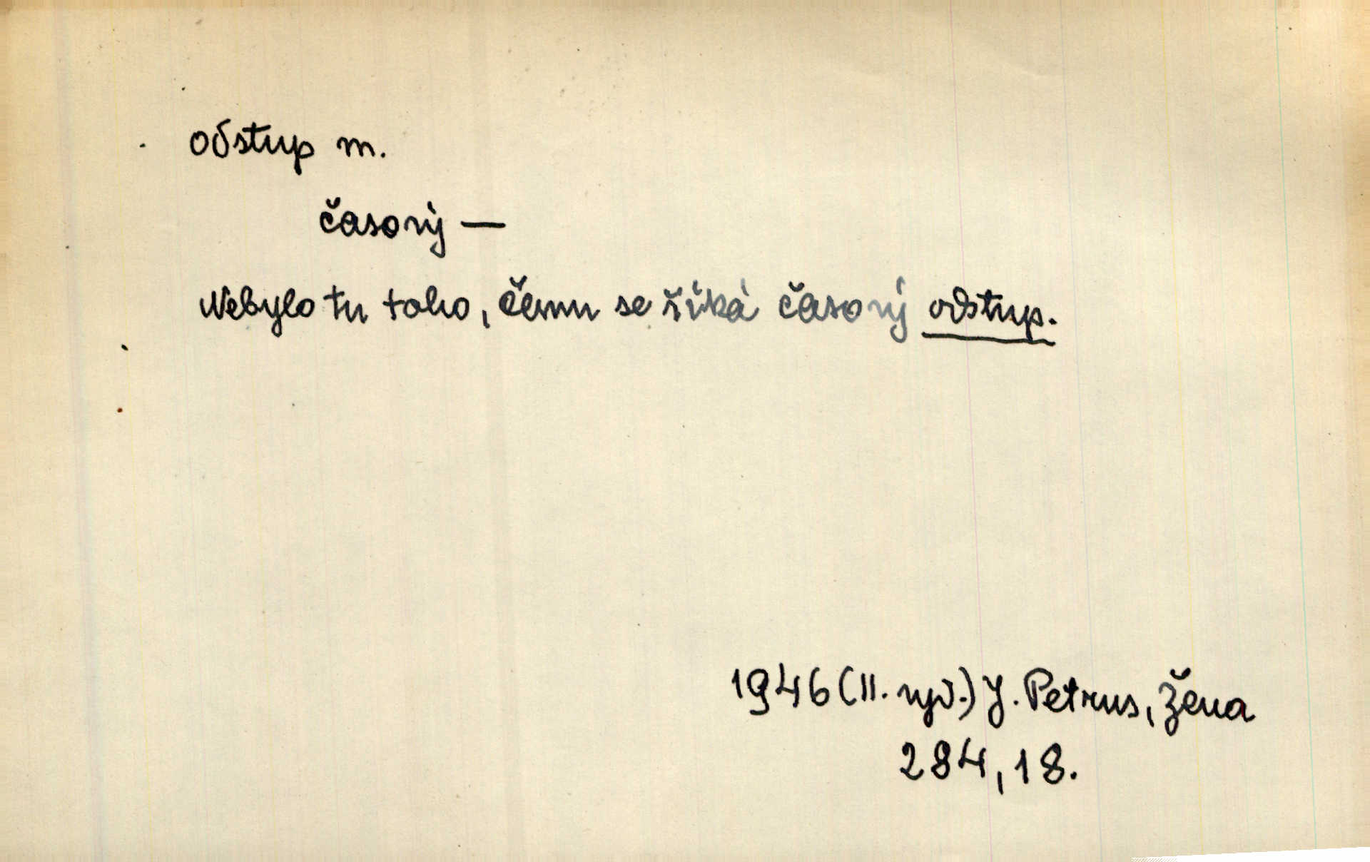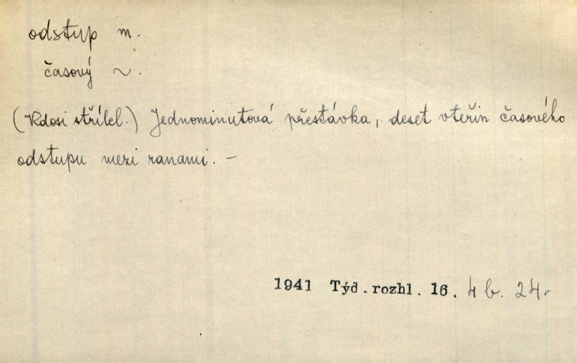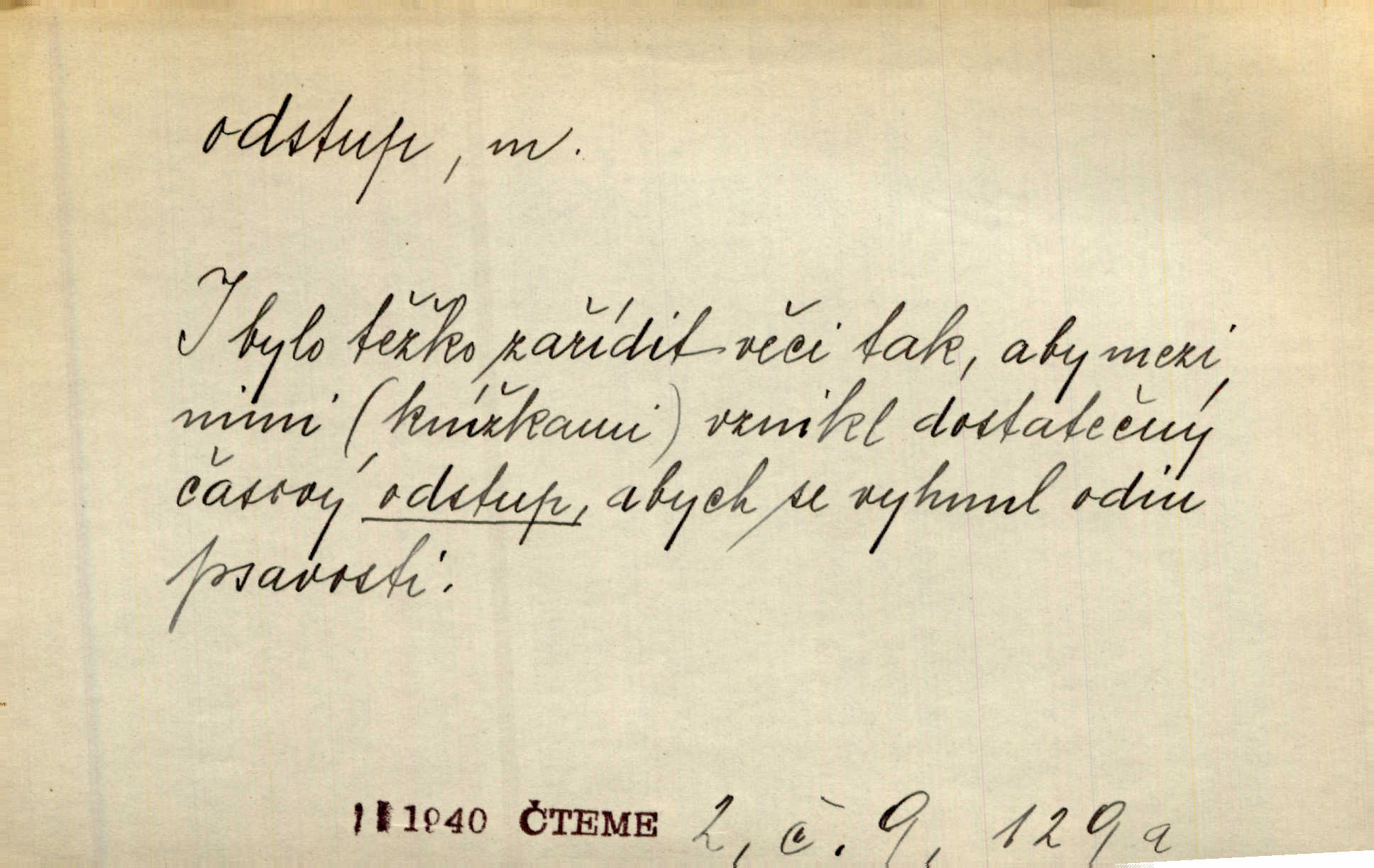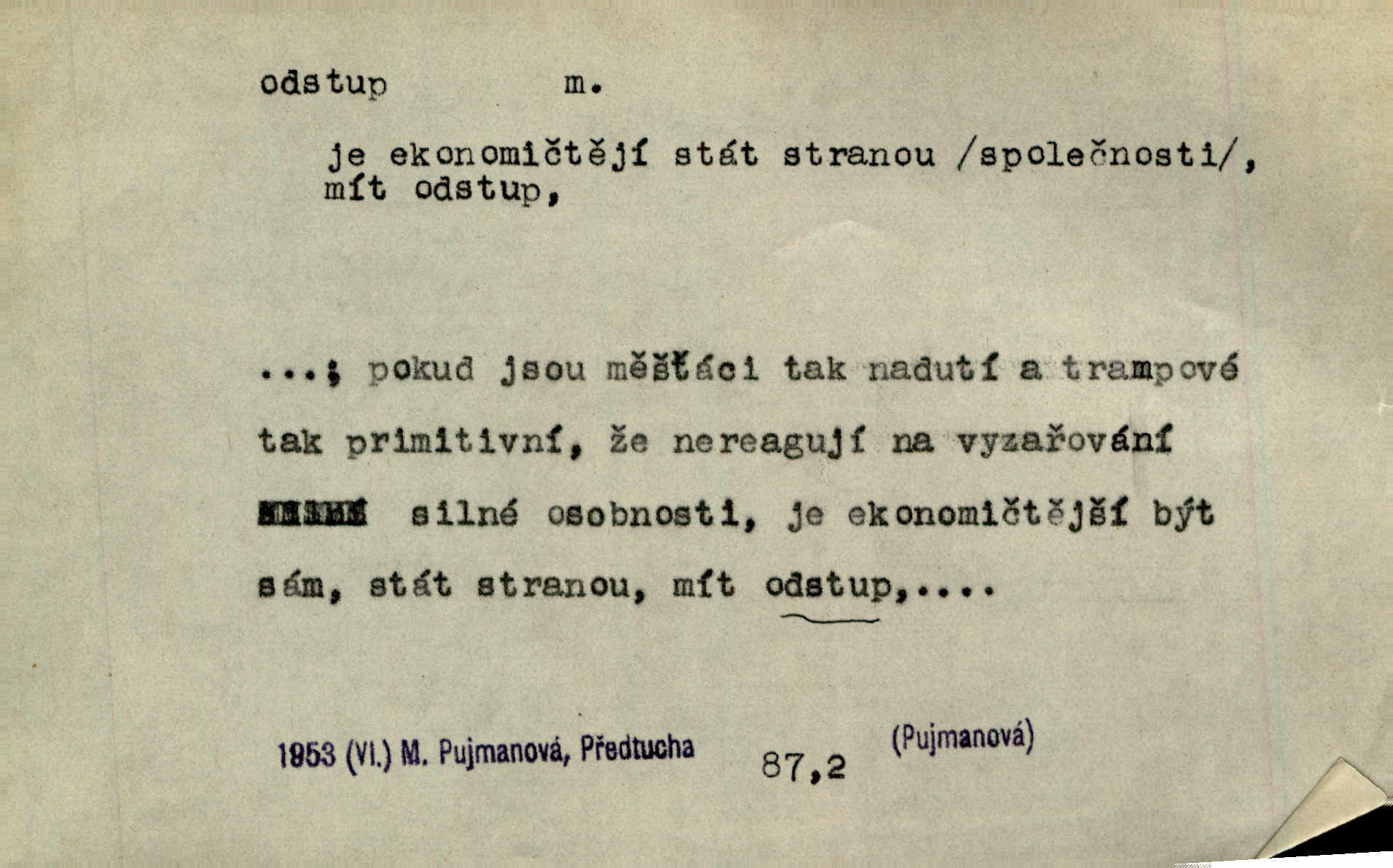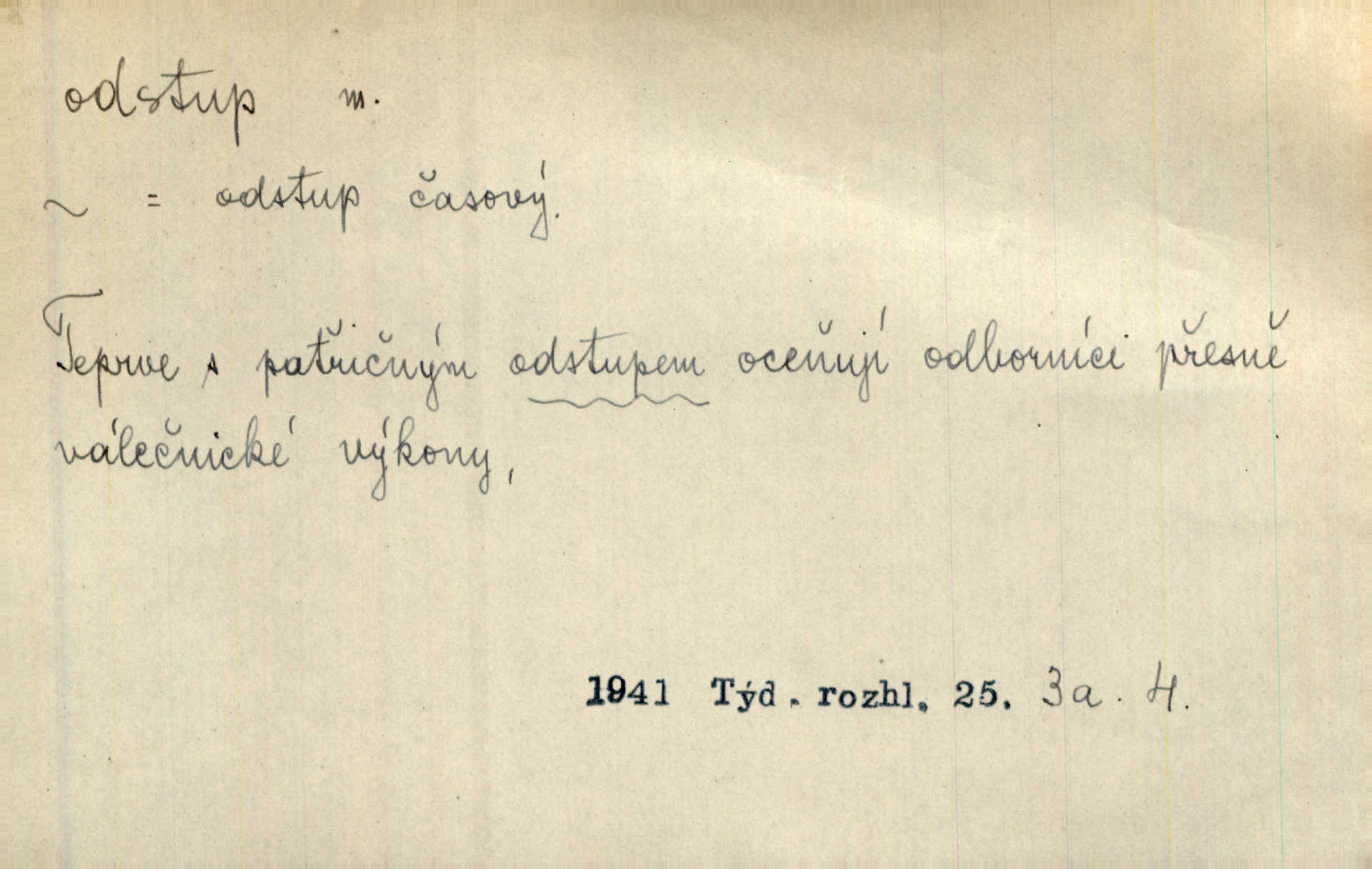- odstup, -u m. odstoupení, odchod. Máš mít volný přístup i odstup. J. Malý. Uprostřed ní [vřavy] vstal, zapotácel se v odstupu od stolu. Vrba. Dozírali, jak se konal právě nástup a odstup dvou směn [pekařů]. Vach. Generace odcházející neví, kde je cesta k čestnému a zaslouženému odstupu odchodu (do nečinnosti). Kun. [Snaha Sigmundova,] aby lichého papeže přiměl k odstupu odstoupení z úřadu. Helf. Geol. pozvolný ústup moře s pevniny, regrese. D odstoupení na jistou vzdálenost; místní mezera. Na chodníku mezi sebou zachovávali odstup dvou kroků, jen tak, aby se slyšeli. Čap. Ch. Magická moc, která by mohla spoutat přesilu fysickou a držet ji na odstup. Šal. Všichni kolem stolu vstávali a snažili se v odstupu viděti jasněji [co je na obraze]. Kop. Šerm. vzdálení se krokem od soka. D časový interval, časová vzdálenost. Mezi ukončením [sněmovního] zasedání jednoho a zahájením druhého není téměř odstupu. Sobota. Postavy jejich [hrdinů] musely růst; teprve po smrti a po delším časovém odstupu. Hol. Jsou díla, která potřebují odstupu, aby jich velikost mohla být chápána. Mach. Souvěkovcům se obraz ten jevil ve světle zcela jiném než nám, z dalekého odstupu věc pozorujícím. Šus. D rozdíl mezi dvěma hodnotami. I tady [v socialismu] se ukáže jistý odstup mezi myšlenkou a skutečností. Přít. Úměrný odstup mezi služným. Plat. zák. D odměřené, chladné n. hrdé chování. [Syn, který se vrátil domů,] byl připraven na zvědavé otázky, ale polekal ho odstup všech stejně, jako podezřelá příchylnost dědova. Vrba. [Zeyer] dovedl si zachovávati odstup a krásné gesto samotářské. J. Kvap. Nadutost k služebnictvu a upřílišený odstup k úřednictvu povýšené chování. Vrba. Zachovával osobní odstup od tohoto mladého bouřliváka chladný odklon. Ben. D vystoupení z církve. [Tajni evangelíci] na faře svůj odstup ohlásili. Jir. D odchýlení, odklon. Daleko silnější odstup od revolucionismu jeví se později u Engelse. Čes. pol. Odstup od skutečnosti svádí [básníka] k jakémusi plošnému líčení vnějšího světa. Hrb. D vzdání se něčeho. Odstup nějaké části země cizině. Čes. pol. Znal dobře svého staršího syna, a proto nedovedl uvěřiti, že by jeho odstup z práv prvenství byl míněn jen tak prostně a bez kličky. Vrba.
