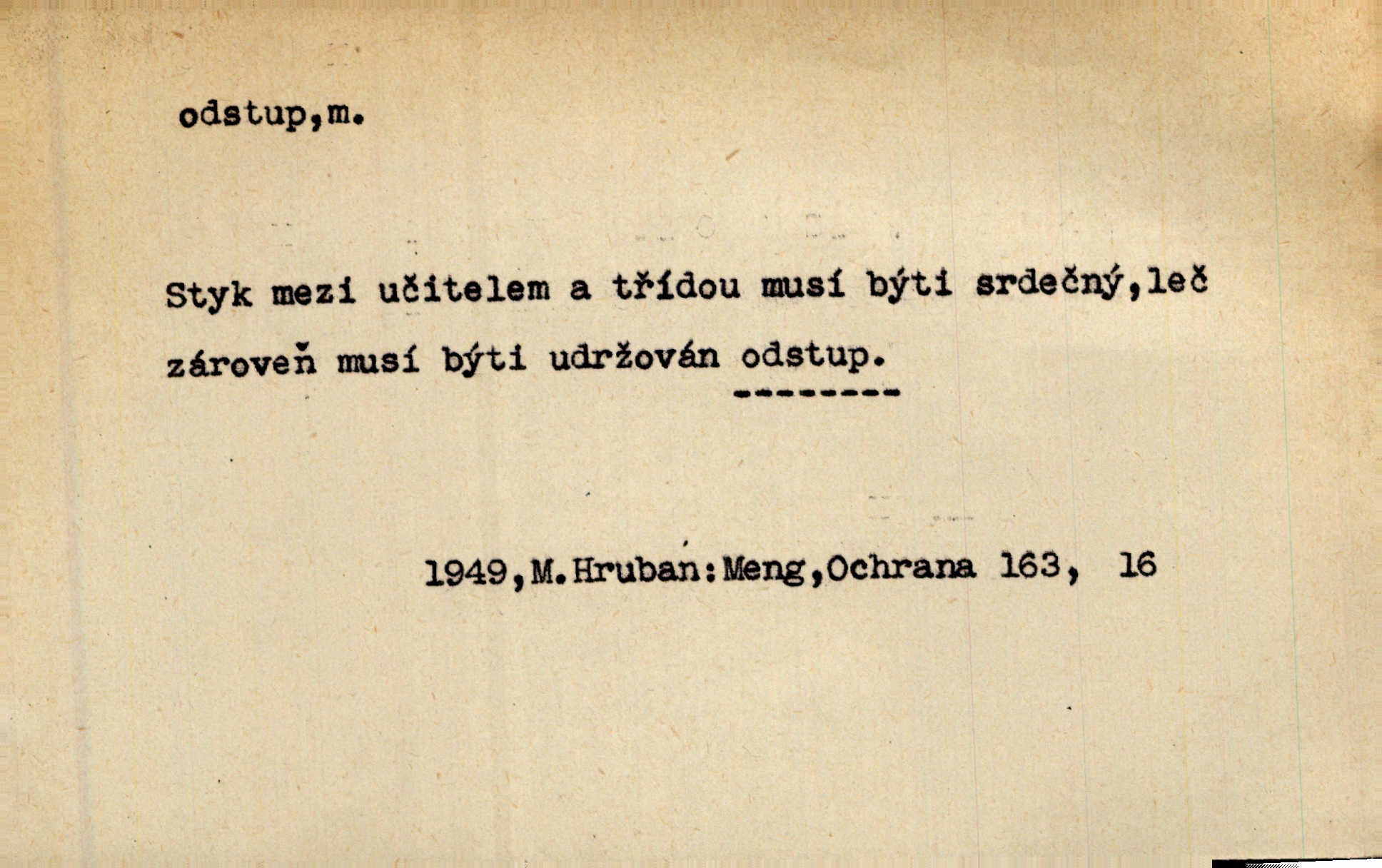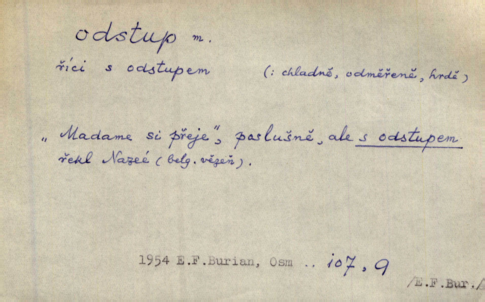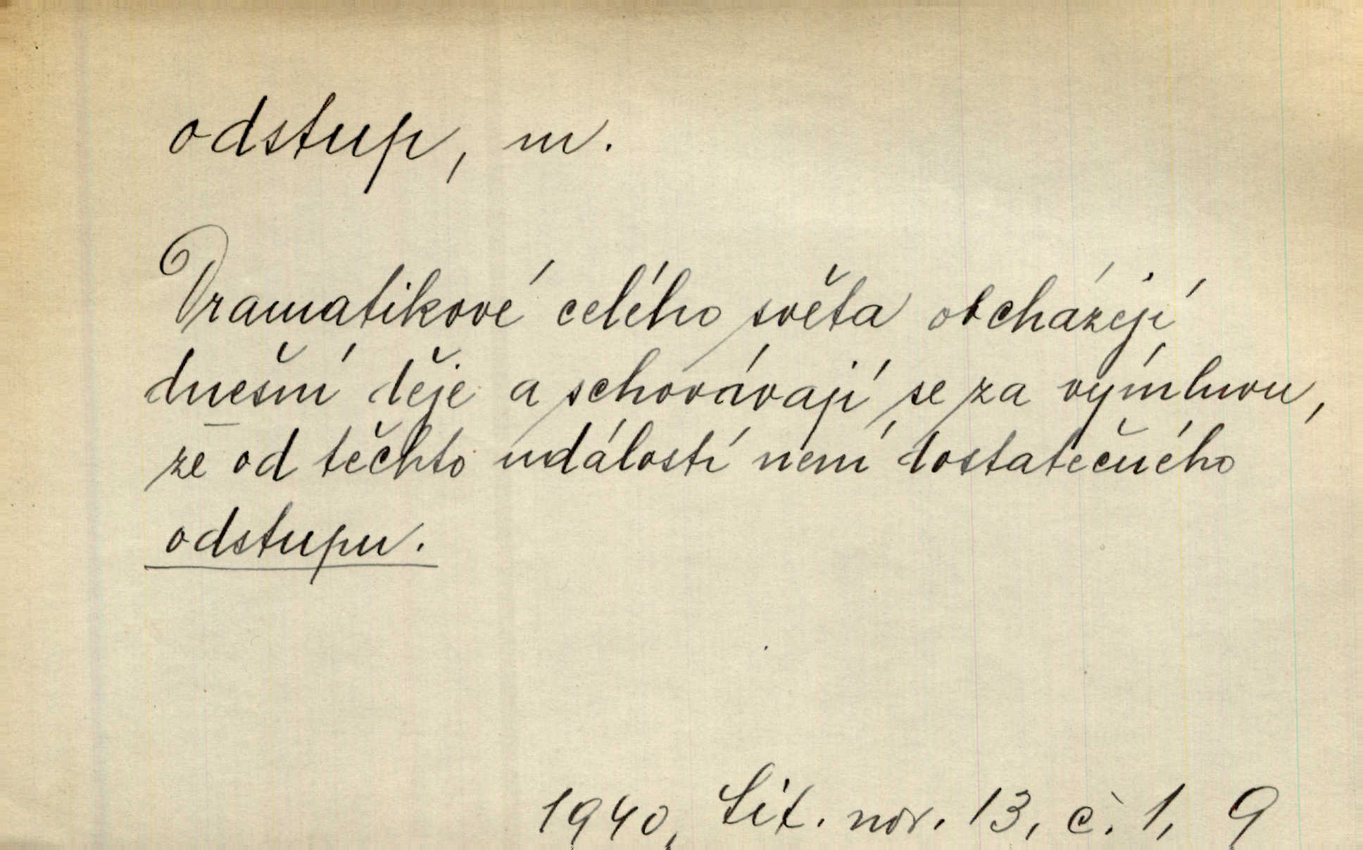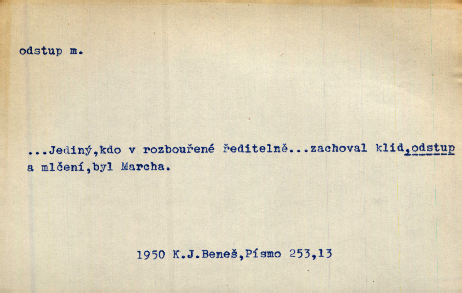 - odstup, -u m. odstoupení, odchod. Máš mít volný přístup i odstup. J. Malý. Uprostřed ní [vřavy] vstal, zapotácel se v odstupu od stolu. Vrba. Dozírali, jak se konal právě nástup a odstup dvou směn [pekařů]. Vach. Generace odcházející neví, kde je cesta k čestnému a zaslouženému odstupu odchodu (do nečinnosti). Kun. [Snaha Sigmundova,] aby lichého papeže přiměl k odstupu odstoupení z úřadu. Helf. Geol. pozvolný ústup moře s pevniny, regrese. D odstoupení na jistou vzdálenost; místní mezera. Na chodníku mezi sebou zachovávali odstup dvou kroků, jen tak, aby se slyšeli. Čap. Ch. Magická moc, která by mohla spoutat přesilu fysickou a držet ji na odstup. Šal. Všichni kolem stolu vstávali a snažili se v odstupu viděti jasněji [co je na obraze]. Kop. Šerm. vzdálení se krokem od soka. D časový interval, časová vzdálenost. Mezi ukončením [sněmovního] zasedání jednoho a zahájením druhého není téměř odstupu. Sobota. Postavy jejich [hrdinů] musely růst; teprve po smrti a po delším časovém odstupu. Hol. Jsou díla, která potřebují odstupu, aby jich velikost mohla být chápána. Mach. Souvěkovcům se obraz ten jevil ve světle zcela jiném než nám, z dalekého odstupu věc pozorujícím. Šus. D rozdíl mezi dvěma hodnotami. I tady [v socialismu] se ukáže jistý odstup mezi myšlenkou a skutečností. Přít. Úměrný odstup mezi služným. Plat. zák. D odměřené, chladné n. hrdé chování. [Syn, který se vrátil domů,] byl připraven na zvědavé otázky, ale polekal ho odstup všech stejně, jako podezřelá příchylnost dědova. Vrba. [Zeyer] dovedl si zachovávati odstup a krásné gesto samotářské. J. Kvap. Nadutost k služebnictvu a upřílišený odstup k úřednictvu povýšené chování. Vrba. Zachovával osobní odstup od tohoto mladého bouřliváka chladný odklon. Ben. D vystoupení z církve. [Tajni evangelíci] na faře svůj odstup ohlásili. Jir. D odchýlení, odklon. Daleko silnější odstup od revolucionismu jeví se později u Engelse. Čes. pol. Odstup od skutečnosti svádí [básníka] k jakémusi plošnému líčení vnějšího světa. Hrb. D vzdání se něčeho. Odstup nějaké části země cizině. Čes. pol. Znal dobře svého staršího syna, a proto nedovedl uvěřiti, že by jeho odstup z práv prvenství byl míněn jen tak prostně a bez kličky. Vrba.