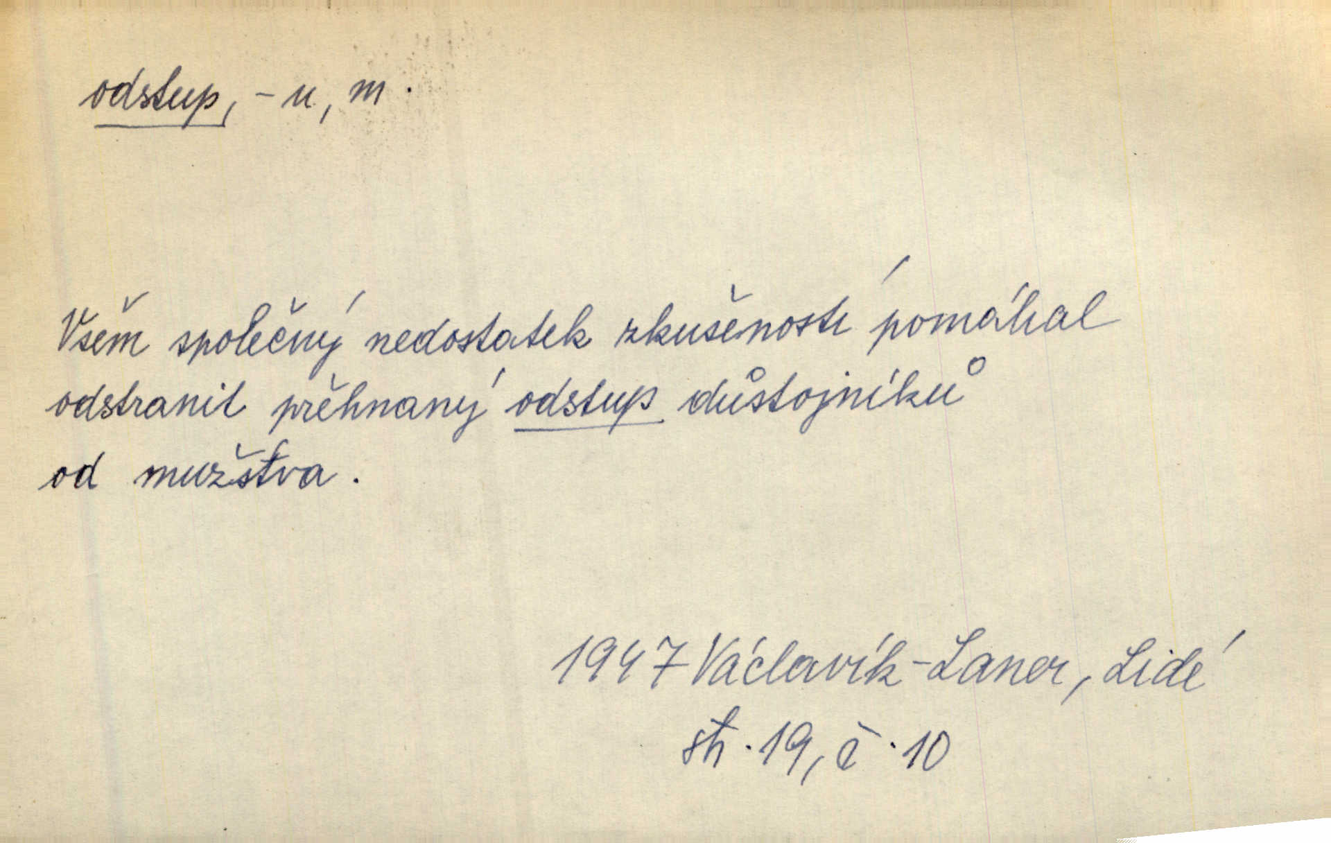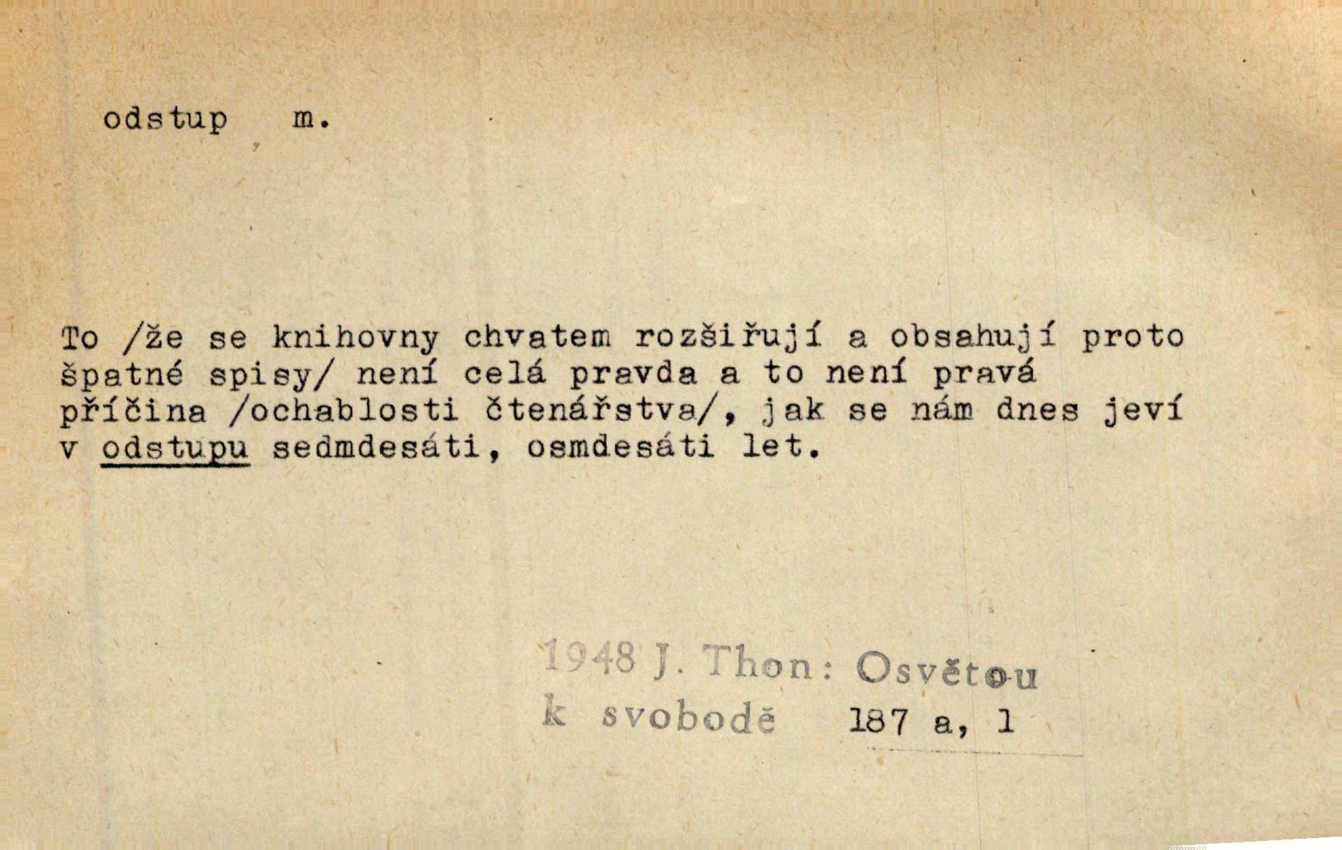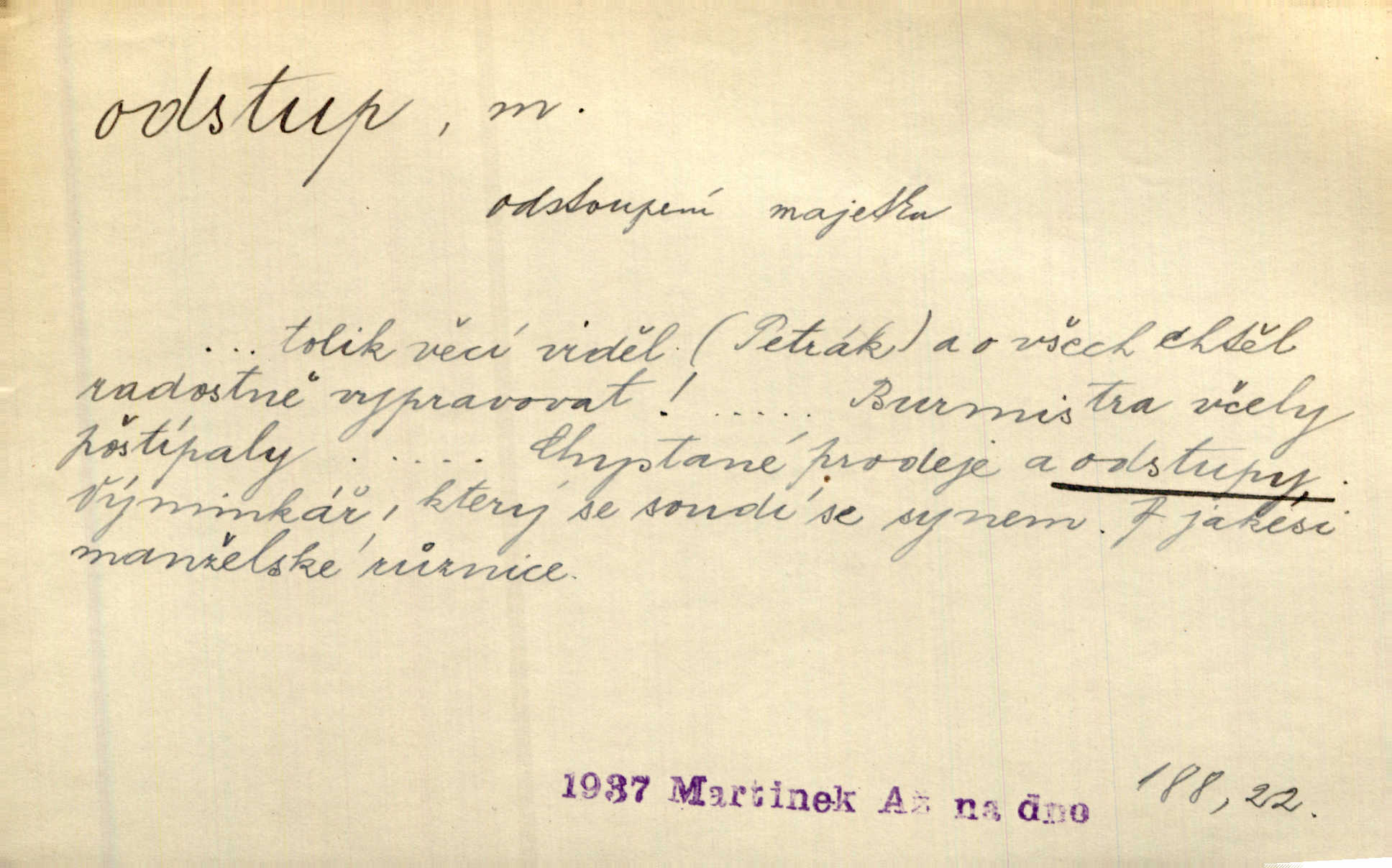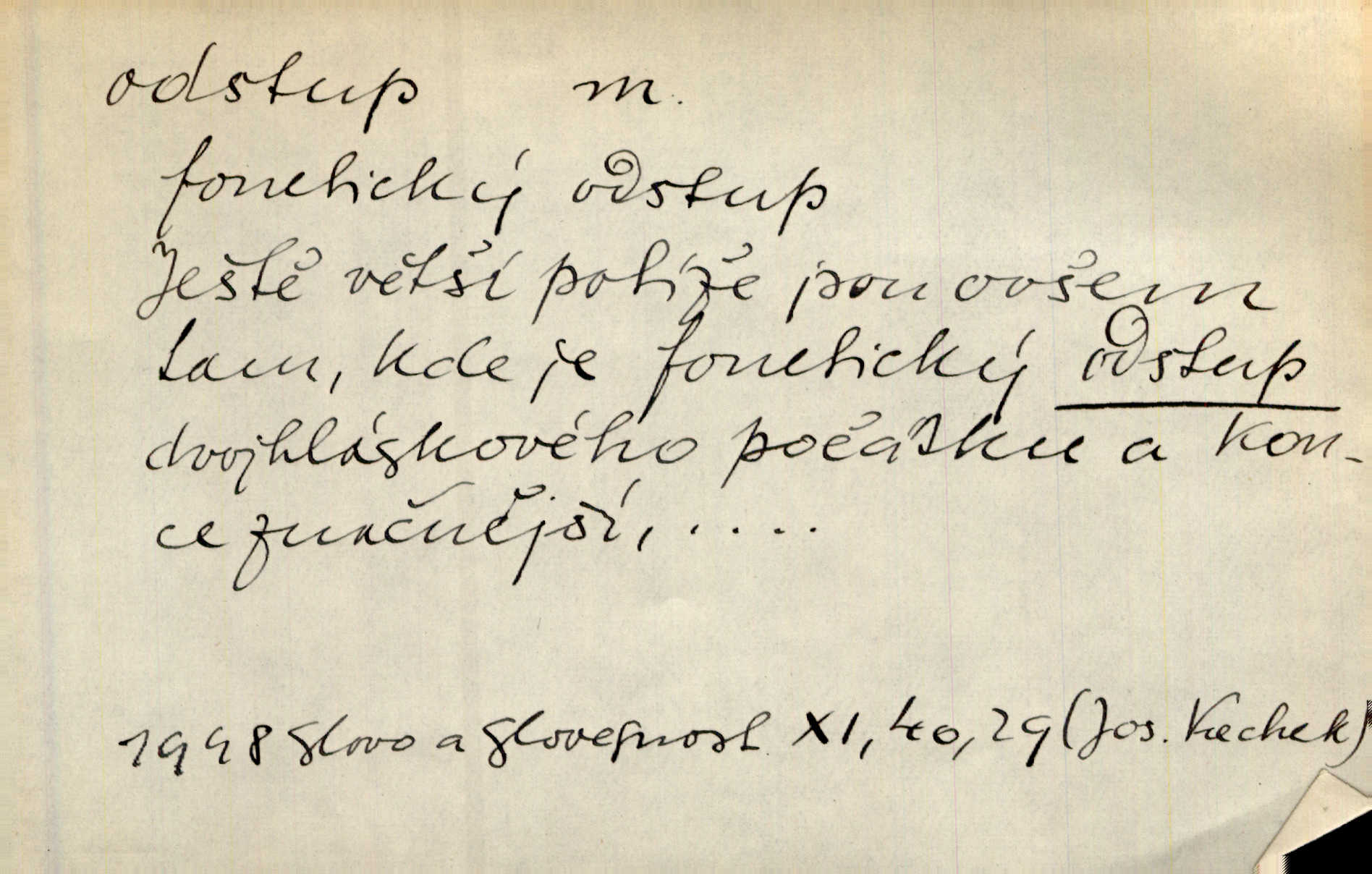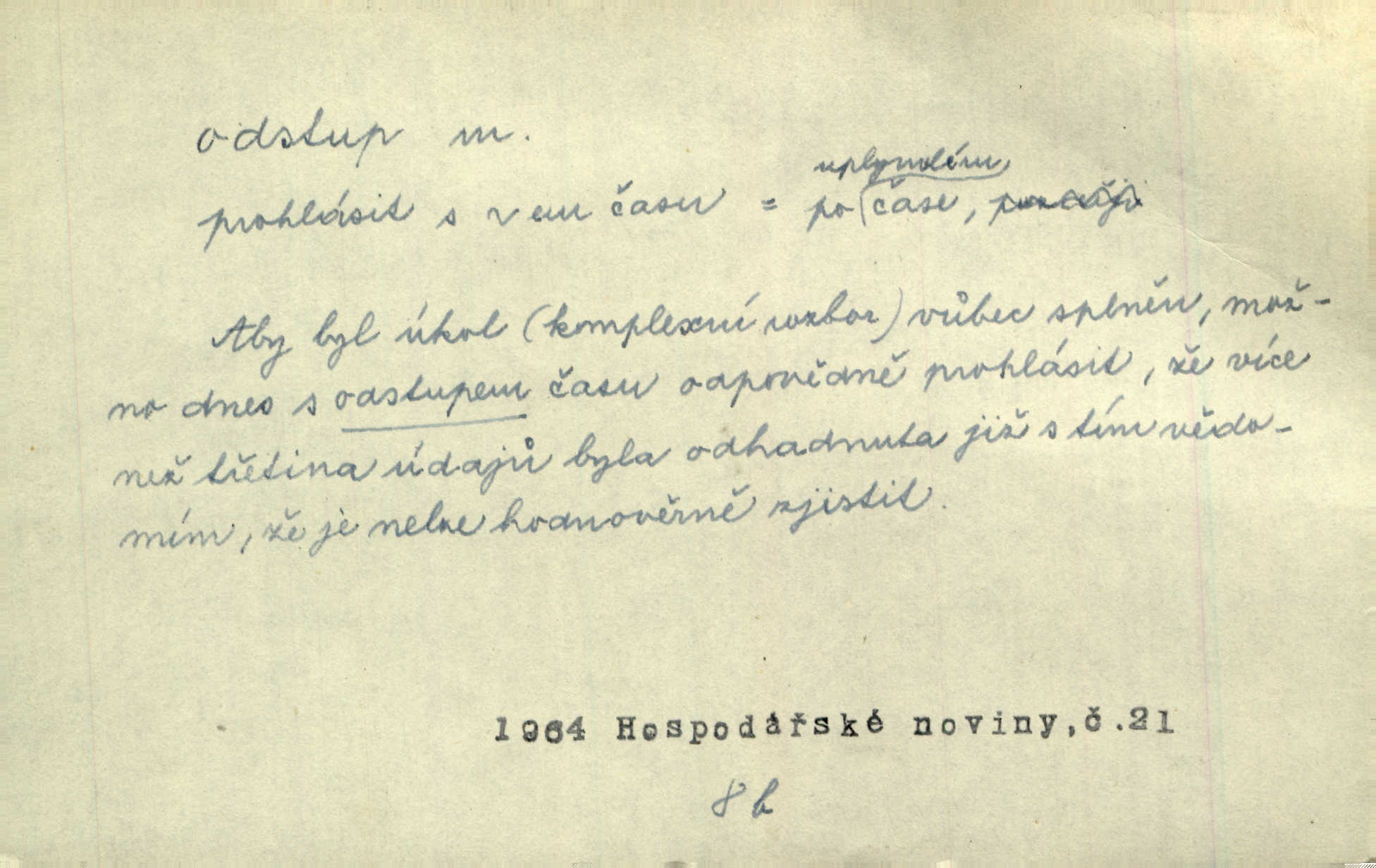 - odstup, -u m. odstoupení, odchod. Máš mít volný přístup i odstup. J. Malý. Uprostřed ní [vřavy] vstal, zapotácel se v odstupu od stolu. Vrba. Dozírali, jak se konal právě nástup a odstup dvou směn [pekařů]. Vach. Generace odcházející neví, kde je cesta k čestnému a zaslouženému odstupu odchodu (do nečinnosti). Kun. [Snaha Sigmundova,] aby lichého papeže přiměl k odstupu odstoupení z úřadu. Helf. Geol. pozvolný ústup moře s pevniny, regrese. D odstoupení na jistou vzdálenost; místní mezera. Na chodníku mezi sebou zachovávali odstup dvou kroků, jen tak, aby se slyšeli. Čap. Ch. Magická moc, která by mohla spoutat přesilu fysickou a držet ji na odstup. Šal. Všichni kolem stolu vstávali a snažili se v odstupu viděti jasněji [co je na obraze]. Kop. Šerm. vzdálení se krokem od soka. D časový interval, časová vzdálenost. Mezi ukončením [sněmovního] zasedání jednoho a zahájením druhého není téměř odstupu. Sobota. Postavy jejich [hrdinů] musely růst; teprve po smrti a po delším časovém odstupu. Hol. Jsou díla, která potřebují odstupu, aby jich velikost mohla být chápána. Mach. Souvěkovcům se obraz ten jevil ve světle zcela jiném než nám, z dalekého odstupu věc pozorujícím. Šus. D rozdíl mezi dvěma hodnotami. I tady [v socialismu] se ukáže jistý odstup mezi myšlenkou a skutečností. Přít. Úměrný odstup mezi služným. Plat. zák. D odměřené, chladné n. hrdé chování. [Syn, který se vrátil domů,] byl připraven na zvědavé otázky, ale polekal ho odstup všech stejně, jako podezřelá příchylnost dědova. Vrba. [Zeyer] dovedl si zachovávati odstup a krásné gesto samotářské. J. Kvap. Nadutost k služebnictvu a upřílišený odstup k úřednictvu povýšené chování. Vrba. Zachovával osobní odstup od tohoto mladého bouřliváka chladný odklon. Ben. D vystoupení z církve. [Tajni evangelíci] na faře svůj odstup ohlásili. Jir. D odchýlení, odklon. Daleko silnější odstup od revolucionismu jeví se později u Engelse. Čes. pol. Odstup od skutečnosti svádí [básníka] k jakémusi plošnému líčení vnějšího světa. Hrb. D vzdání se něčeho. Odstup nějaké části země cizině. Čes. pol. Znal dobře svého staršího syna, a proto nedovedl uvěřiti, že by jeho odstup z práv prvenství byl míněn jen tak prostně a bez kličky. Vrba.