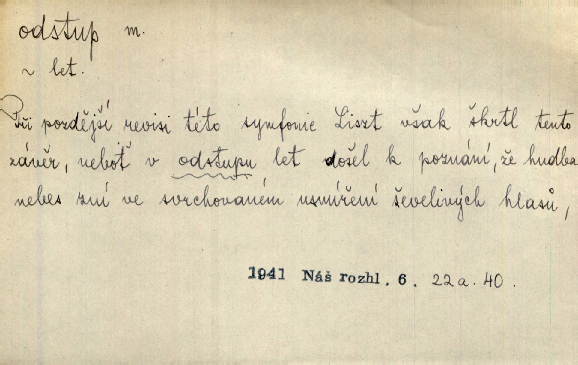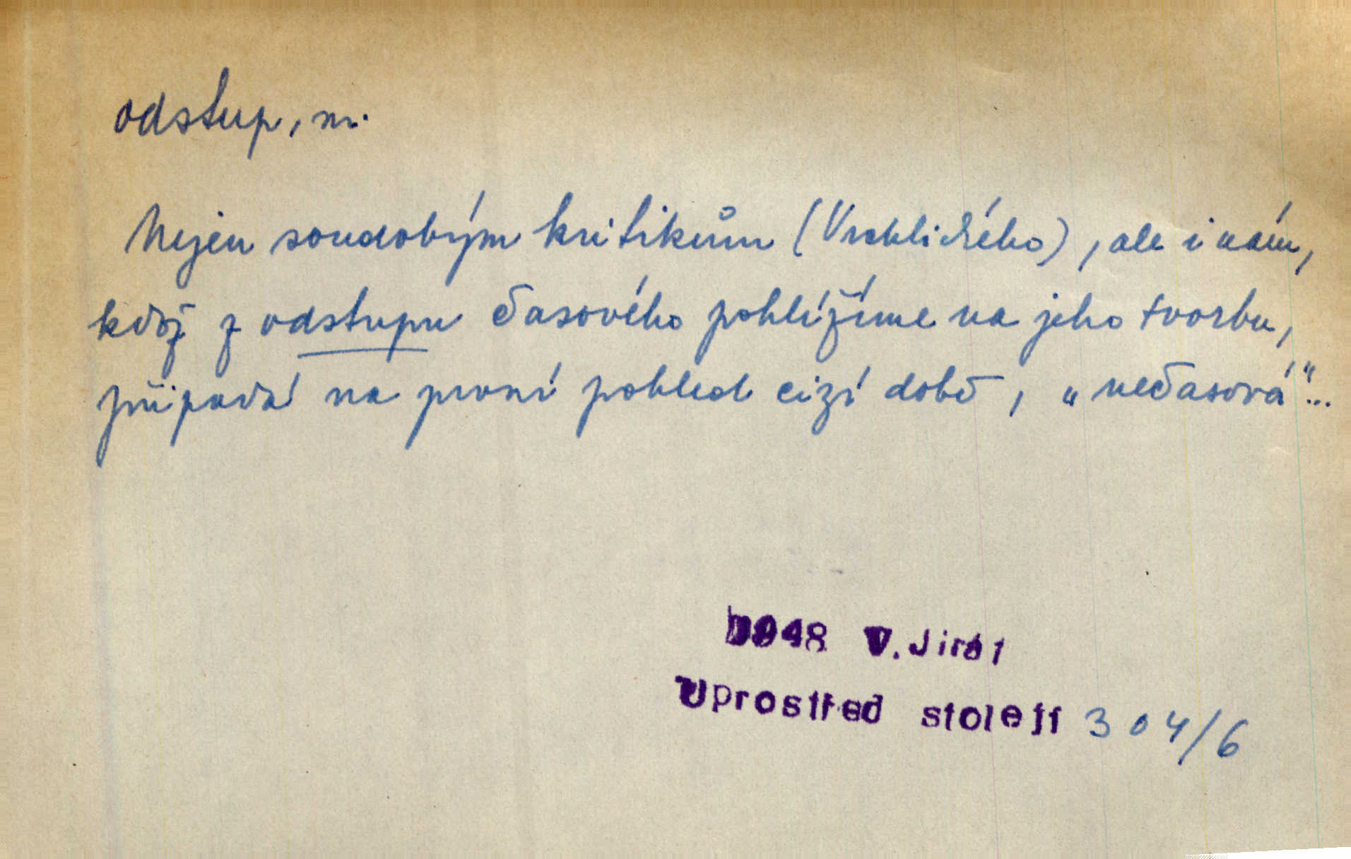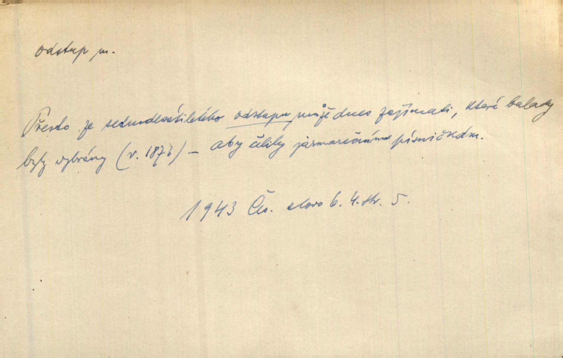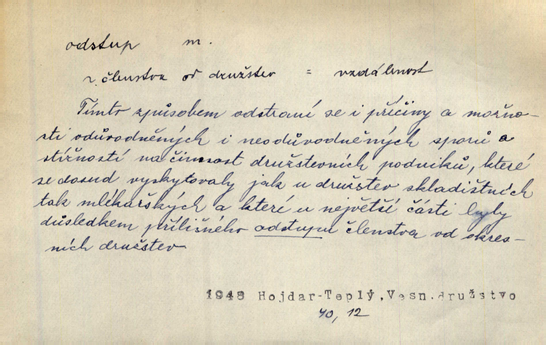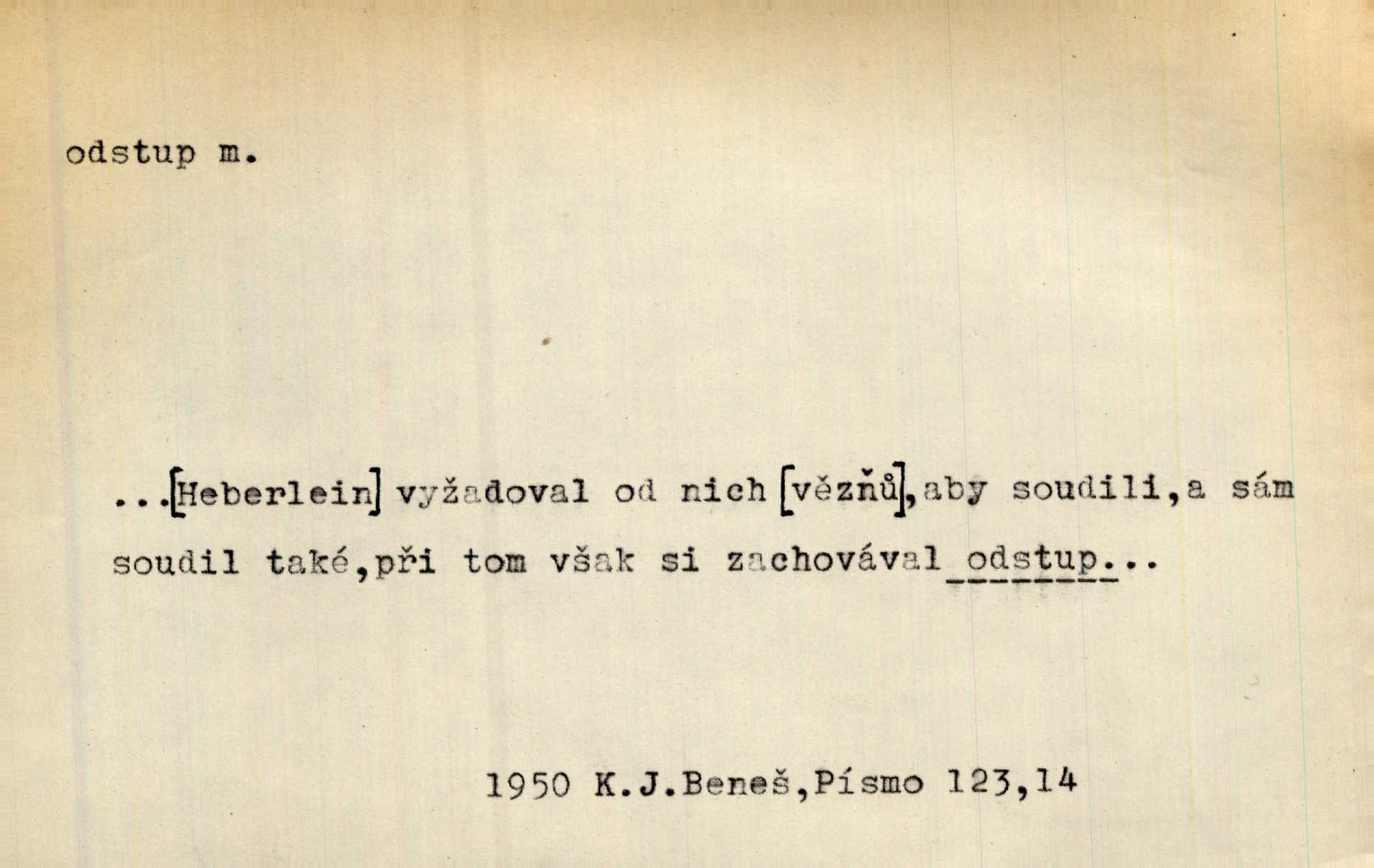 - odstup, -u m. odstoupení, odchod. Máš mít volný přístup i odstup. J. Malý. Uprostřed ní [vřavy] vstal, zapotácel se v odstupu od stolu. Vrba. Dozírali, jak se konal právě nástup a odstup dvou směn [pekařů]. Vach. Generace odcházející neví, kde je cesta k čestnému a zaslouženému odstupu odchodu (do nečinnosti). Kun. [Snaha Sigmundova,] aby lichého papeže přiměl k odstupu odstoupení z úřadu. Helf. Geol. pozvolný ústup moře s pevniny, regrese. D odstoupení na jistou vzdálenost; místní mezera. Na chodníku mezi sebou zachovávali odstup dvou kroků, jen tak, aby se slyšeli. Čap. Ch. Magická moc, která by mohla spoutat přesilu fysickou a držet ji na odstup. Šal. Všichni kolem stolu vstávali a snažili se v odstupu viděti jasněji [co je na obraze]. Kop. Šerm. vzdálení se krokem od soka. D časový interval, časová vzdálenost. Mezi ukončením [sněmovního] zasedání jednoho a zahájením druhého není téměř odstupu. Sobota. Postavy jejich [hrdinů] musely růst; teprve po smrti a po delším časovém odstupu. Hol. Jsou díla, která potřebují odstupu, aby jich velikost mohla být chápána. Mach. Souvěkovcům se obraz ten jevil ve světle zcela jiném než nám, z dalekého odstupu věc pozorujícím. Šus. D rozdíl mezi dvěma hodnotami. I tady [v socialismu] se ukáže jistý odstup mezi myšlenkou a skutečností. Přít. Úměrný odstup mezi služným. Plat. zák. D odměřené, chladné n. hrdé chování. [Syn, který se vrátil domů,] byl připraven na zvědavé otázky, ale polekal ho odstup všech stejně, jako podezřelá příchylnost dědova. Vrba. [Zeyer] dovedl si zachovávati odstup a krásné gesto samotářské. J. Kvap. Nadutost k služebnictvu a upřílišený odstup k úřednictvu povýšené chování. Vrba. Zachovával osobní odstup od tohoto mladého bouřliváka chladný odklon. Ben. D vystoupení z církve. [Tajni evangelíci] na faře svůj odstup ohlásili. Jir. D odchýlení, odklon. Daleko silnější odstup od revolucionismu jeví se později u Engelse. Čes. pol. Odstup od skutečnosti svádí [básníka] k jakémusi plošnému líčení vnějšího světa. Hrb. D vzdání se něčeho. Odstup nějaké části země cizině. Čes. pol. Znal dobře svého staršího syna, a proto nedovedl uvěřiti, že by jeho odstup z práv prvenství byl míněn jen tak prostně a bez kličky. Vrba.