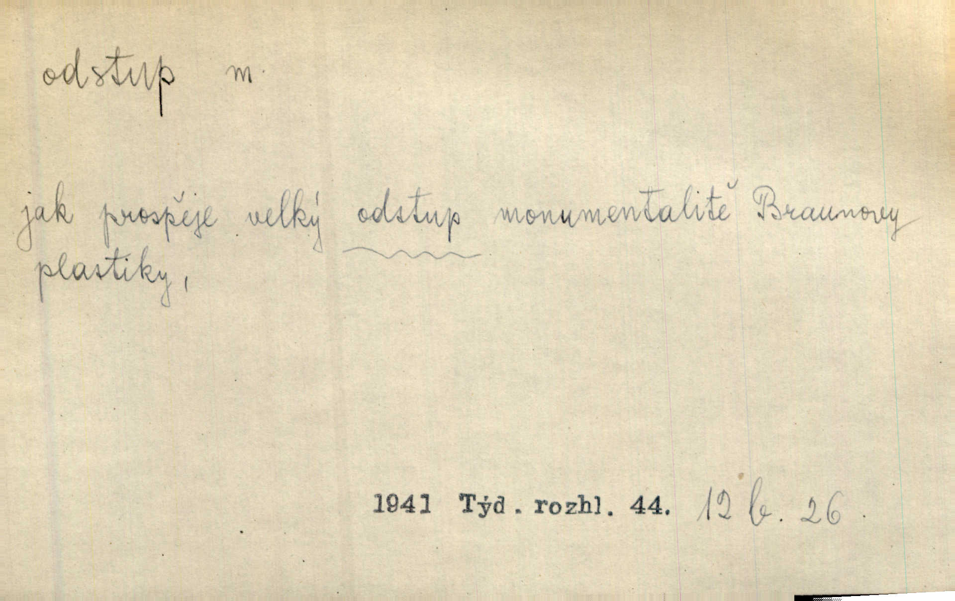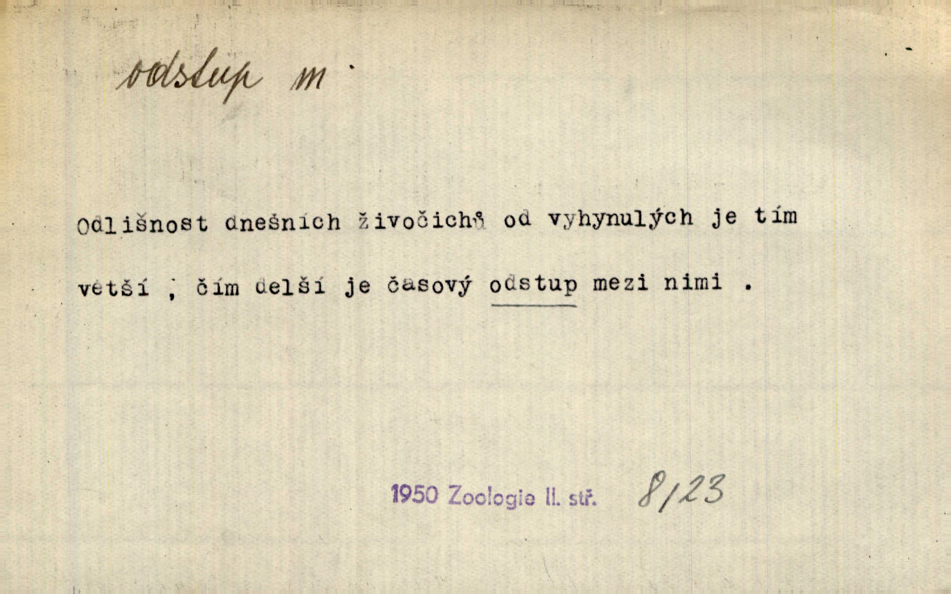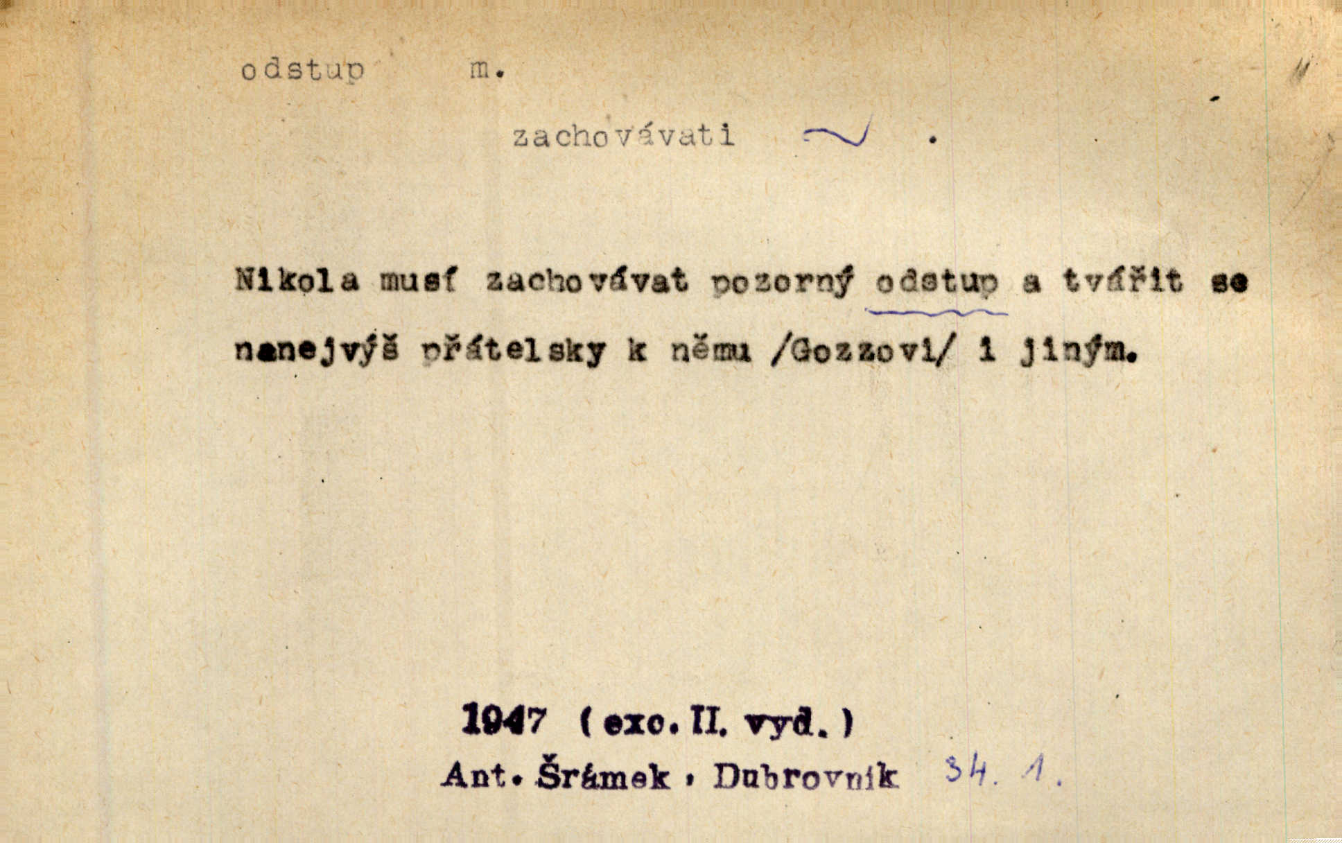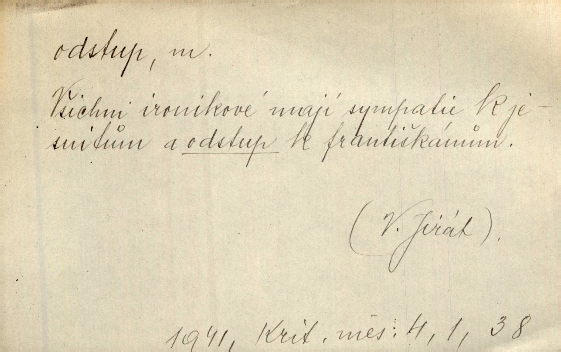 - odstup, -u m. odstoupení, odchod. Máš mít volný přístup i odstup. J. Malý. Uprostřed ní [vřavy] vstal, zapotácel se v odstupu od stolu. Vrba. Dozírali, jak se konal právě nástup a odstup dvou směn [pekařů]. Vach. Generace odcházející neví, kde je cesta k čestnému a zaslouženému odstupu odchodu (do nečinnosti). Kun. [Snaha Sigmundova,] aby lichého papeže přiměl k odstupu odstoupení z úřadu. Helf. Geol. pozvolný ústup moře s pevniny, regrese. D odstoupení na jistou vzdálenost; místní mezera. Na chodníku mezi sebou zachovávali odstup dvou kroků, jen tak, aby se slyšeli. Čap. Ch. Magická moc, která by mohla spoutat přesilu fysickou a držet ji na odstup. Šal. Všichni kolem stolu vstávali a snažili se v odstupu viděti jasněji [co je na obraze]. Kop. Šerm. vzdálení se krokem od soka. D časový interval, časová vzdálenost. Mezi ukončením [sněmovního] zasedání jednoho a zahájením druhého není téměř odstupu. Sobota. Postavy jejich [hrdinů] musely růst; teprve po smrti a po delším časovém odstupu. Hol. Jsou díla, která potřebují odstupu, aby jich velikost mohla být chápána. Mach. Souvěkovcům se obraz ten jevil ve světle zcela jiném než nám, z dalekého odstupu věc pozorujícím. Šus. D rozdíl mezi dvěma hodnotami. I tady [v socialismu] se ukáže jistý odstup mezi myšlenkou a skutečností. Přít. Úměrný odstup mezi služným. Plat. zák. D odměřené, chladné n. hrdé chování. [Syn, který se vrátil domů,] byl připraven na zvědavé otázky, ale polekal ho odstup všech stejně, jako podezřelá příchylnost dědova. Vrba. [Zeyer] dovedl si zachovávati odstup a krásné gesto samotářské. J. Kvap. Nadutost k služebnictvu a upřílišený odstup k úřednictvu povýšené chování. Vrba. Zachovával osobní odstup od tohoto mladého bouřliváka chladný odklon. Ben. D vystoupení z církve. [Tajni evangelíci] na faře svůj odstup ohlásili. Jir. D odchýlení, odklon. Daleko silnější odstup od revolucionismu jeví se později u Engelse. Čes. pol. Odstup od skutečnosti svádí [básníka] k jakémusi plošnému líčení vnějšího světa. Hrb. D vzdání se něčeho. Odstup nějaké části země cizině. Čes. pol. Znal dobře svého staršího syna, a proto nedovedl uvěřiti, že by jeho odstup z práv prvenství byl míněn jen tak prostně a bez kličky. Vrba.