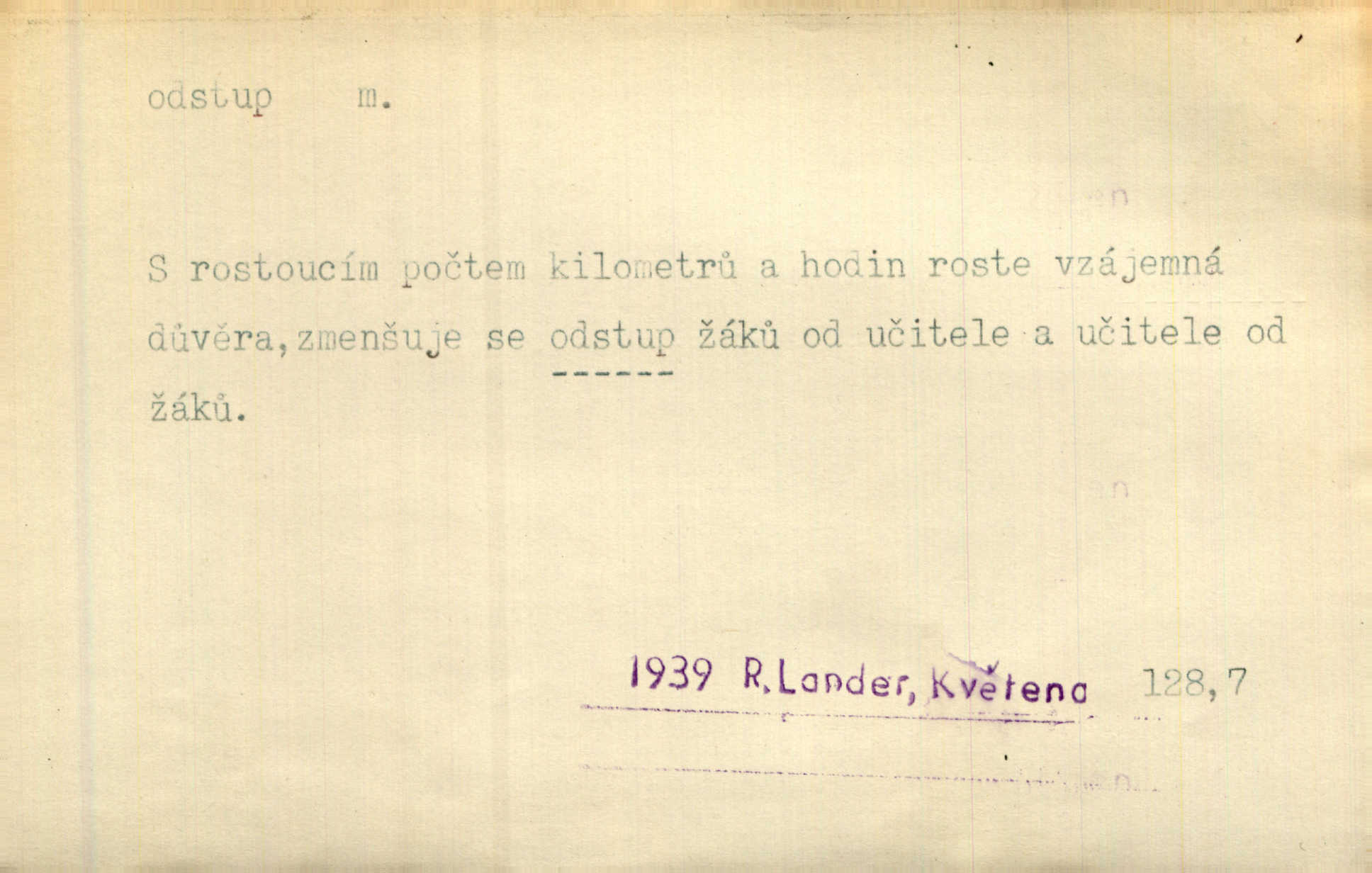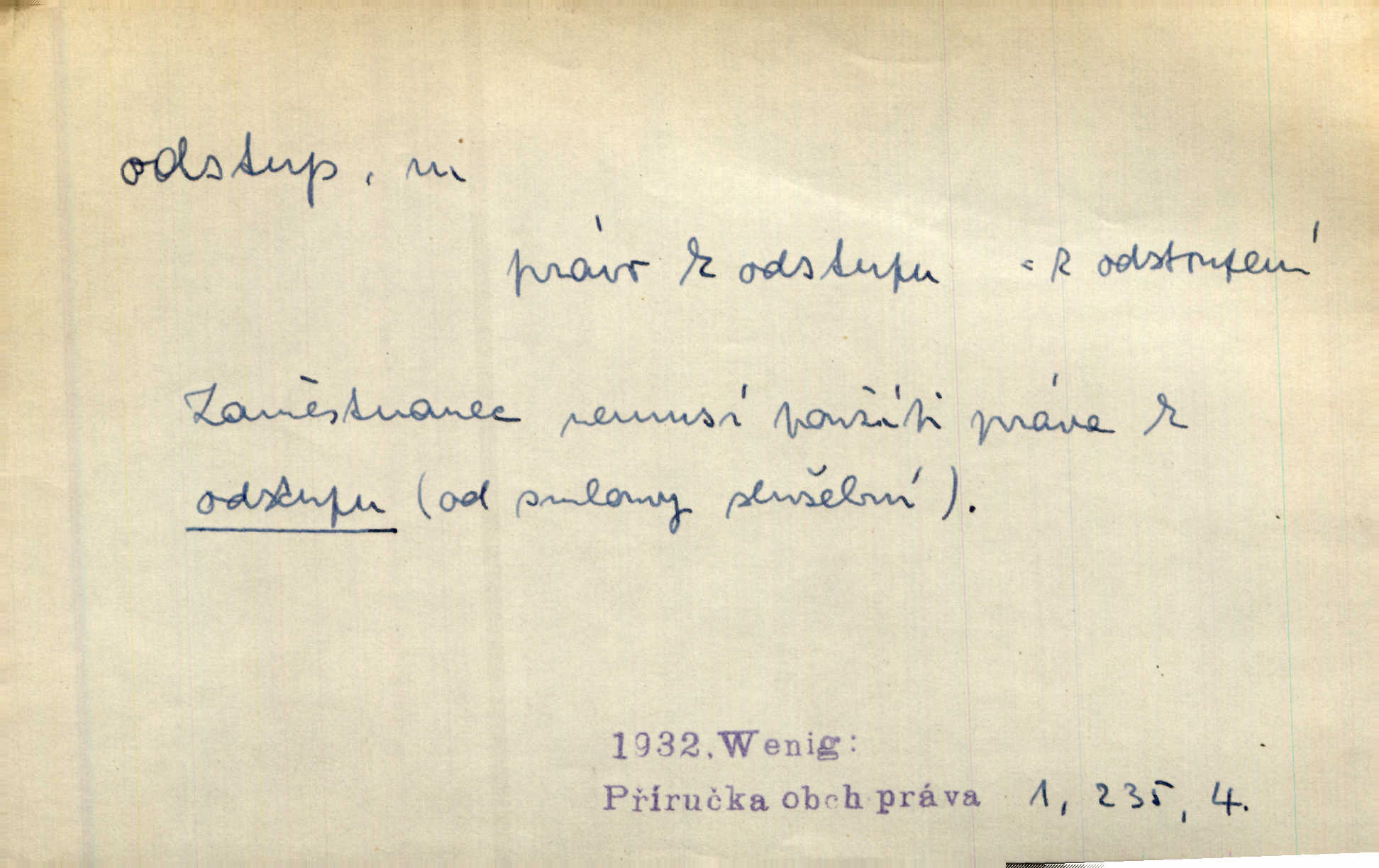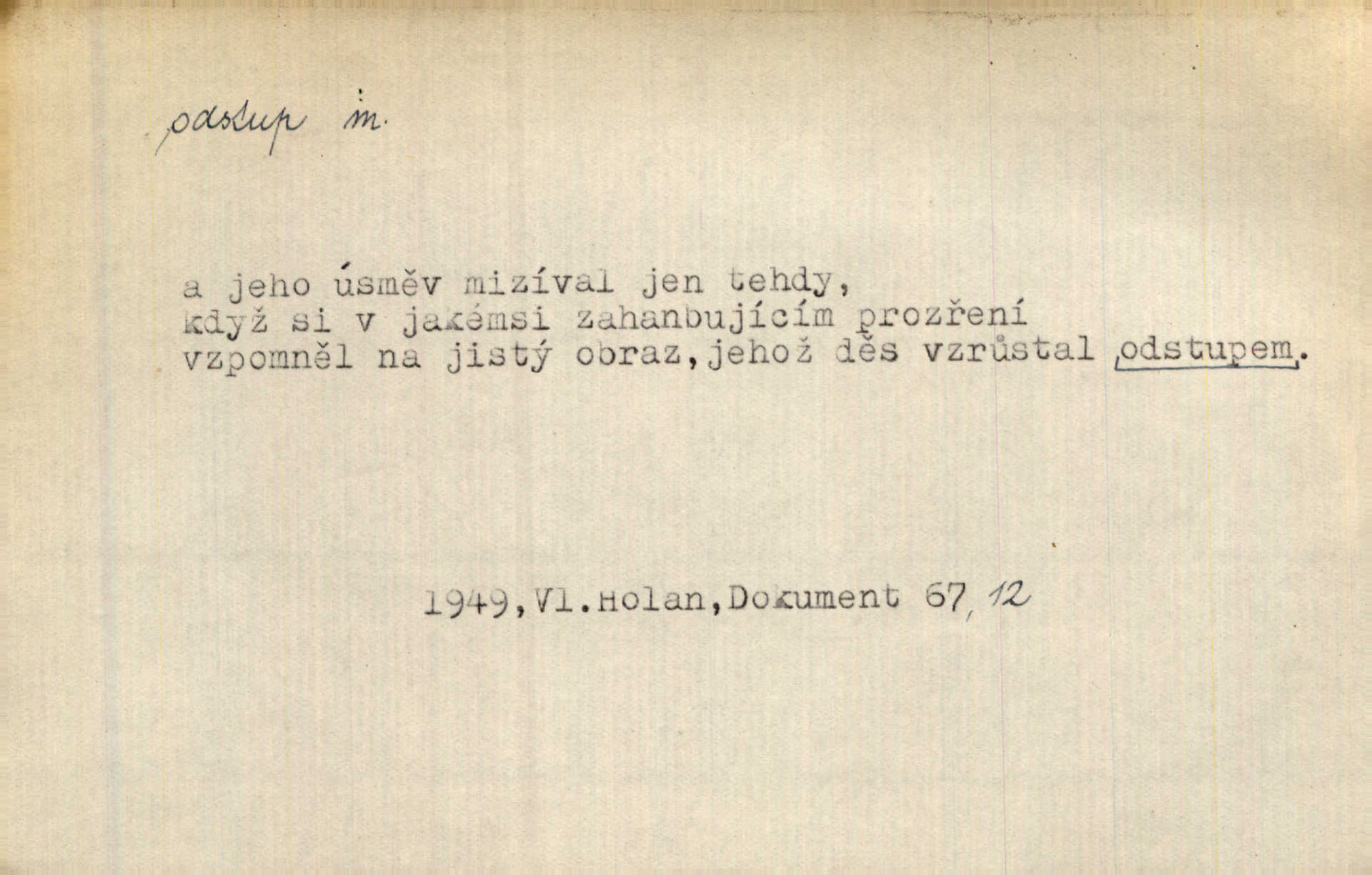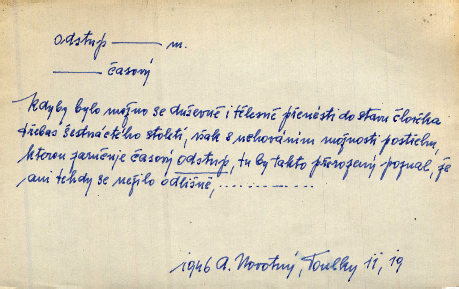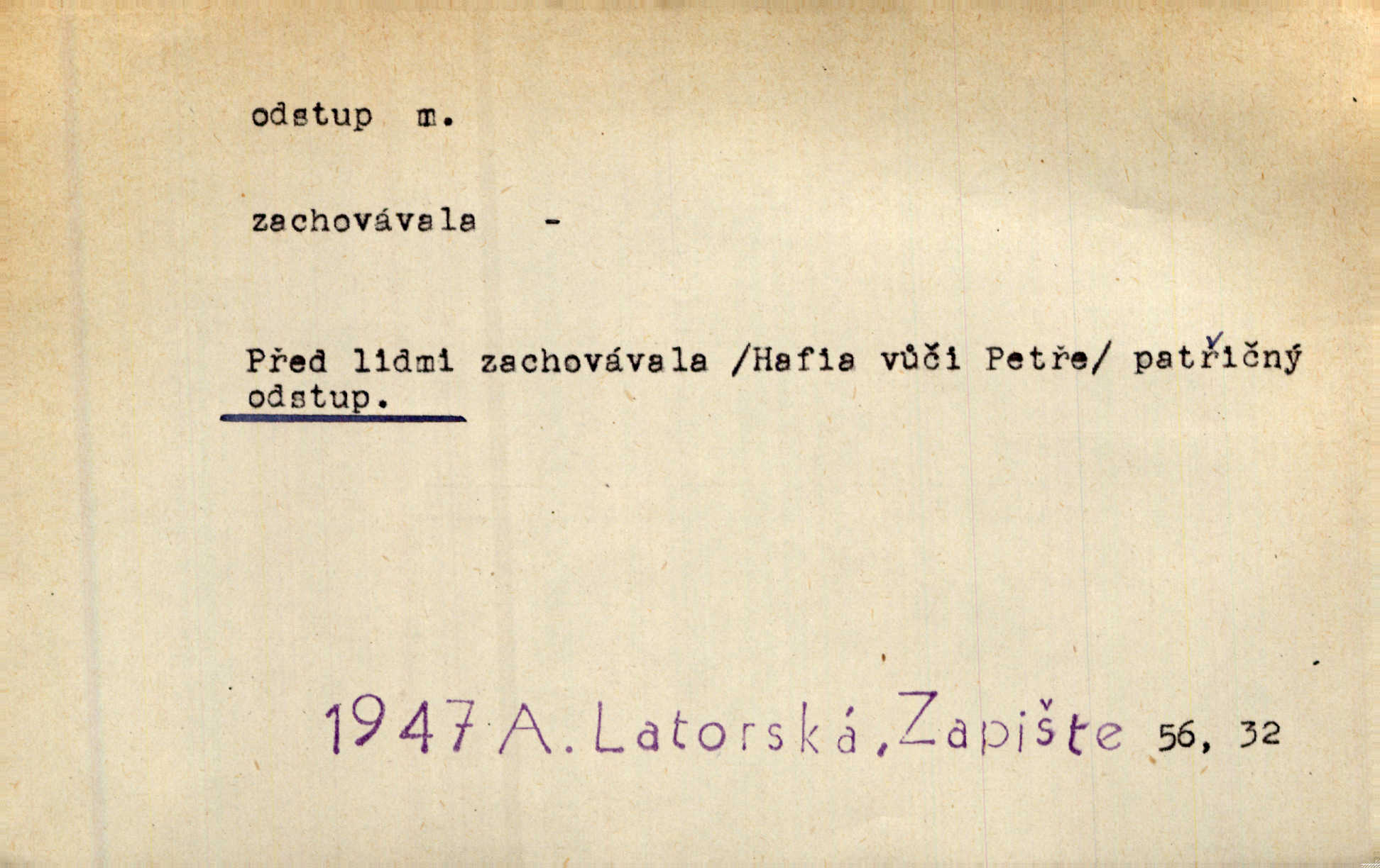 - odstup, -u m. odstoupení, odchod. Máš mít volný přístup i odstup. J. Malý. Uprostřed ní [vřavy] vstal, zapotácel se v odstupu od stolu. Vrba. Dozírali, jak se konal právě nástup a odstup dvou směn [pekařů]. Vach. Generace odcházející neví, kde je cesta k čestnému a zaslouženému odstupu odchodu (do nečinnosti). Kun. [Snaha Sigmundova,] aby lichého papeže přiměl k odstupu odstoupení z úřadu. Helf. Geol. pozvolný ústup moře s pevniny, regrese. D odstoupení na jistou vzdálenost; místní mezera. Na chodníku mezi sebou zachovávali odstup dvou kroků, jen tak, aby se slyšeli. Čap. Ch. Magická moc, která by mohla spoutat přesilu fysickou a držet ji na odstup. Šal. Všichni kolem stolu vstávali a snažili se v odstupu viděti jasněji [co je na obraze]. Kop. Šerm. vzdálení se krokem od soka. D časový interval, časová vzdálenost. Mezi ukončením [sněmovního] zasedání jednoho a zahájením druhého není téměř odstupu. Sobota. Postavy jejich [hrdinů] musely růst; teprve po smrti a po delším časovém odstupu. Hol. Jsou díla, která potřebují odstupu, aby jich velikost mohla být chápána. Mach. Souvěkovcům se obraz ten jevil ve světle zcela jiném než nám, z dalekého odstupu věc pozorujícím. Šus. D rozdíl mezi dvěma hodnotami. I tady [v socialismu] se ukáže jistý odstup mezi myšlenkou a skutečností. Přít. Úměrný odstup mezi služným. Plat. zák. D odměřené, chladné n. hrdé chování. [Syn, který se vrátil domů,] byl připraven na zvědavé otázky, ale polekal ho odstup všech stejně, jako podezřelá příchylnost dědova. Vrba. [Zeyer] dovedl si zachovávati odstup a krásné gesto samotářské. J. Kvap. Nadutost k služebnictvu a upřílišený odstup k úřednictvu povýšené chování. Vrba. Zachovával osobní odstup od tohoto mladého bouřliváka chladný odklon. Ben. D vystoupení z církve. [Tajni evangelíci] na faře svůj odstup ohlásili. Jir. D odchýlení, odklon. Daleko silnější odstup od revolucionismu jeví se později u Engelse. Čes. pol. Odstup od skutečnosti svádí [básníka] k jakémusi plošnému líčení vnějšího světa. Hrb. D vzdání se něčeho. Odstup nějaké části země cizině. Čes. pol. Znal dobře svého staršího syna, a proto nedovedl uvěřiti, že by jeho odstup z práv prvenství byl míněn jen tak prostně a bez kličky. Vrba.
