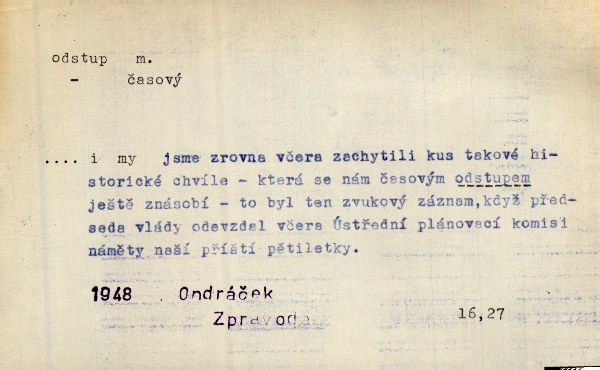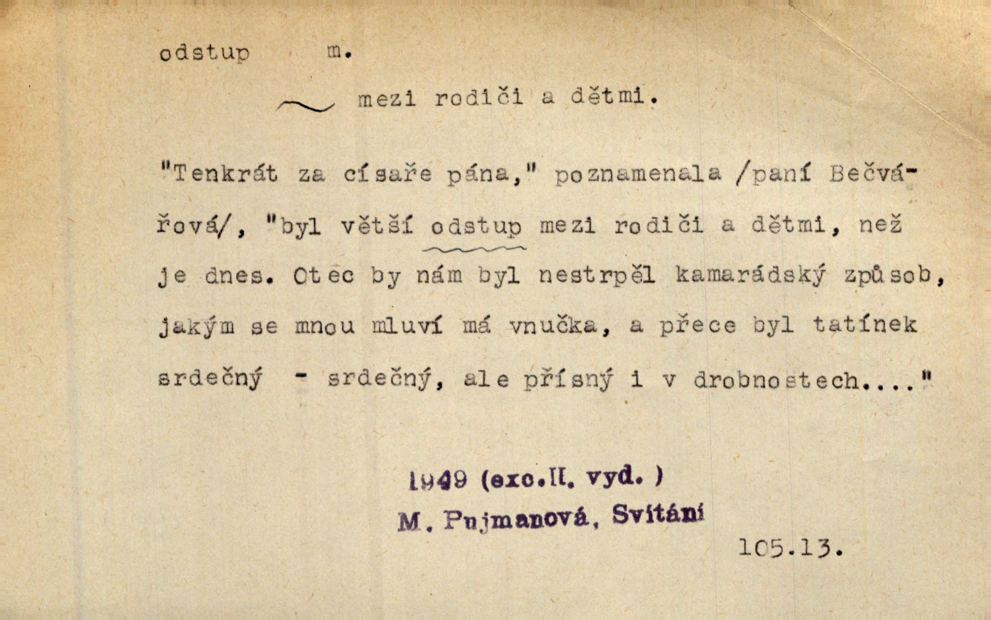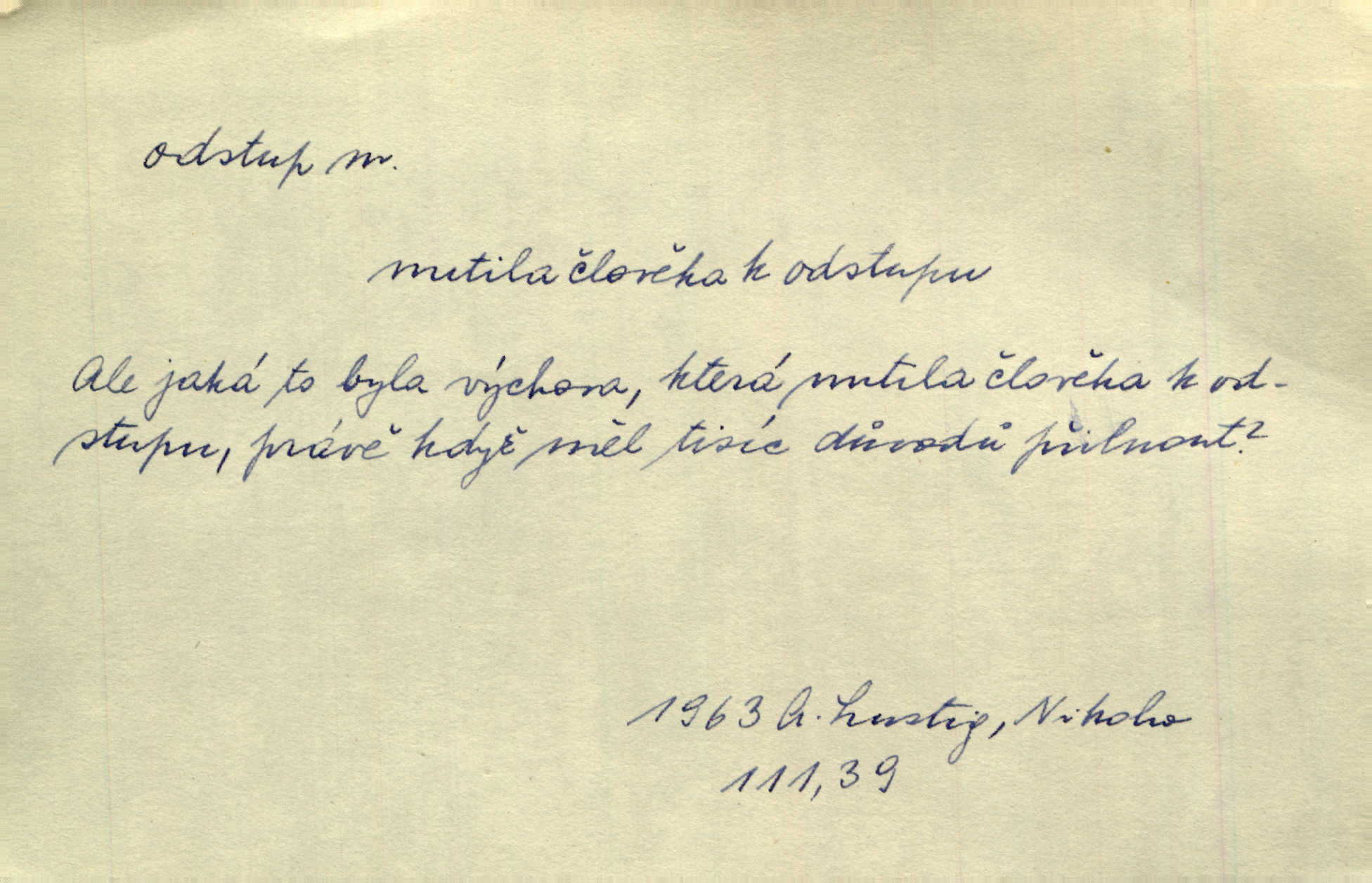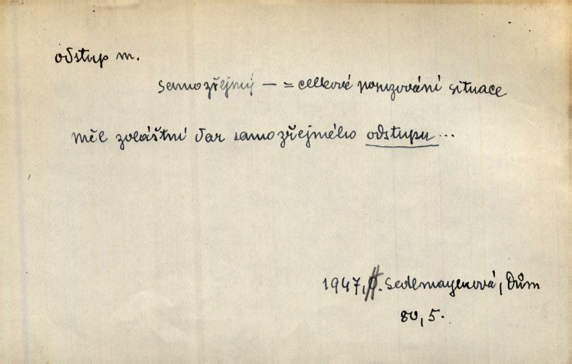 - odstup, -u m. odstoupení, odchod. Máš mít volný přístup i odstup. J. Malý. Uprostřed ní [vřavy] vstal, zapotácel se v odstupu od stolu. Vrba. Dozírali, jak se konal právě nástup a odstup dvou směn [pekařů]. Vach. Generace odcházející neví, kde je cesta k čestnému a zaslouženému odstupu odchodu (do nečinnosti). Kun. [Snaha Sigmundova,] aby lichého papeže přiměl k odstupu odstoupení z úřadu. Helf. Geol. pozvolný ústup moře s pevniny, regrese. D odstoupení na jistou vzdálenost; místní mezera. Na chodníku mezi sebou zachovávali odstup dvou kroků, jen tak, aby se slyšeli. Čap. Ch. Magická moc, která by mohla spoutat přesilu fysickou a držet ji na odstup. Šal. Všichni kolem stolu vstávali a snažili se v odstupu viděti jasněji [co je na obraze]. Kop. Šerm. vzdálení se krokem od soka. D časový interval, časová vzdálenost. Mezi ukončením [sněmovního] zasedání jednoho a zahájením druhého není téměř odstupu. Sobota. Postavy jejich [hrdinů] musely růst; teprve po smrti a po delším časovém odstupu. Hol. Jsou díla, která potřebují odstupu, aby jich velikost mohla být chápána. Mach. Souvěkovcům se obraz ten jevil ve světle zcela jiném než nám, z dalekého odstupu věc pozorujícím. Šus. D rozdíl mezi dvěma hodnotami. I tady [v socialismu] se ukáže jistý odstup mezi myšlenkou a skutečností. Přít. Úměrný odstup mezi služným. Plat. zák. D odměřené, chladné n. hrdé chování. [Syn, který se vrátil domů,] byl připraven na zvědavé otázky, ale polekal ho odstup všech stejně, jako podezřelá příchylnost dědova. Vrba. [Zeyer] dovedl si zachovávati odstup a krásné gesto samotářské. J. Kvap. Nadutost k služebnictvu a upřílišený odstup k úřednictvu povýšené chování. Vrba. Zachovával osobní odstup od tohoto mladého bouřliváka chladný odklon. Ben. D vystoupení z církve. [Tajni evangelíci] na faře svůj odstup ohlásili. Jir. D odchýlení, odklon. Daleko silnější odstup od revolucionismu jeví se později u Engelse. Čes. pol. Odstup od skutečnosti svádí [básníka] k jakémusi plošnému líčení vnějšího světa. Hrb. D vzdání se něčeho. Odstup nějaké části země cizině. Čes. pol. Znal dobře svého staršího syna, a proto nedovedl uvěřiti, že by jeho odstup z práv prvenství byl míněn jen tak prostně a bez kličky. Vrba.