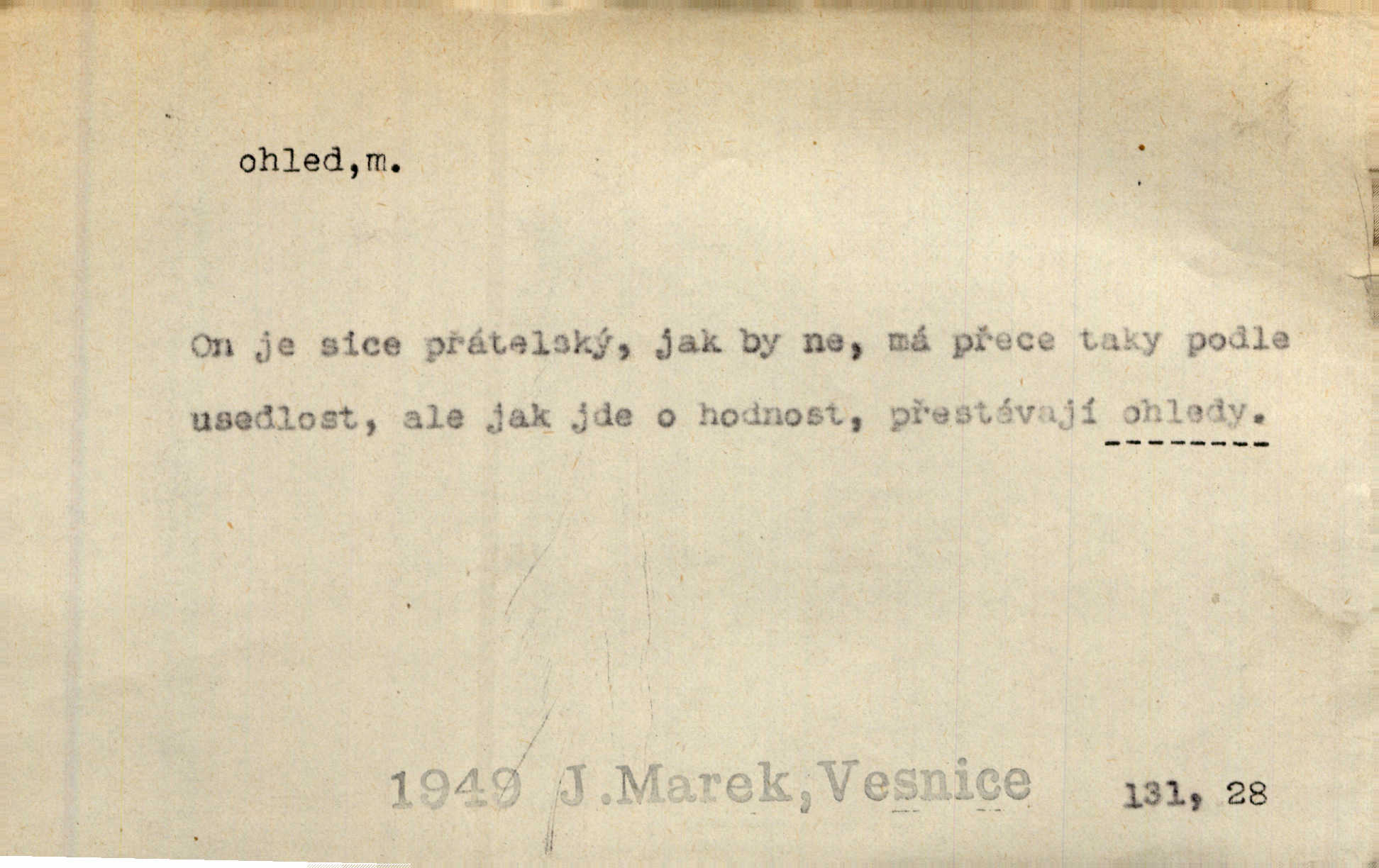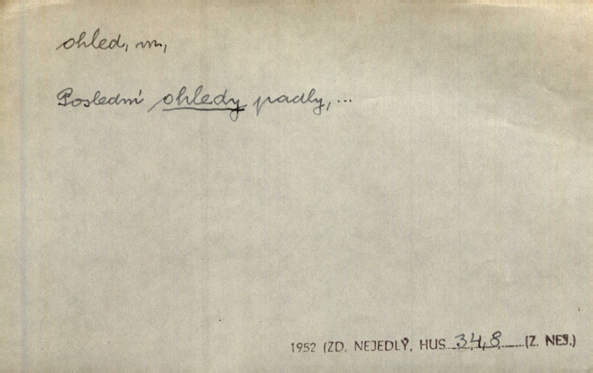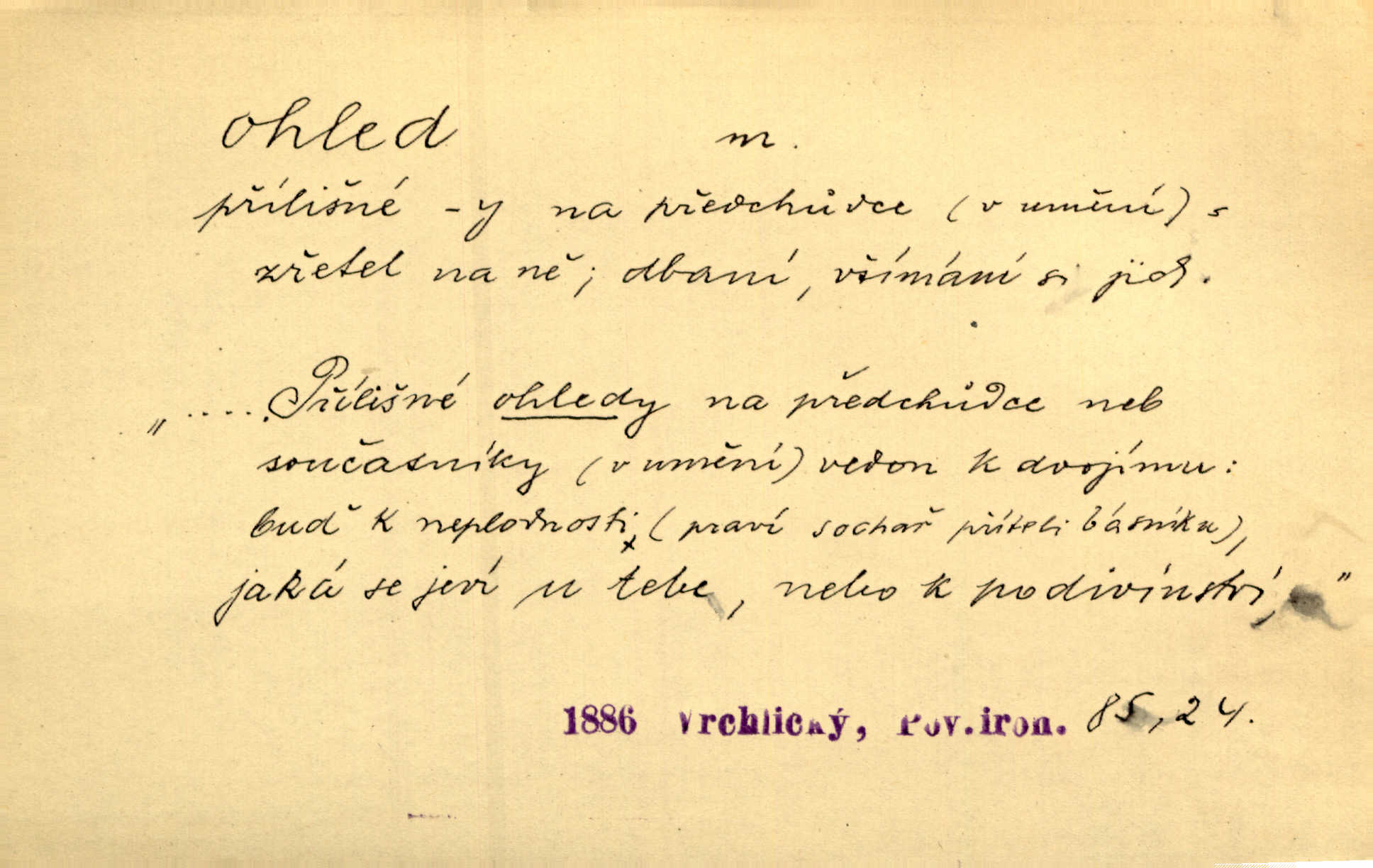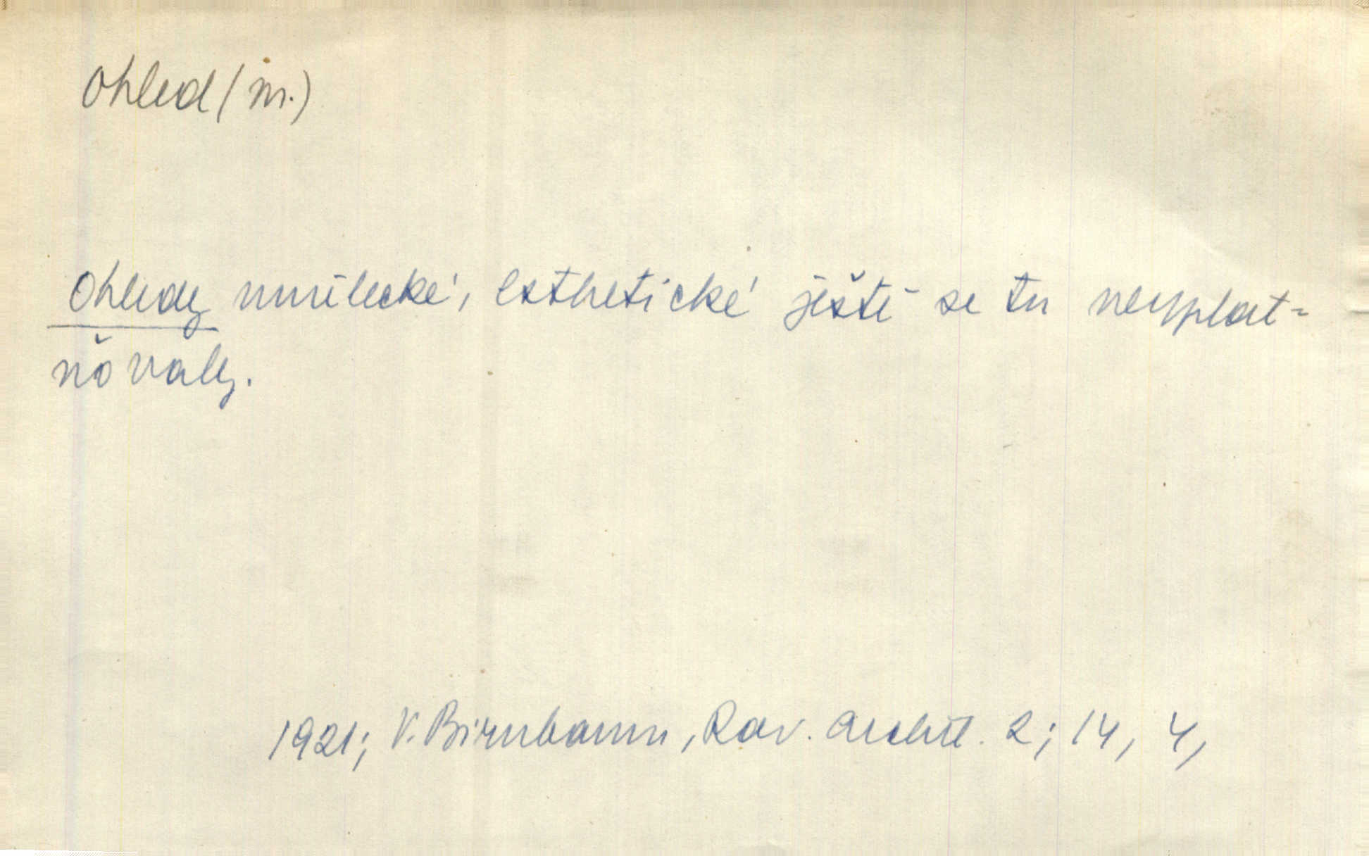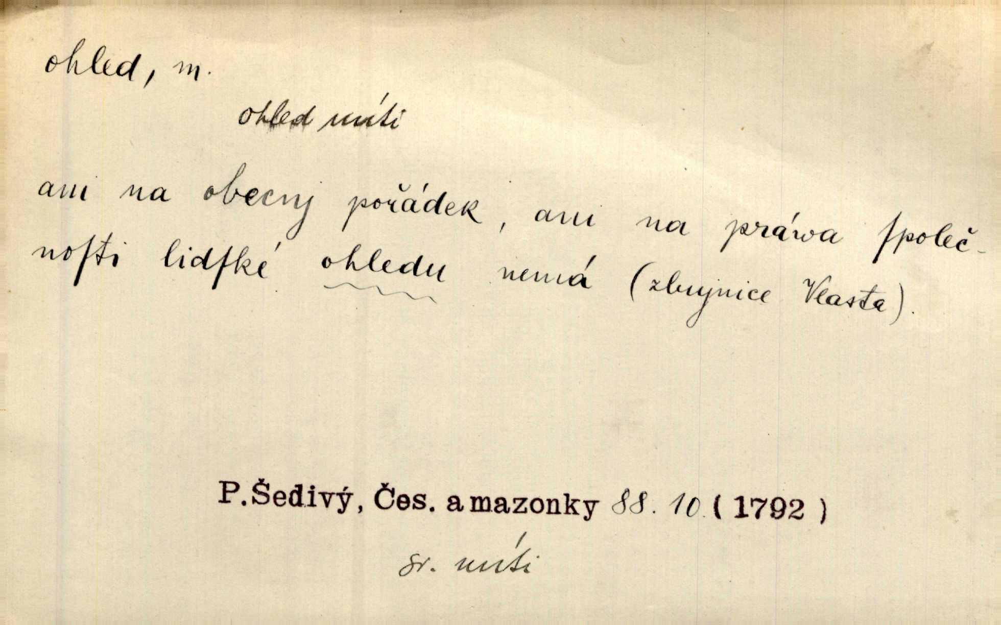 - ohled, -u m. zřetel k zájmu, potřebám, významu a pod. Výminkář nedořekl, snad s ohledem na Barušku. Rais. Budou [páni] přinuceni brát ohled na žádosti a potřeby lidu. Šmil. Nic ti nedali [rodiče], odbyli tě hůř než nějaký podruh, jaké tedy ohledy! Rais. Mám za svou povinnost mluviti o tak vážné věci zcela upřímně, bez obalu, bez ohledu. Bozd. Bylo potřebí člověka nevázaného ohledy ani k svým ani k cizím, aby pověděl své názory tak, jak je pověděl Chelčický. J. Vlč. Nezná společenských ohledů a ignoruje každou slušnost. Vrba. Odmítáme z právních ohledů nějaký čin, ale jako by se nechumelilo, přijímáme jeho důsledky. Dyk. Rozplakala se hlasitě, bez ohledu na to, kdo ji slyší. R. Svob. Zast. Jeho milost královská mu ohledem na zásluhy jeho rodu život daruje. Hál. Jitka se měla ohledem na slabé zdraví jen čtení, psaní a trochu počítání přiučiti. Svět. Ohledem na jeho posud zachovalé mravy odložilo se vyřknutí soudu. Tyl. Nejsi ještě dosti zkušený ohledem na ženské. Podl. D stránka, hledisko, s nichž se nějaká věc pozoruje, posuzuje. Dějiny národu českého jsou v nejednom ohledu poučnější a zajímavější nad dějiny jiných národův. Pal. V ohledu věrnosti žádnému mužskému co věřiti není. Sab. Rozumec je muž v každém ohledu ctihodný. Šmil. Bohatýři byli nejlepšími představiteli národa v ohledu duševném i mravném. Hol. V ohledu politickém byli [adamité] smýšlení republikánského. Jir. V ohledu látkovém byly nyní [za doby „Lumíra“] veškeré doby, veškeré země, veškeré národy, veškeré kultury stejně vítány. Arne N. D ohledy (dial. ohlady), -ů ohledávání, prohlídka. Rychtář přišel na ohledy, aby věznici k smrti souzené v krmích nebylo podáno jedu. Win. Společně se vydáme na ohledy některých těch idejí západnických. Kos. Pojedu dříve do pole než na ohledy za nevěstou námluvy. Jir. Přijdi [děvče] na ohledy, budu v loďce sám. Heyd. Vydal jsem se na ohledy, k panně pěkné na námluvy. Hol. Přijížděli králové z dalekých zemí k ní [princezně] na ohlady, ale ona žádného nechtěla. Něm. Mysl. ohledy zvěře přihlížení při lovu k velikosti zvěře, rychlosti letu a pod. D Arch. úmysl, záměr, cíl, účel. Vidělť škaredé tváře a patrný ohled, jen aby jej vytiskli. Tyl. Opustila jsi dům otcovský z ohledů zrádných? Tyl. Ničemníci kloní se až k zemi, by špatné své ohledy snáze v skutek přivesti mohli. Čel.
